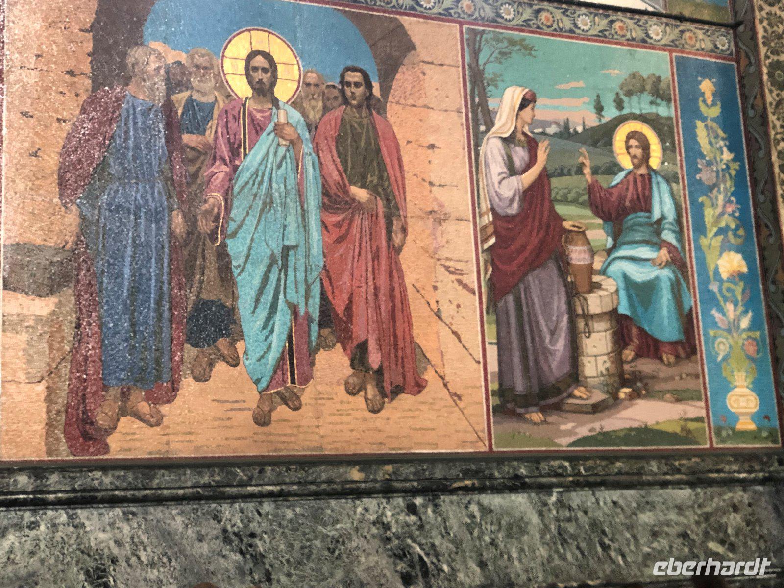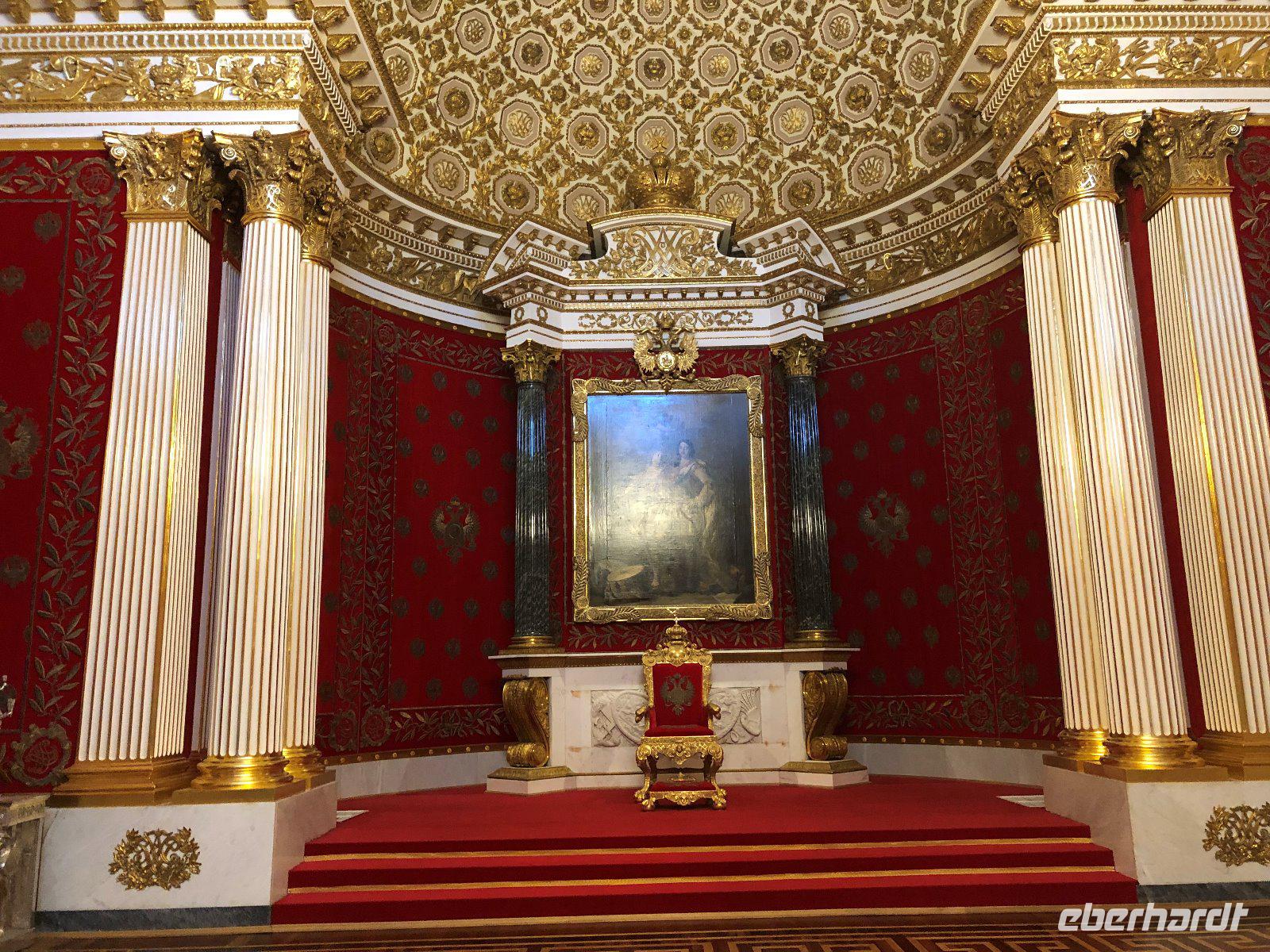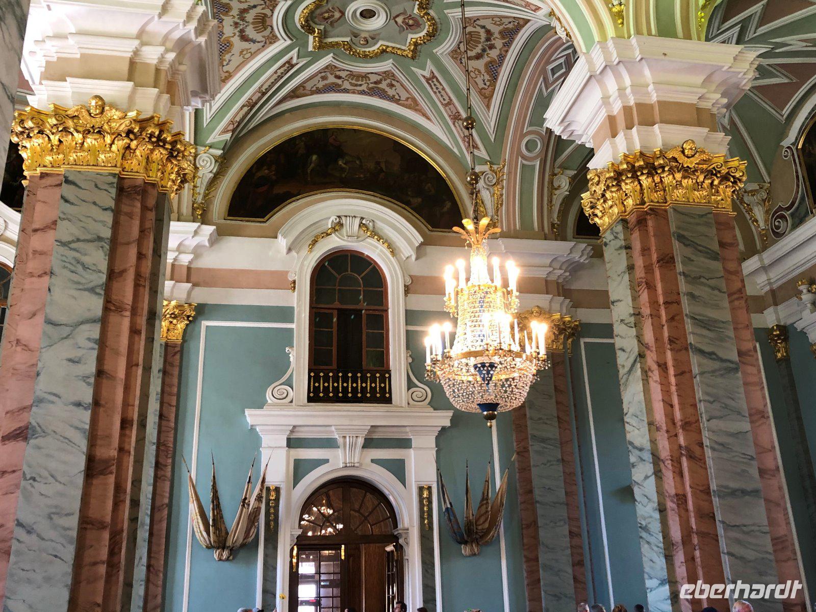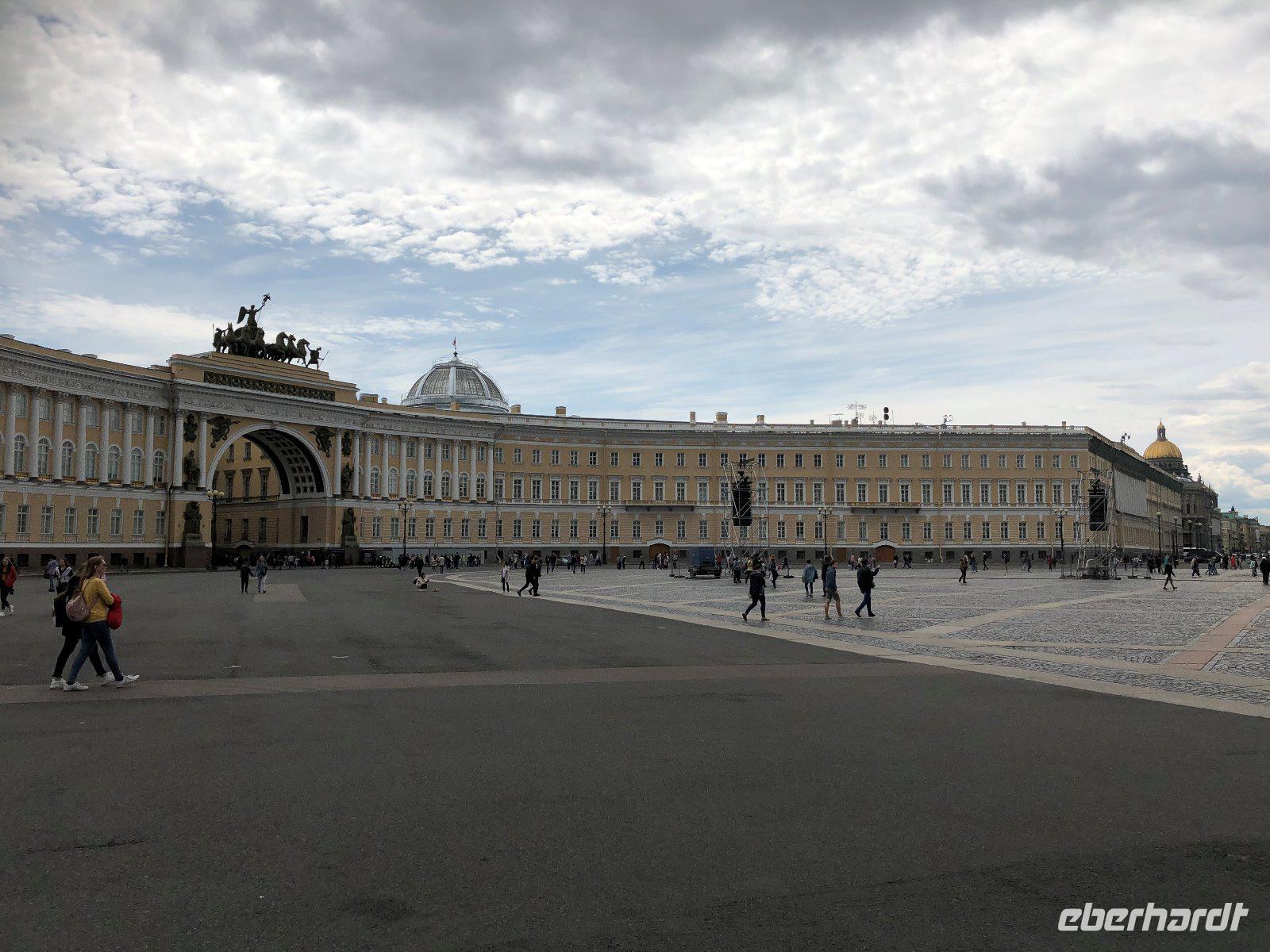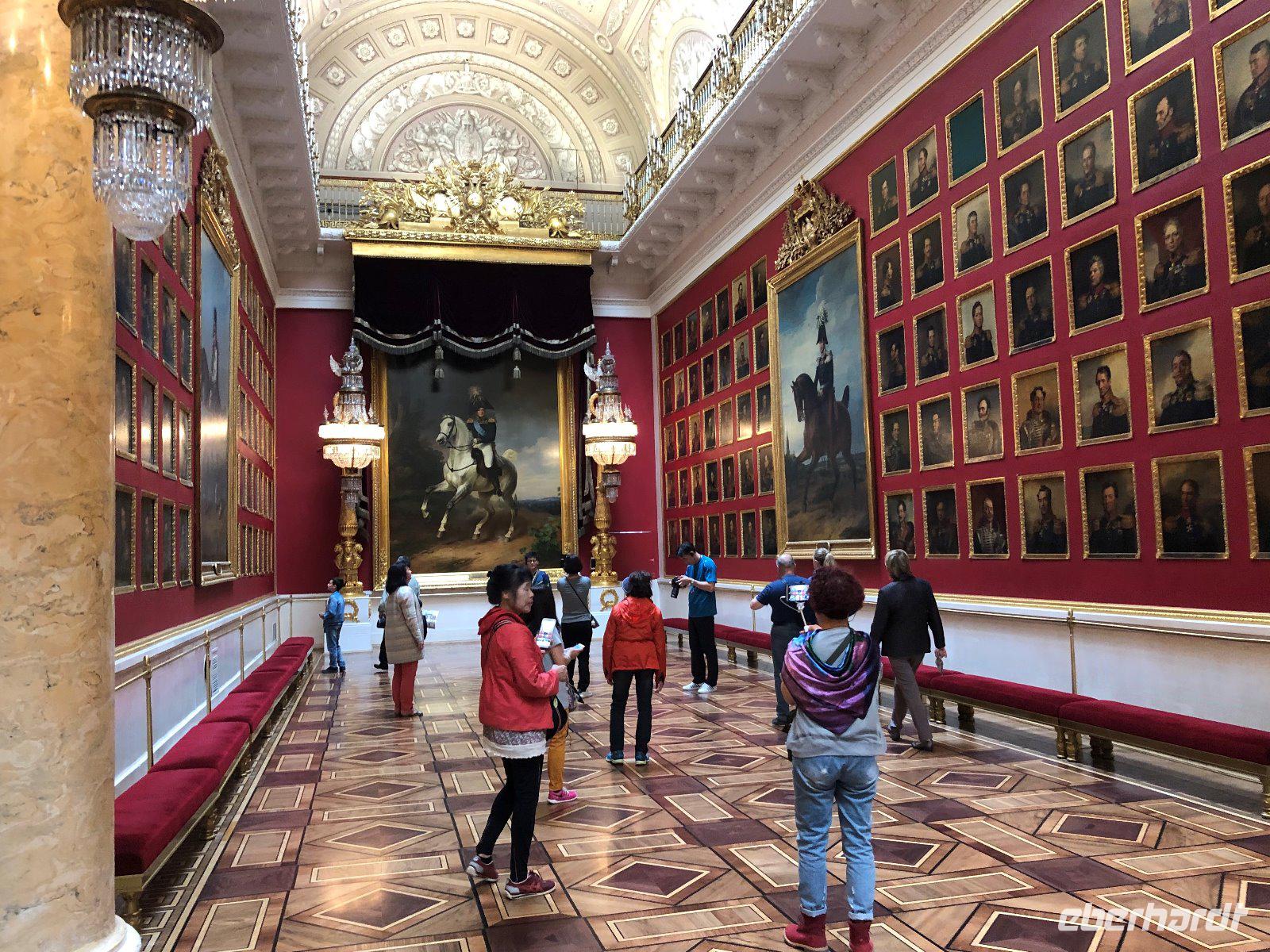 Nach Abschluß der Besichtigung der prächtigen Mosaikkunstwerke und Bilder fuhren wir dann zur Eremitage, einen Mekka für Kunstliebhaber, deren Besuch einen Höhepunkt für unsere Reise bilden sollte. Die über 3 Mio. Kunstwerke, von denen die meisten in Depots untergebracht sind, können natürlich in der Kürze der uns zur Verfügung stehenden Zeit auch nicht alle der ausgestellten Werke betrachtet werden. Die Eremitage gehört neben dem Lovre in Paris und dem Metropoliten in New York zu den größten Kunstsammlungen der Welt und meisbesuchtem Museum Russlands und ist UNESCO-Weltkulturerbe. Sergej führte uns über historisch bedeutenden Sälen zu wichtigen Kunstwerken der niederländischen und italienischen Malerei und wir hatten die Gelegenheit die Städte Dresden und Pirna auf Werken von Canaletto zu erraten. Auf dem Schloßplatz verabschiedeten wir uns.