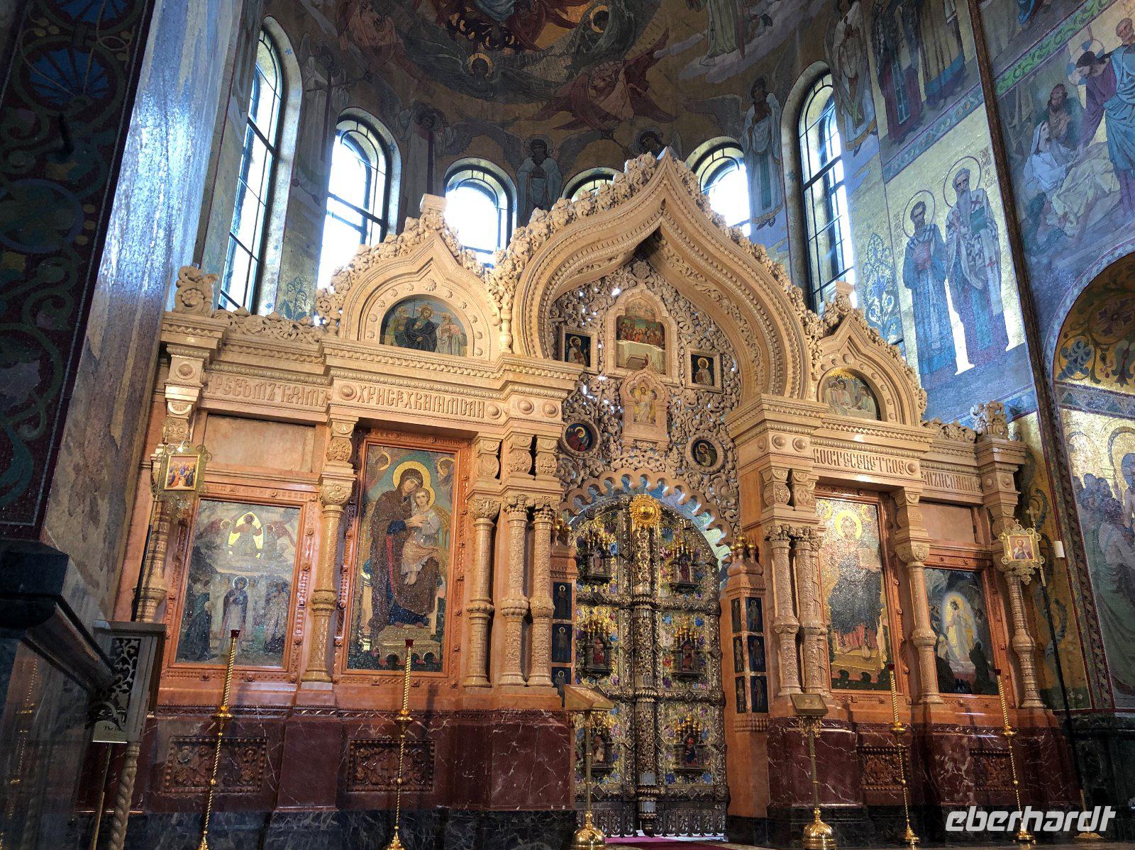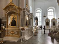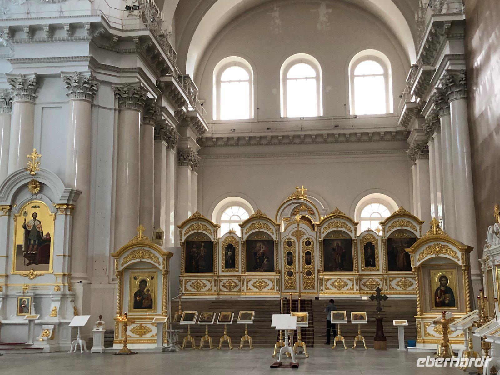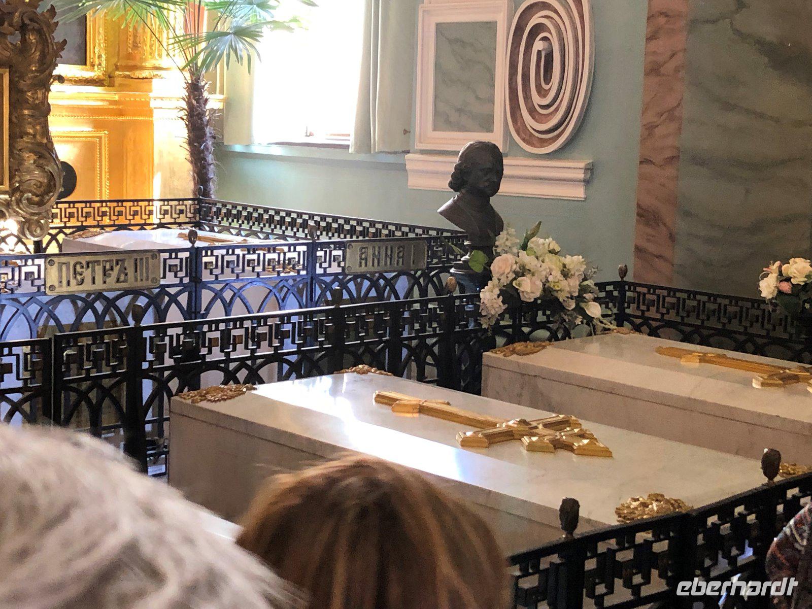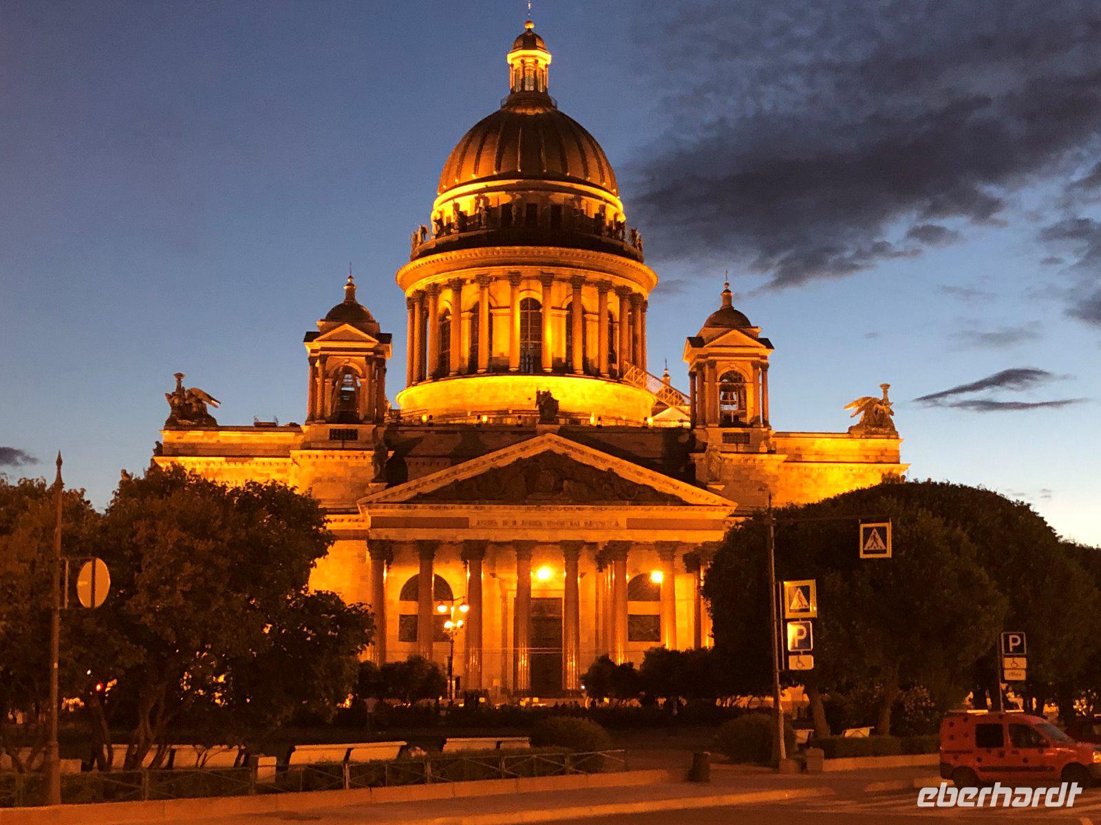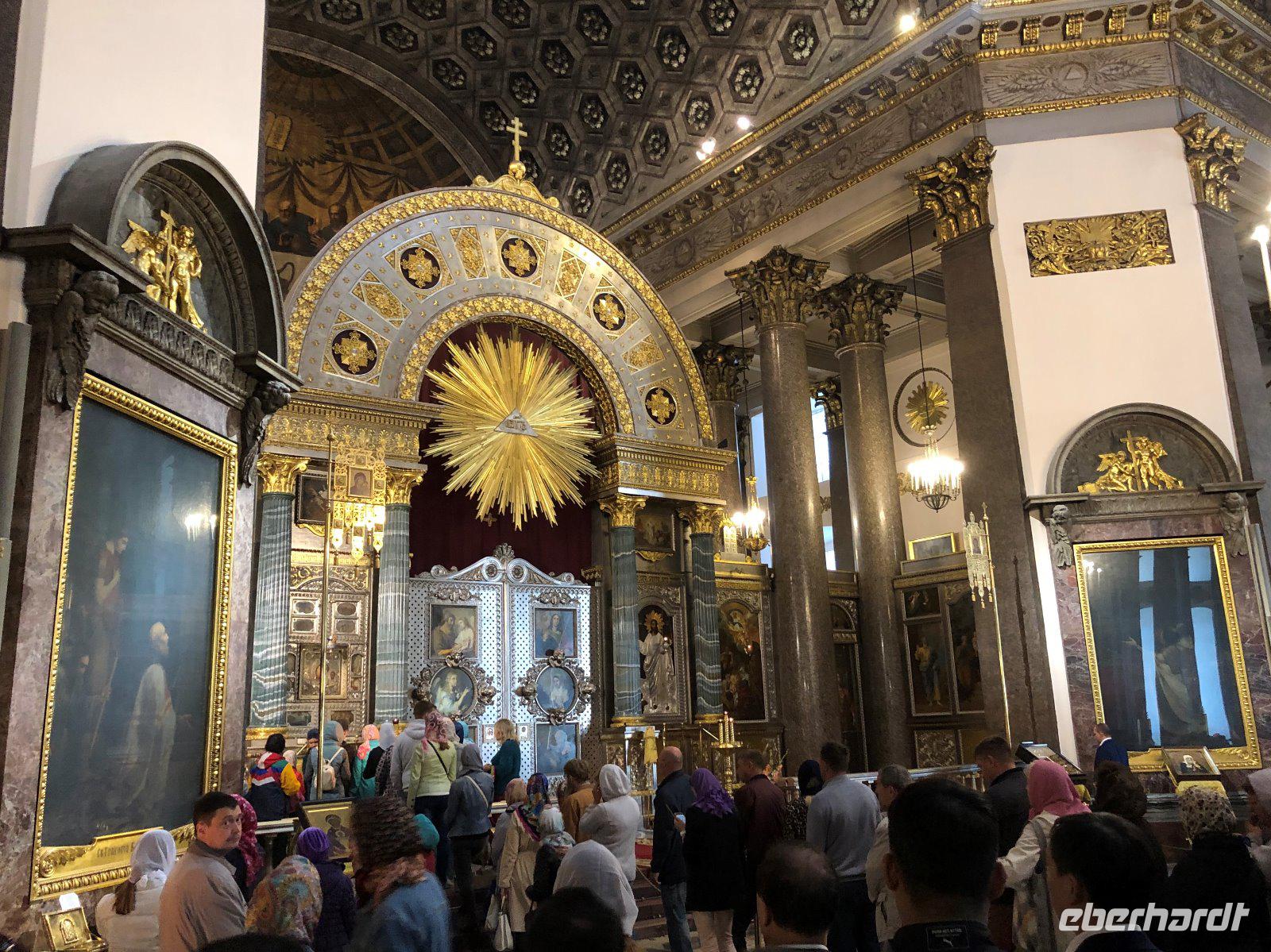Nach kurzer Nacht bestiegen wir um 10.00 Uhr wieder unseren bequemen Kleinbus und Denis brachte uns zur Isaak-Kathedrale, deren Goldkuppel die Siluette der Stadt dominiert. Sergej erläuterte uns, dass der drittgrößte Kuppelbau der Welt mit einer Fläche von 4000 m² ca. 14000 Menschen aufnehmen kann und dass die größte Kirche Russlands in fast 50 Jahren von bis zu 500000 Leibeigenen errichtet wurde und eine Meisterleistung der damaligen Ingenieurskunst darstellt.
