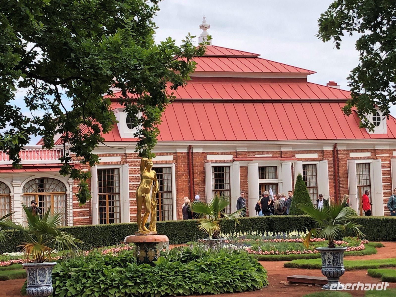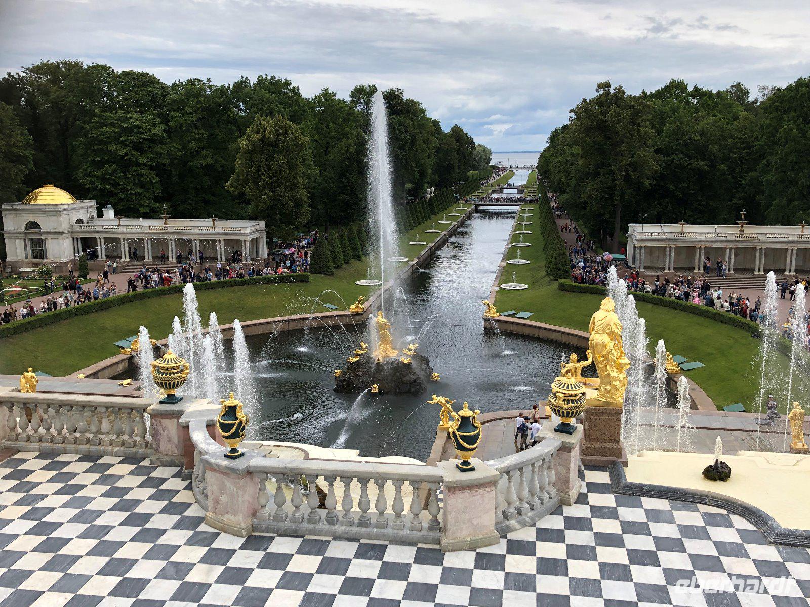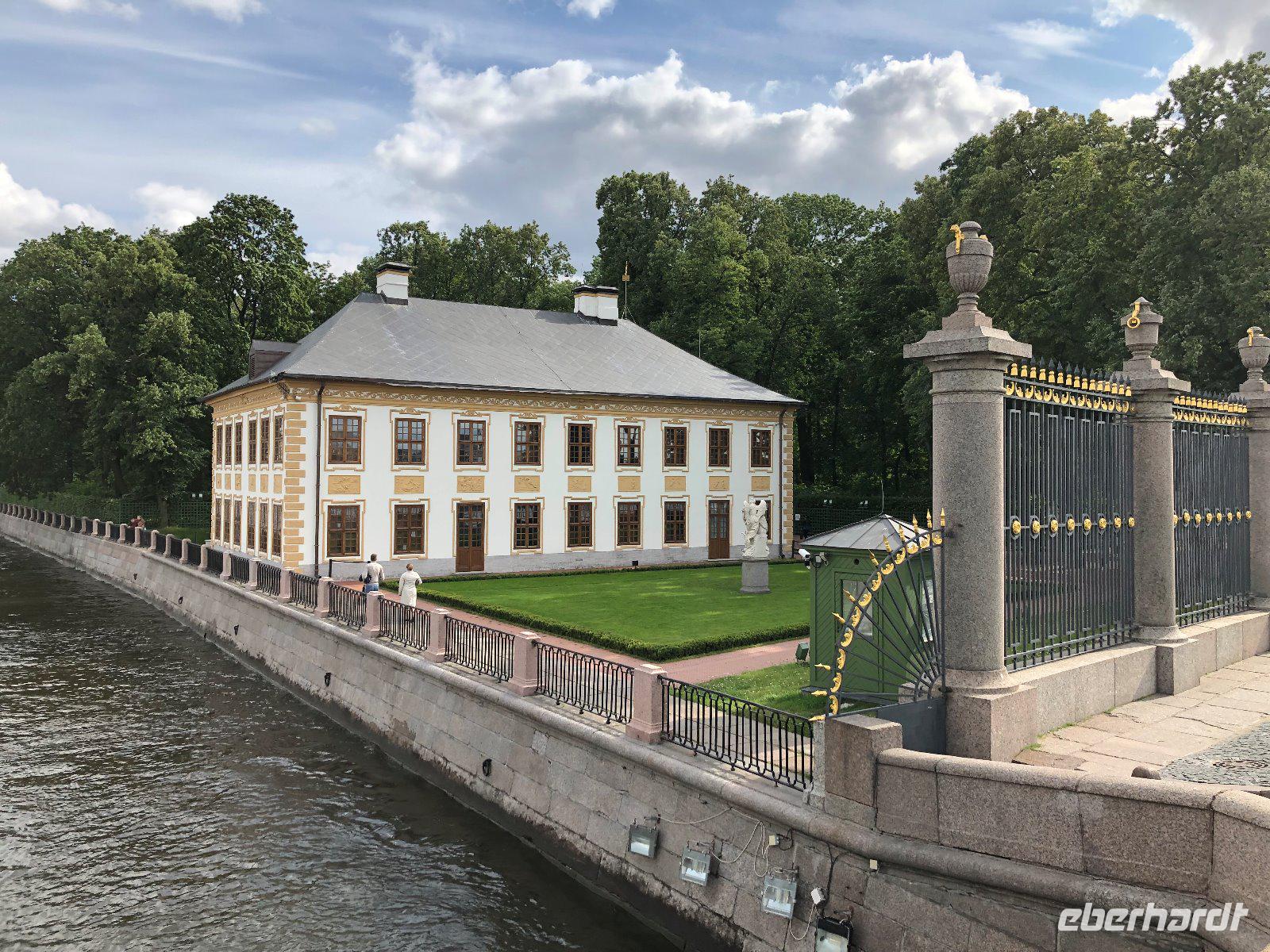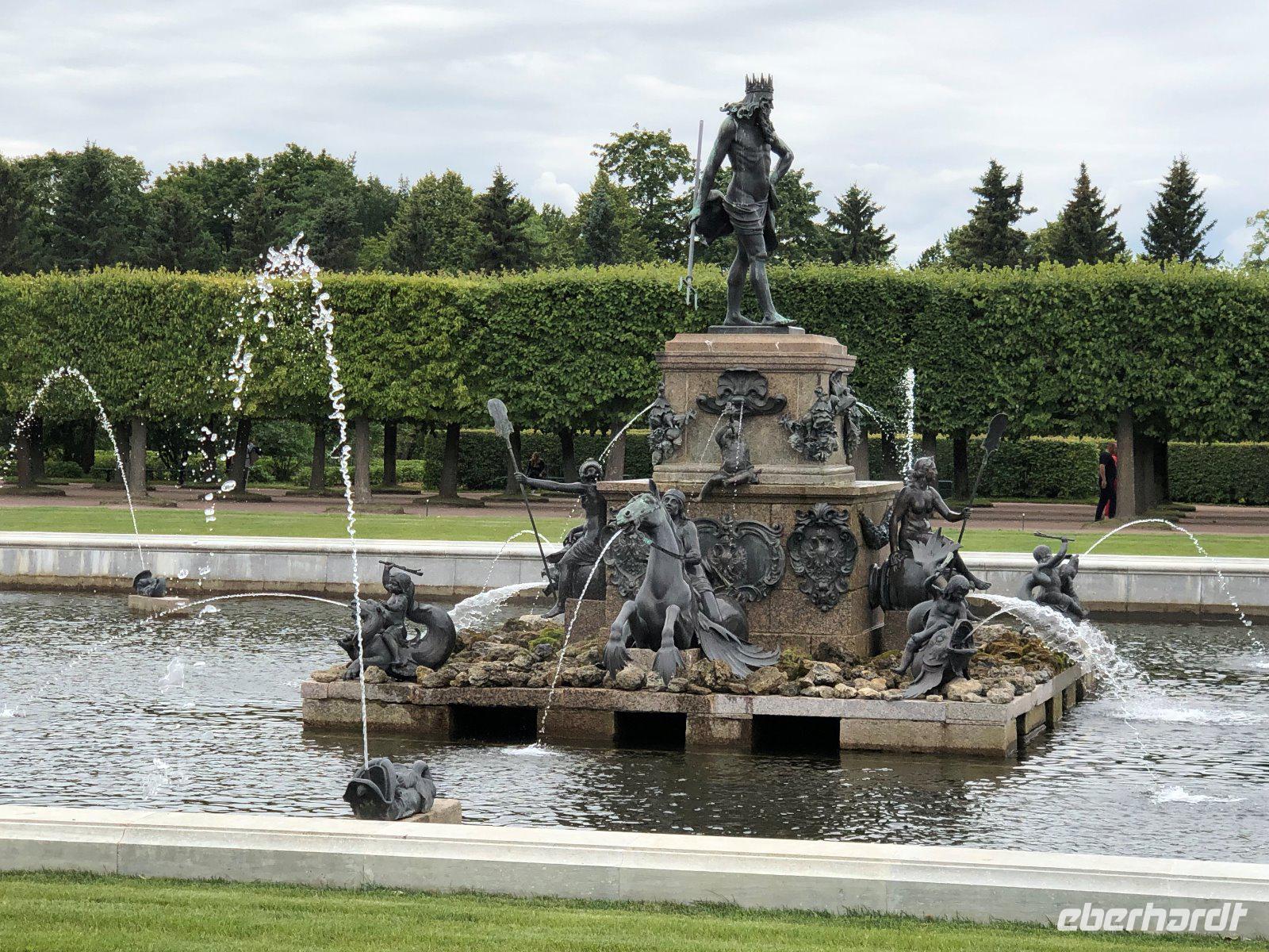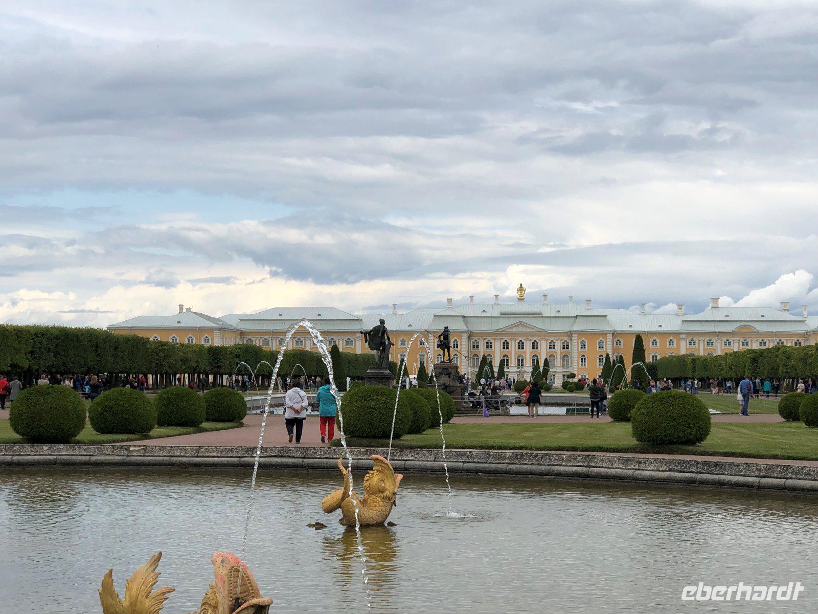 Kurz vor 11.00Uhr erreichen wir Peterhof und wir können das Einschalten der 140 Fontainen und Brunnen im Klange passender Musik von einer Brücke im unteren Park aus erleben. Pläne zu einem "russischen Versailles" gab es seitens Peter I schon länger, so dass er 1714 die Architekten Schlüter , Braunstein und Leplond mit dem Bau der Schlösser and dem Anlegen und Gestalten der Parks beauftragte. Uns beeindruckte besonders die Besichtigung des kleinen Schlosses Monplaisir. Mit einem Blick auf die große Kaskade und den Kanal zur Ostsee beendeten wir den Gang durch den unteren Park und betraten auf dem Weg zu unserer Gaststätte den oberen Park mit den herrlichen Blick auf das Schloss und die Kirche.