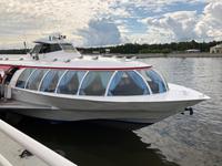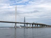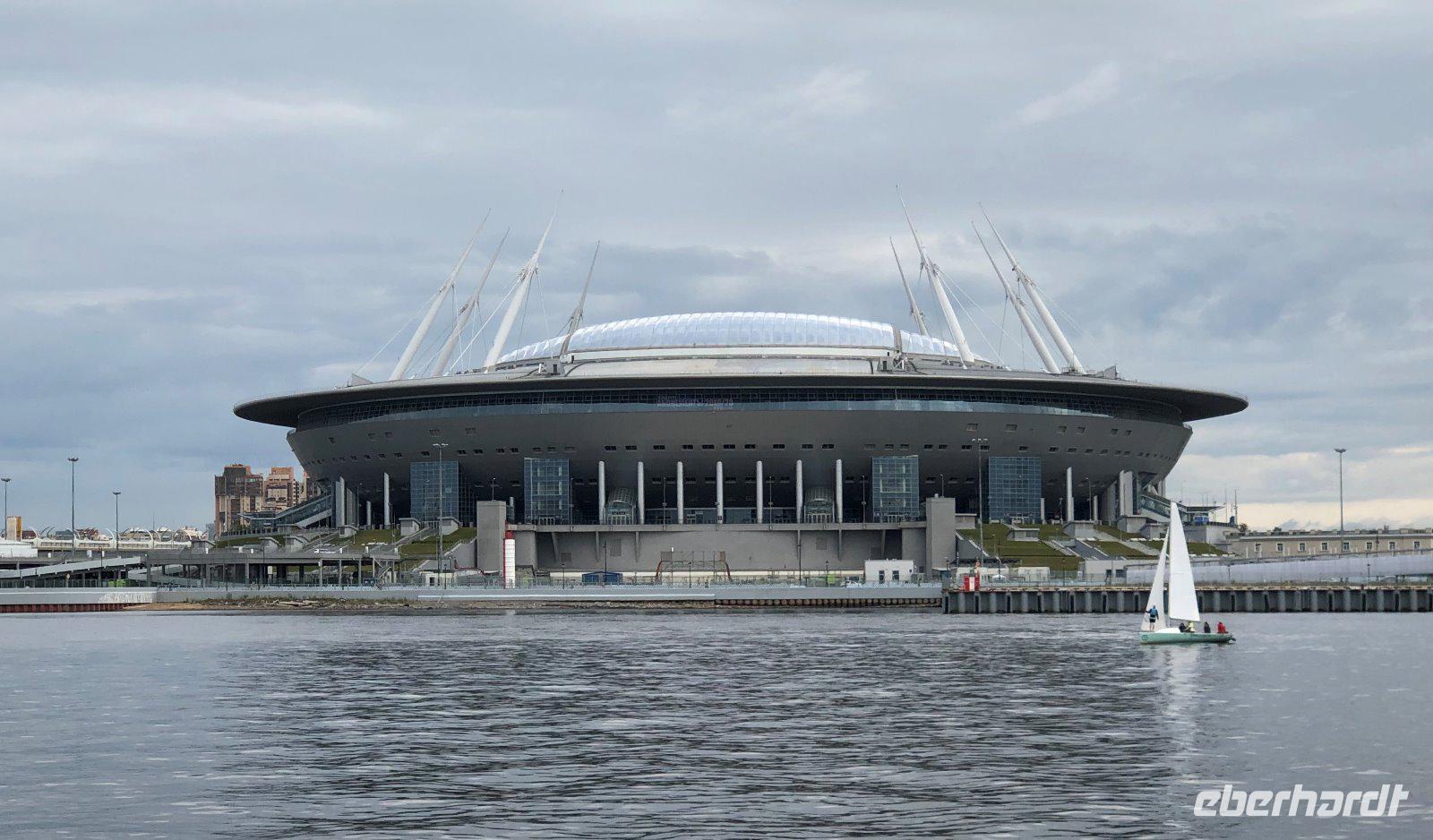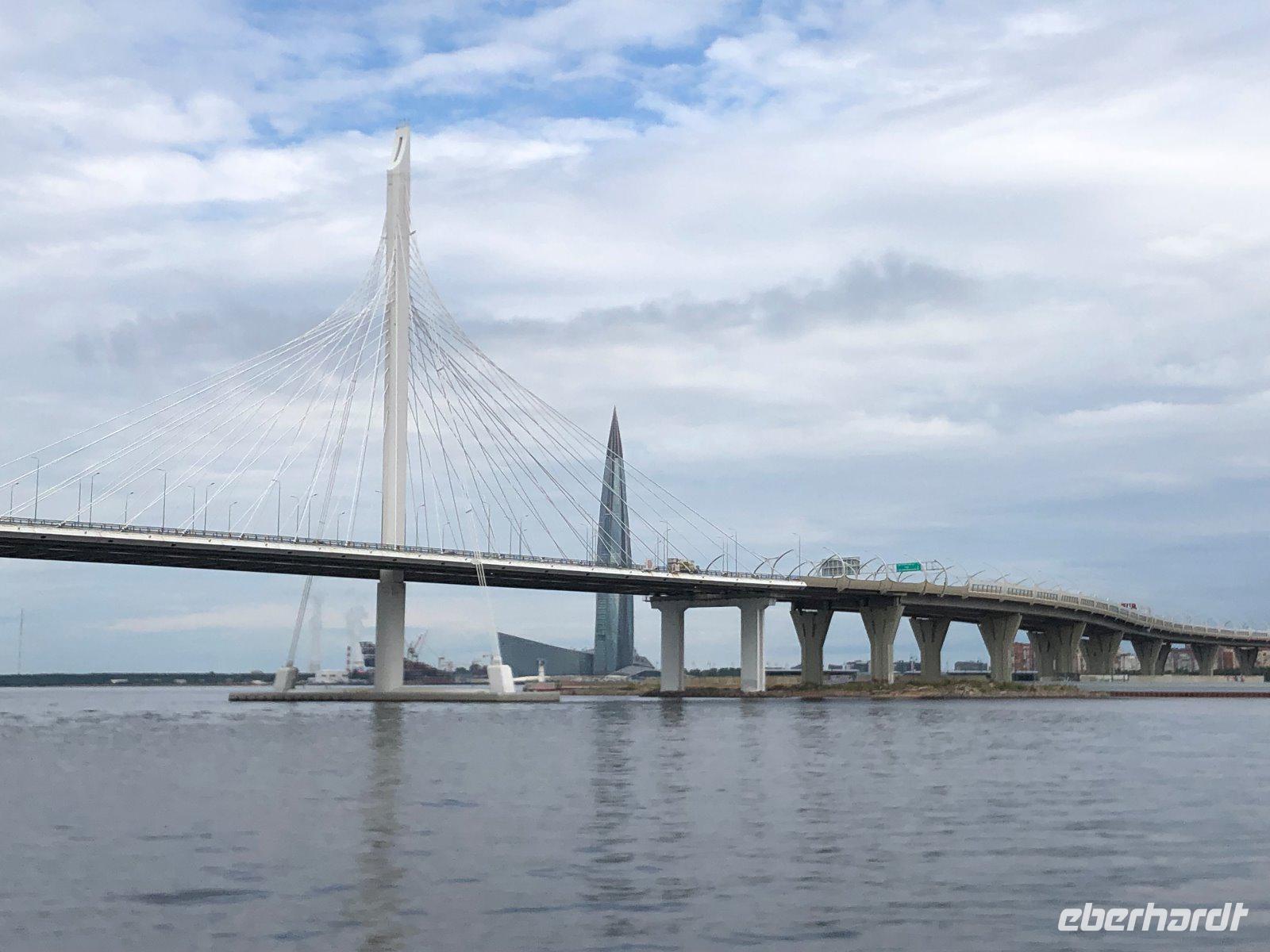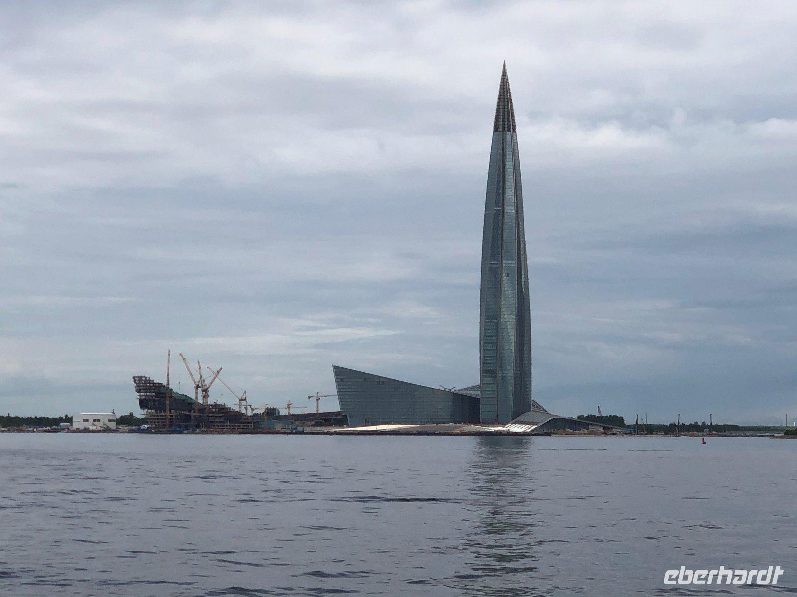 Petrus meint es wieder gut mit uns und das ist wichtig. Heute stehen nämlich die Parks von Peterhof und Puschkin auf dem Programm. Wir gehen zum Anleger der Schnellbote. Mit einem bereits in die Jahre gekommenen "Meteor"-Tragflächenschiff bekannter sowjetischer Bauart geht es pünktlich 10.00 Uhr auf dem Wasserwege, den schnellsten und kürzesten Weg ab in Richtung Peterhof, das sich ca. 30 km von Sankt Petersburg entfernt an der Südküste des finnischen Meerbusens befindet . Uns eröffnet sich die herrliche Perspektive auf Sankt Petersburg vom Wasser. Wir fahren auf der rechten Seite der Newa durch die Brücken und unsere Blicke streifen das neue Stadion, dass anläßlich der Fußballweltmeisterschaft im vergangenen Jahr gebaut wurde und den neuen Gasprom-Tower.