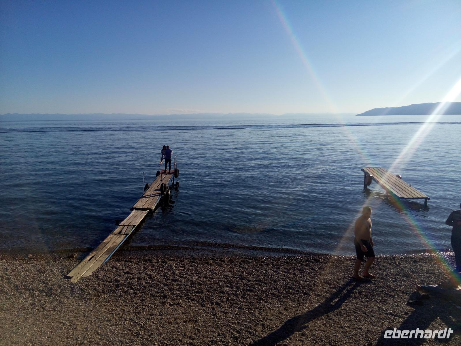 Unser Bus hat uns zu Markt gebracht. Es war voll mit Fisch, Souvenirs, Sachen aus Edelsteinen, Leder etc. etc. etc. Wusstet ihr, dass nur am Baikal, nur in Russland gibt es einen Stein Namens Charoit? Der ist lila. Wir konnten Schmuck daraus kaufen. Fisch, was man eingekauft hat, konnte man direkt am Ufer, in den kleinen Haueschen mit Tischen essen. Manche Familien waren schon dabei.