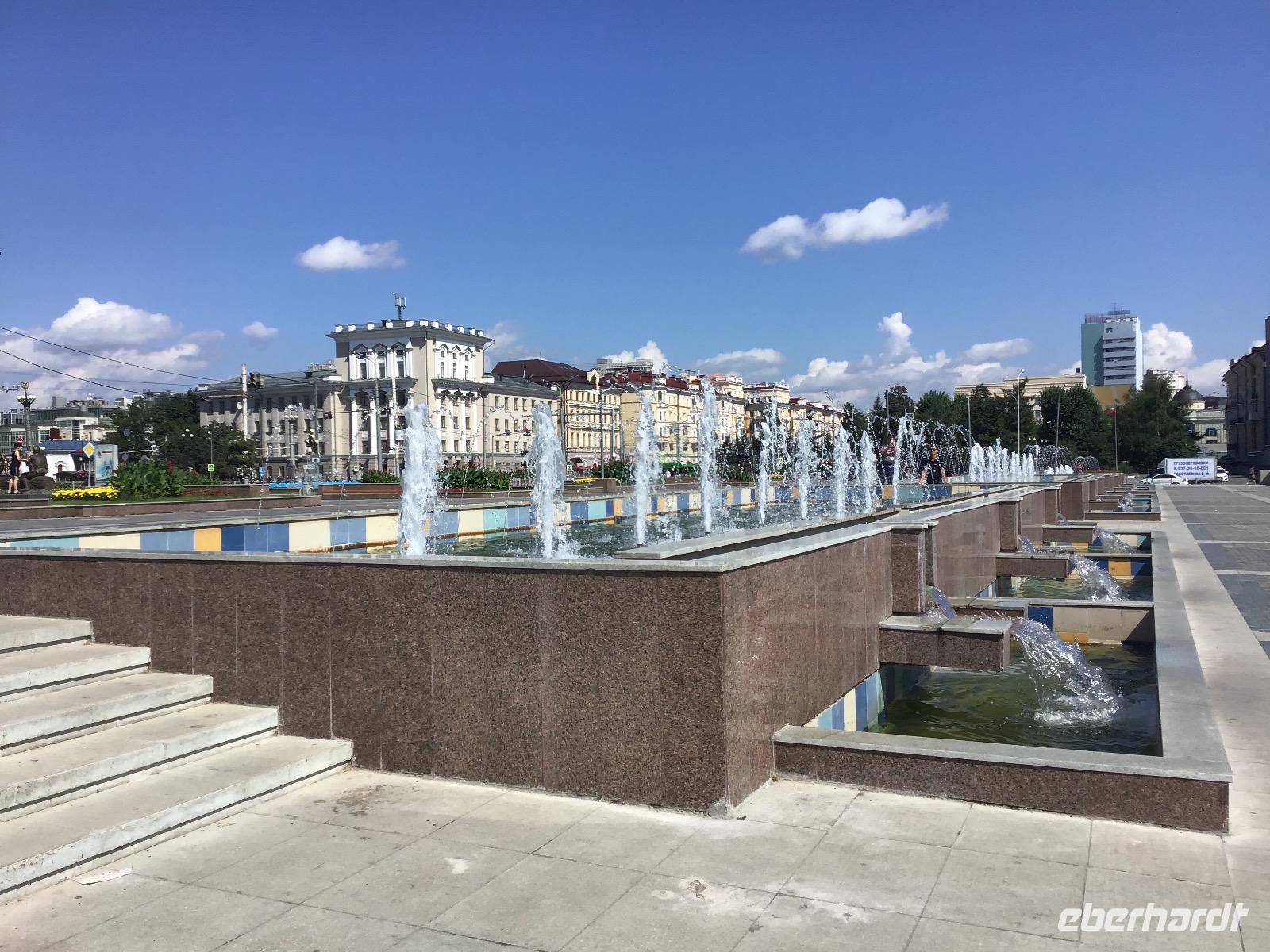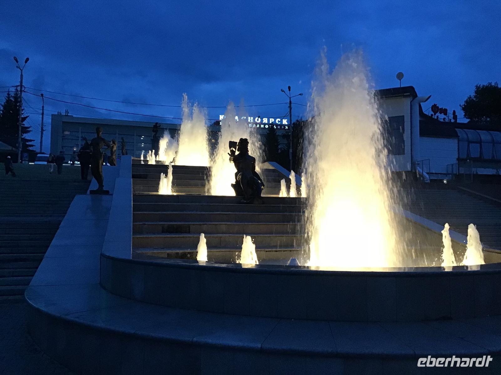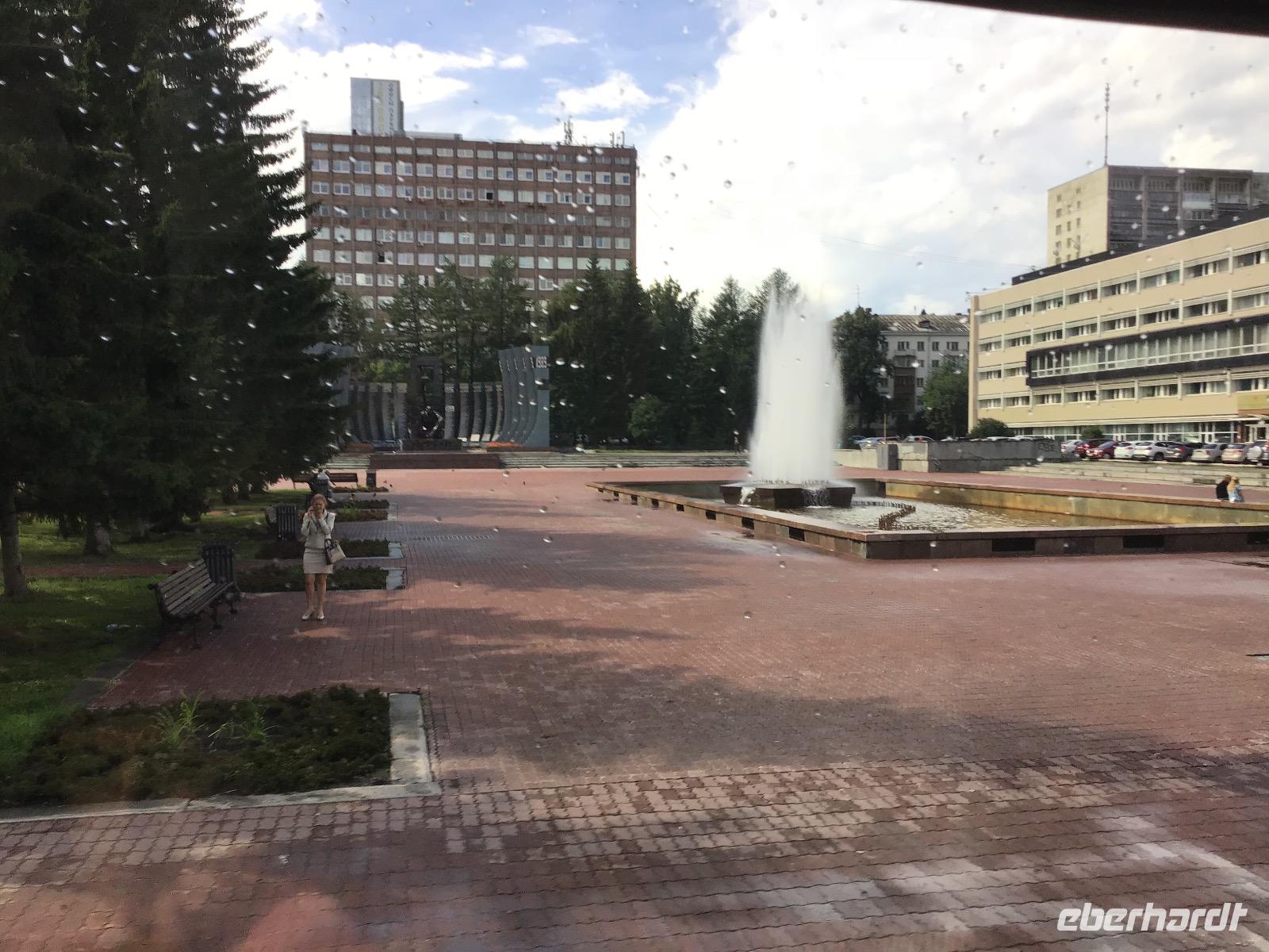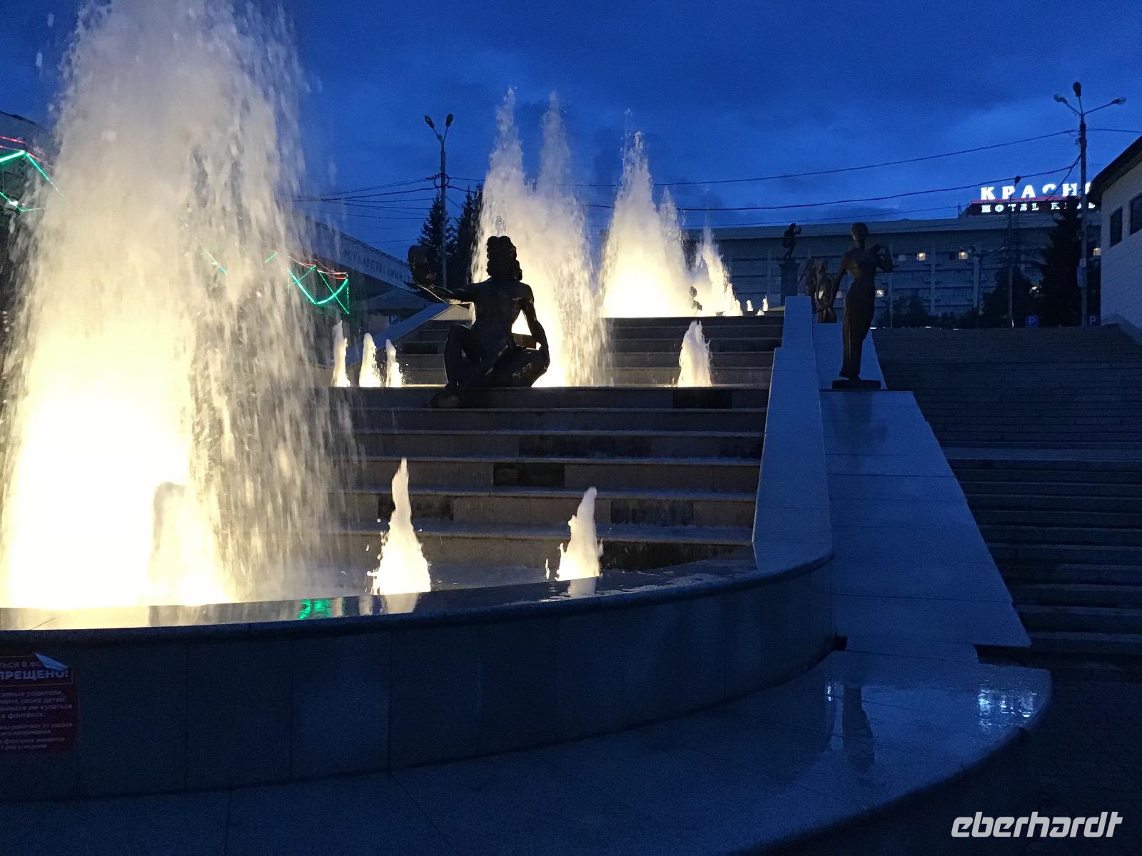 Der Brunnen, der gestern Abend so schön beleuchtet war, ist heute trockengelegt, es finden Wartungsarbeiten statt. Nach einem Imbiss im Café New York fahren wir zum Bahnhof und setzen unsere Fahrt mit der Transsib fort.