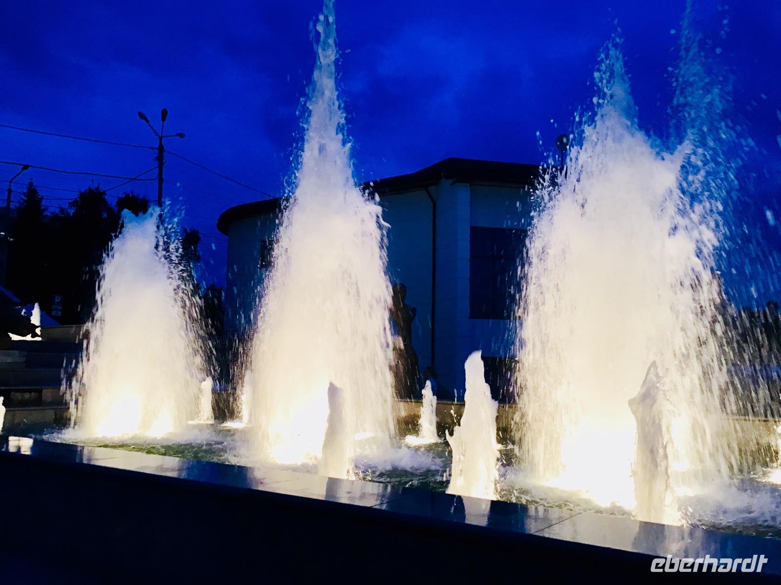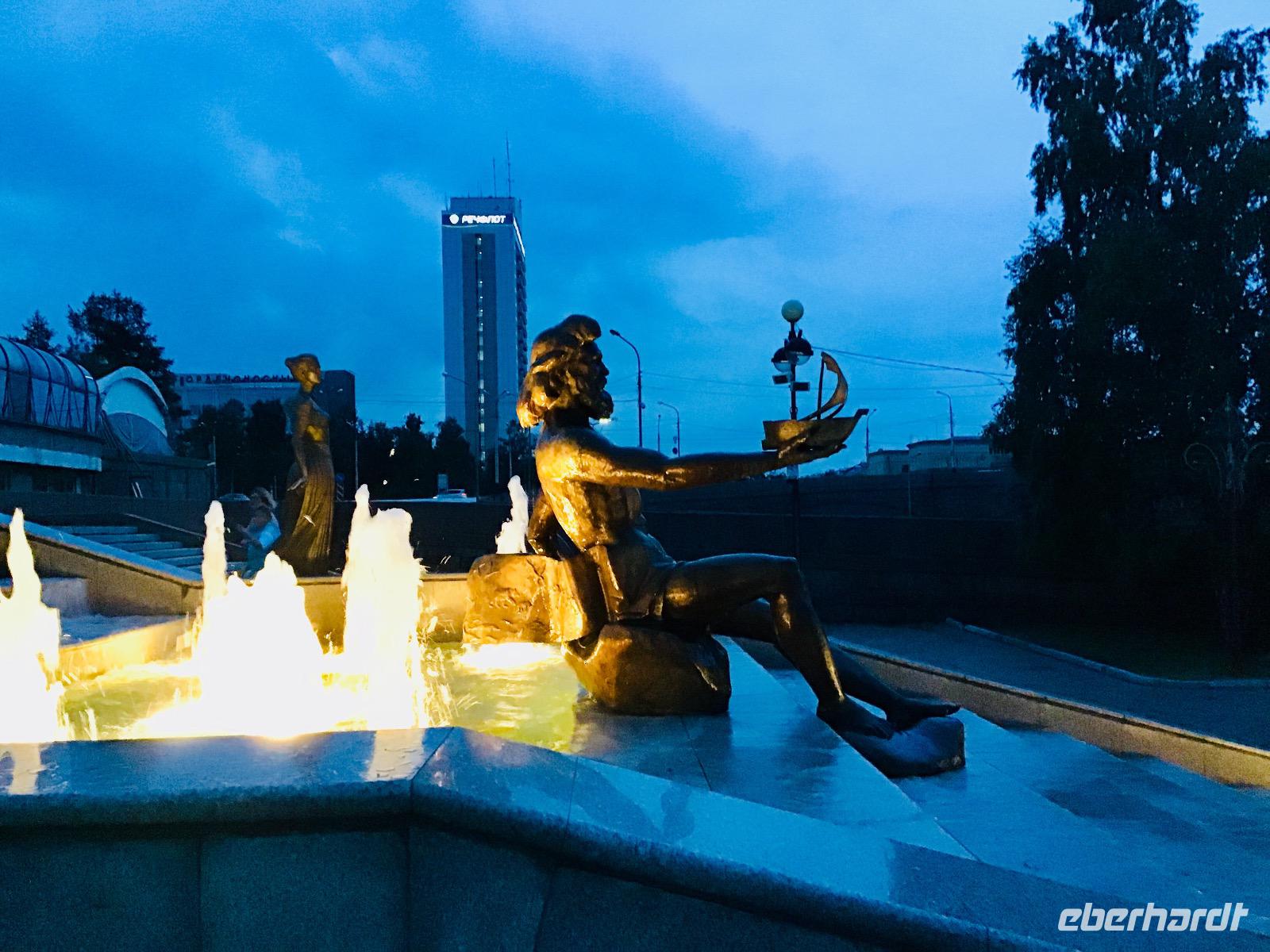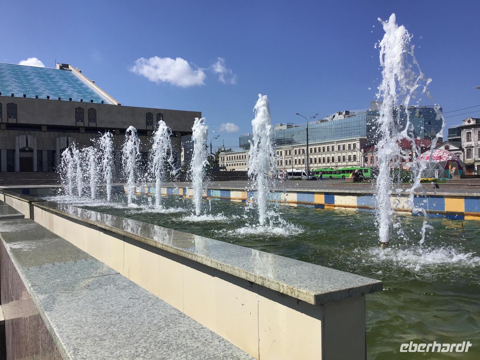 Der Brunnen, der gestern Abend so schön beleuchtet war, ist heute trockengelegt, es finden Wartungsarbeiten statt. Nach einem Imbiss im Café New York fahren wir zum Bahnhof und setzen unsere Fahrt mit der Transsib fort.