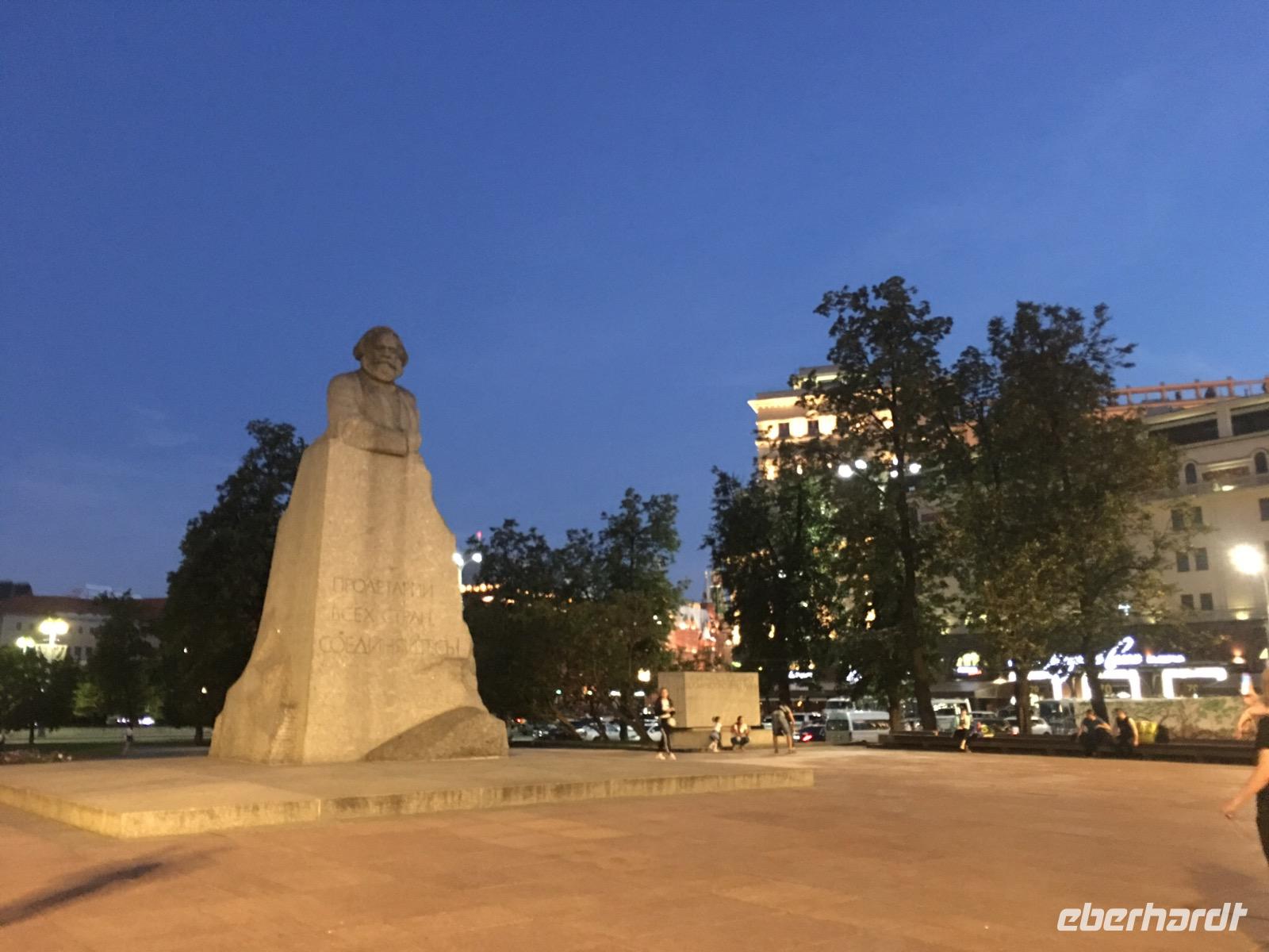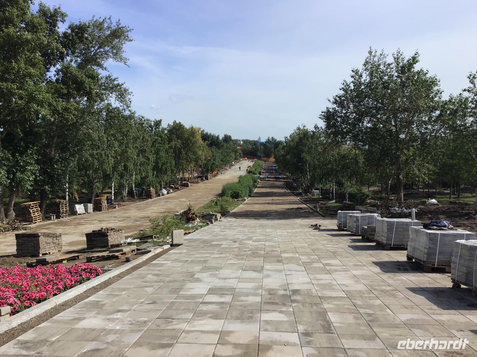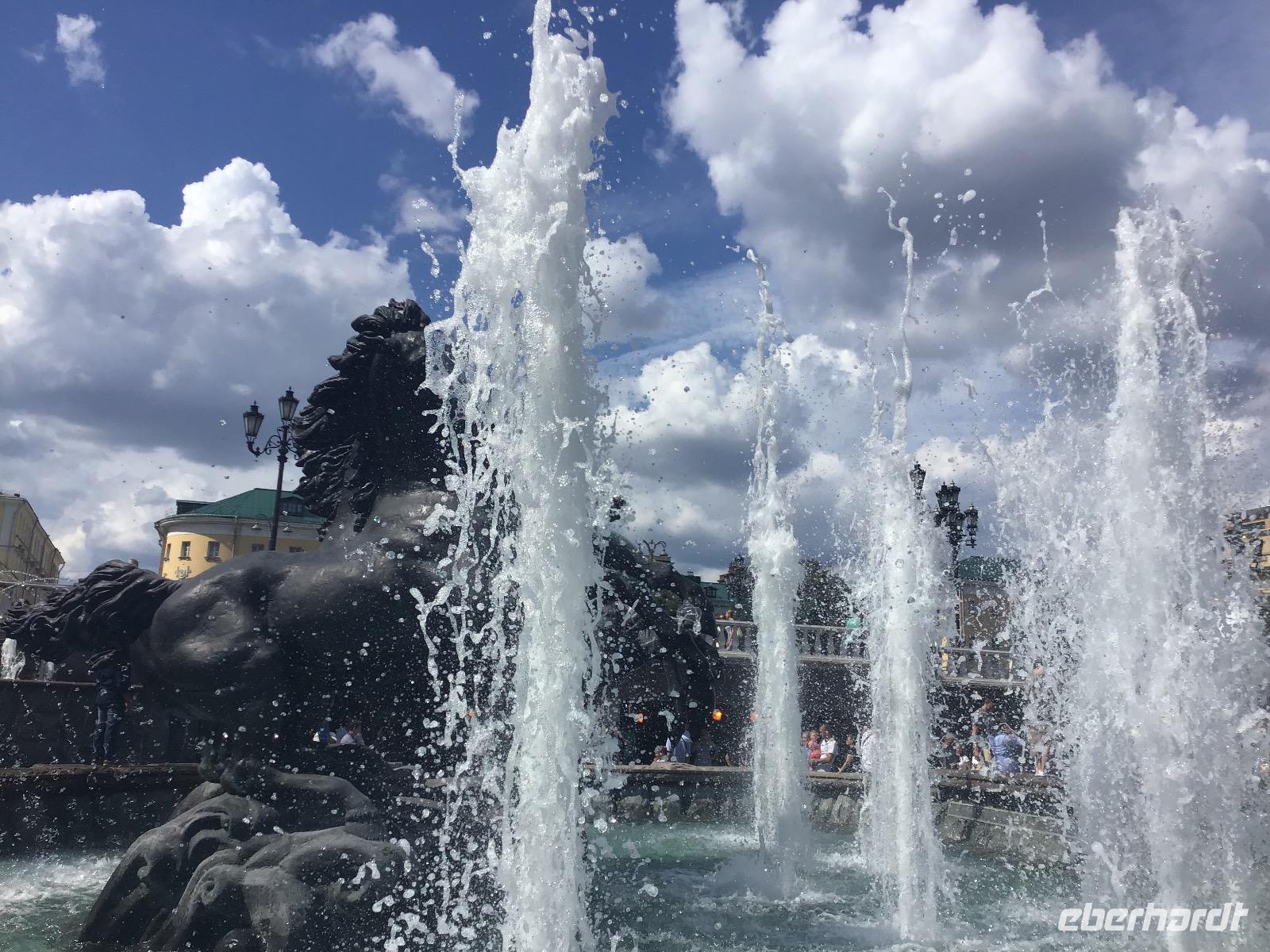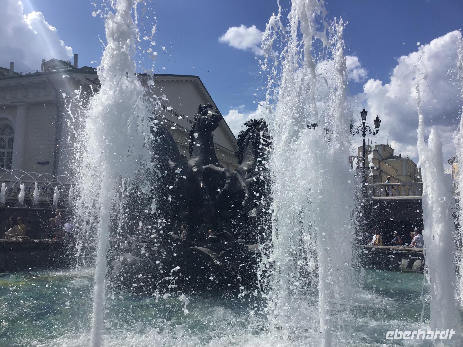 Der Brunnen, der gestern Abend so schön beleuchtet war, ist heute trockengelegt, es finden Wartungsarbeiten statt. Nach einem Imbiss im Café New York fahren wir zum Bahnhof und setzen unsere Fahrt mit der Transsib fort.