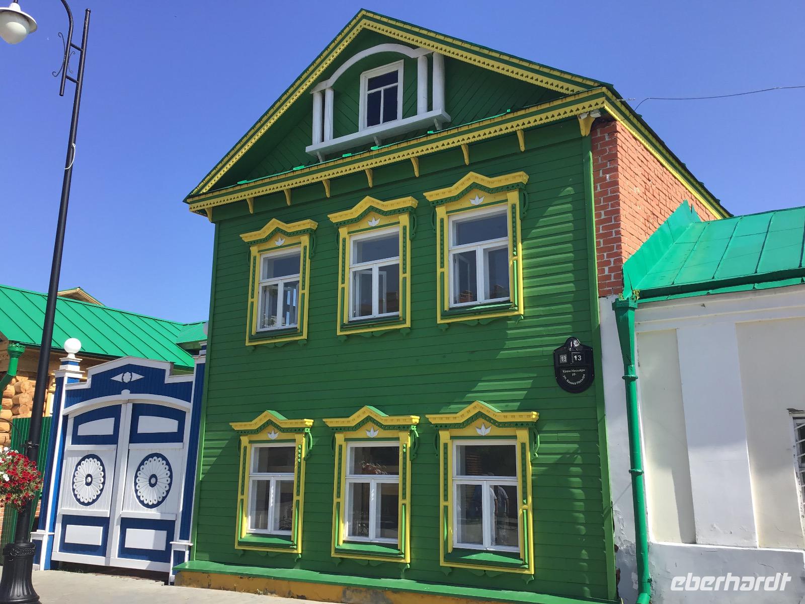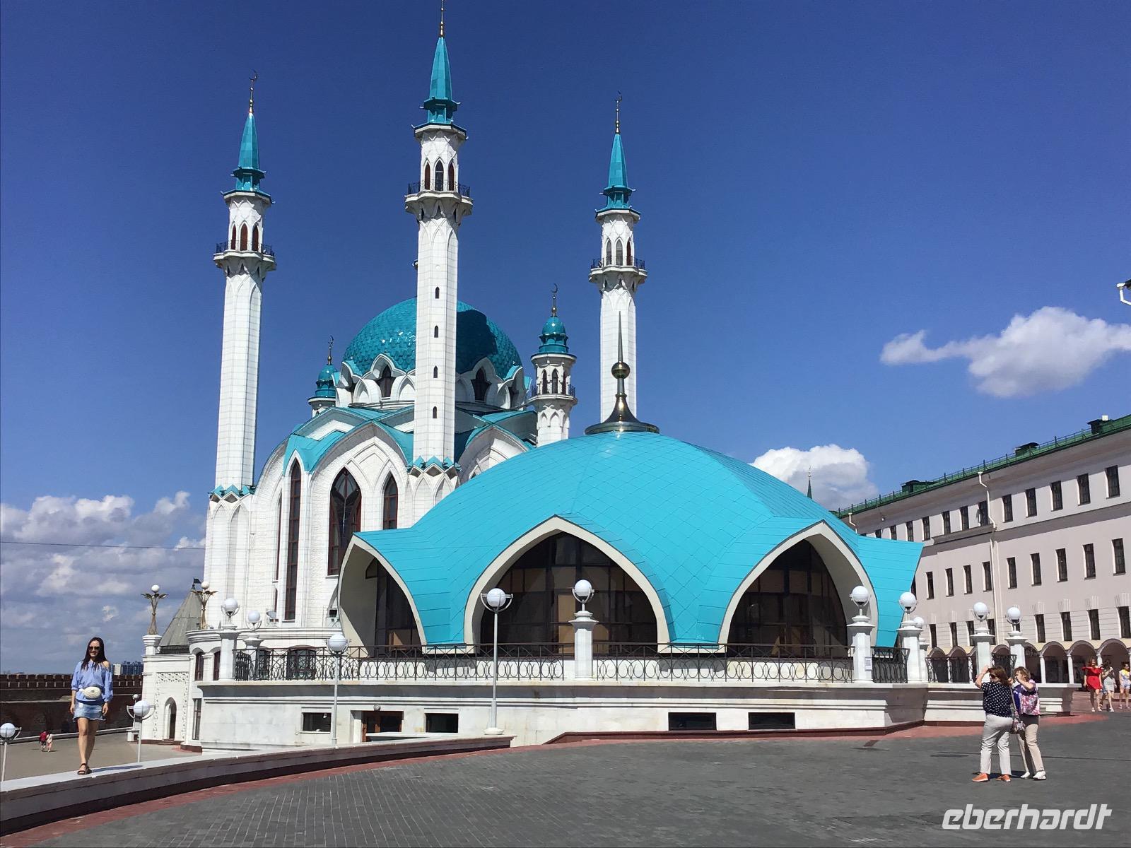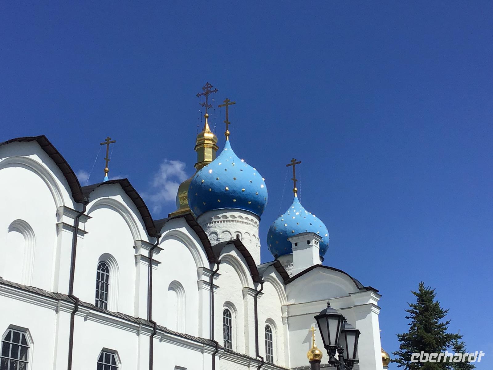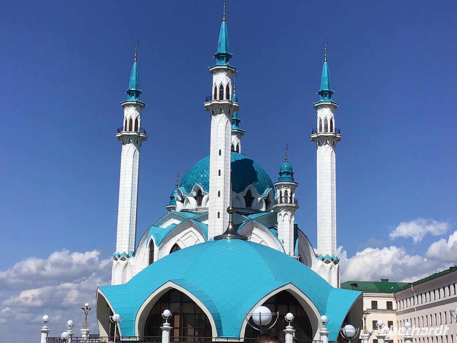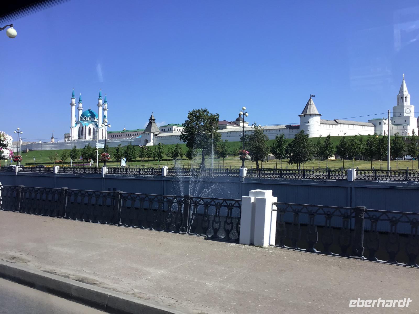 Am frühen Morgen erreich wir Kasan, die Hauptstadt der Republik Tartastan, eine Millionenmetropole, die als eine der schönsten Städte Russlands gilt, wovon wir uns in den nächsten Stunden überzeugen werden. Wir fahren zum Hotel, checken ein, machen uns frisch und frühstücken. Mit Alina, unserer örtlichen Reiseleiterin, erkunden wir heute Kasan. Alle sind überrascht. Was für eine wunderschöne helle saubere Stadt! Alina berichtet stolz, dass hier seit Jahrhunderten Menschen verschiedener Konfessionen friedlich mit einander leben. Mit vielen Sagen und Geschichten bringt uns Alina die Geschichte der Stadt näher. Sie erzählt von den reichen Fürsten, von Mädchen, die jung verheiratet wurden, von Wolga-Bulgaren, dreiköpfigen Drachen und vielem mehr. Wir fahren ins Viertel der Tataren, wo uns bunt angemalte Holzhäuser erwarten. Wir spazieren durch ein tatarisches Kulturzentrum und bedauern, nicht mehr Zeit hier verbringen zu können. Weiter geht es zum Kasaner Kreml. Von hier aus haben wir einen schönen Blick auf den Fluss Kasanka, der von einem Kinderlied besungen wird, das einige von uns sogar kennen. Die blauen Kuppeln und die sie umgebenen Minarette der Kul-Scharif-Moschee bilden ein Postkartenmotiv, das uns nur staunen lässt. Bis in die vierte Etage der Moschee steigen wir hinauf. Hier zeigt uns Alina, wo die Frauen beim Beten sitzen und wo die Männer. Die Moschee ist von Innen ebenso prachtvoll wie von außen. Wir laufen weiter zum Sjujumbeki-Turm, der dem Schiefen Turm von Pisa alle Ehre macht. Nur rangt sich um den Sjujumbeki-Turm wiederum eine Legende, die von einer Tatarentochter berichtet, die sich hier in den Tod gestürzt haben soll. Zeit fürs Mittagessen. In einem russischen Restaurant, das auch tatarische und internationale Speisen anbietet, lassen wir es uns schmecken. Es gibt Suppe mit dreieckigen Piroggen und gegrilltes Fleisch. Zum Nachtisch wird Kuchen gereicht. Wir fahren zum Standesamt, dass sich in einem Gebäude befindet, was wie ein überdimensionaler Kessel aussieht und an die Gründer Geschichte der Stadt erinnert und zum Fußballstadion, in dem die deutsche Mannschaft in diesem Jahr gegen Südkorea verloren hat und somit aus der WM ausgeschieden ist. Weiter gehts zum Puppentheater, in dessen unmittelbarer Nähe aus einem Fass Kwas verkauft wird, den wir, auf Einladung von Eberhardt TRAVEL, verkosten. Und schon ist es Zeit fürs Abendessen, das wir heute in einem Jazz-Restaurant (Perekrestok Djaza) einnehmen. Wir sind in einzigen Gäste und so spielt der Saxophon-Spieler nur für uns. Rechtschaffend müde erreichen wir später das Hotel und fallen in unsere komfortablen Betten.