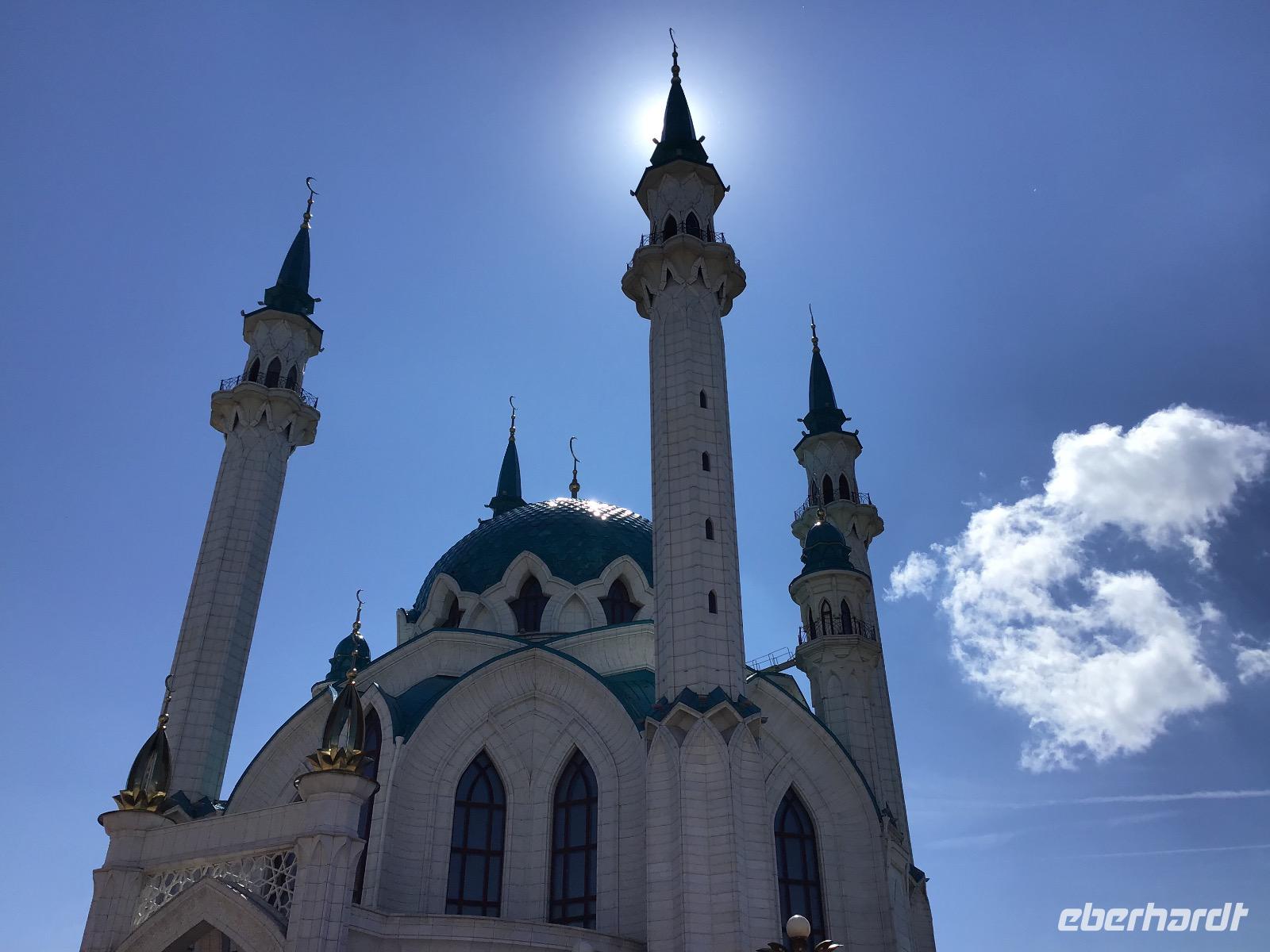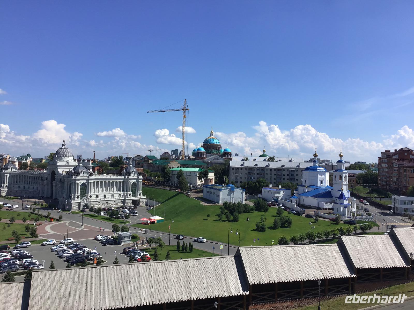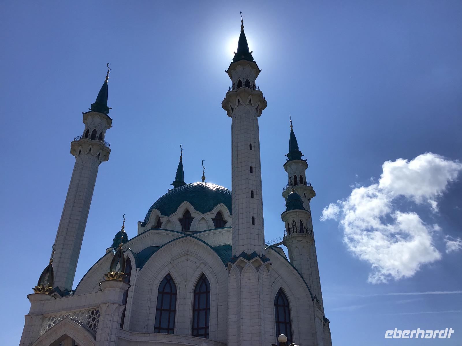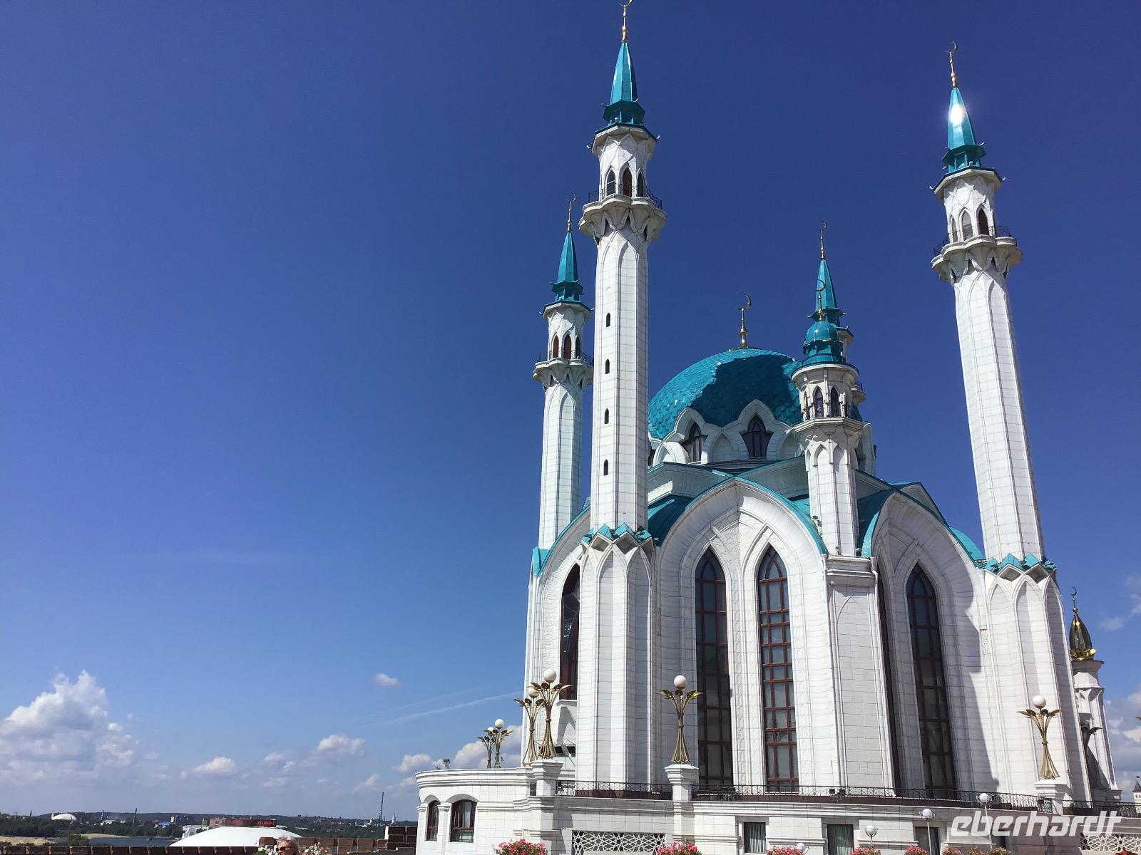 Am frühen Morgen erreich wir Kasan, die Hauptstadt der Republik Tartastan, eine Millionenmetropole, die als eine der schönsten Städte Russlands gilt, wovon wir uns in den nächsten Stunden überzeugen werden. Wir fahren zum Hotel, checken ein, machen uns frisch und frühstücken. Mit Alina, unserer örtlichen Reiseleiterin, erkunden wir heute Kasan. Alle sind überrascht. Was für eine wunderschöne helle saubere Stadt! Alina berichtet stolz, dass hier seit Jahrhunderten Menschen verschiedener Konfessionen friedlich mit einander leben. Mit vielen Sagen und Geschichten bringt uns Alina die Geschichte der Stadt näher. Sie erzählt von den reichen Fürsten, von Mädchen, die jung verheiratet wurden, von Wolga-Bulgaren, dreiköpfigen Drachen und vielem mehr. Wir fahren ins Viertel der Tataren, wo uns bunt angemalte Holzhäuser erwarten. Wir spazieren durch ein tatarisches Kulturzentrum und bedauern, nicht mehr Zeit hier verbringen zu können. Weiter geht es zum Kasaner Kreml. Von hier aus haben wir einen schönen Blick auf den Fluss Kasanka, der von einem Kinderlied besungen wird, das einige von uns sogar kennen. Die blauen Kuppeln und die sie umgebenen Minarette der Kul-Scharif-Moschee bilden ein Postkartenmotiv, das uns nur staunen lässt. Bis in die vierte Etage der Moschee steigen wir hinauf. Hier zeigt uns Alina, wo die Frauen beim Beten sitzen und wo die Männer. Die Moschee ist von Innen ebenso prachtvoll wie von außen. Wir laufen weiter zum Sjujumbeki-Turm, der dem Schiefen Turm von Pisa alle Ehre macht. Nur rangt sich um den Sjujumbeki-Turm wiederum eine Legende, die von einer Tatarentochter berichtet, die sich hier in den Tod gestürzt haben soll. Zeit fürs Mittagessen. In einem russischen Restaurant, das auch tatarische und internationale Speisen anbietet, lassen wir es uns schmecken. Es gibt Suppe mit dreieckigen Piroggen und gegrilltes Fleisch. Zum Nachtisch wird Kuchen gereicht. Wir fahren zum Standesamt, dass sich in einem Gebäude befindet, was wie ein überdimensionaler Kessel aussieht und an die Gründer Geschichte der Stadt erinnert und zum Fußballstadion, in dem die deutsche Mannschaft in diesem Jahr gegen Südkorea verloren hat und somit aus der WM ausgeschieden ist. Weiter gehts zum Puppentheater, in dessen unmittelbarer Nähe aus einem Fass Kwas verkauft wird, den wir, auf Einladung von Eberhardt TRAVEL, verkosten. Und schon ist es Zeit fürs Abendessen, das wir heute in einem Jazz-Restaurant (Perekrestok Djaza) einnehmen. Wir sind in einzigen Gäste und so spielt der Saxophon-Spieler nur für uns. Rechtschaffend müde erreichen wir später das Hotel und fallen in unsere komfortablen Betten.