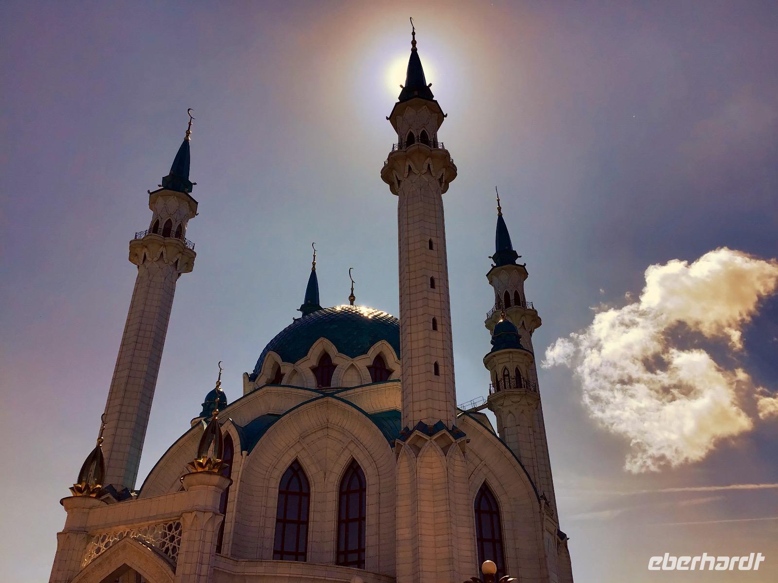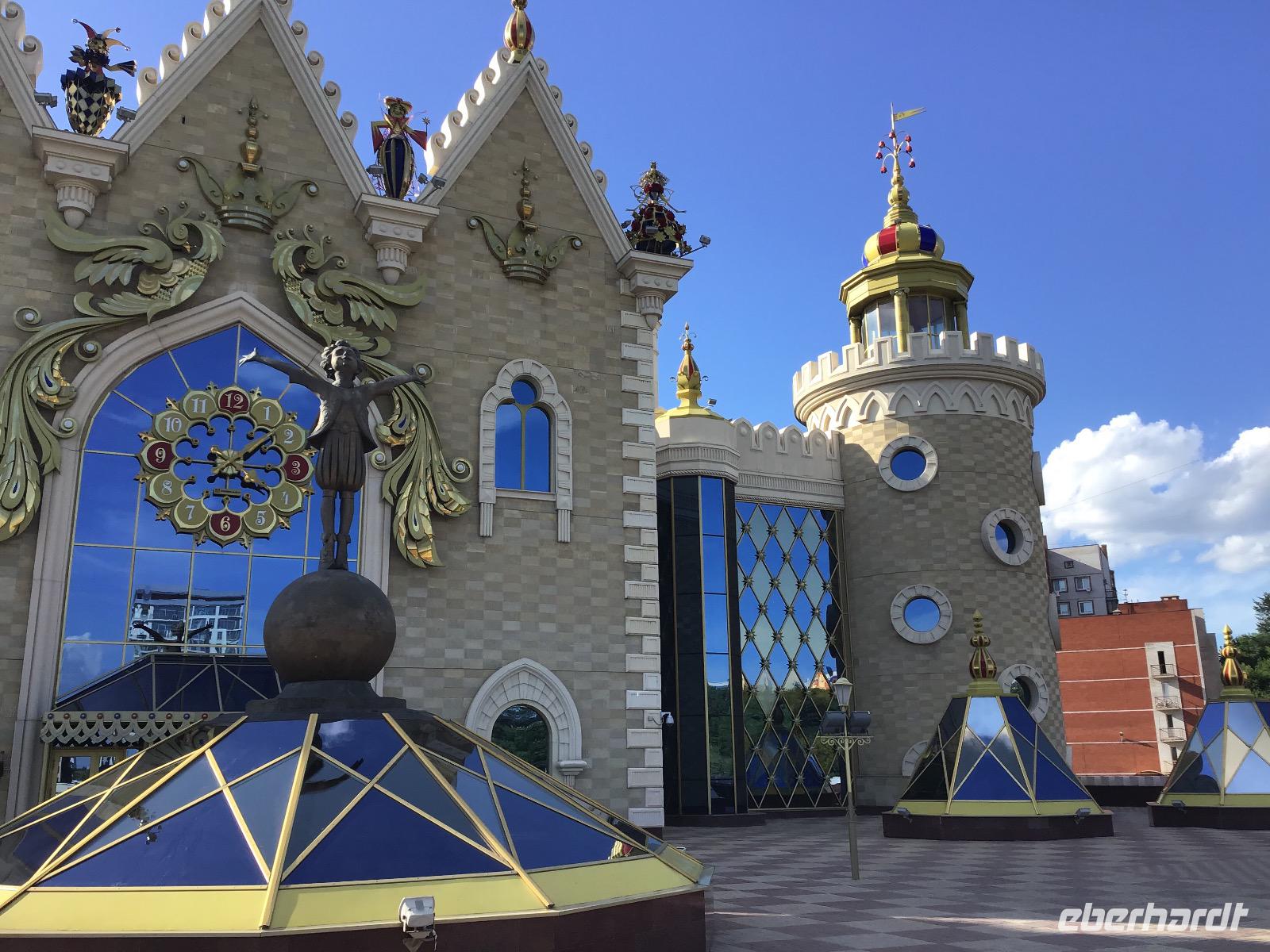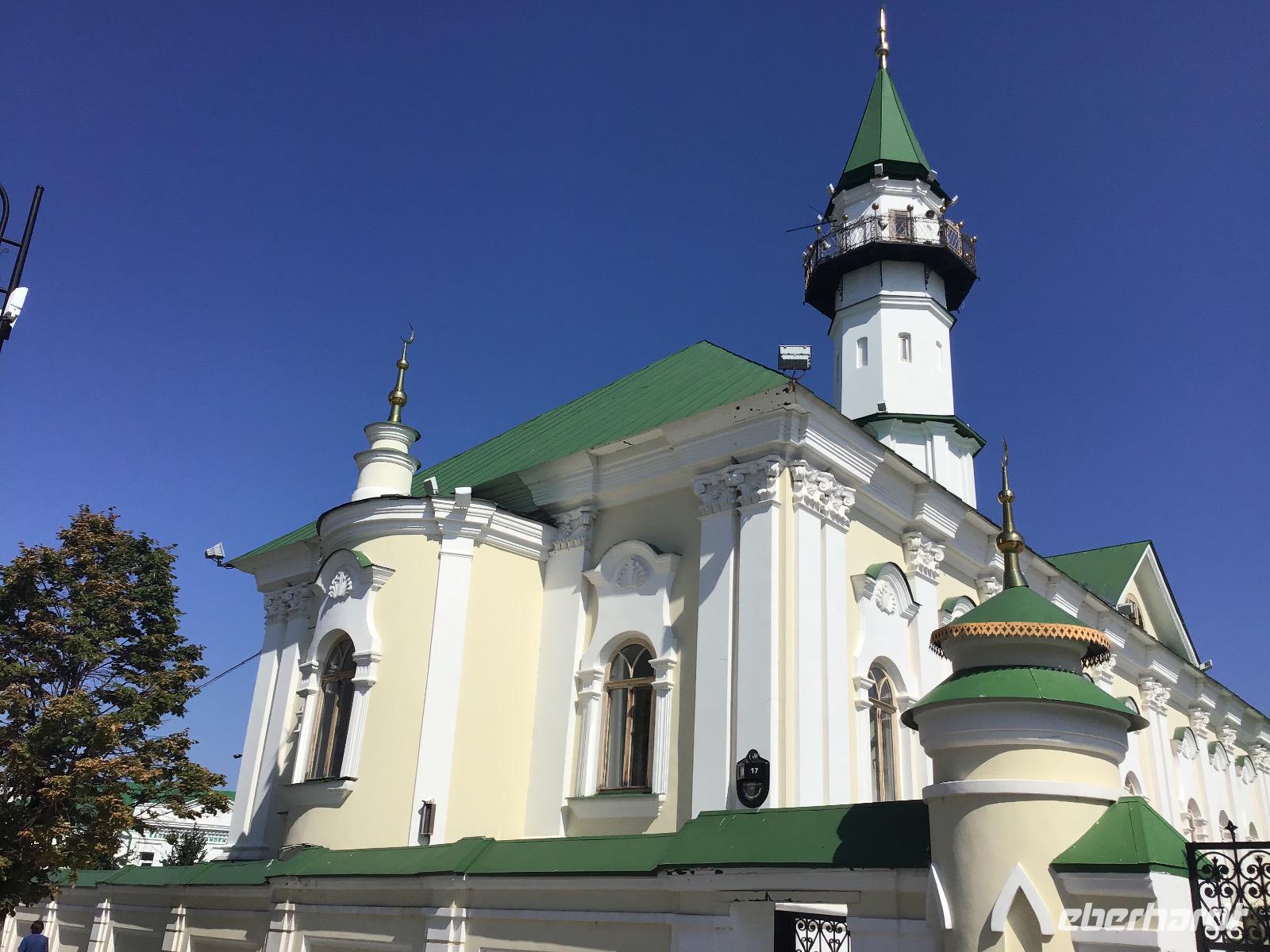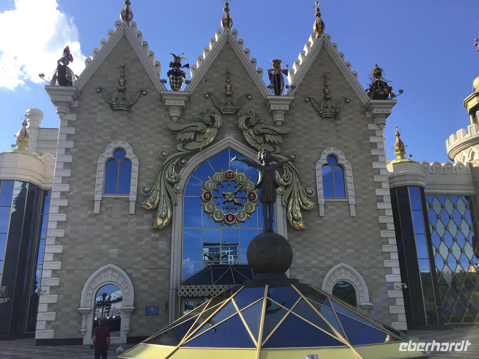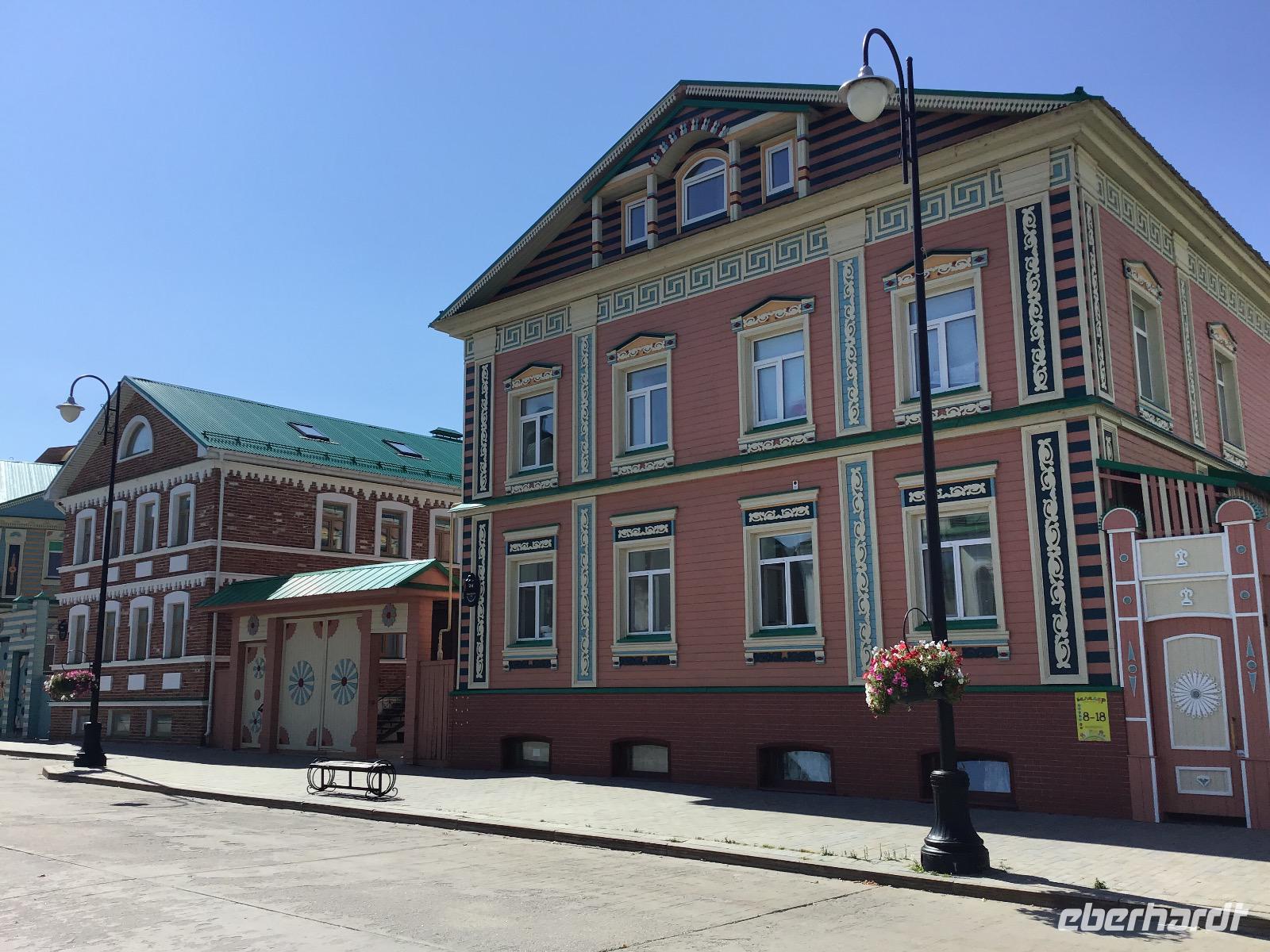 Am frühen Morgen erreich wir Kasan, die Hauptstadt der Republik Tartastan, eine Millionenmetropole, die als eine der schönsten Städte Russlands gilt, wovon wir uns in den nächsten Stunden überzeugen werden. Wir fahren zum Hotel, checken ein, machen uns frisch und frühstücken. Mit Alina, unserer örtlichen Reiseleiterin, erkunden wir heute Kasan. Alle sind überrascht. Was für eine wunderschöne helle saubere Stadt! Alina berichtet stolz, dass hier seit Jahrhunderten Menschen verschiedener Konfessionen friedlich mit einander leben. Mit vielen Sagen und Geschichten bringt uns Alina die Geschichte der Stadt näher. Sie erzählt von den reichen Fürsten, von Mädchen, die jung verheiratet wurden, von Wolga-Bulgaren, dreiköpfigen Drachen und vielem mehr. Wir fahren ins Viertel der Tataren, wo uns bunt angemalte Holzhäuser erwarten. Wir spazieren durch ein tatarisches Kulturzentrum und bedauern, nicht mehr Zeit hier verbringen zu können. Weiter geht es zum Kasaner Kreml. Von hier aus haben wir einen schönen Blick auf den Fluss Kasanka, der von einem Kinderlied besungen wird, das einige von uns sogar kennen. Die blauen Kuppeln und die sie umgebenen Minarette der Kul-Scharif-Moschee bilden ein Postkartenmotiv, das uns nur staunen lässt. Bis in die vierte Etage der Moschee steigen wir hinauf. Hier zeigt uns Alina, wo die Frauen beim Beten sitzen und wo die Männer. Die Moschee ist von Innen ebenso prachtvoll wie von außen. Wir laufen weiter zum Sjujumbeki-Turm, der dem Schiefen Turm von Pisa alle Ehre macht. Nur rangt sich um den Sjujumbeki-Turm wiederum eine Legende, die von einer Tatarentochter berichtet, die sich hier in den Tod gestürzt haben soll. Zeit fürs Mittagessen. In einem russischen Restaurant, das auch tatarische und internationale Speisen anbietet, lassen wir es uns schmecken. Es gibt Suppe mit dreieckigen Piroggen und gegrilltes Fleisch. Zum Nachtisch wird Kuchen gereicht. Wir fahren zum Standesamt, dass sich in einem Gebäude befindet, was wie ein überdimensionaler Kessel aussieht und an die Gründer Geschichte der Stadt erinnert und zum Fußballstadion, in dem die deutsche Mannschaft in diesem Jahr gegen Südkorea verloren hat und somit aus der WM ausgeschieden ist. Weiter gehts zum Puppentheater, in dessen unmittelbarer Nähe aus einem Fass Kwas verkauft wird, den wir, auf Einladung von Eberhardt TRAVEL, verkosten. Und schon ist es Zeit fürs Abendessen, das wir heute in einem Jazz-Restaurant (Perekrestok Djaza) einnehmen. Wir sind in einzigen Gäste und so spielt der Saxophon-Spieler nur für uns. Rechtschaffend müde erreichen wir später das Hotel und fallen in unsere komfortablen Betten.