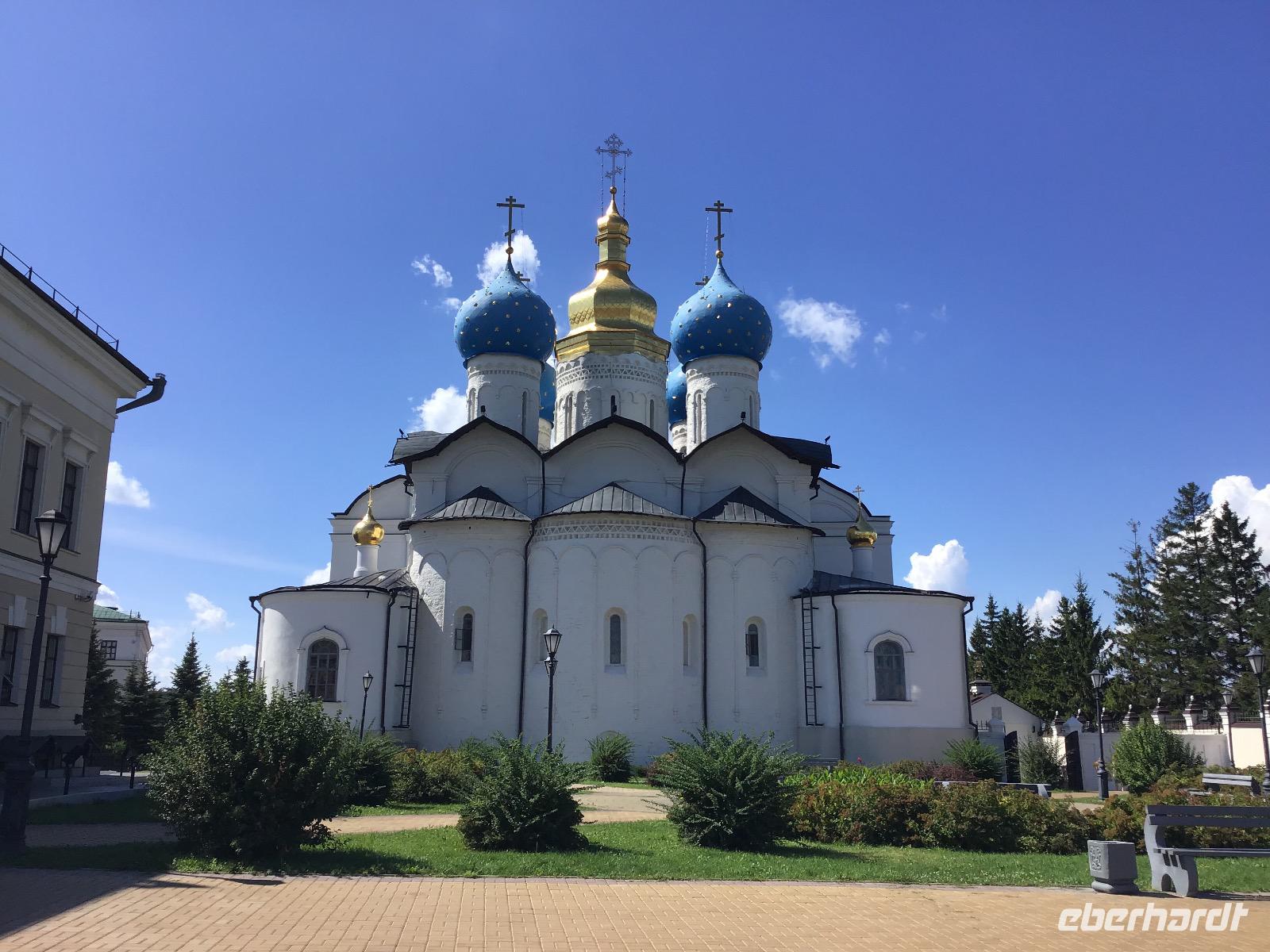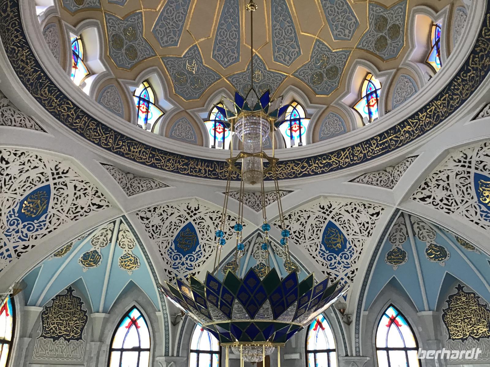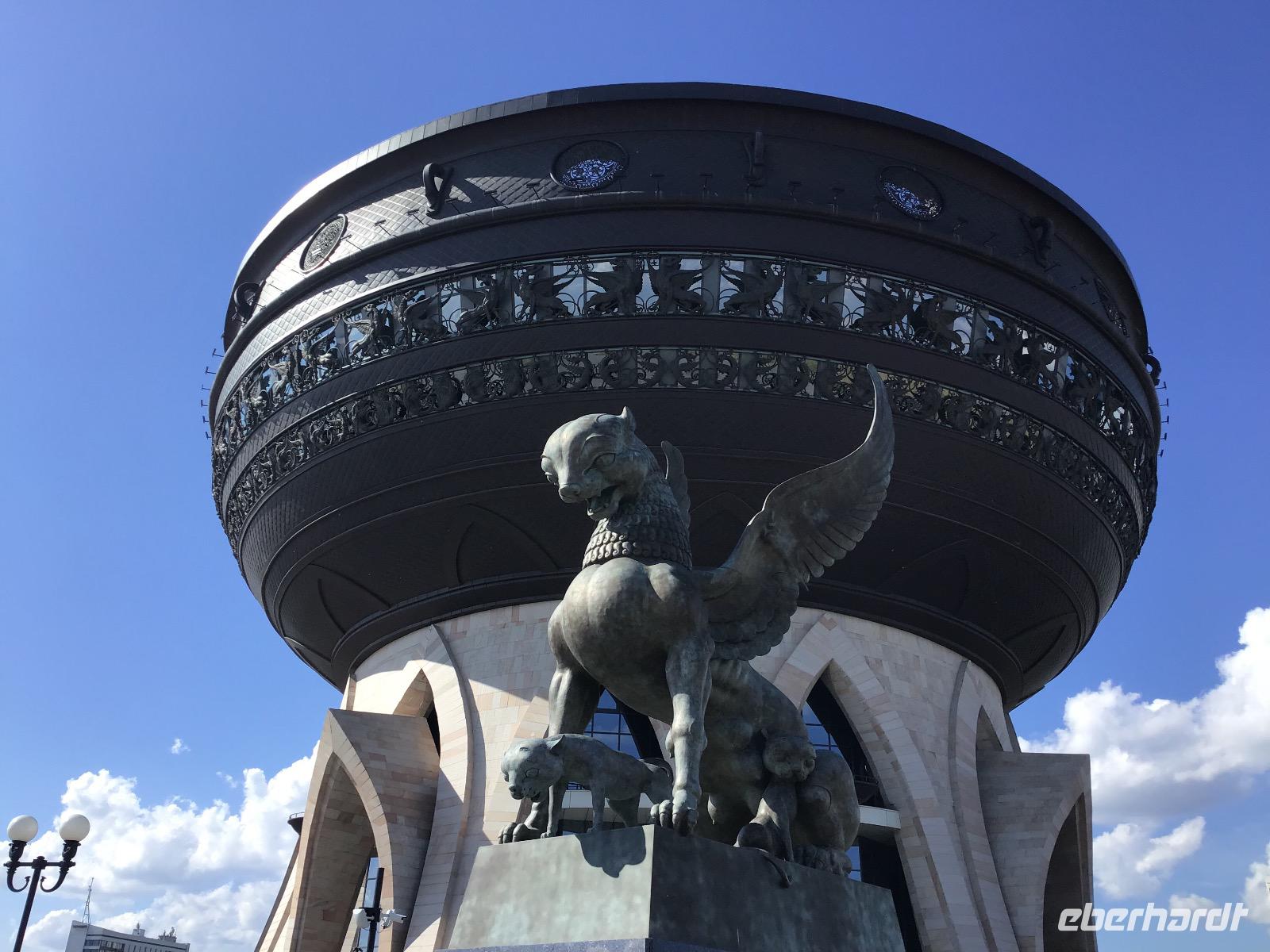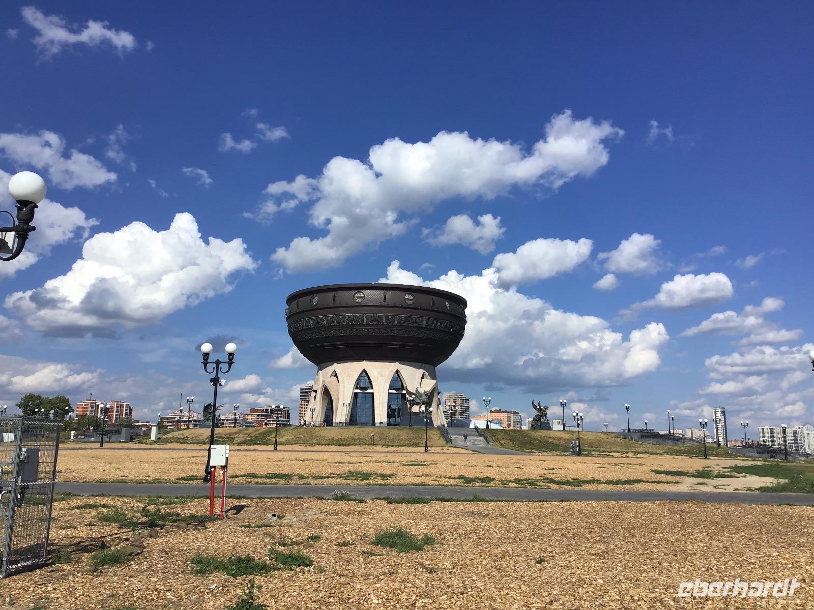 Am frühen Morgen erreich wir Kasan, die Hauptstadt der Republik Tartastan, eine Millionenmetropole, die als eine der schönsten Städte Russlands gilt, wovon wir uns in den nächsten Stunden überzeugen werden. Wir fahren zum Hotel, checken ein, machen uns frisch und frühstücken. Mit Alina, unserer örtlichen Reiseleiterin, erkunden wir heute Kasan. Alle sind überrascht. Was für eine wunderschöne helle saubere Stadt! Alina berichtet stolz, dass hier seit Jahrhunderten Menschen verschiedener Konfessionen friedlich mit einander leben. Mit vielen Sagen und Geschichten bringt uns Alina die Geschichte der Stadt näher. Sie erzählt von den reichen Fürsten, von Mädchen, die jung verheiratet wurden, von Wolga-Bulgaren, dreiköpfigen Drachen und vielem mehr. Wir fahren ins Viertel der Tataren, wo uns bunt angemalte Holzhäuser erwarten. Wir spazieren durch ein tatarisches Kulturzentrum und bedauern, nicht mehr Zeit hier verbringen zu können. Weiter geht es zum Kasaner Kreml. Von hier aus haben wir einen schönen Blick auf den Fluss Kasanka, der von einem Kinderlied besungen wird, das einige von uns sogar kennen. Die blauen Kuppeln und die sie umgebenen Minarette der Kul-Scharif-Moschee bilden ein Postkartenmotiv, das uns nur staunen lässt. Bis in die vierte Etage der Moschee steigen wir hinauf. Hier zeigt uns Alina, wo die Frauen beim Beten sitzen und wo die Männer. Die Moschee ist von Innen ebenso prachtvoll wie von außen. Wir laufen weiter zum Sjujumbeki-Turm, der dem Schiefen Turm von Pisa alle Ehre macht. Nur rangt sich um den Sjujumbeki-Turm wiederum eine Legende, die von einer Tatarentochter berichtet, die sich hier in den Tod gestürzt haben soll. Zeit fürs Mittagessen. In einem russischen Restaurant, das auch tatarische und internationale Speisen anbietet, lassen wir es uns schmecken. Es gibt Suppe mit dreieckigen Piroggen und gegrilltes Fleisch. Zum Nachtisch wird Kuchen gereicht. Wir fahren zum Standesamt, dass sich in einem Gebäude befindet, was wie ein überdimensionaler Kessel aussieht und an die Gründer Geschichte der Stadt erinnert und zum Fußballstadion, in dem die deutsche Mannschaft in diesem Jahr gegen Südkorea verloren hat und somit aus der WM ausgeschieden ist. Weiter gehts zum Puppentheater, in dessen unmittelbarer Nähe aus einem Fass Kwas verkauft wird, den wir, auf Einladung von Eberhardt TRAVEL, verkosten. Und schon ist es Zeit fürs Abendessen, das wir heute in einem Jazz-Restaurant (Perekrestok Djaza) einnehmen. Wir sind in einzigen Gäste und so spielt der Saxophon-Spieler nur für uns. Rechtschaffend müde erreichen wir später das Hotel und fallen in unsere komfortablen Betten.