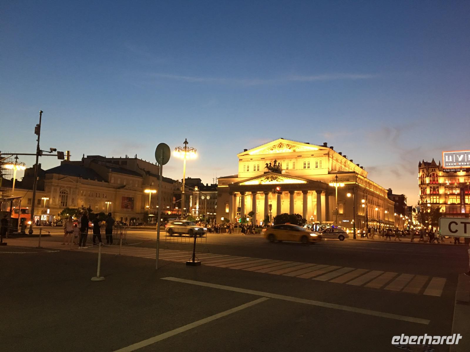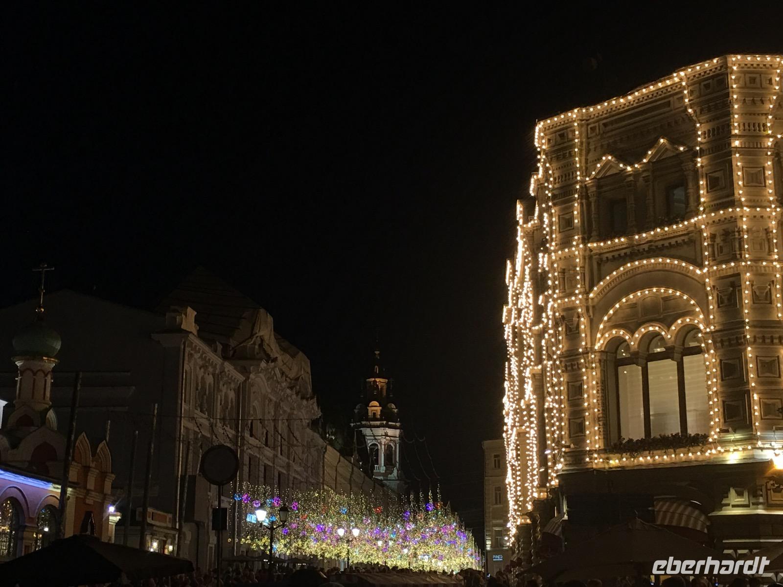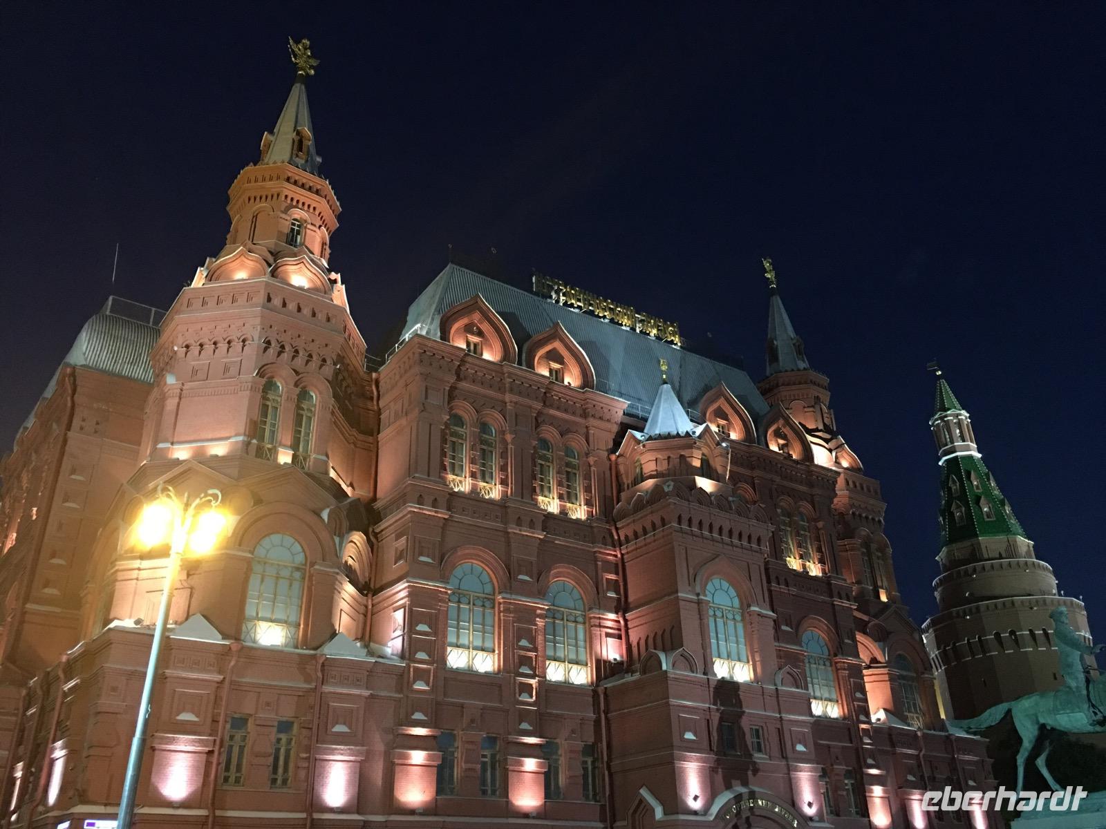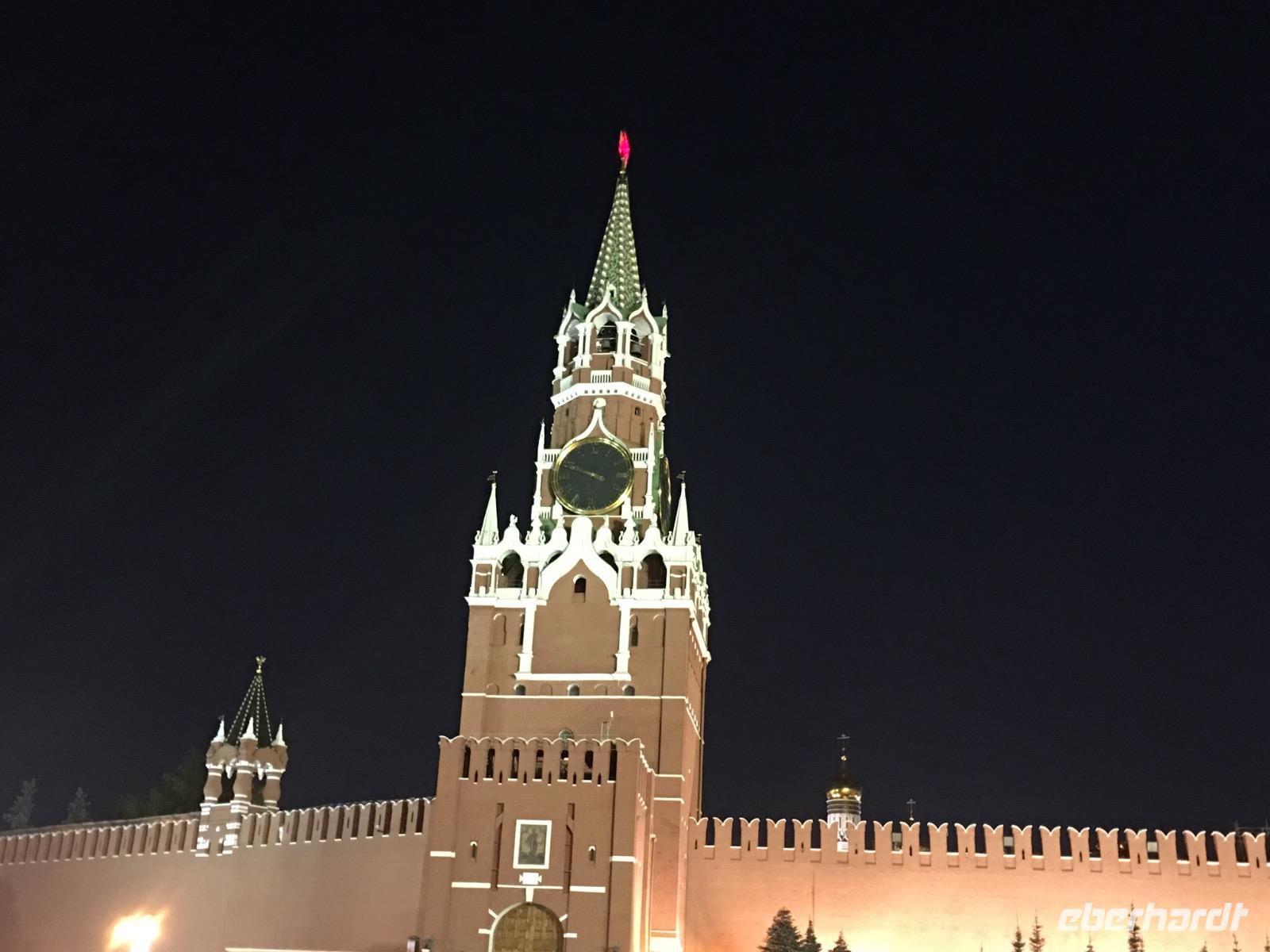 Nachdem wir aus verschiedenen Städten Deutschlands angereist und zum Hotel transferiert wurden, beschließen wir, direkt nach dem Abendessen Moskau bei Nacht zu erobern. Zunächst jedoch müssen wir uns ein paar Rubel besorgen. Gesagt - getan. An der Hotelrezeption sagt man uns, wo sich die nächste Wechselstube befindet. Links - links - rechts. Oh - da ist nichts. Wir laufen noch ein paar Ecken weiter, aber keine Wechselstube ist zu finden. Auf dem Rückweg zum Hotel kommen wir an einem Einkaufszentrum vorbei. Schlaue Köpfe aus unserer Gruppe kommen auf die Idee, hier mal nachzuschauen. Und siehe da - ein kleines Kabuffchen mit einem kleinen Mütterchen steht hier zum Geld wechseln bereit. Nun ja, Mütterchen ist nicht gerade begeistert, dass sie eine halbe Stunde vor Feierabend noch so viel arbeiten soll. Immer wieder weist sie auf die Uhr und die Öffnungszeiten. Wir greifen zu einem (vermeintlichen) Trick und geben ihr alles Geld auf einmal, anstatt jeder für sich. Doch da haben wir die Rechnung ohne das Mütterchen gemacht. Prompt bekommen wir alles Geld zurück, mit dem Hinweis, dass sie höchstens fünfhundert Euro pro Person eintauscht. So kommt es, dass alle mit einem, wenn auch kleinem, Taschengeld für den Abend gerüstet sind. Während unseres Ausflugs zur Wechselstube haben wir bereits ausgemacht, wo sich die nächstgelegene Metro-Station befindet. Dieses kommt uns am Abend zu Gute. Nur zwei Stationen sind es bis zur TEATRALNAJA, von dort suchen wir uns den Ausgang zum Platz der Revolution und stehen mitten im Zentrum Moskaus. Von Weitem ist das beleuchtete Bolschoi-Theater zu sehen und so führt uns der erste Weg dorthin. An einem geöffneten Biergarten und einem geschlossenen Vergnügungspark vorbei spazieren wir durch die belebten Straßen. Das Bolschoi-Theater ist international bekannt für seine hervorragende Ballett-Gruppe. Seit 1856 finden die Vorstellungen in eben jenem Haus statt, vor dem wir gerade stehen. Zweitausend Plätze gibt es in dem Innen in Weiß, Gold und Rot gestaltetem Raum, den wir heute leider nicht zu sehen bekommen. Wir begnügen uns damit, das Gebäude von außen zu bewundern und sind auch schon damit beeindruckt. Vom Bolschoi-Theater kommen wir zum Karl-Marx-Denkmal und dann, am Historischen Museum vorbei, direkt zum Roten Platz. Hier tobt das Leben. Eine der Straßen ist über und über mit glitzernden Girlanden geschmückt. Rings um das Lenin-Mausoleum ist alles abgesperrt und eine riesige Tribüne für das kommende Militärmusikfestival ist aufgebaut. Wir schlängeln uns zwischen GUM und Absperrung vorbei und erreichen die schön beleuchtete Basilius-Kathedrale. Die bunten Zwiebeltürme heben sich postkartengleich vom schwarzen Abendhimmel ab. Die Basilius-Kathedrale wurde von Iwan dem Schrecklichen zum Gedenken an die Eroberung des Khanats Kasan im Jahre 1552 drei Jahre später erbaut. Heute ist es schon zu spät, um noch in die Kathedrale zu gehen, das holen wir morgen nach. Tatsächlich ist es schon nach zehn Uhr abends und so fahren wir mit der Metro zurück zum Hotel. Ein paar Nimmermüde genießen noch einen Cocktail in der 34. Etage des Swiss-Hotels mit traumhaften Blick auf die Stadt. Das Gute-Nacht-Bierchen im Hotel ist ebenfalls nicht zu verachten.