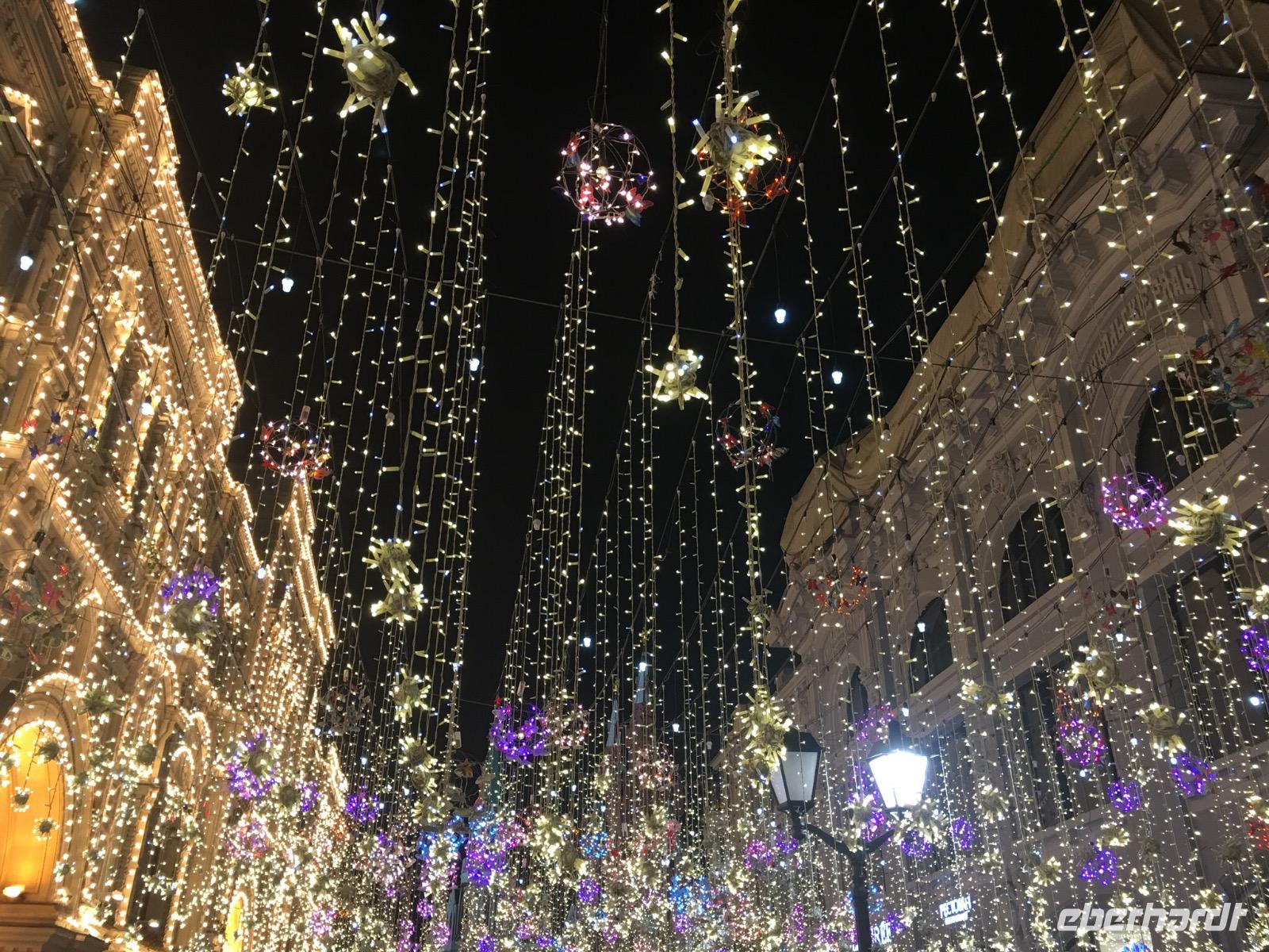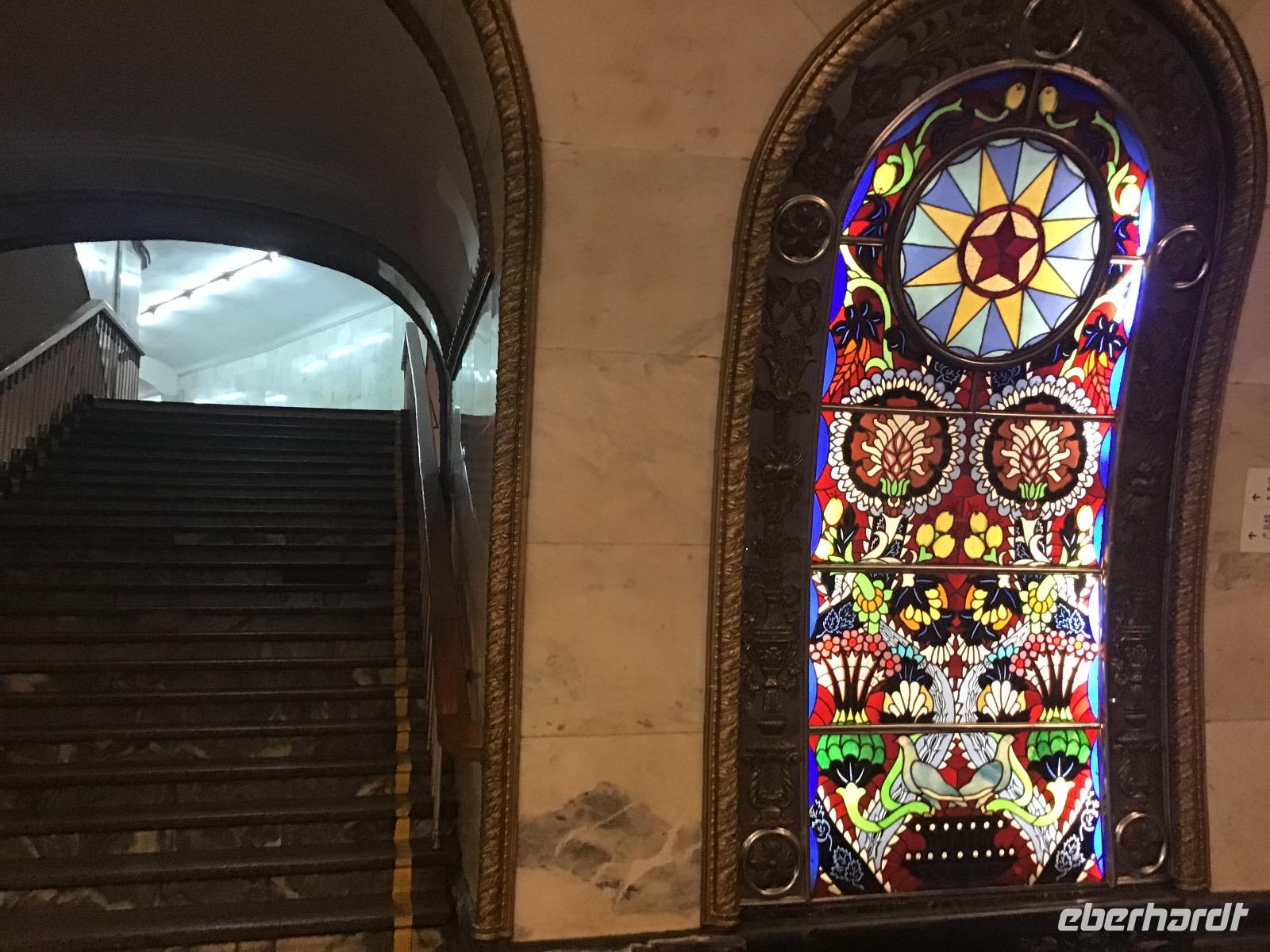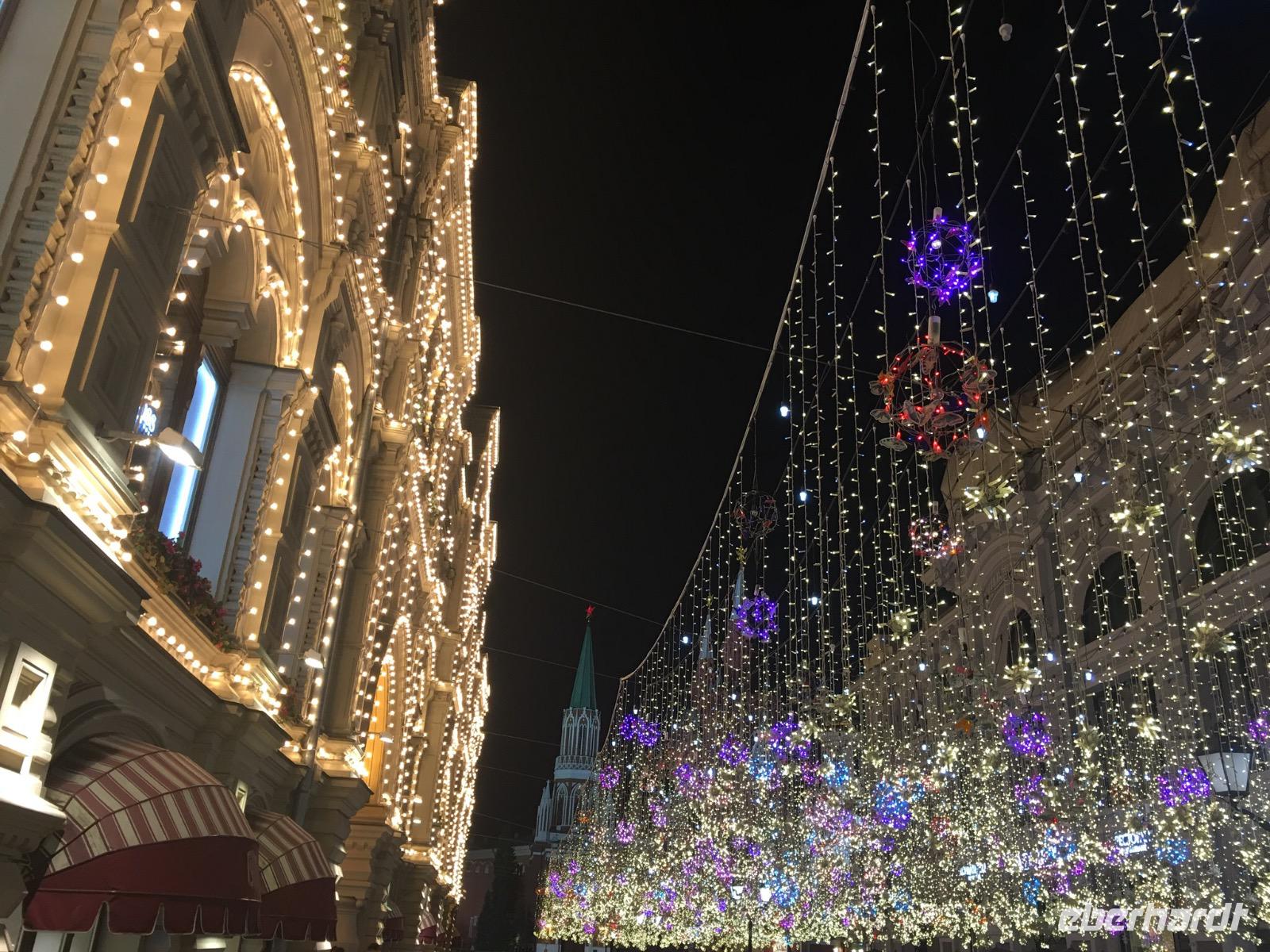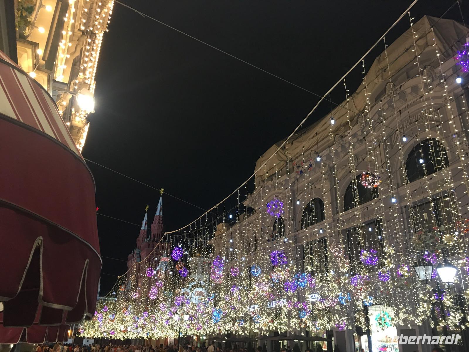 Nachdem wir aus verschiedenen Städten Deutschlands angereist und zum Hotel transferiert wurden, beschließen wir, direkt nach dem Abendessen Moskau bei Nacht zu erobern. Zunächst jedoch müssen wir uns ein paar Rubel besorgen. Gesagt - getan. An der Hotelrezeption sagt man uns, wo sich die nächste Wechselstube befindet. Links - links - rechts. Oh - da ist nichts. Wir laufen noch ein paar Ecken weiter, aber keine Wechselstube ist zu finden. Auf dem Rückweg zum Hotel kommen wir an einem Einkaufszentrum vorbei. Schlaue Köpfe aus unserer Gruppe kommen auf die Idee, hier mal nachzuschauen. Und siehe da - ein kleines Kabuffchen mit einem kleinen Mütterchen steht hier zum Geld wechseln bereit. Nun ja, Mütterchen ist nicht gerade begeistert, dass sie eine halbe Stunde vor Feierabend noch so viel arbeiten soll. Immer wieder weist sie auf die Uhr und die Öffnungszeiten. Wir greifen zu einem (vermeintlichen) Trick und geben ihr alles Geld auf einmal, anstatt jeder für sich. Doch da haben wir die Rechnung ohne das Mütterchen gemacht. Prompt bekommen wir alles Geld zurück, mit dem Hinweis, dass sie höchstens fünfhundert Euro pro Person eintauscht. So kommt es, dass alle mit einem, wenn auch kleinem, Taschengeld für den Abend gerüstet sind. Während unseres Ausflugs zur Wechselstube haben wir bereits ausgemacht, wo sich die nächstgelegene Metro-Station befindet. Dieses kommt uns am Abend zu Gute. Nur zwei Stationen sind es bis zur TEATRALNAJA, von dort suchen wir uns den Ausgang zum Platz der Revolution und stehen mitten im Zentrum Moskaus. Von Weitem ist das beleuchtete Bolschoi-Theater zu sehen und so führt uns der erste Weg dorthin. An einem geöffneten Biergarten und einem geschlossenen Vergnügungspark vorbei spazieren wir durch die belebten Straßen. Das Bolschoi-Theater ist international bekannt für seine hervorragende Ballett-Gruppe. Seit 1856 finden die Vorstellungen in eben jenem Haus statt, vor dem wir gerade stehen. Zweitausend Plätze gibt es in dem Innen in Weiß, Gold und Rot gestaltetem Raum, den wir heute leider nicht zu sehen bekommen. Wir begnügen uns damit, das Gebäude von außen zu bewundern und sind auch schon damit beeindruckt. Vom Bolschoi-Theater kommen wir zum Karl-Marx-Denkmal und dann, am Historischen Museum vorbei, direkt zum Roten Platz. Hier tobt das Leben. Eine der Straßen ist über und über mit glitzernden Girlanden geschmückt. Rings um das Lenin-Mausoleum ist alles abgesperrt und eine riesige Tribüne für das kommende Militärmusikfestival ist aufgebaut. Wir schlängeln uns zwischen GUM und Absperrung vorbei und erreichen die schön beleuchtete Basilius-Kathedrale. Die bunten Zwiebeltürme heben sich postkartengleich vom schwarzen Abendhimmel ab. Die Basilius-Kathedrale wurde von Iwan dem Schrecklichen zum Gedenken an die Eroberung des Khanats Kasan im Jahre 1552 drei Jahre später erbaut. Heute ist es schon zu spät, um noch in die Kathedrale zu gehen, das holen wir morgen nach. Tatsächlich ist es schon nach zehn Uhr abends und so fahren wir mit der Metro zurück zum Hotel. Ein paar Nimmermüde genießen noch einen Cocktail in der 34. Etage des Swiss-Hotels mit traumhaften Blick auf die Stadt. Das Gute-Nacht-Bierchen im Hotel ist ebenfalls nicht zu verachten.