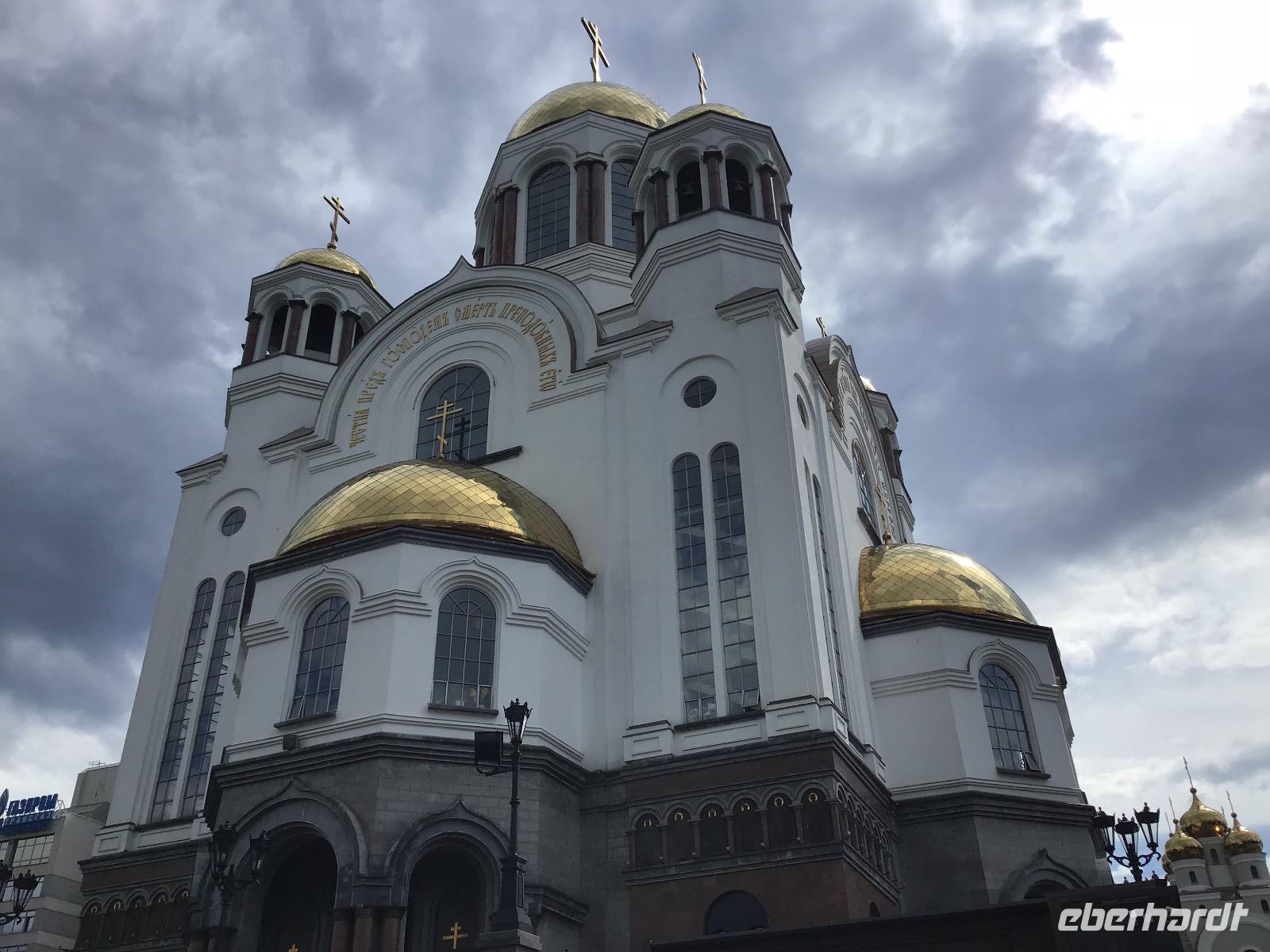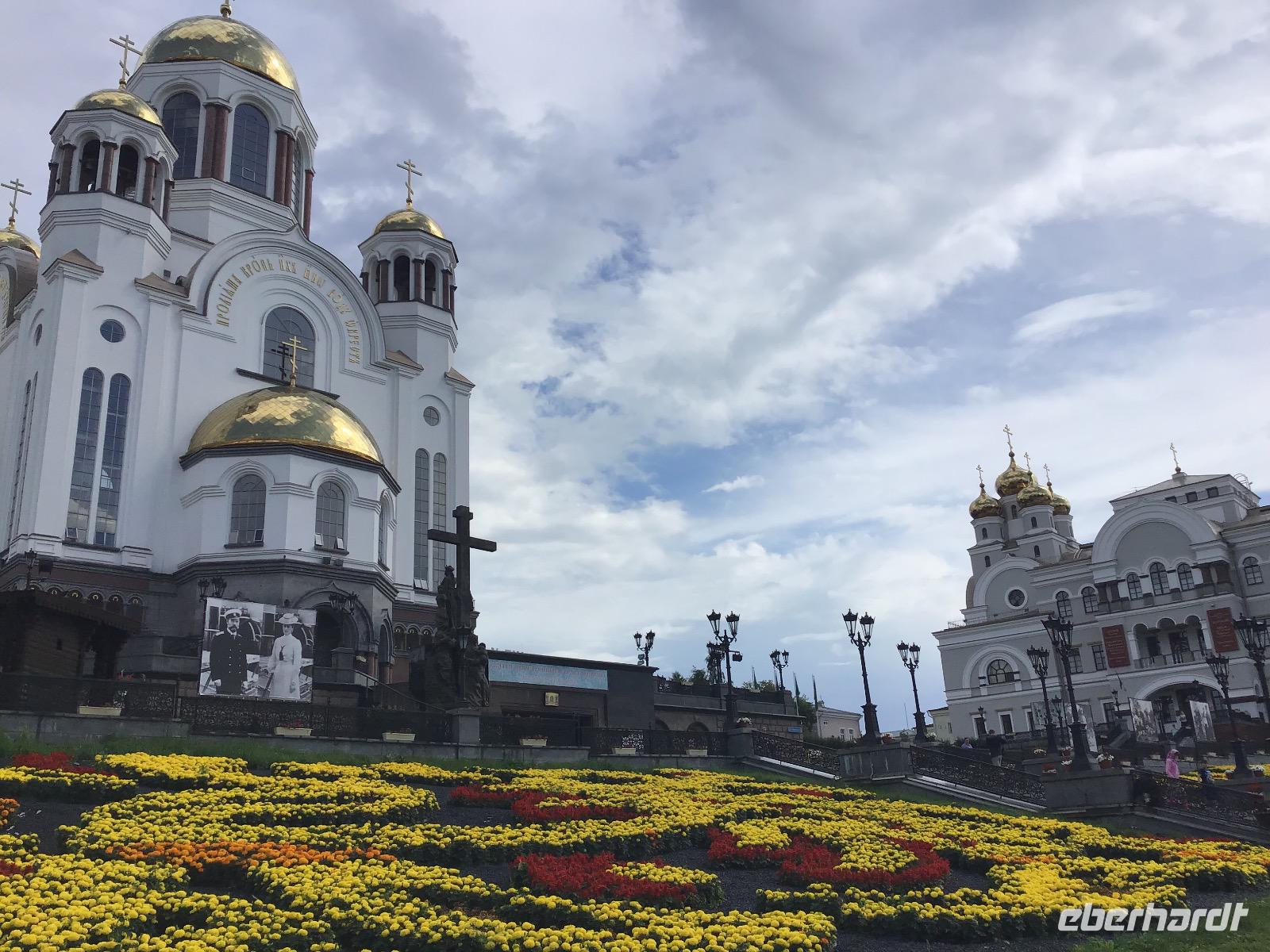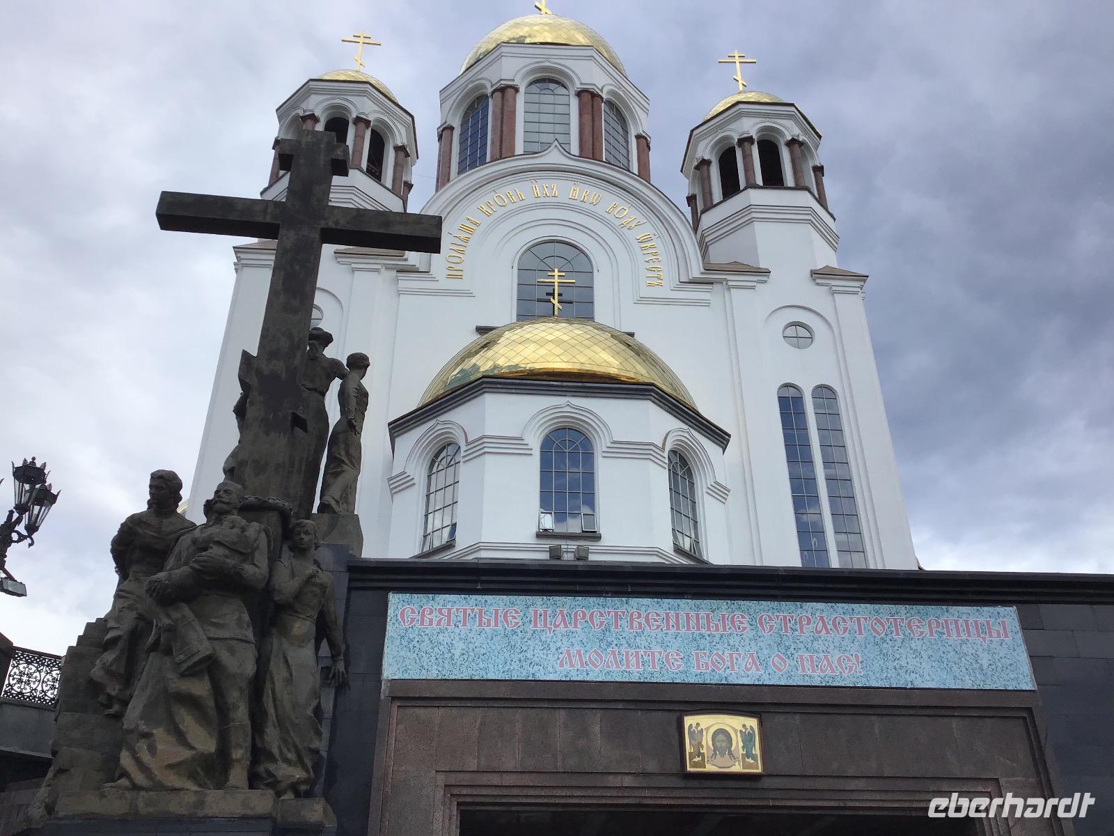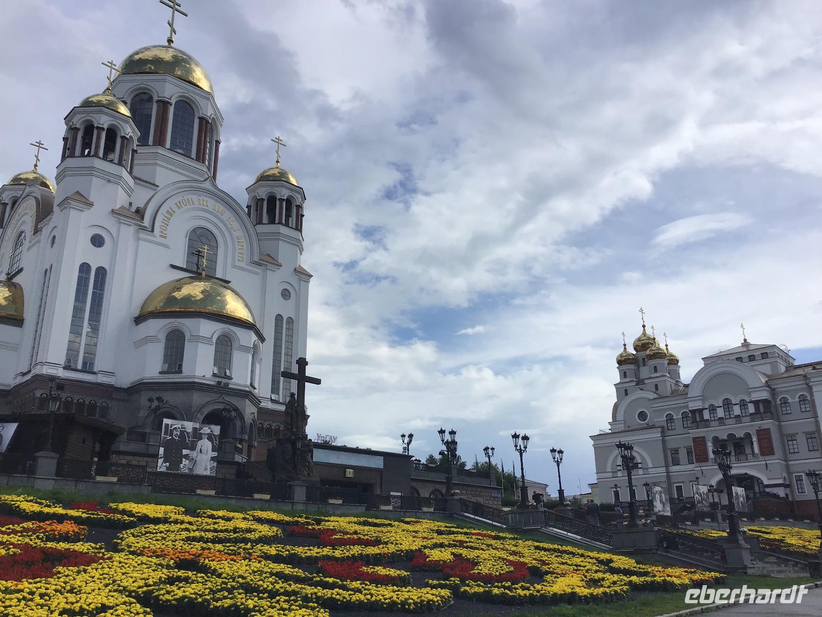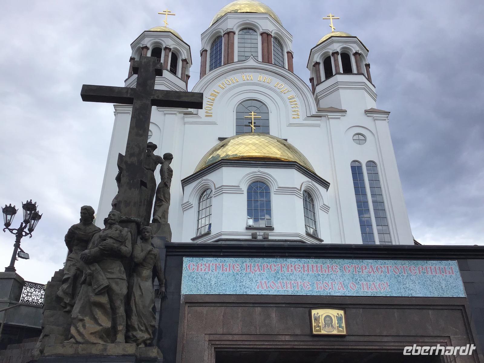 Wir können ausschlafen und ausführlich frühstücken. Unser erstes Ziel ist heute das Jelzin-Zentrum. Allein das Gebäude ist beeindruckend. Im Inneren erwartet uns eine Dokumentation der jüngsten Geschichte der Sowjetunion bzw. Russlands. Raum für Raum widmet sich dem Zerfall des großen Landes und den Auseinandersetzungen von Volk und Regierung. Jelzin wird sympathisch dargestellt, als ein Mann des Volkes mit besten Absichten. Immerhin war er der erste demokratisch gewählte Präsident Russlands. Wir sehen, wie er gewohnt hat und dass im Fernsehen Schwanensee lief, wenn es unangenehme Nachrichten gab. Auch sein Arbeitszimmer, von dem aus er sich verabschiedet hat, ist originalgetreu nachgebildet. Fast eineinhalb Stunden verbringen wir hier. Inzwischen hat es angefangen, kräftig zu regnen. Nachdem wir den historischen Park besucht haben, der über die Stadtgründung berichtet, führt uns unser Weg zur Blutkirche. Diese wurde an der Stelle errichtet, wo 1918 die Zarenfamilie heimtückisch ermordet wurde. Am Eingang empfängt uns ein ungewöhnlich freundlicher Geistlicher, der uns gut gelaunt zeigt, wie man sich bekreuzigt und sich vor der Zarenfamilie verbeugt. Auch, dass Männer die Mütze abnehmen sollen, kommuniziert er mit warmer Herzlichkeit. An den Wänden hängen Porträts der Zarenfamilie. Mit Zar Nikolaus II wurden seine Frau und seine fünf Kinder ermordet. Außerdem der Koch, der Kammerdiener und das Zimmermädchen. In der zweiten Etage ist das Leben der Zarenfamilie dargestellt. Nach dem Besuch der Blutkirche, deren Geschichte unter die Haut geht, fahren wir weiter in Richtung der Grenze zwischen Europa und Asien. Es gibt mehrere Stellen, die für Reisende errichtet wurden, die zum Fototermin einladen. Am zweiten Halt erwartet uns eine russische Gesangsgruppe, die extra für unsere Gäste von Eberhardt TRAVEL bestellt wurde. Überschäumend werden wir begrüßt, da spricht die echte russische Seele. Vladimir, der Chef unserer örtlichen Agentur, hat Sekt mitgebracht, mit dem wir auf dieses Ereignis anstoßen. Wir tanzen und singen, es herrscht eine ausgelassene Stimmung. Wir fahren weiter und gelangen in ein russisches Dorf. Irina klopft an der Haustür und wir werden eingelassen. Wir dürfen den Garten besichtigen und werden dann ins Haus gebeten. Rein zufällig hat die Hausfrau Tee gekocht und Blinis gebacken. Wir bedanken uns für die Gastfreundschaft. Unser Weg führt uns weiter zu einem Männerkloster. Hier wurden mehrere Holzkirchen errichtet, alle mit goldenen Zwiebeltürmchen. Das Kloster befindet sich in Ganina Jama, an der Stelle, wo die Zarenfamilie nach ihrer Ermordung in Gruben verscharrt wurde. Nachdem wir ins Hotel zurück gefahren sind, müssen wir all die Emotionen des Tages erst einmal verkraften. Ein ereignisreicher Tag liegt hinter uns.