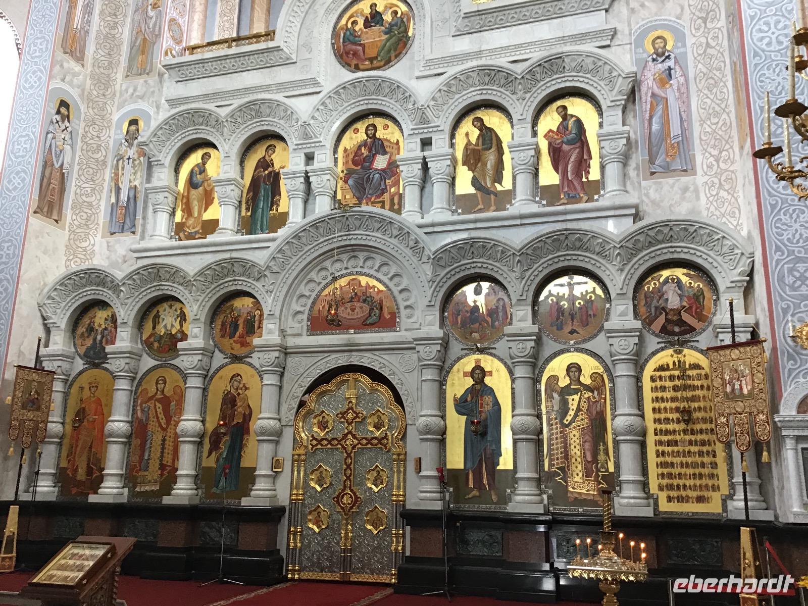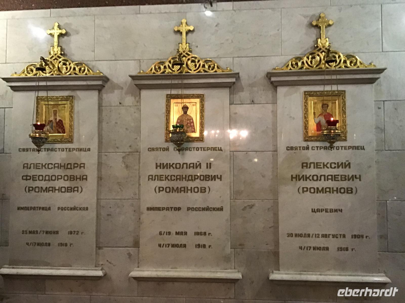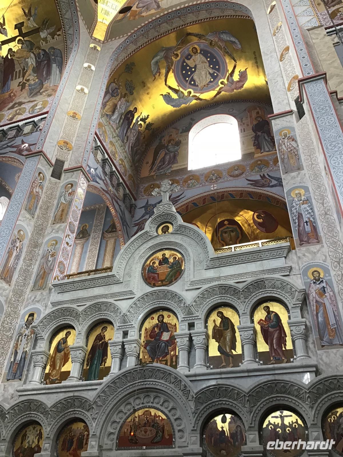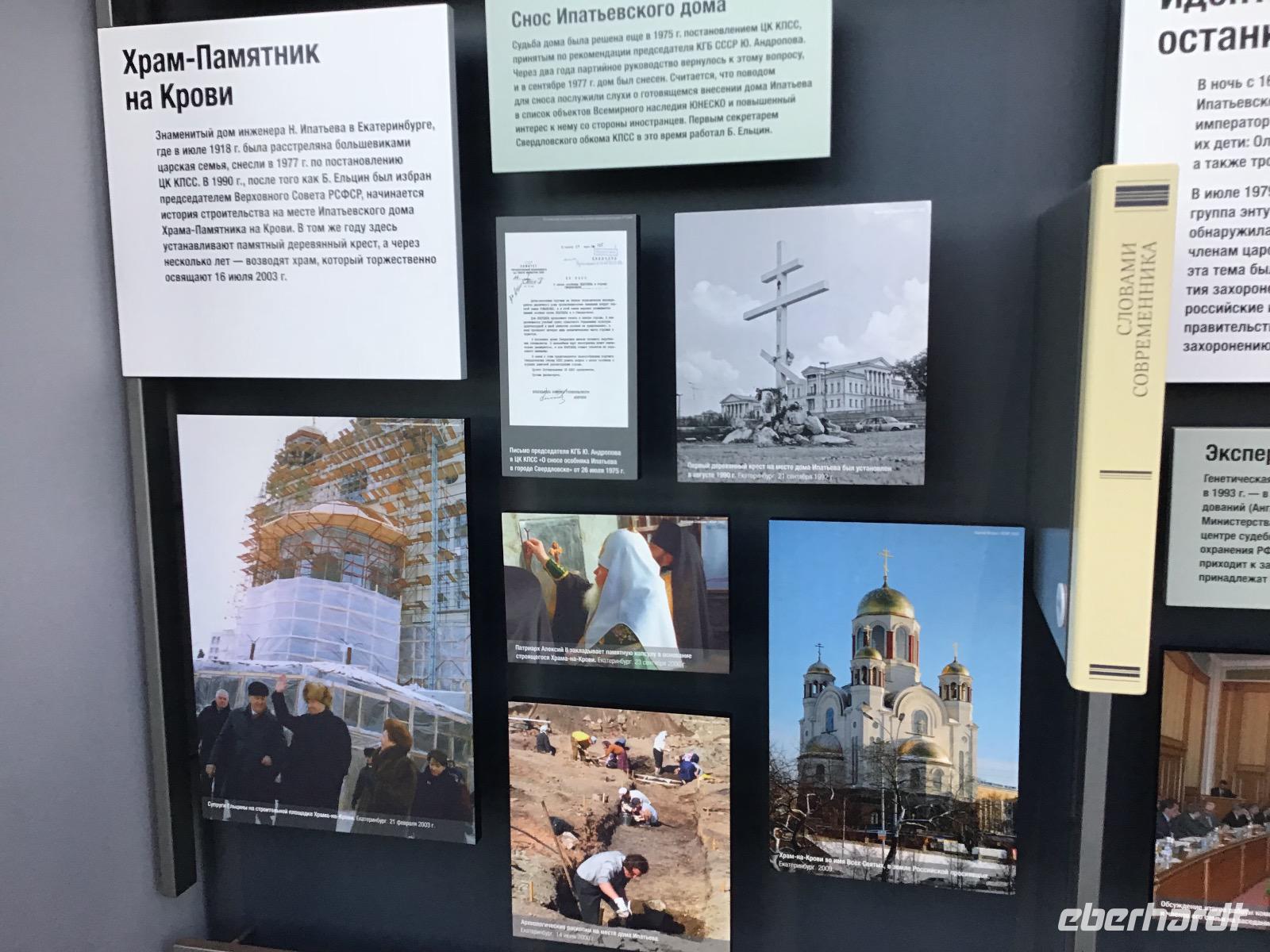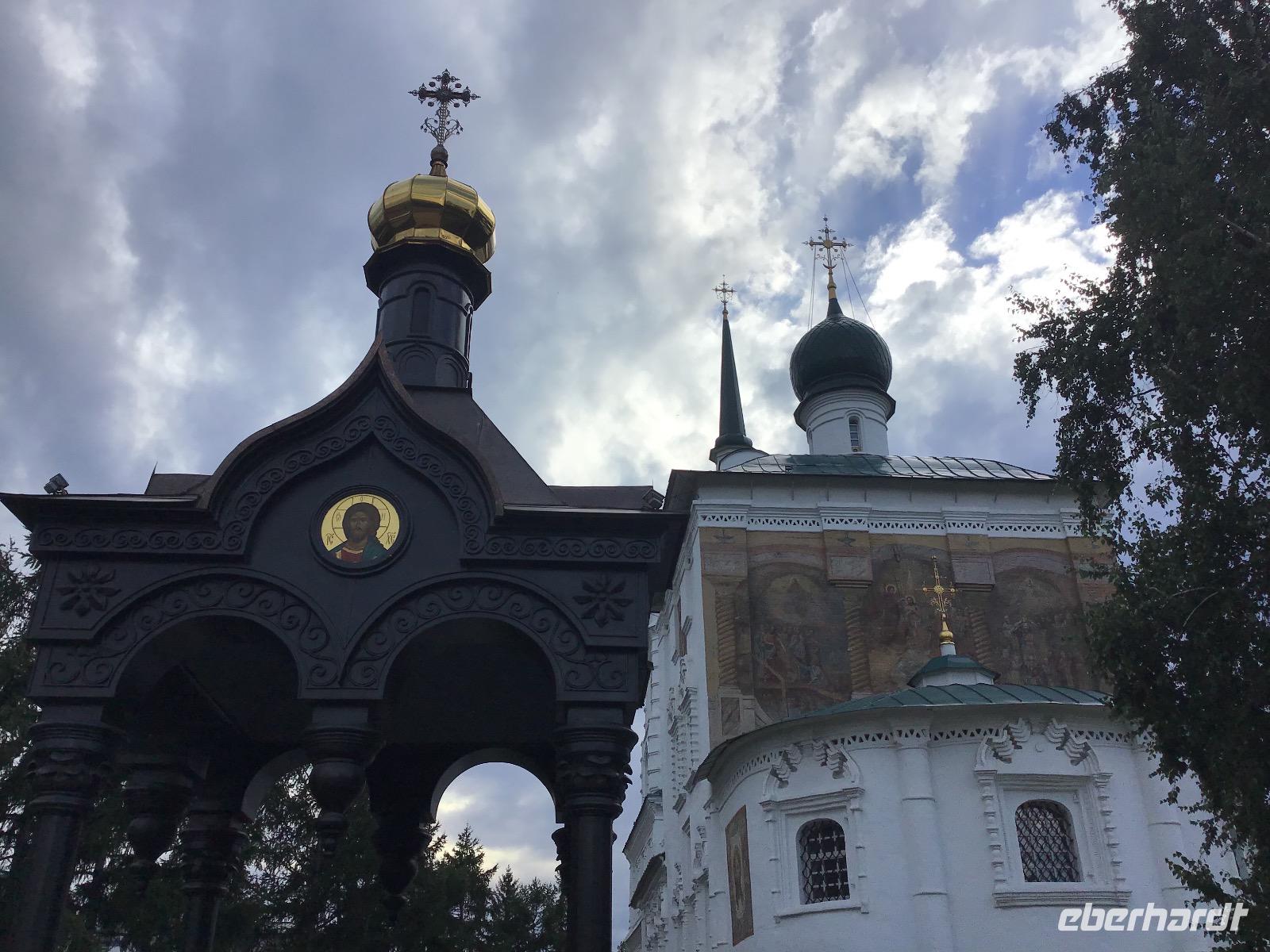 Wir können ausschlafen und ausführlich frühstücken. Unser erstes Ziel ist heute das Jelzin-Zentrum. Allein das Gebäude ist beeindruckend. Im Inneren erwartet uns eine Dokumentation der jüngsten Geschichte der Sowjetunion bzw. Russlands. Raum für Raum widmet sich dem Zerfall des großen Landes und den Auseinandersetzungen von Volk und Regierung. Jelzin wird sympathisch dargestellt, als ein Mann des Volkes mit besten Absichten. Immerhin war er der erste demokratisch gewählte Präsident Russlands. Wir sehen, wie er gewohnt hat und dass im Fernsehen Schwanensee lief, wenn es unangenehme Nachrichten gab. Auch sein Arbeitszimmer, von dem aus er sich verabschiedet hat, ist originalgetreu nachgebildet. Fast eineinhalb Stunden verbringen wir hier. Inzwischen hat es angefangen, kräftig zu regnen. Nachdem wir den historischen Park besucht haben, der über die Stadtgründung berichtet, führt uns unser Weg zur Blutkirche. Diese wurde an der Stelle errichtet, wo 1918 die Zarenfamilie heimtückisch ermordet wurde. Am Eingang empfängt uns ein ungewöhnlich freundlicher Geistlicher, der uns gut gelaunt zeigt, wie man sich bekreuzigt und sich vor der Zarenfamilie verbeugt. Auch, dass Männer die Mütze abnehmen sollen, kommuniziert er mit warmer Herzlichkeit. An den Wänden hängen Porträts der Zarenfamilie. Mit Zar Nikolaus II wurden seine Frau und seine fünf Kinder ermordet. Außerdem der Koch, der Kammerdiener und das Zimmermädchen. In der zweiten Etage ist das Leben der Zarenfamilie dargestellt. Nach dem Besuch der Blutkirche, deren Geschichte unter die Haut geht, fahren wir weiter in Richtung der Grenze zwischen Europa und Asien. Es gibt mehrere Stellen, die für Reisende errichtet wurden, die zum Fototermin einladen. Am zweiten Halt erwartet uns eine russische Gesangsgruppe, die extra für unsere Gäste von Eberhardt TRAVEL bestellt wurde. Überschäumend werden wir begrüßt, da spricht die echte russische Seele. Vladimir, der Chef unserer örtlichen Agentur, hat Sekt mitgebracht, mit dem wir auf dieses Ereignis anstoßen. Wir tanzen und singen, es herrscht eine ausgelassene Stimmung. Wir fahren weiter und gelangen in ein russisches Dorf. Irina klopft an der Haustür und wir werden eingelassen. Wir dürfen den Garten besichtigen und werden dann ins Haus gebeten. Rein zufällig hat die Hausfrau Tee gekocht und Blinis gebacken. Wir bedanken uns für die Gastfreundschaft. Unser Weg führt uns weiter zu einem Männerkloster. Hier wurden mehrere Holzkirchen errichtet, alle mit goldenen Zwiebeltürmchen. Das Kloster befindet sich in Ganina Jama, an der Stelle, wo die Zarenfamilie nach ihrer Ermordung in Gruben verscharrt wurde. Nachdem wir ins Hotel zurück gefahren sind, müssen wir all die Emotionen des Tages erst einmal verkraften. Ein ereignisreicher Tag liegt hinter uns.