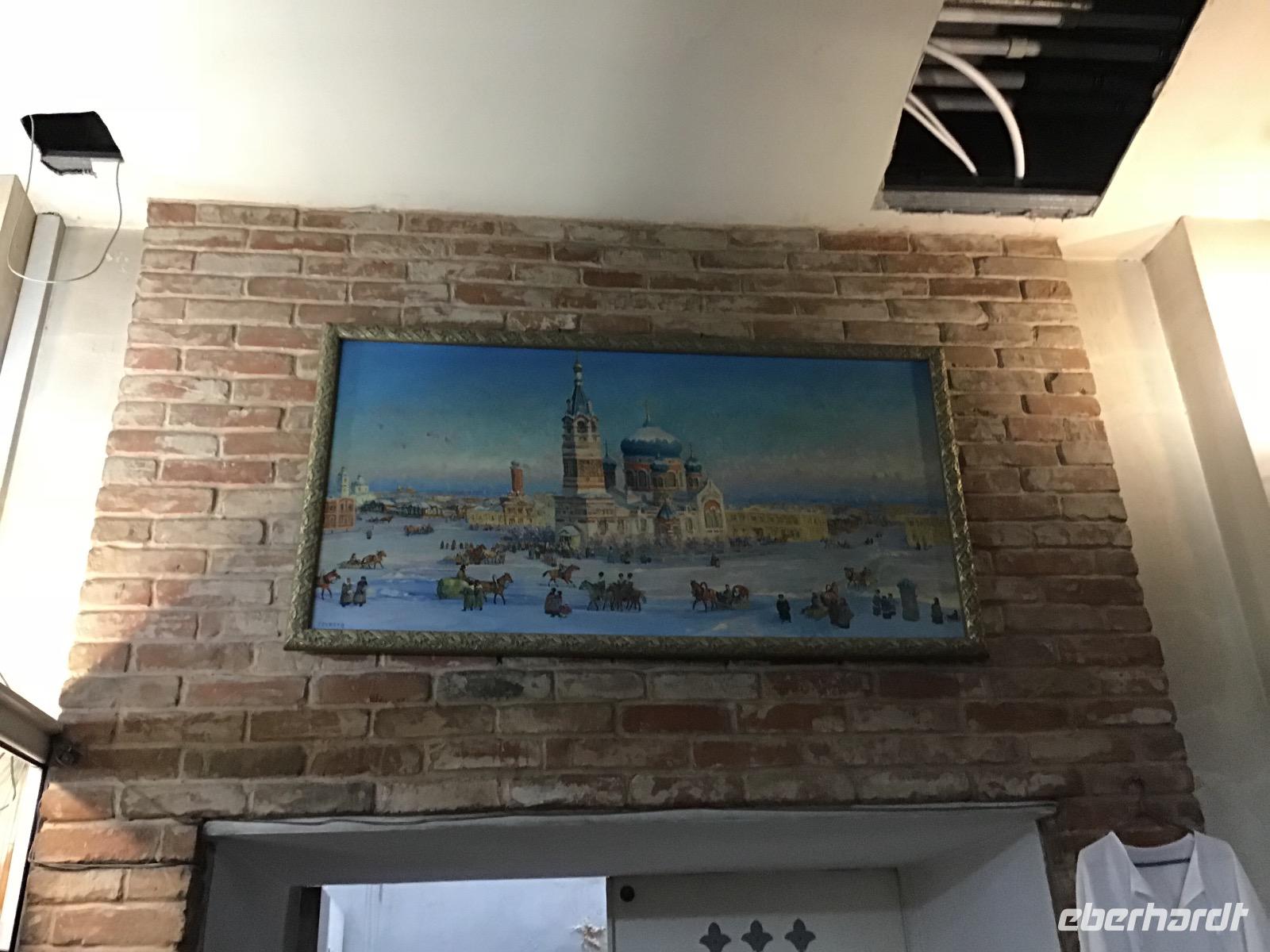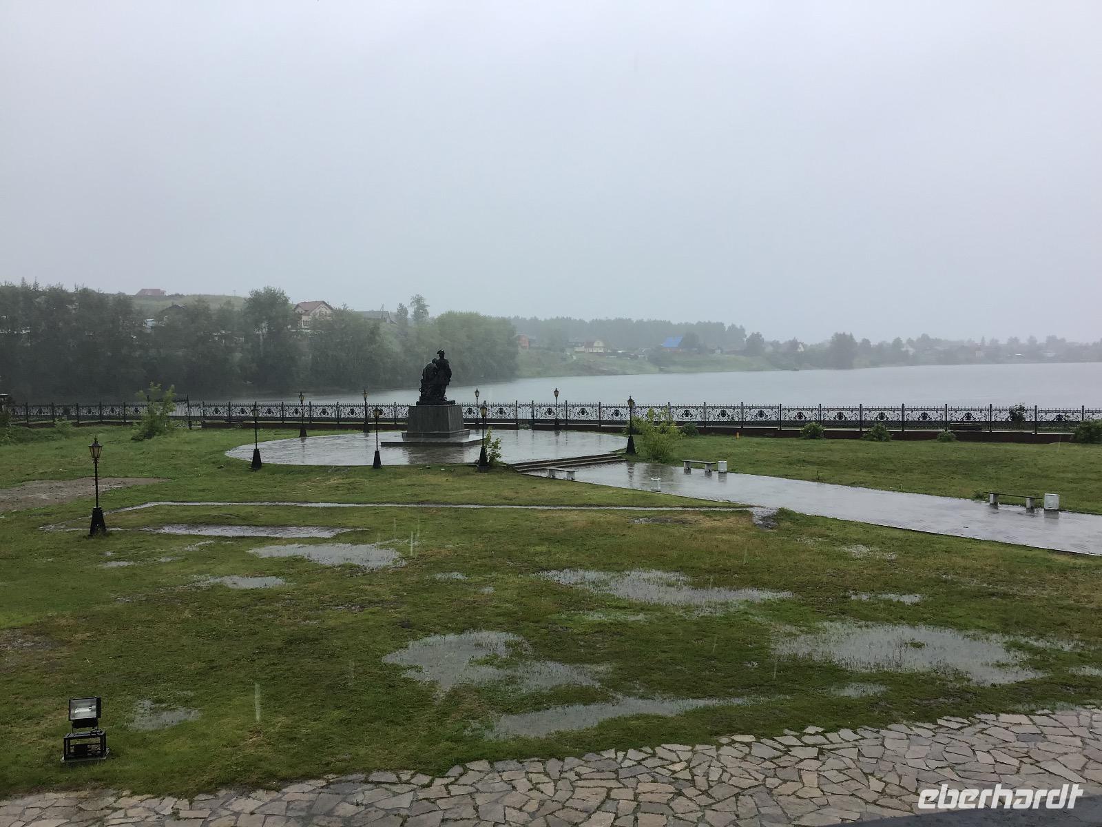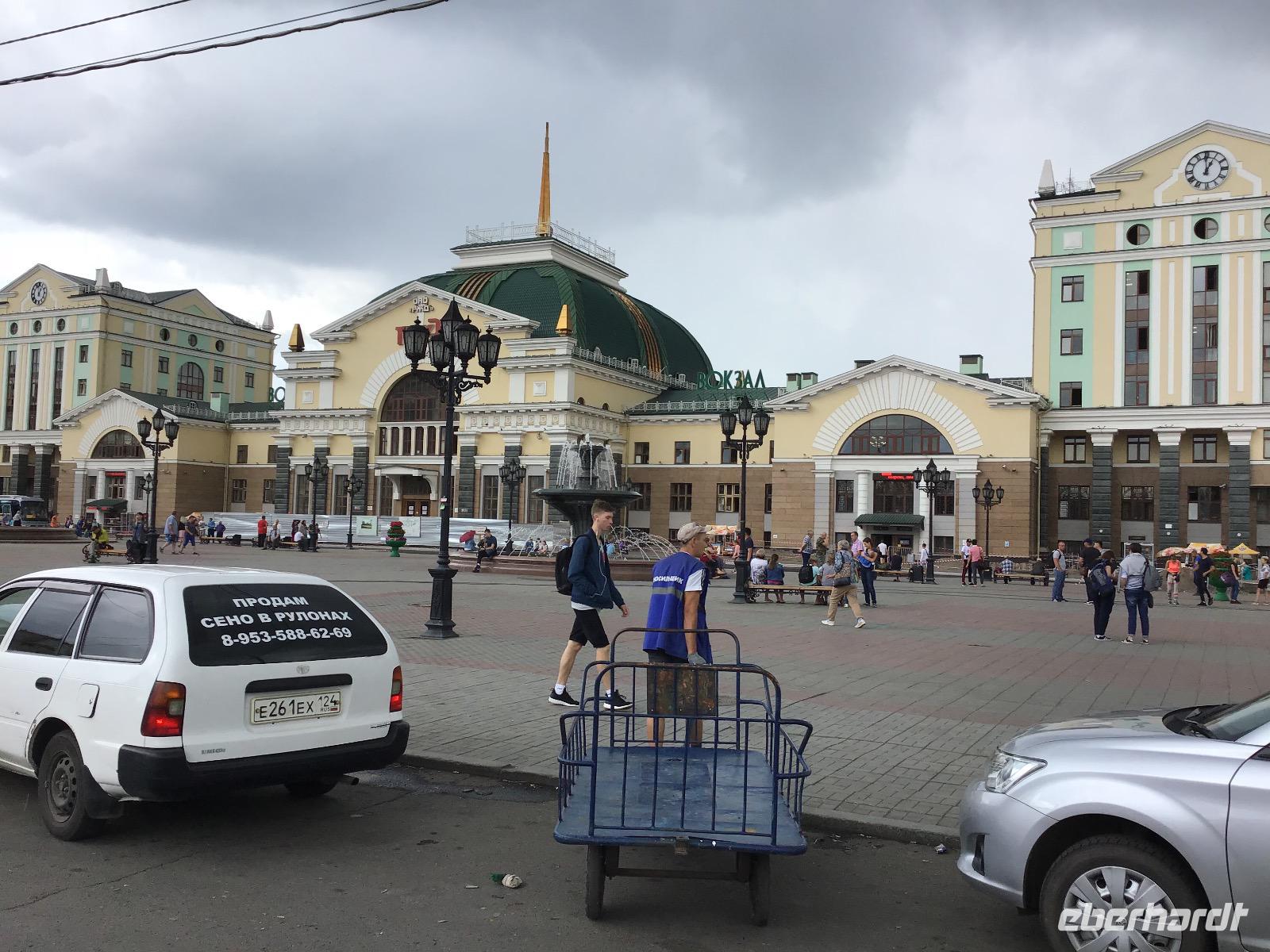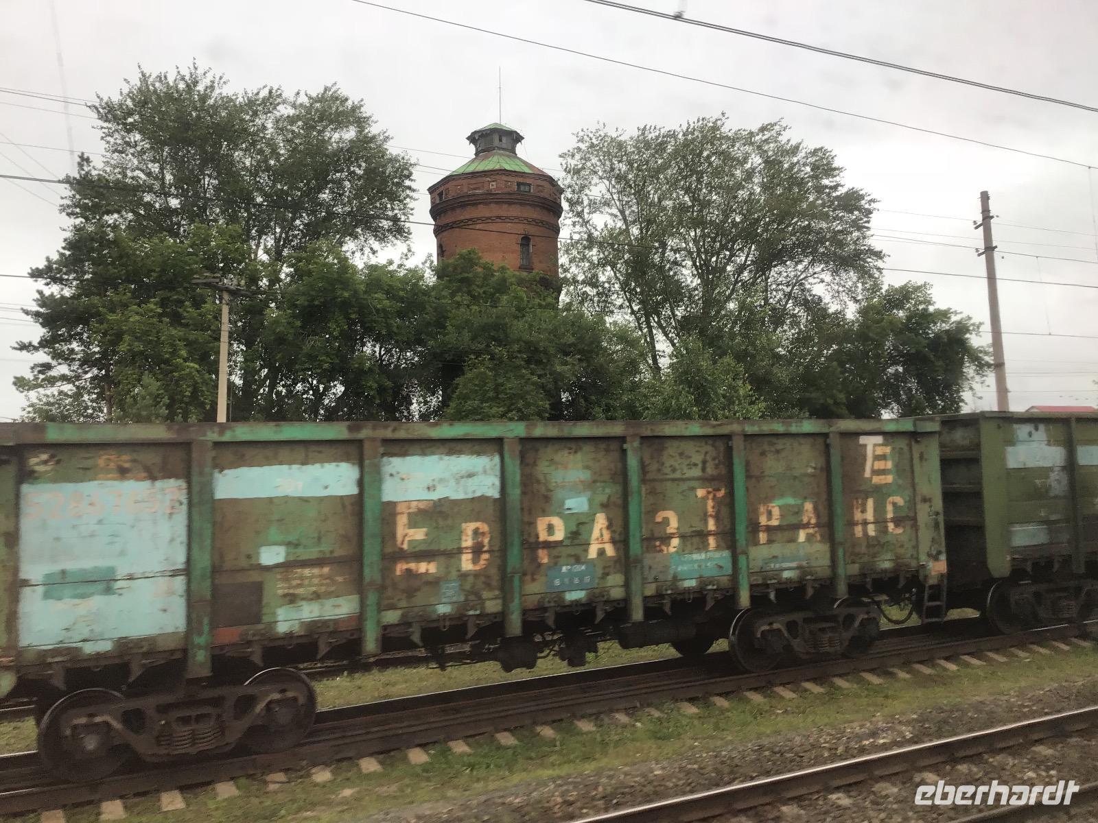 Noch einmal können wir ausschlafen. Es regnet wie verrückt. Wir fahren ca. einhundert Kilometer bis nach Nevyansk. Wir besuchen den Demidov-Turm, um den sich viele Legenden rangen. Beispielsweise wird vermutet, dass Demidov hier heimlich Münzen geprägt hat. Jedoch konnte das niemals bewiesen werden. Fakt ist, dass der Turm schief ist und eine Abweichung von 2,20 Meter hat. Spätestens in der Turmspitze, die wir natürlich besteigen, ist das deutlich zu bemerken. Als wir nach einer Stunde hinauf und hinunter Kletterns den Turm verlassen, regnet es immer noch in Strömen. Die schönen Holzhäuser der Altgläubigen können wir nur von der geöffneten Autotür fotografieren, weil es ohne Unterlass gießt. In einer Töpferei zeigt uns Sergej (der behauptet, wir wären die ersten Touristen, die er sieht) wie aus einem Klumpen Ton eine schöne Vase entsteht. Auch zwei Damen aus unserer Gruppe stellen ihr Geschick unter Beweis. Am Abend kehren wir zurück nach Jekaterinburg. Im Supermarkt kaufen wir Essen für den nächsten Tag ein. Im Restaurant Hans lassen wir den Abend ausklingen und nehmen Abschied von Jekaterinburg.Tag 7: Freitag, 10.08.2018 Jekaterinburg - OmskUm fünf fahren wir zum Bahnhof, unsere Lunchboxen im Gepäck. Vadim begleitet uns. Am Bahnhof wird uns das Gepäck abgenommen, auf zwei Wagen verladen, die zwei starke Männer dann zum Bahnsteig fahren. Vadim zeigt uns die Malereien, mit denen der Bahnhof verschönert wurde. Pünktlich um sechs verlässt der Zug Jekaterinburg.