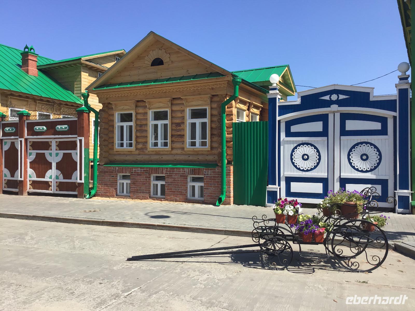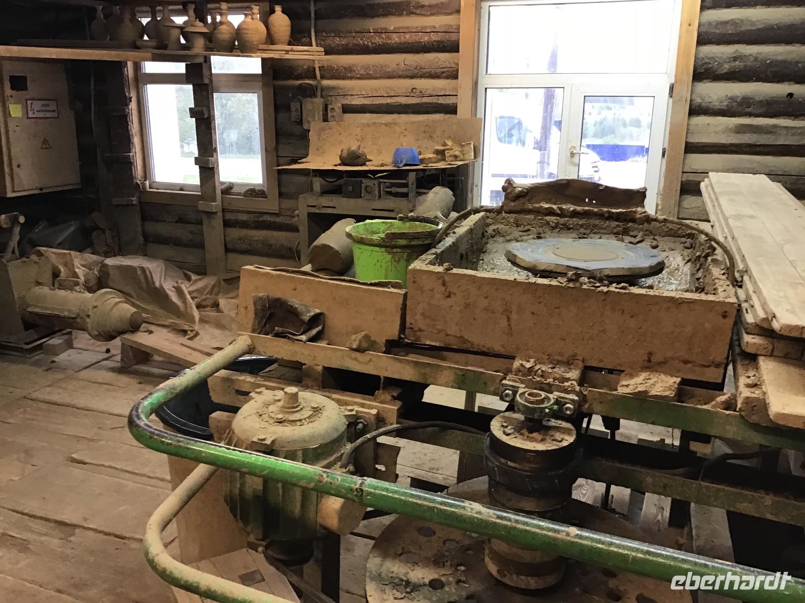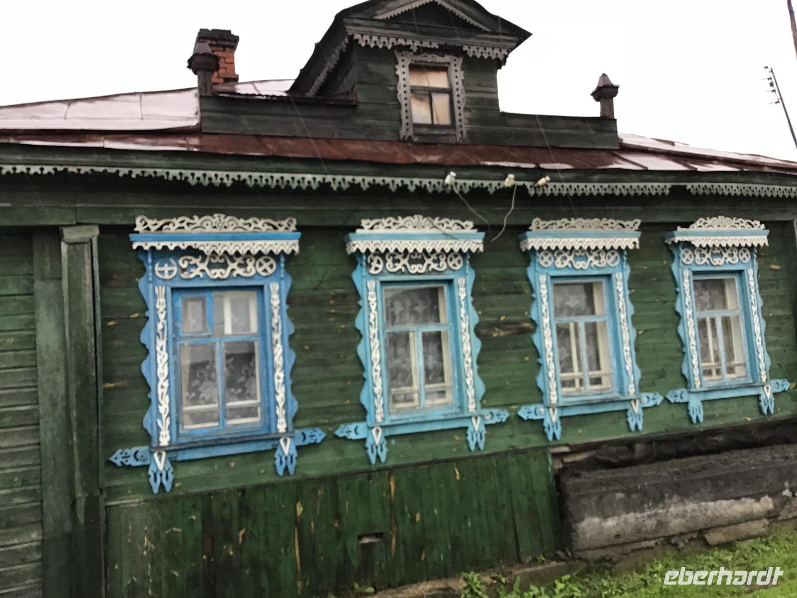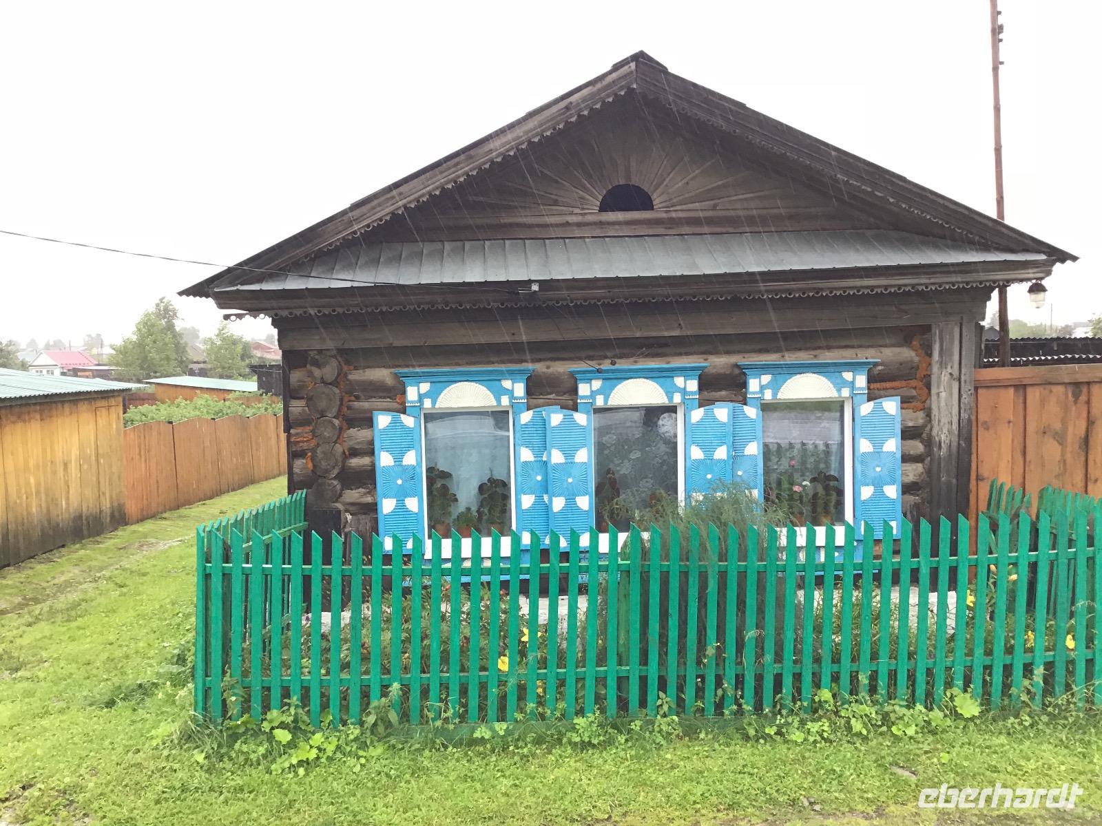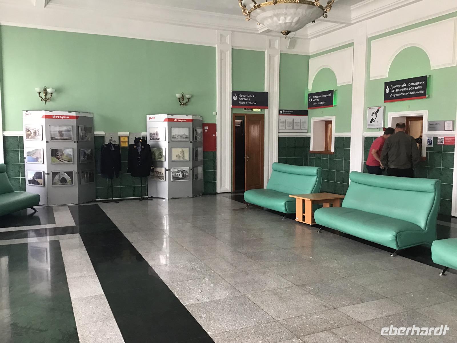 Noch einmal können wir ausschlafen. Es regnet wie verrückt. Wir fahren ca. einhundert Kilometer bis nach Nevyansk. Wir besuchen den Demidov-Turm, um den sich viele Legenden rangen. Beispielsweise wird vermutet, dass Demidov hier heimlich Münzen geprägt hat. Jedoch konnte das niemals bewiesen werden. Fakt ist, dass der Turm schief ist und eine Abweichung von 2,20 Meter hat. Spätestens in der Turmspitze, die wir natürlich besteigen, ist das deutlich zu bemerken. Als wir nach einer Stunde hinauf und hinunter Kletterns den Turm verlassen, regnet es immer noch in Strömen. Die schönen Holzhäuser der Altgläubigen können wir nur von der geöffneten Autotür fotografieren, weil es ohne Unterlass gießt. In einer Töpferei zeigt uns Sergej (der behauptet, wir wären die ersten Touristen, die er sieht) wie aus einem Klumpen Ton eine schöne Vase entsteht. Auch zwei Damen aus unserer Gruppe stellen ihr Geschick unter Beweis. Am Abend kehren wir zurück nach Jekaterinburg. Im Supermarkt kaufen wir Essen für den nächsten Tag ein. Im Restaurant Hans lassen wir den Abend ausklingen und nehmen Abschied von Jekaterinburg.Tag 7: Freitag, 10.08.2018 Jekaterinburg - OmskUm fünf fahren wir zum Bahnhof, unsere Lunchboxen im Gepäck. Vadim begleitet uns. Am Bahnhof wird uns das Gepäck abgenommen, auf zwei Wagen verladen, die zwei starke Männer dann zum Bahnsteig fahren. Vadim zeigt uns die Malereien, mit denen der Bahnhof verschönert wurde. Pünktlich um sechs verlässt der Zug Jekaterinburg.