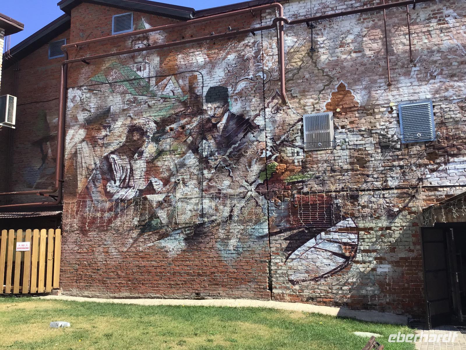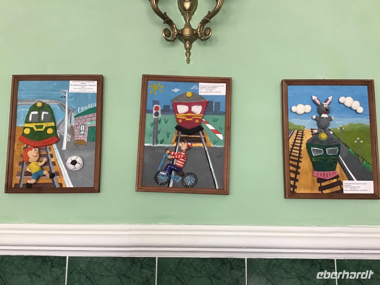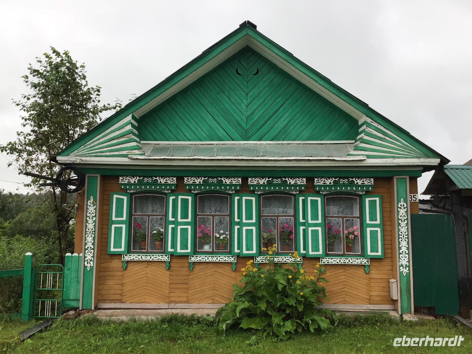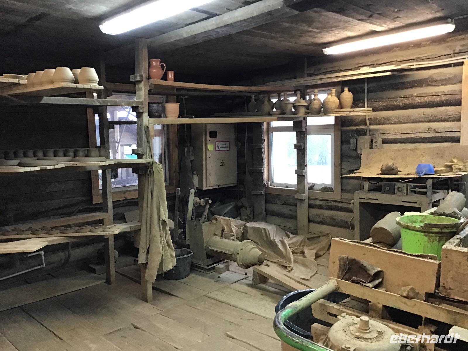 Noch einmal können wir ausschlafen. Es regnet wie verrückt. Wir fahren ca. einhundert Kilometer bis nach Nevyansk. Wir besuchen den Demidov-Turm, um den sich viele Legenden rangen. Beispielsweise wird vermutet, dass Demidov hier heimlich Münzen geprägt hat. Jedoch konnte das niemals bewiesen werden. Fakt ist, dass der Turm schief ist und eine Abweichung von 2,20 Meter hat. Spätestens in der Turmspitze, die wir natürlich besteigen, ist das deutlich zu bemerken. Als wir nach einer Stunde hinauf und hinunter Kletterns den Turm verlassen, regnet es immer noch in Strömen. Die schönen Holzhäuser der Altgläubigen können wir nur von der geöffneten Autotür fotografieren, weil es ohne Unterlass gießt. In einer Töpferei zeigt uns Sergej (der behauptet, wir wären die ersten Touristen, die er sieht) wie aus einem Klumpen Ton eine schöne Vase entsteht. Auch zwei Damen aus unserer Gruppe stellen ihr Geschick unter Beweis. Am Abend kehren wir zurück nach Jekaterinburg. Im Supermarkt kaufen wir Essen für den nächsten Tag ein. Im Restaurant Hans lassen wir den Abend ausklingen und nehmen Abschied von Jekaterinburg.Tag 7: Freitag, 10.08.2018 Jekaterinburg - OmskUm fünf fahren wir zum Bahnhof, unsere Lunchboxen im Gepäck. Vadim begleitet uns. Am Bahnhof wird uns das Gepäck abgenommen, auf zwei Wagen verladen, die zwei starke Männer dann zum Bahnsteig fahren. Vadim zeigt uns die Malereien, mit denen der Bahnhof verschönert wurde. Pünktlich um sechs verlässt der Zug Jekaterinburg.