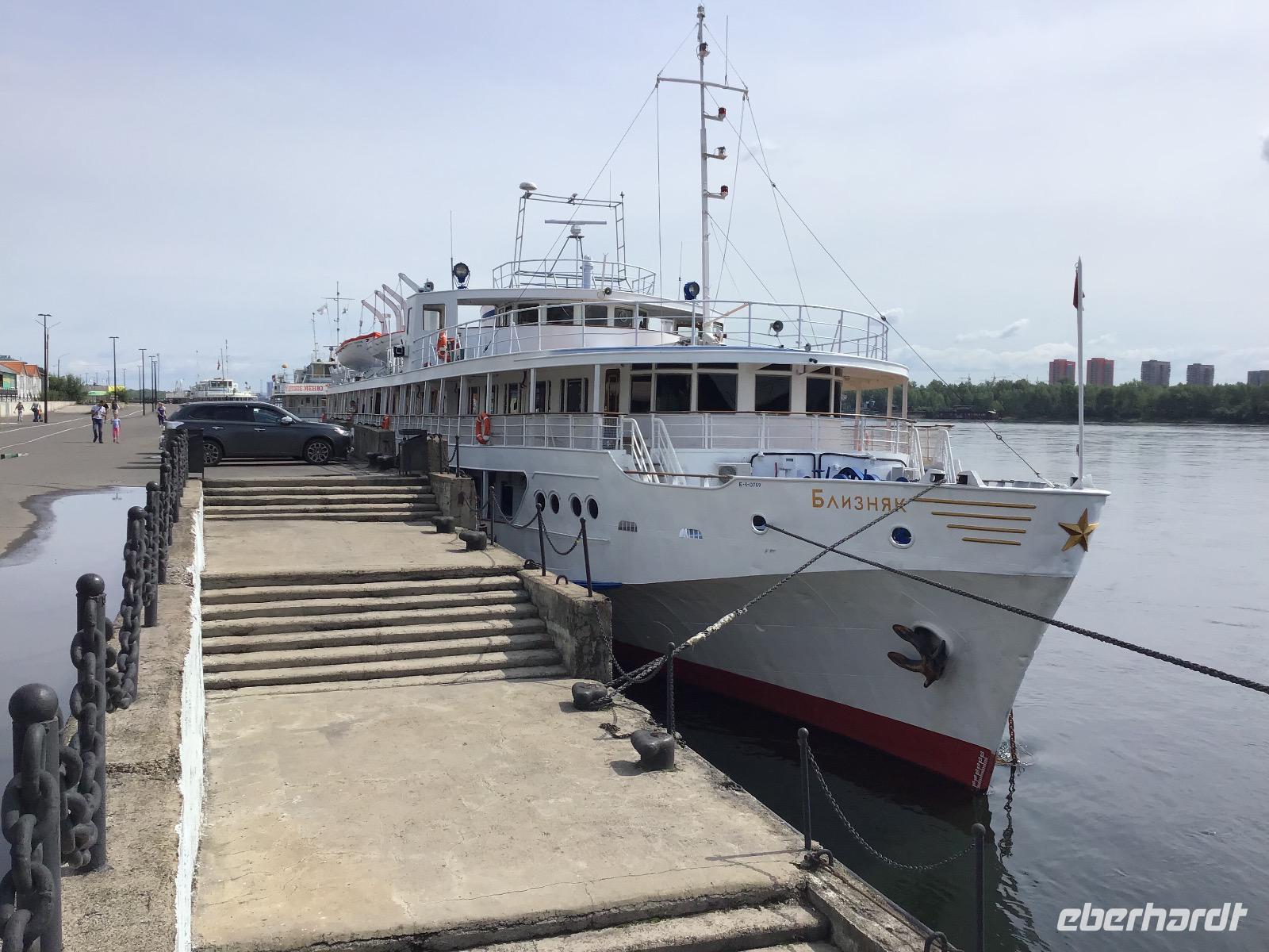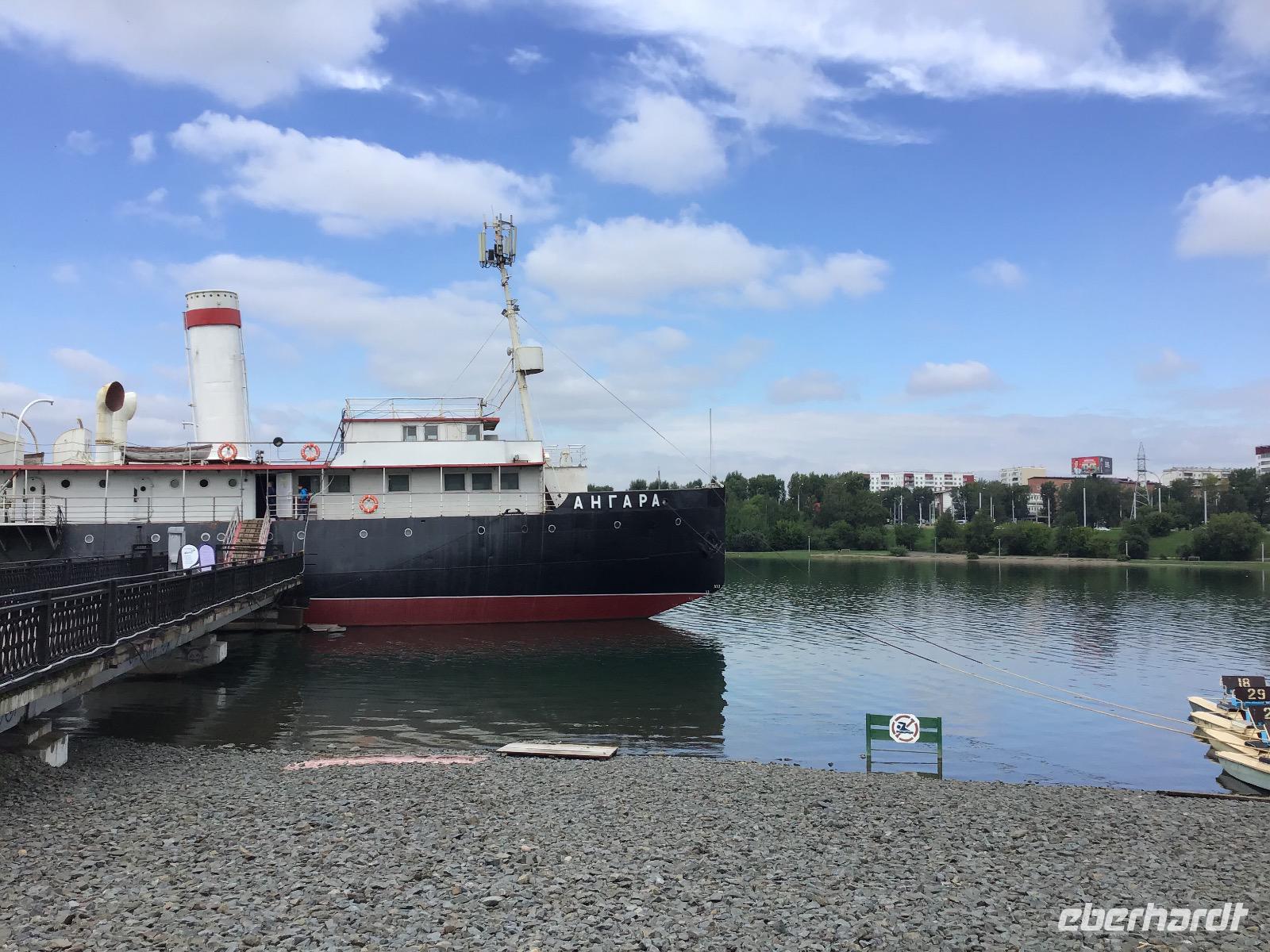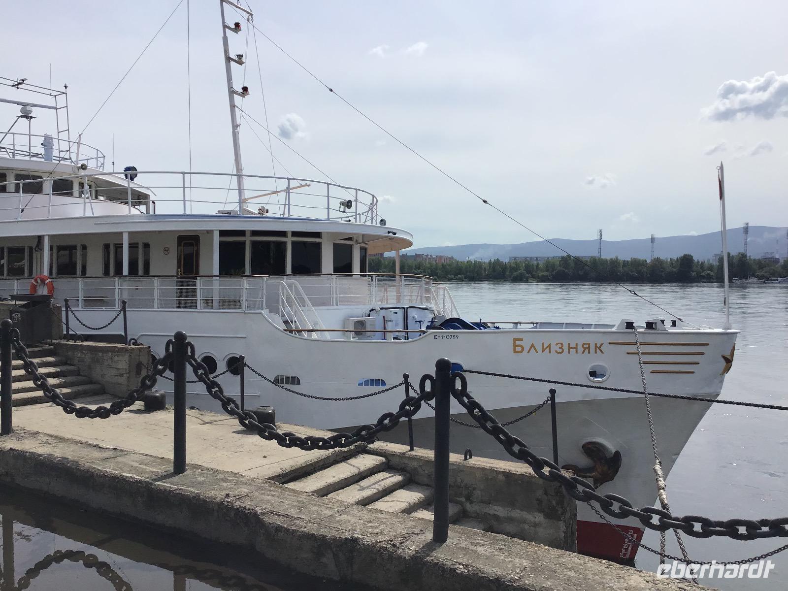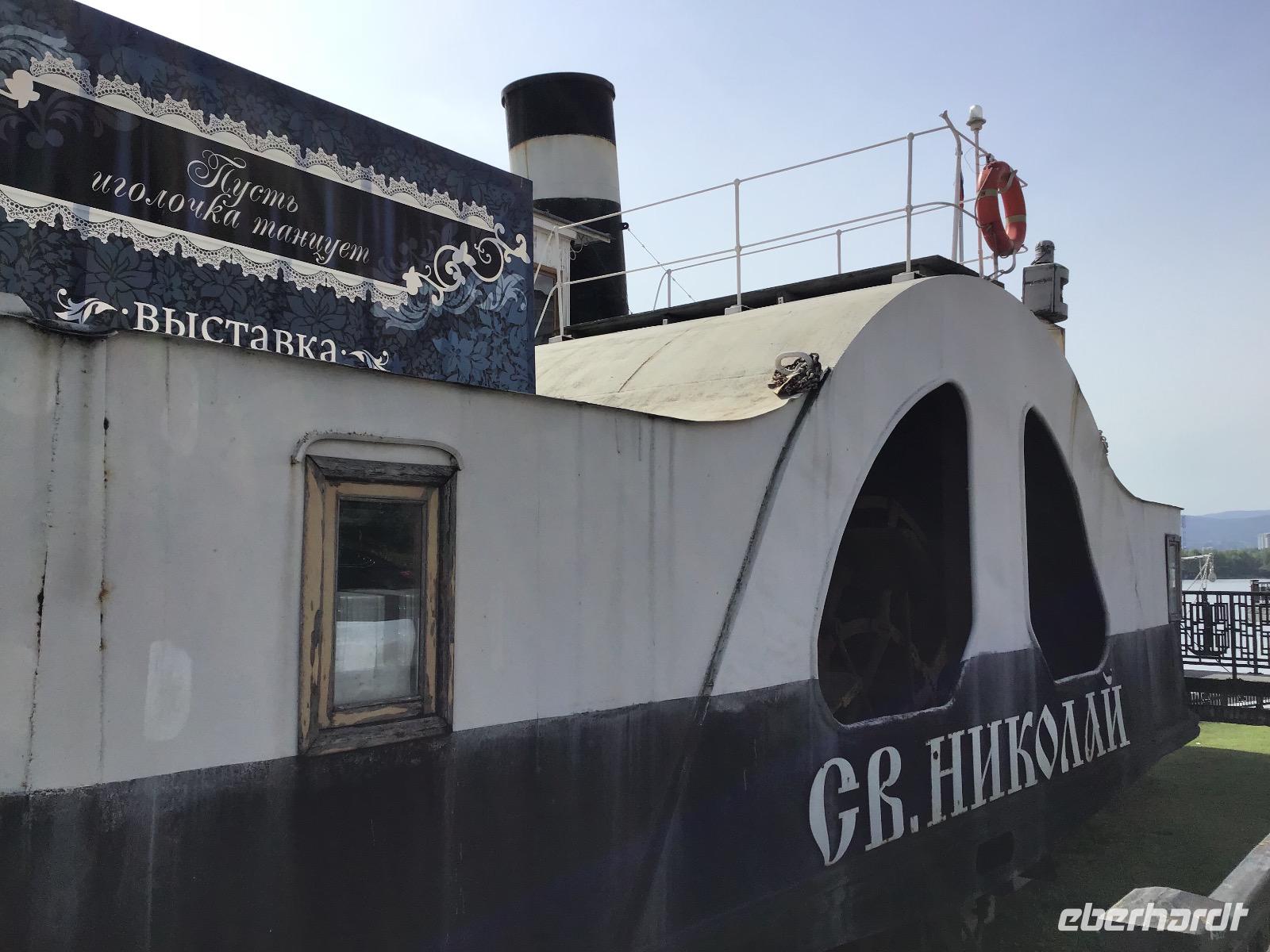Am Vormittag fahren wir mit Tatjana auf einen Hügel, von dem wir einen schönen Blick auf die Stadt haben. Unterwegs sind viele Baustellen zu sehen, die Stadt bereitet sich auf ein Jubiläum vor. Am Dampfschiff St. Nikolai, mit dem Lenin in die Verbannung gefahren wurde, spazieren wir vorbei und genießen den Aufenthalt am Jenissej.