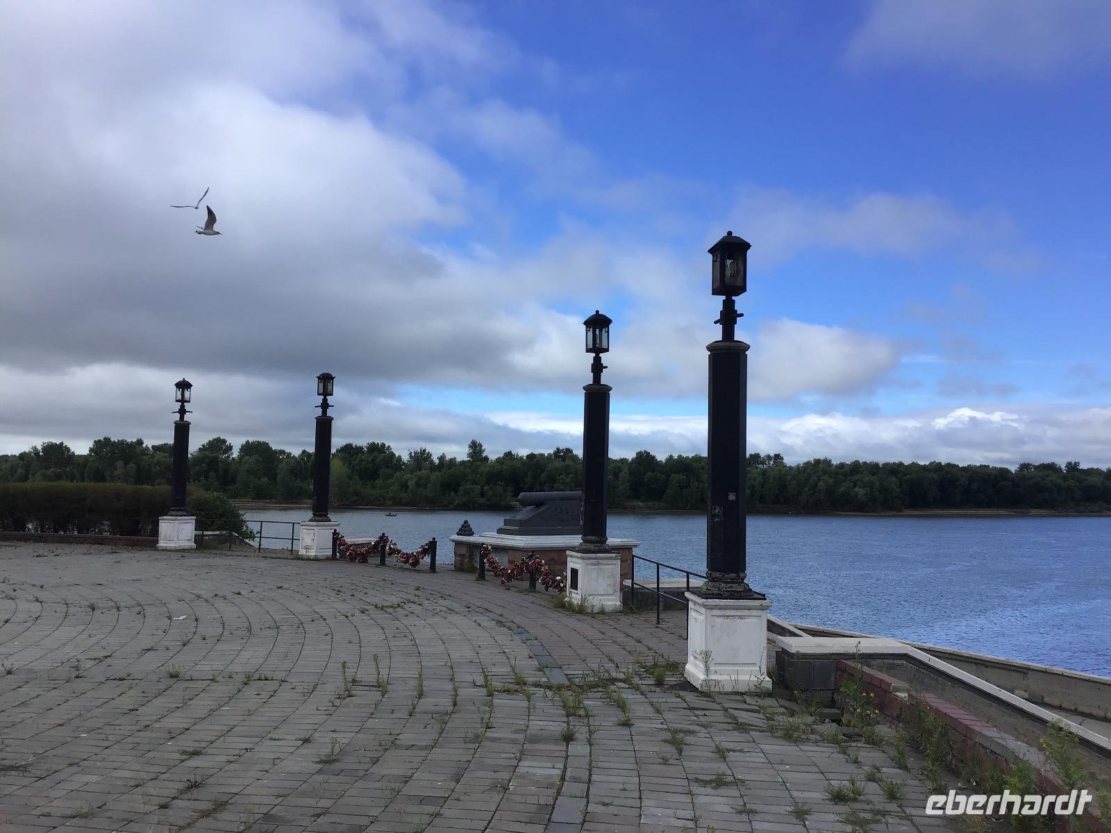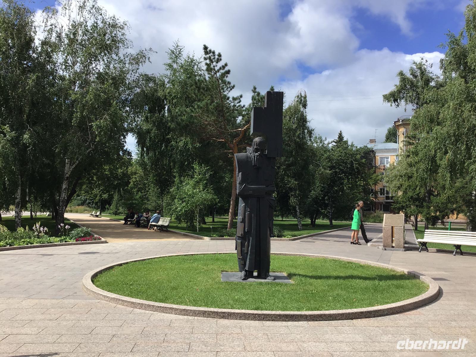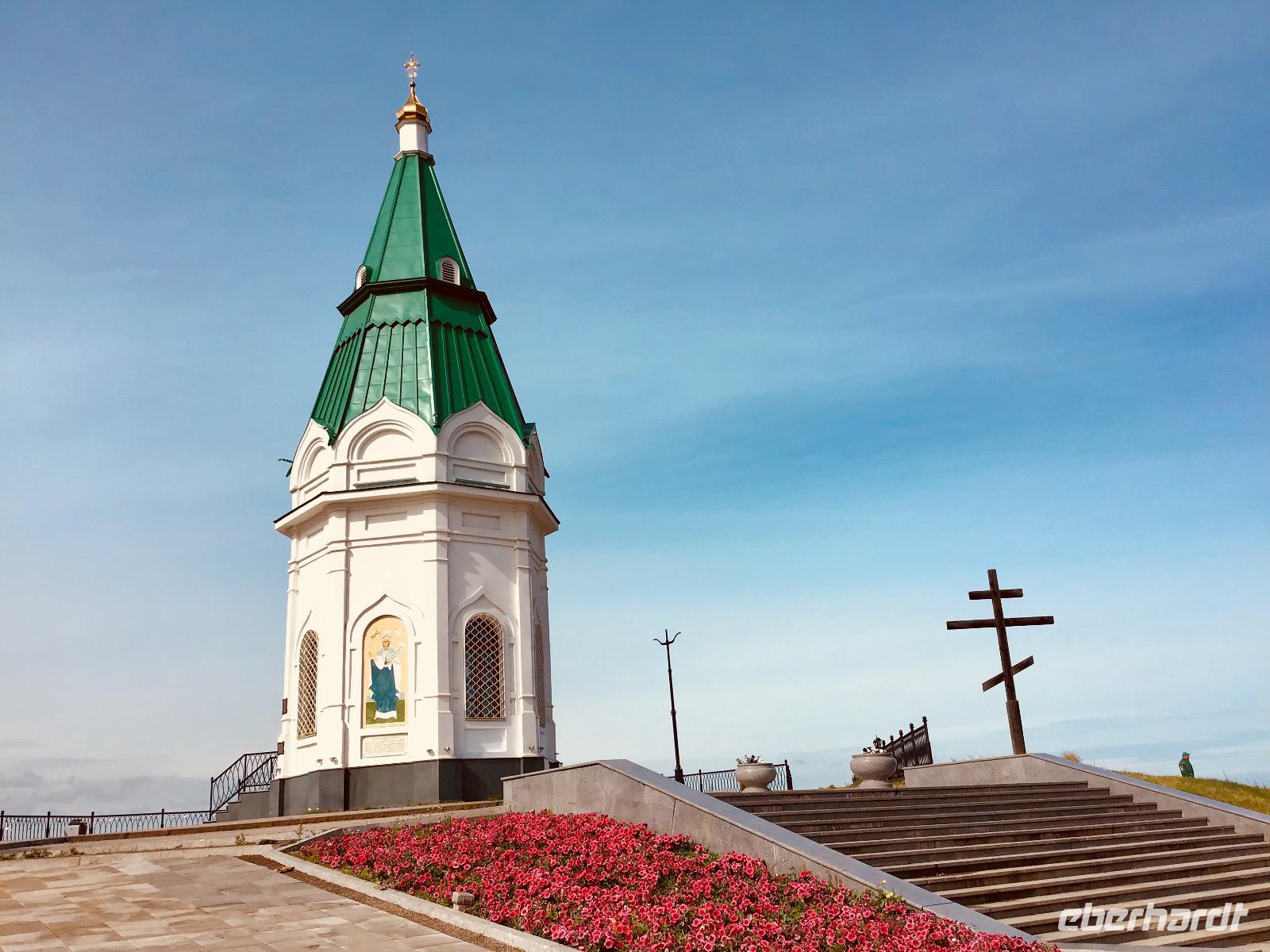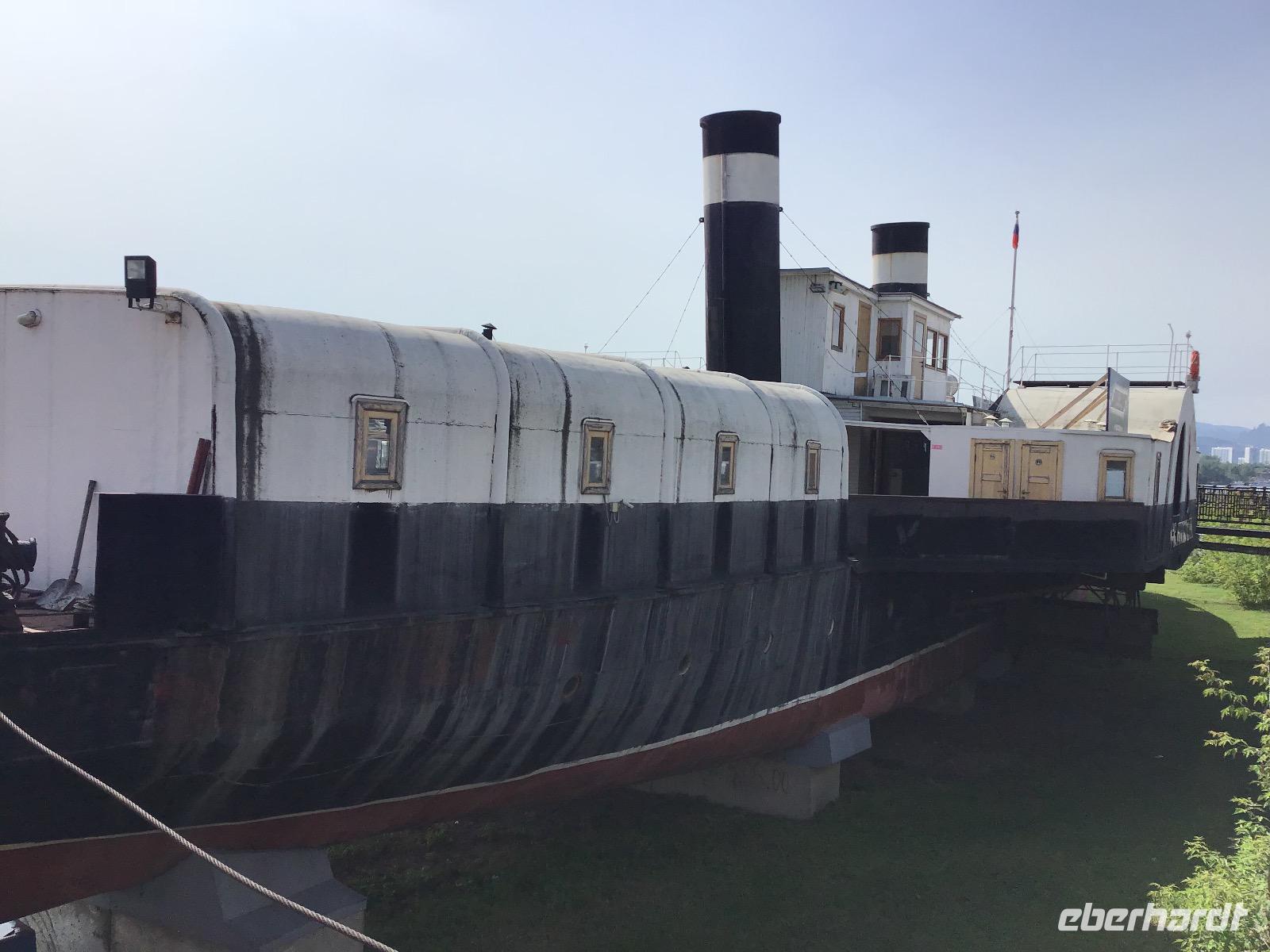 Am Vormittag fahren wir mit Tatjana auf einen Hügel, von dem wir einen schönen Blick auf die Stadt haben. Unterwegs sind viele Baustellen zu sehen, die Stadt bereitet sich auf ein Jubiläum vor. Am Dampfschiff St. Nikolai, mit dem Lenin in die Verbannung gefahren wurde, spazieren wir vorbei und genießen den Aufenthalt am Jenissej.