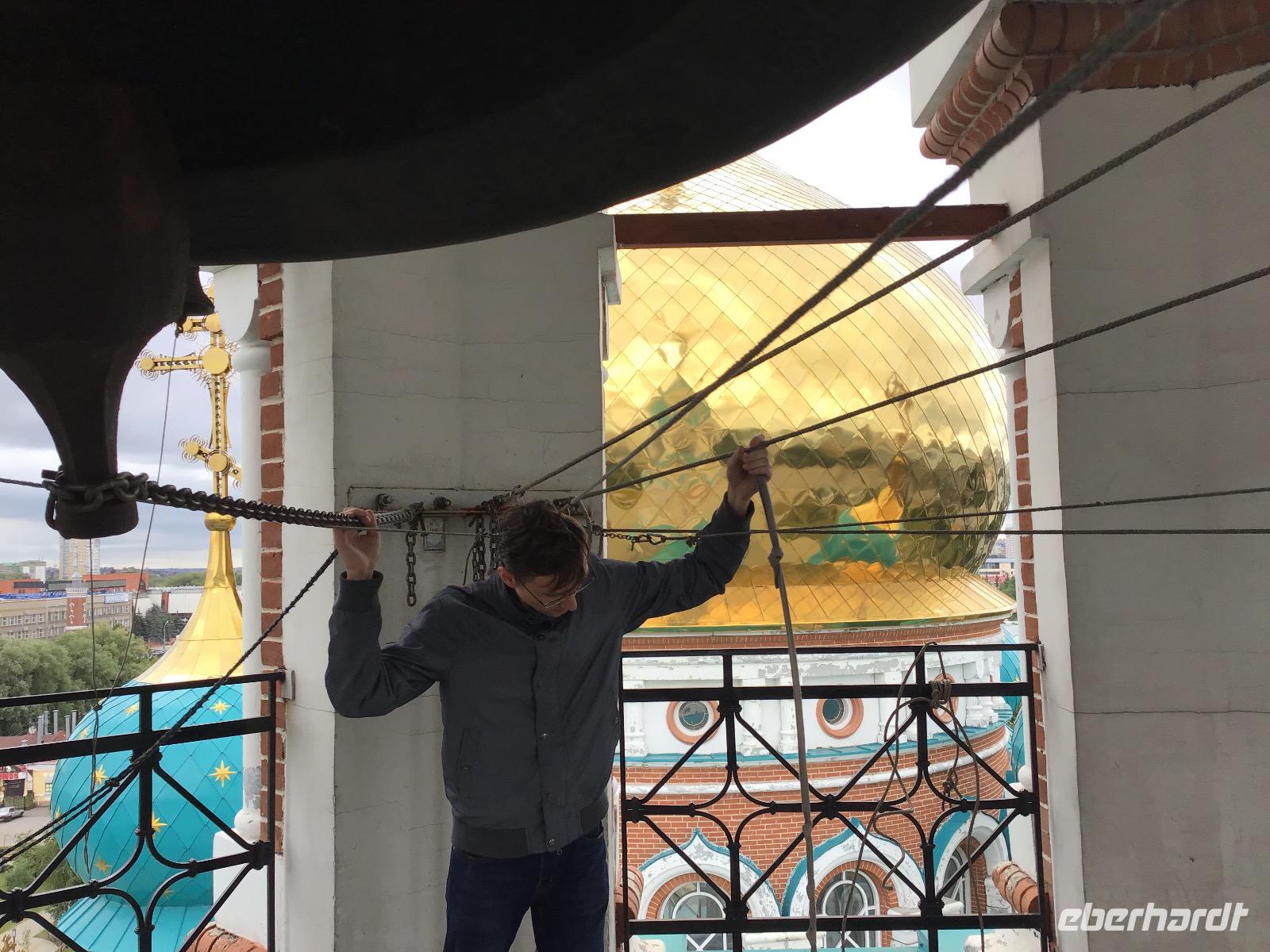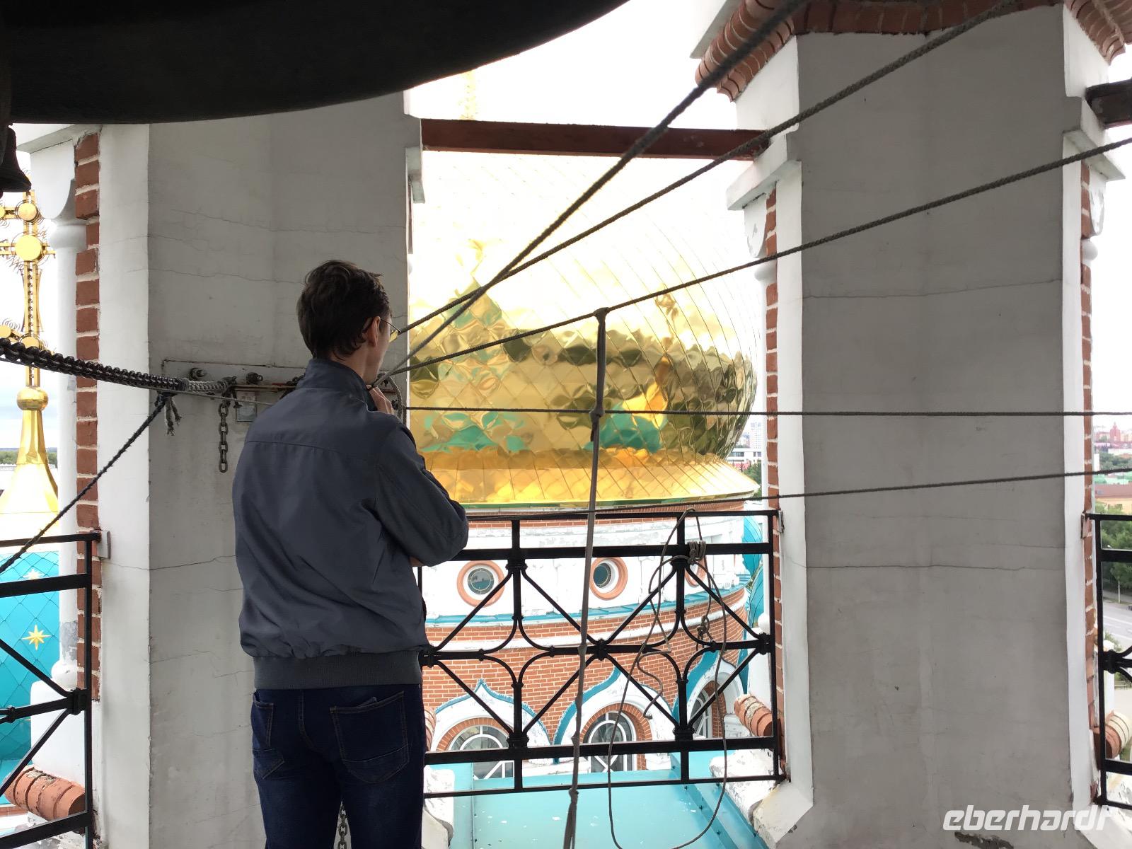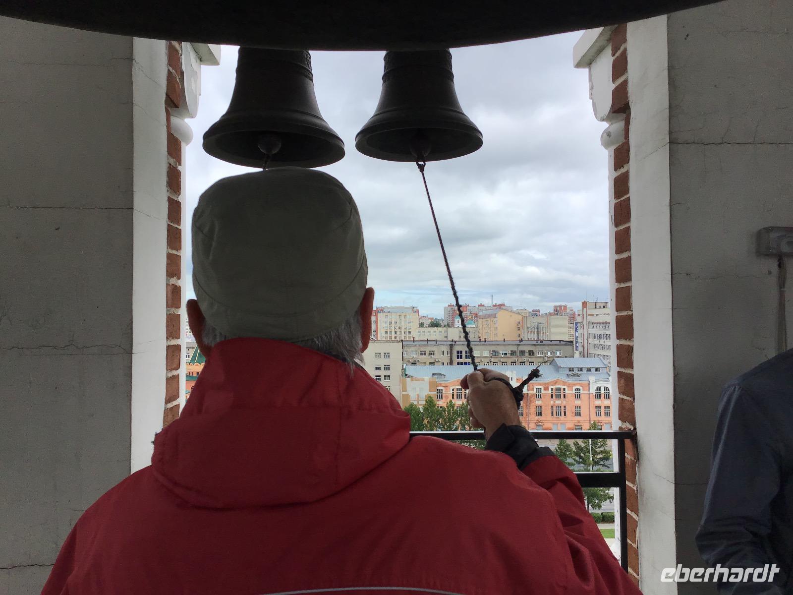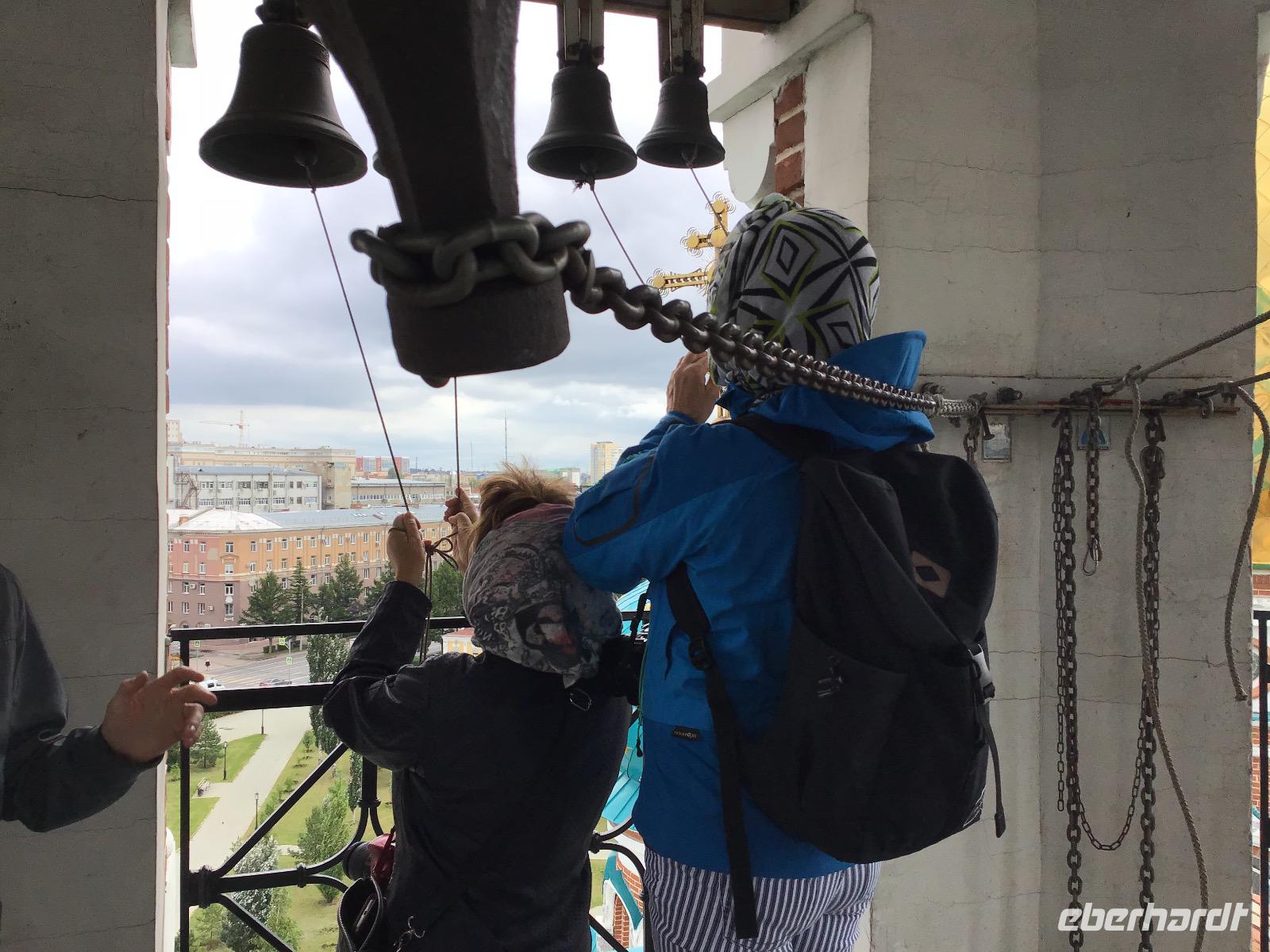 Während unserer Stadtbesichtigung besuchen wir auch die Kathedrale von Omsk. Wir sehen, wie sich eine Familie auf die Taufe ihres Kindes vorbereitet und erleben einen Teil des Gottesdienstes. Als wir das Gotteshaus verlassen wollen, spricht uns ein junger Mann an und lädt uns ein, mit ihm auf den Glockenturm zu steigen. Oben angekommen, zeigt er uns, wie er die Glocken zum Läuten bringt. Alle Glocken sind mit dünnen Seilen verbunden. Diese wickelt er sich um Hände, Finger, Beine und Füße, die er mit Bewegungen, die einem Tanz gleichen, zieht und los lässt und somit ein melodisches Spiel erzeugt. Nach ihm dürfen auch wir uns versuchen. Nur, dass nicht ein Einziger die Strippen zieht, sondern Vier von uns und jeder an einem eigenen Seil. Die Omsker waren sicherlich erstaunt über den neuen Klang.