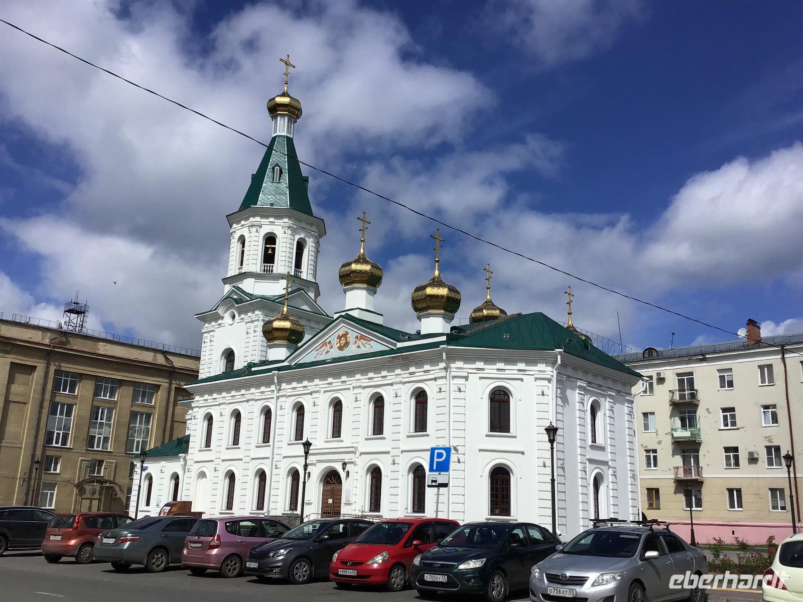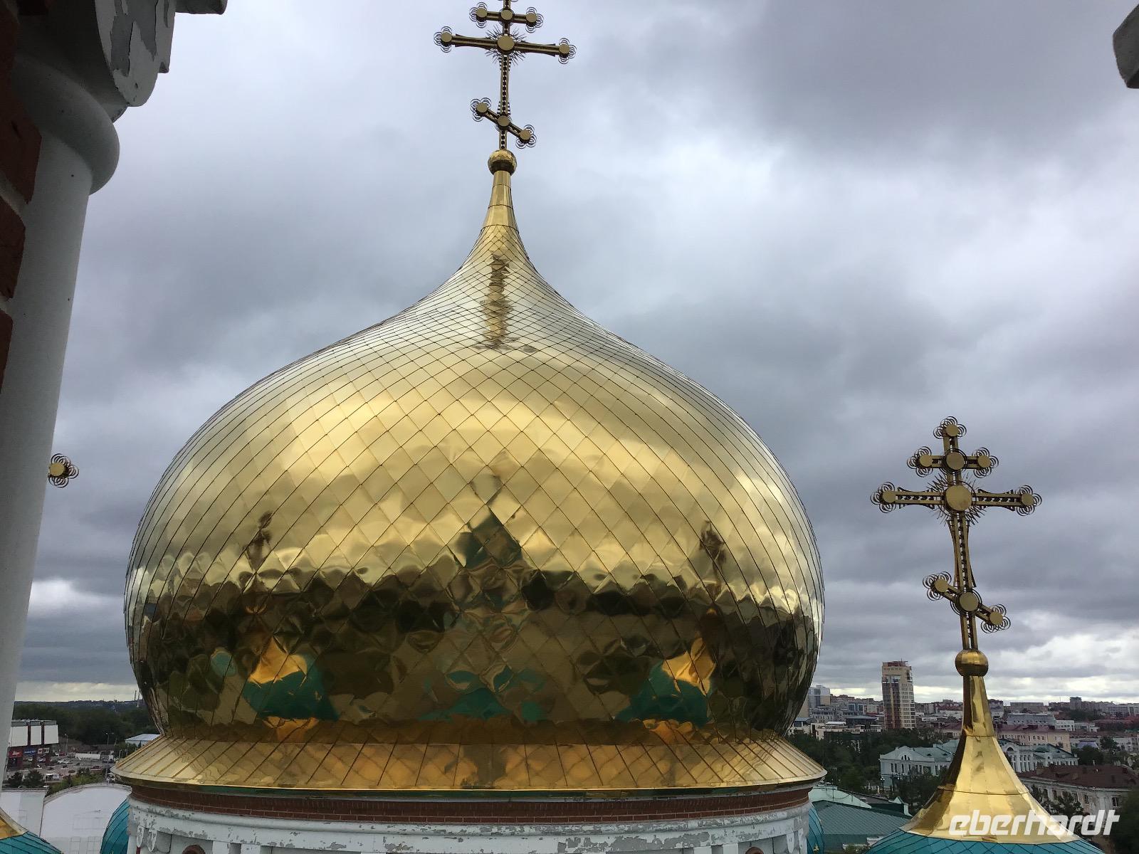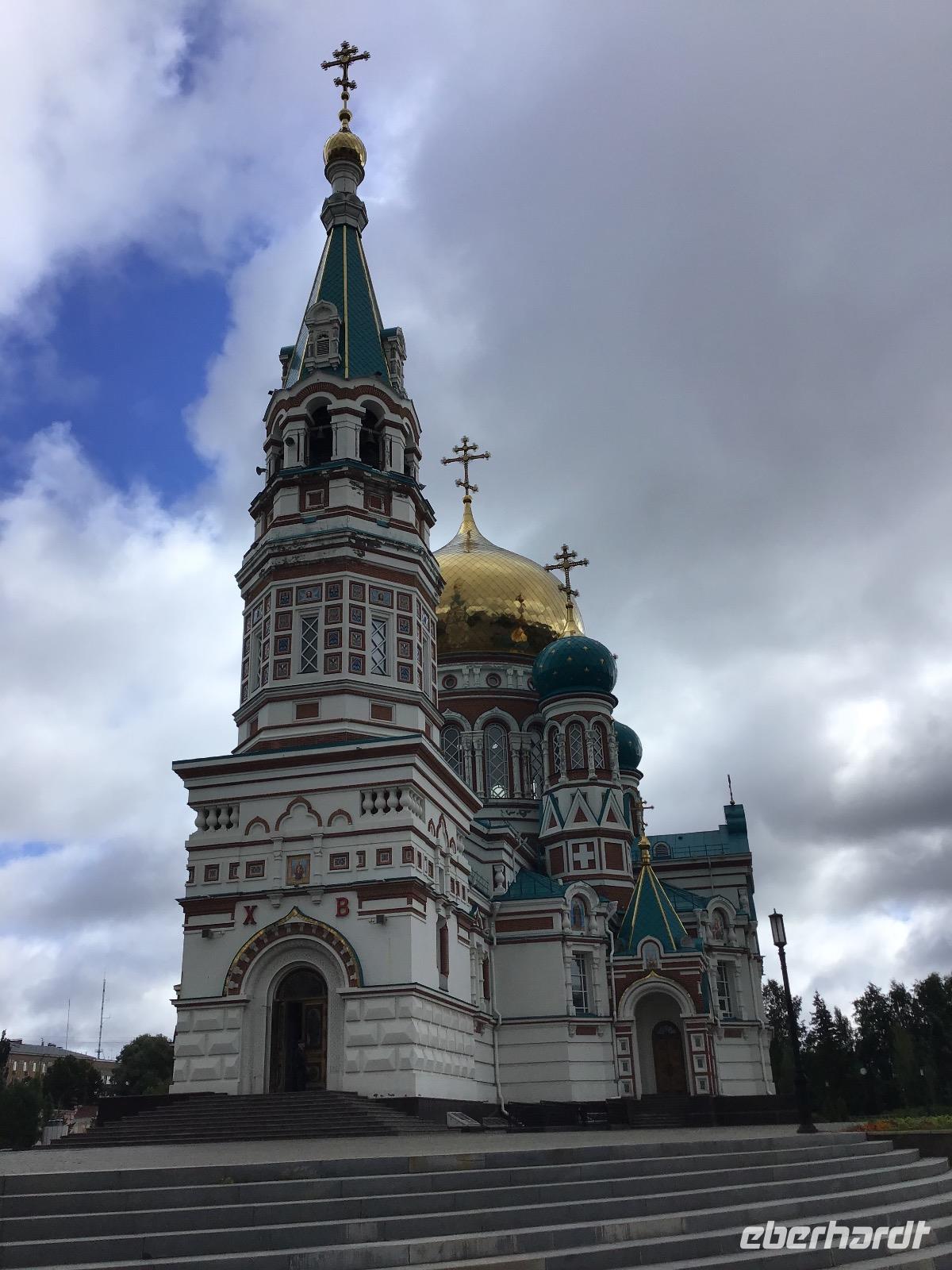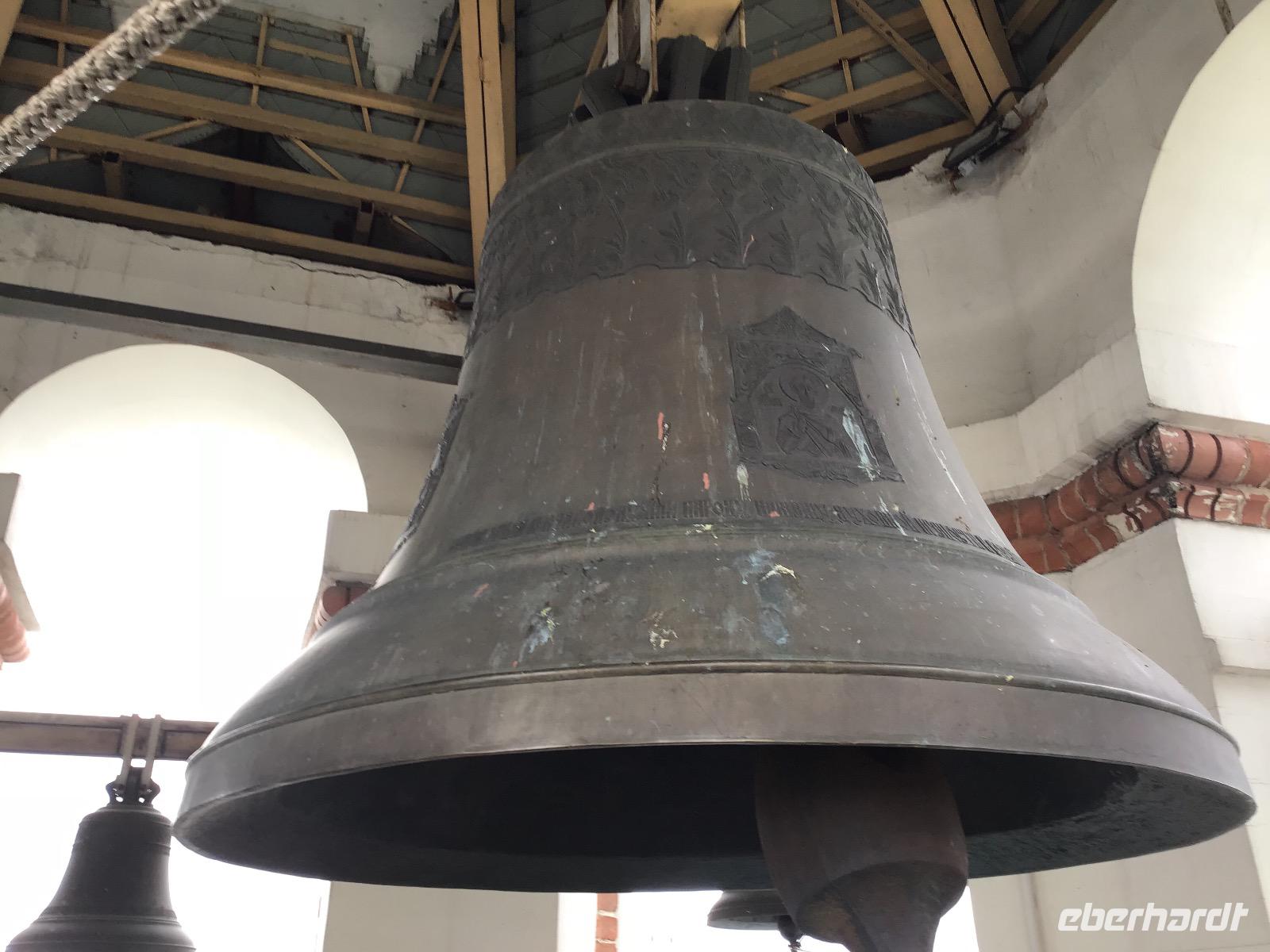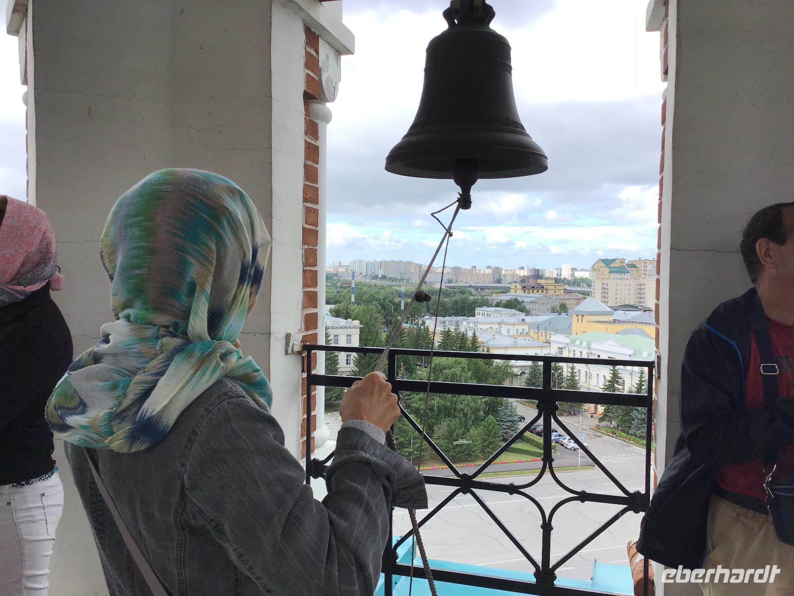 Während unserer Stadtbesichtigung besuchen wir auch die Kathedrale von Omsk. Wir sehen, wie sich eine Familie auf die Taufe ihres Kindes vorbereitet und erleben einen Teil des Gottesdienstes. Als wir das Gotteshaus verlassen wollen, spricht uns ein junger Mann an und lädt uns ein, mit ihm auf den Glockenturm zu steigen. Oben angekommen, zeigt er uns, wie er die Glocken zum Läuten bringt. Alle Glocken sind mit dünnen Seilen verbunden. Diese wickelt er sich um Hände, Finger, Beine und Füße, die er mit Bewegungen, die einem Tanz gleichen, zieht und los lässt und somit ein melodisches Spiel erzeugt. Nach ihm dürfen auch wir uns versuchen. Nur, dass nicht ein Einziger die Strippen zieht, sondern Vier von uns und jeder an einem eigenen Seil. Die Omsker waren sicherlich erstaunt über den neuen Klang.