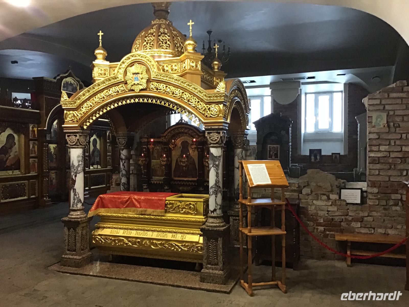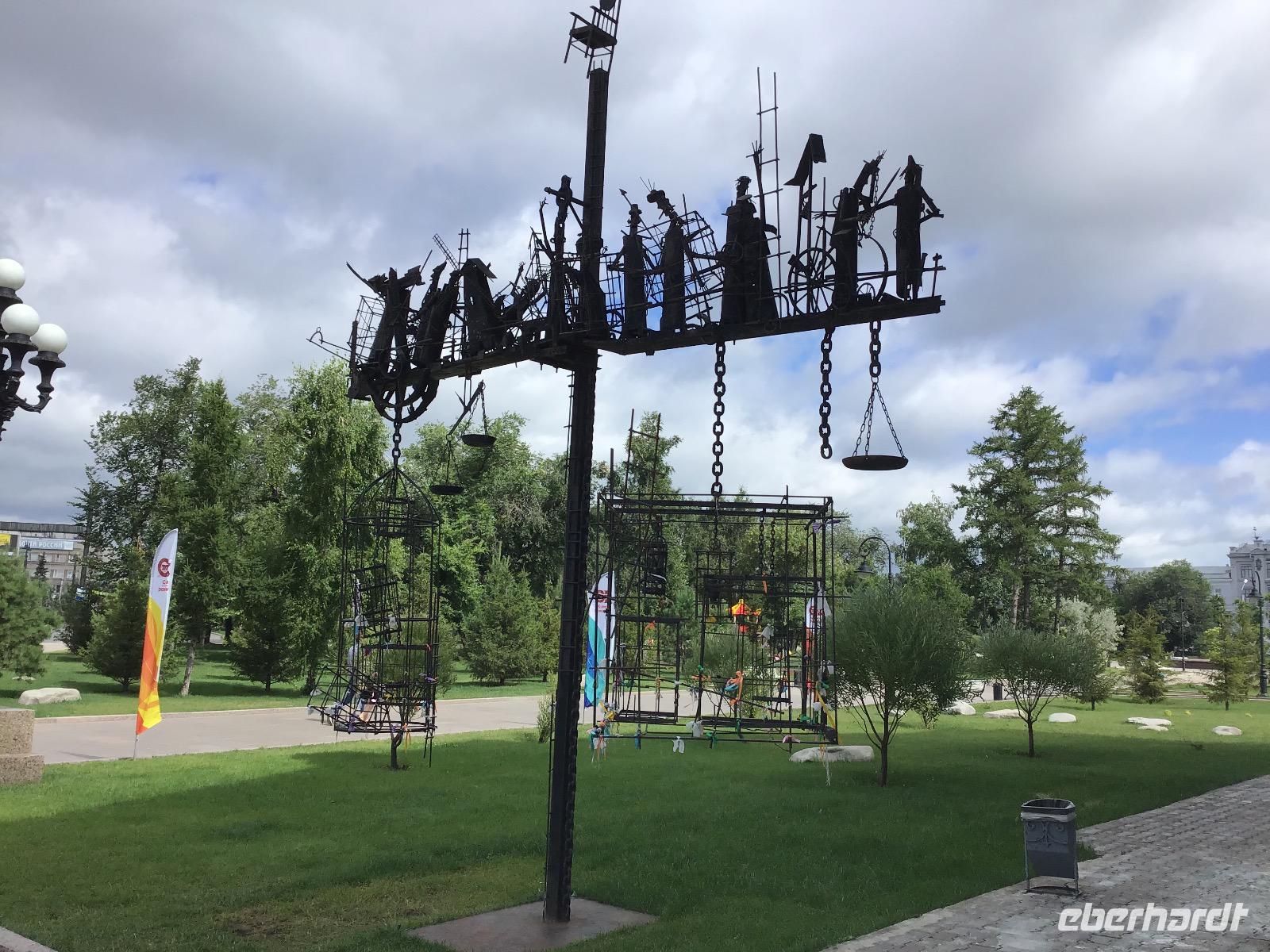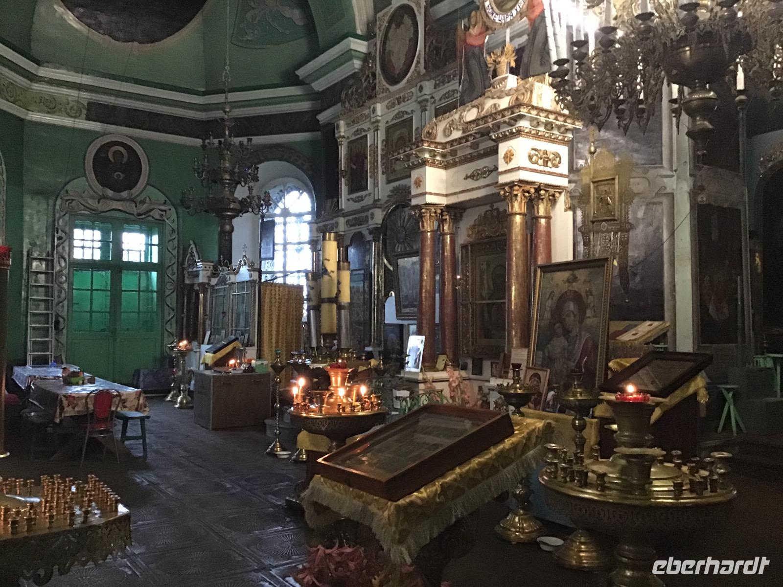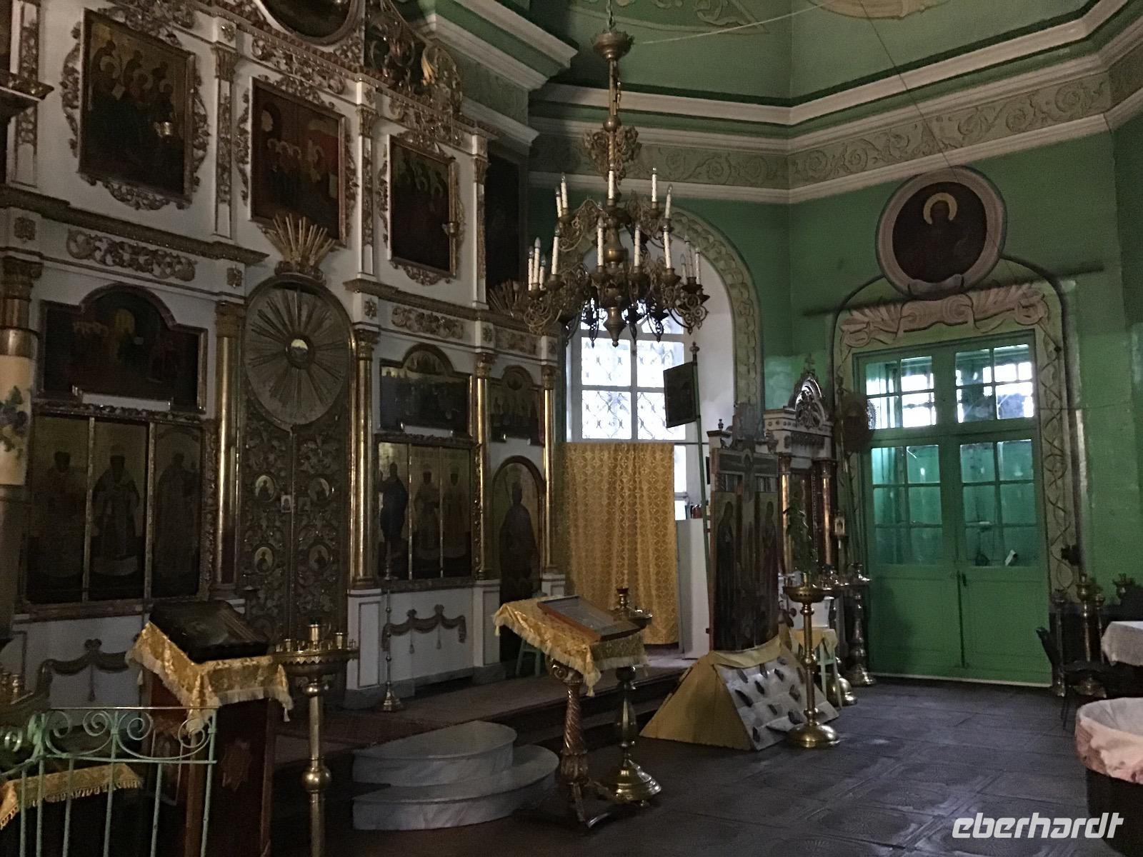 Während unserer Stadtbesichtigung besuchen wir auch die Kathedrale von Omsk. Wir sehen, wie sich eine Familie auf die Taufe ihres Kindes vorbereitet und erleben einen Teil des Gottesdienstes. Als wir das Gotteshaus verlassen wollen, spricht uns ein junger Mann an und lädt uns ein, mit ihm auf den Glockenturm zu steigen. Oben angekommen, zeigt er uns, wie er die Glocken zum Läuten bringt. Alle Glocken sind mit dünnen Seilen verbunden. Diese wickelt er sich um Hände, Finger, Beine und Füße, die er mit Bewegungen, die einem Tanz gleichen, zieht und los lässt und somit ein melodisches Spiel erzeugt. Nach ihm dürfen auch wir uns versuchen. Nur, dass nicht ein Einziger die Strippen zieht, sondern Vier von uns und jeder an einem eigenen Seil. Die Omsker waren sicherlich erstaunt über den neuen Klang.