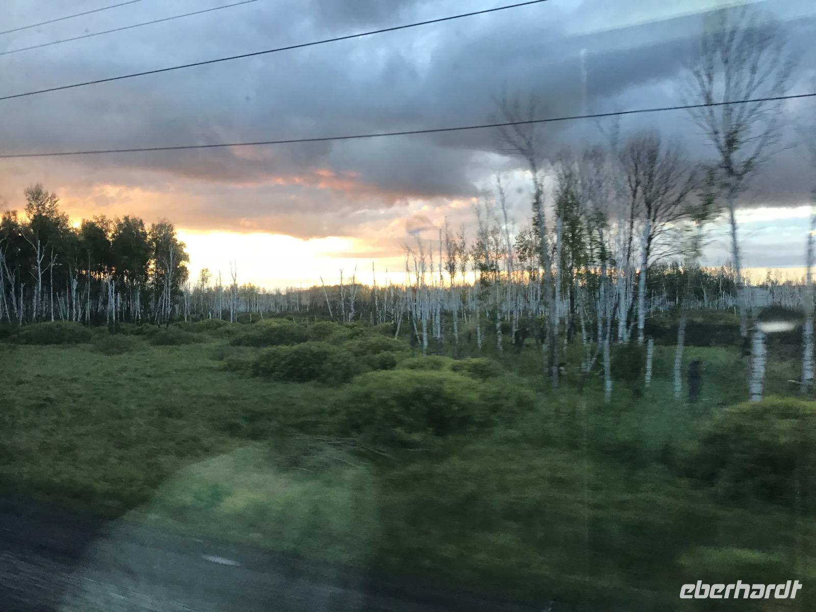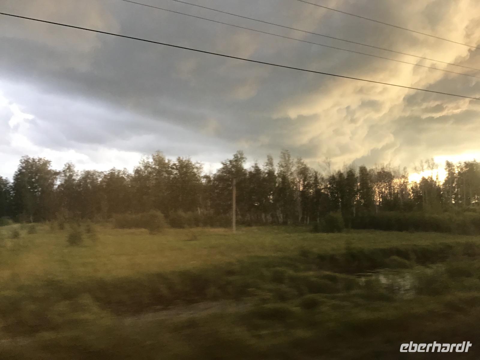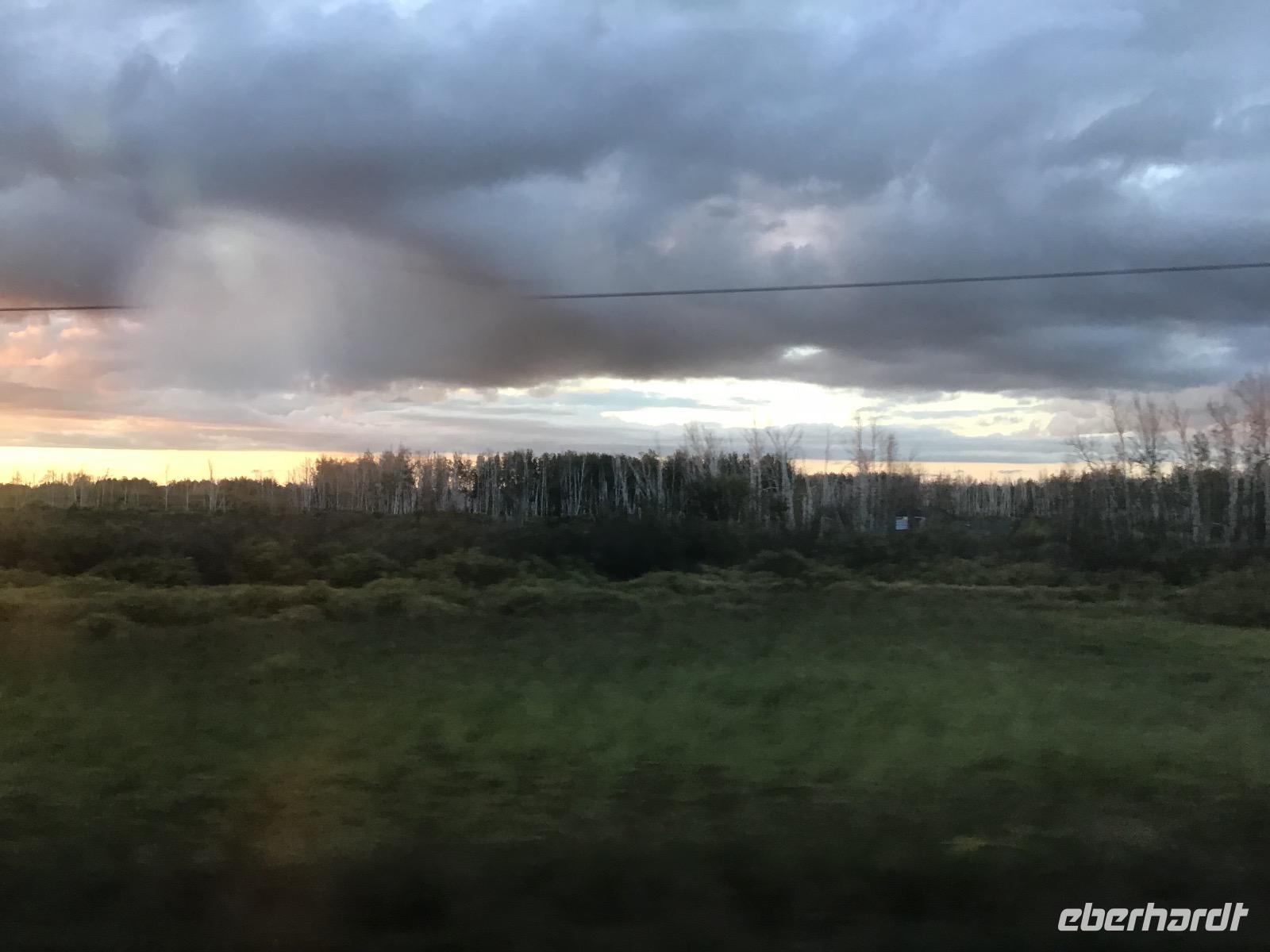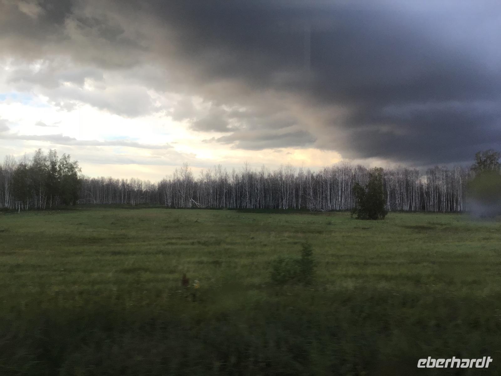 Im Zug erhalten wir wiederum eine Frühstücksbox sowie ein Mittagessen aus der Assiette. Das stört uns nicht, denn wir haben gestern ausreichend Verpflegung im Supermarkt eingekauft und niemand muss hungern. Immer wieder lockt die vorbei rauschende Landschaft die Fotografen an die Fenster. Zunächst müssen wir mit bedecktem Himmel leben, aber am Nachmittag scheint auch die Sonne bis wiederum dunkle Wolken aufziehen und ein Regenbogen erscheint. Nach Ortszeit 21 Uhr erreichen wir Omsk. Tatjana erwartet uns am Bahnsteig und bringt uns zu unserem Hotel.
