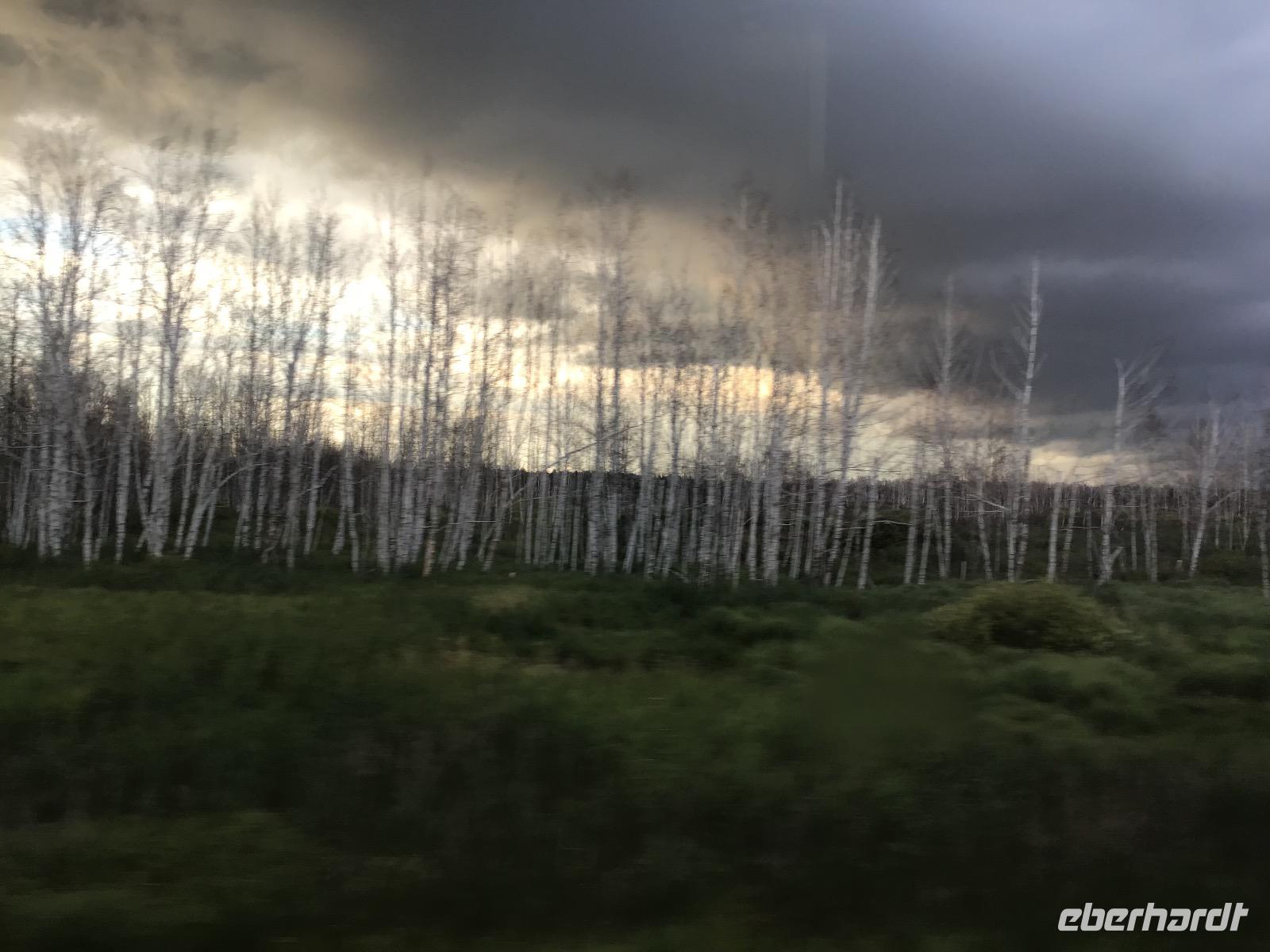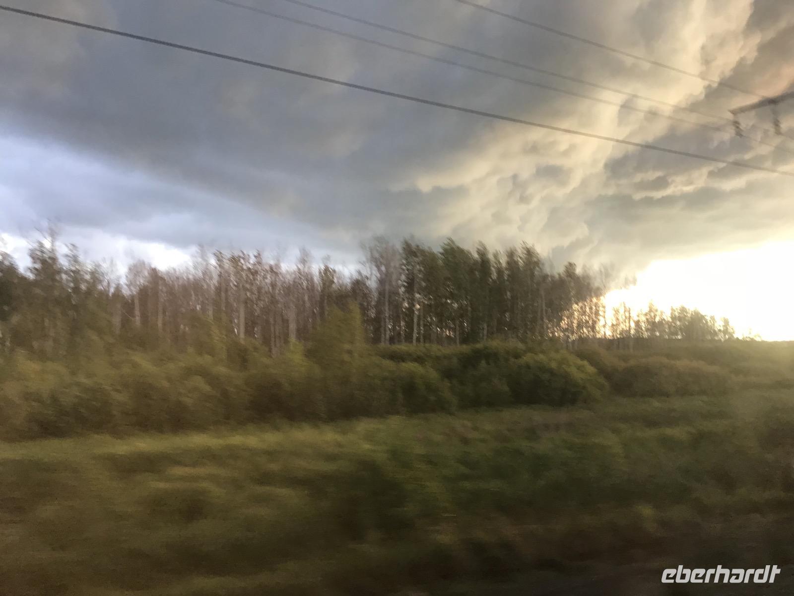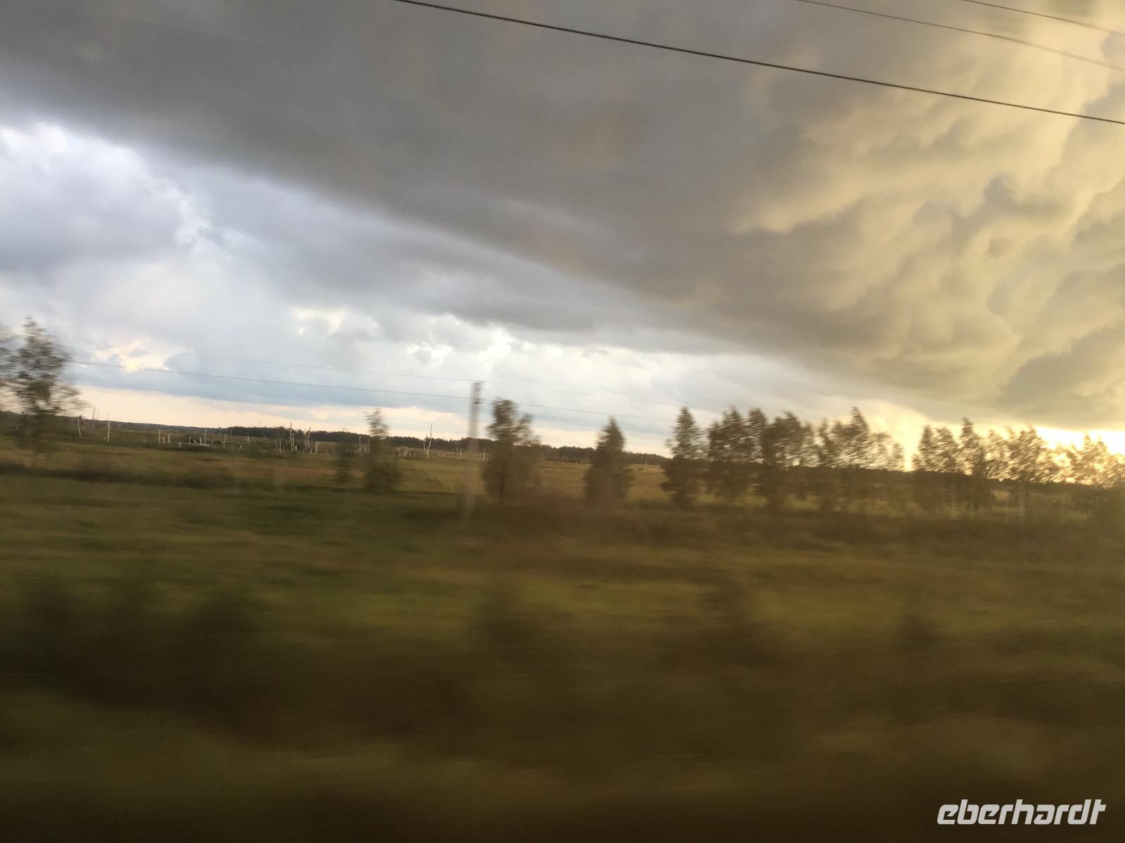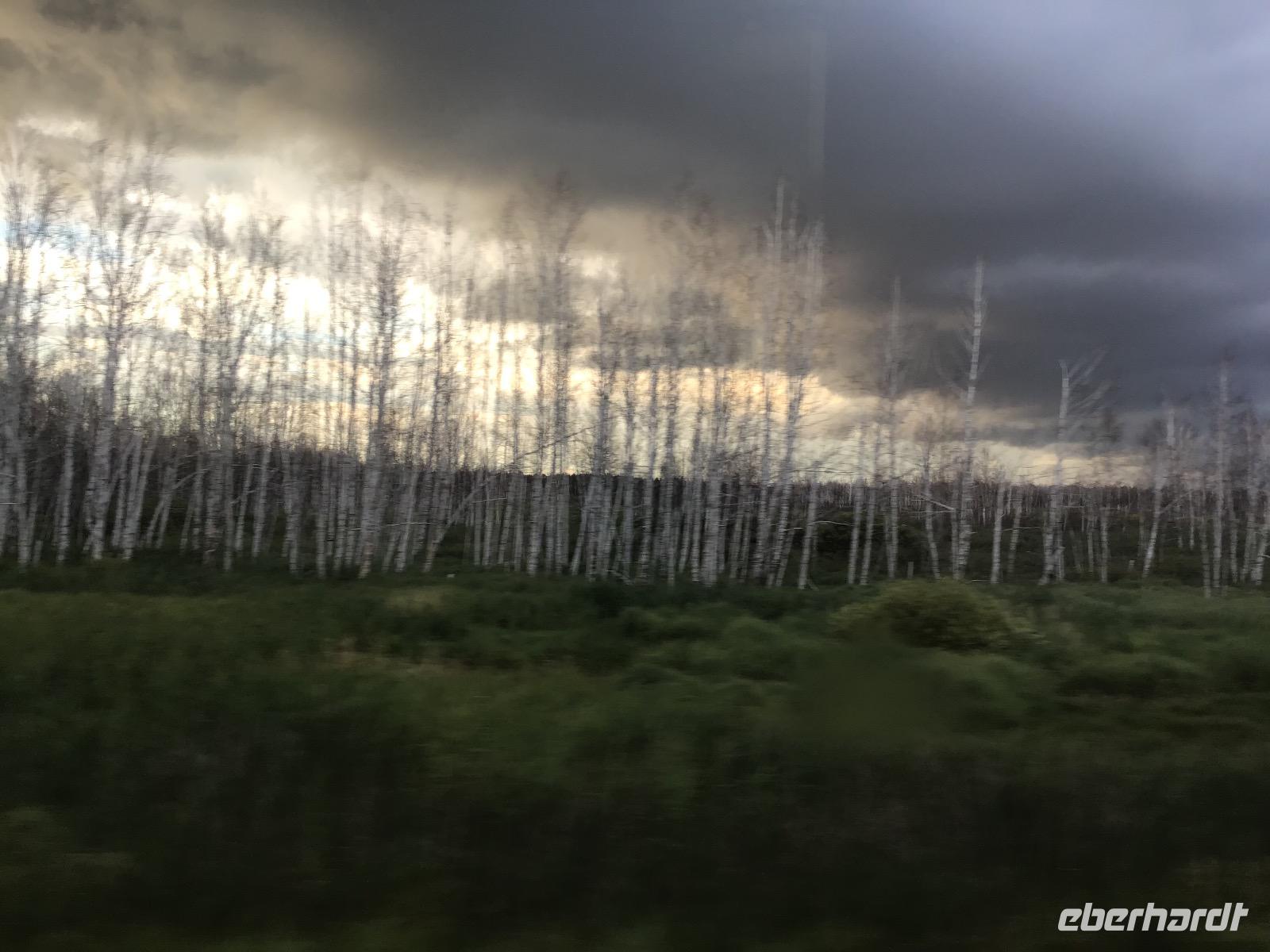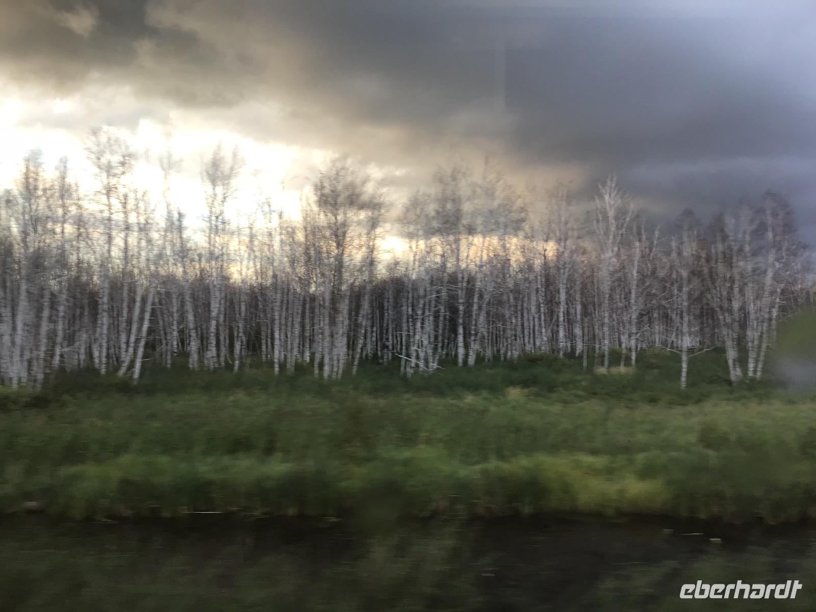 Im Zug erhalten wir wiederum eine Frühstücksbox sowie ein Mittagessen aus der Assiette. Das stört uns nicht, denn wir haben gestern ausreichend Verpflegung im Supermarkt eingekauft und niemand muss hungern. Immer wieder lockt die vorbei rauschende Landschaft die Fotografen an die Fenster. Zunächst müssen wir mit bedecktem Himmel leben, aber am Nachmittag scheint auch die Sonne bis wiederum dunkle Wolken aufziehen und ein Regenbogen erscheint. Nach Ortszeit 21 Uhr erreichen wir Omsk. Tatjana erwartet uns am Bahnsteig und bringt uns zu unserem Hotel.
