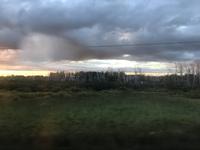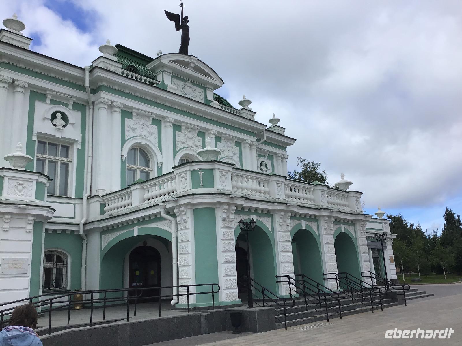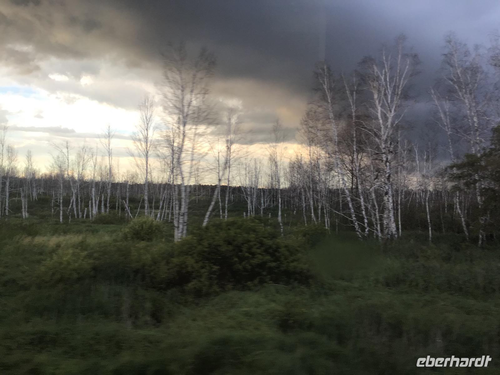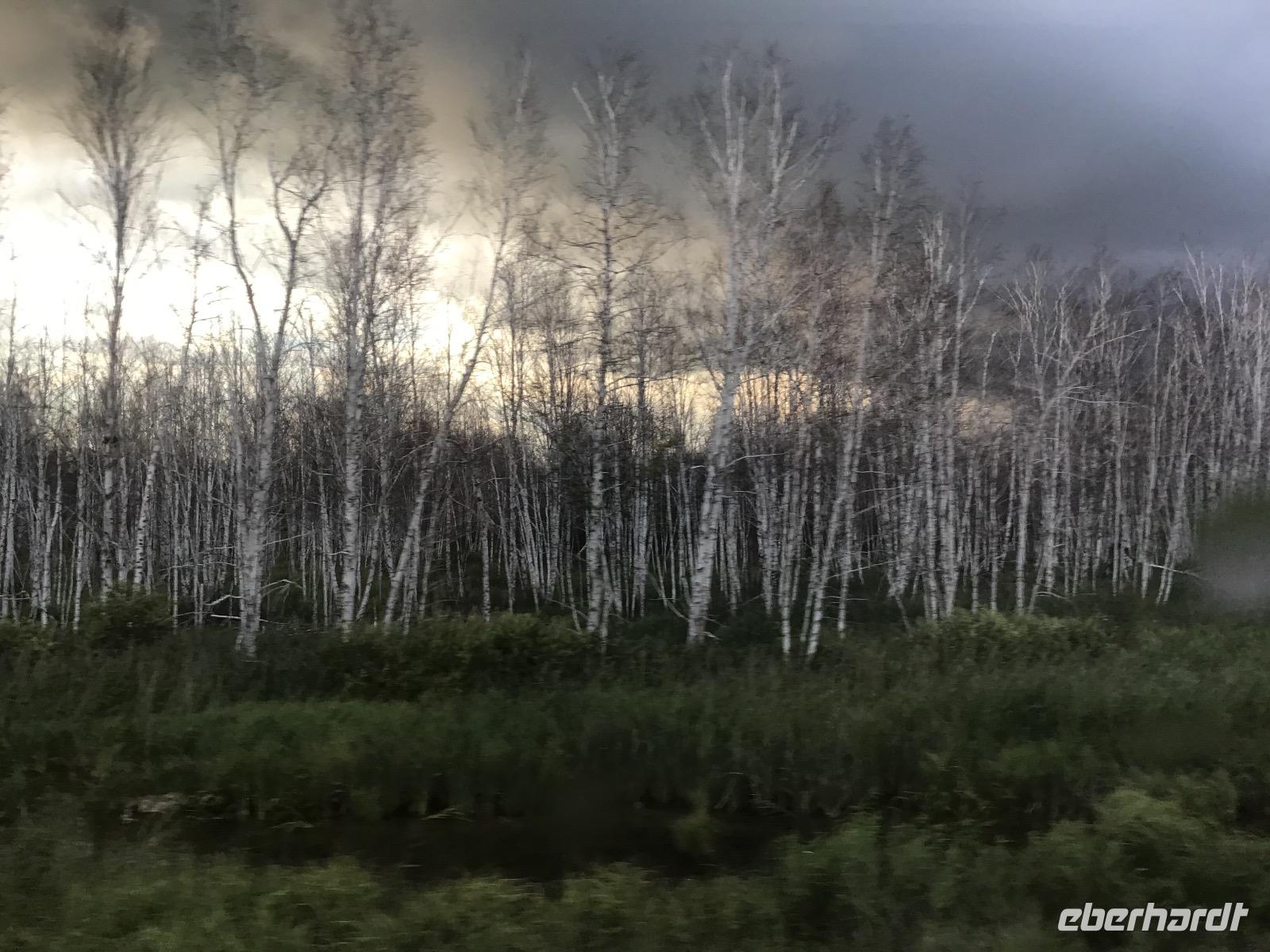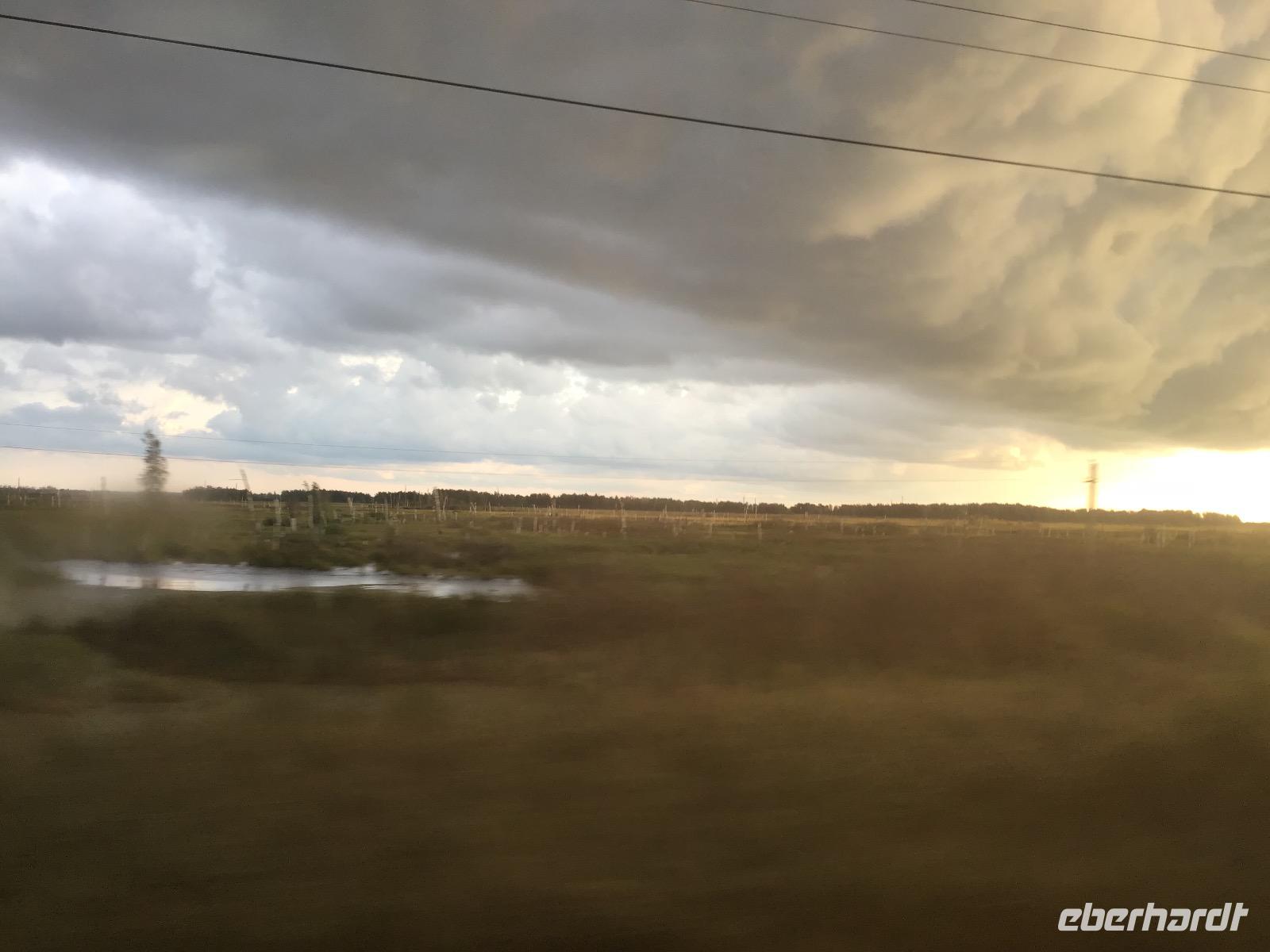 Im Zug erhalten wir wiederum eine Frühstücksbox sowie ein Mittagessen aus der Assiette. Das stört uns nicht, denn wir haben gestern ausreichend Verpflegung im Supermarkt eingekauft und niemand muss hungern. Immer wieder lockt die vorbei rauschende Landschaft die Fotografen an die Fenster. Zunächst müssen wir mit bedecktem Himmel leben, aber am Nachmittag scheint auch die Sonne bis wiederum dunkle Wolken aufziehen und ein Regenbogen erscheint. Nach Ortszeit 21 Uhr erreichen wir Omsk. Tatjana erwartet uns am Bahnsteig und bringt uns zu unserem Hotel.
