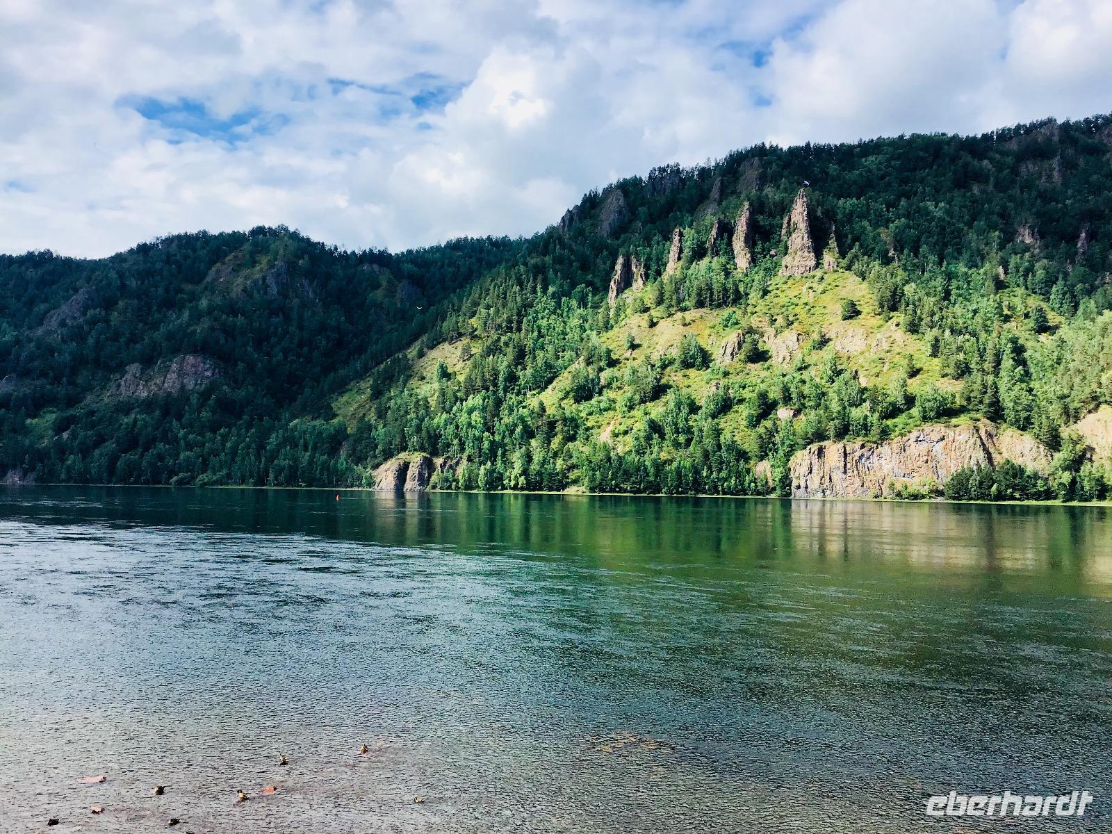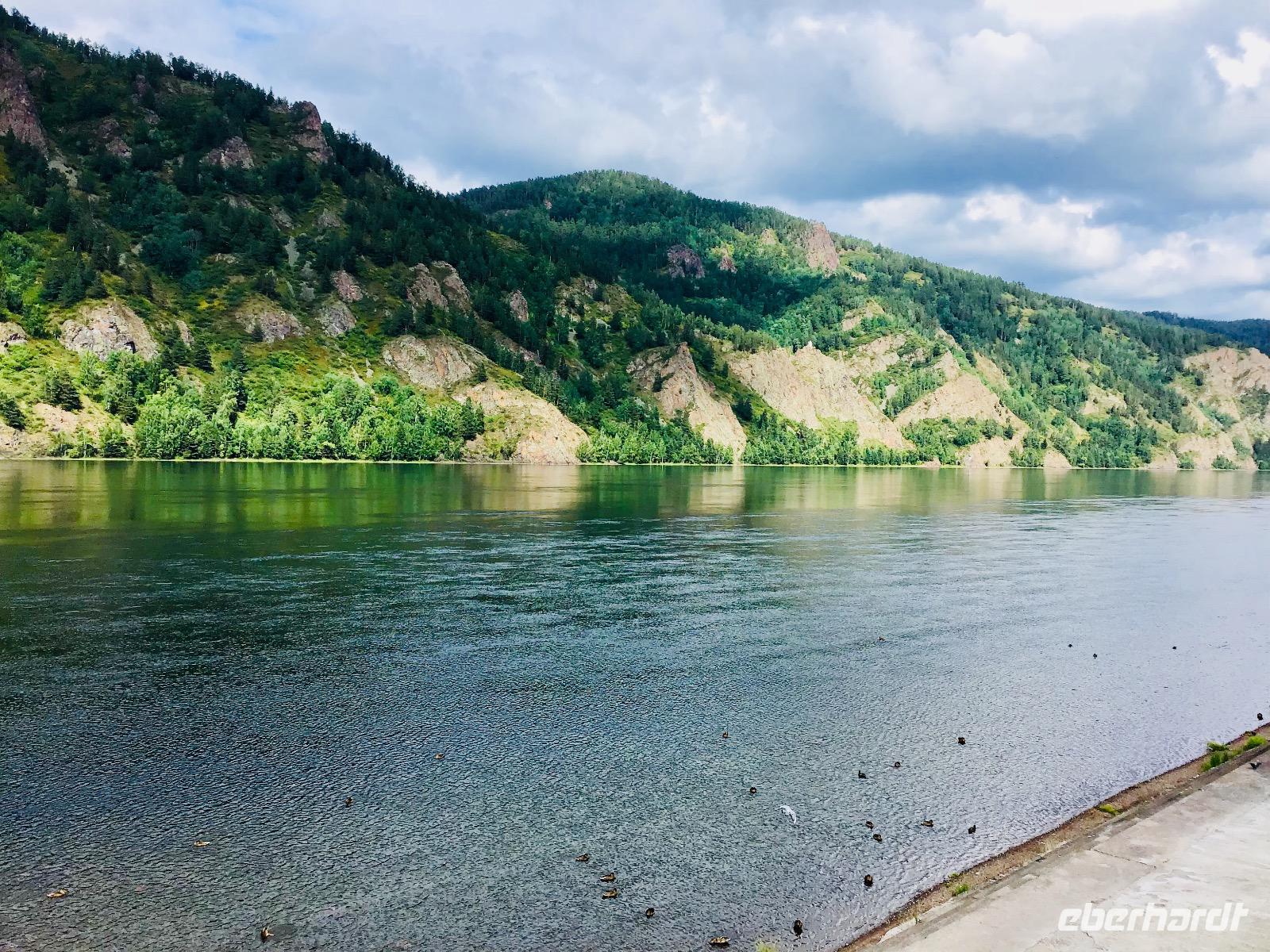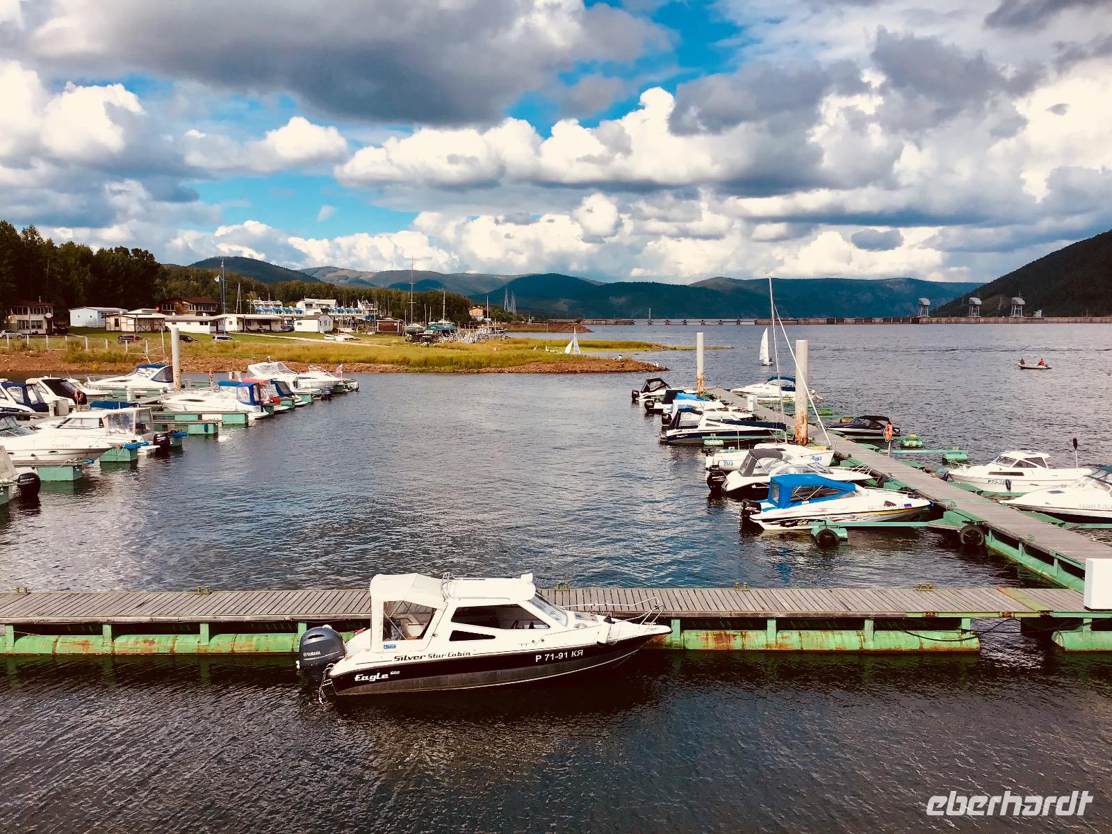 Mittags erreichen wir Krasnojarsk, was bedeutet, dass der Aufenthalt mit einem Mittagessen beginnt. Heute sind wir in einem ukrainischen Restaurant zu Gast. Es gibt Salat, Pelmeni und gegrilltes Fleisch. Gut gesättigt können wir uns auf den Nachmittag freuen. Unser Weg führt uns heute durch eine Region außergewöhnlicher Schönheit. Am rechten Ufer des Jenissej liegt in malerischer Umgebung der Ort Divnogorsk. In diesem wiederum wurde ein Familienerholungspark Namens Admiral errichtet. In der Bucht von Shumikha erwarten uns zwei Jachten, mit denen wir auf dem Stausee, der vor vielen Jahren für die Energiegewinnung errichtet wurde, eine Bootsfahrt unternehmen. Der Himmel ist blau mit weißen Wölkchen, die Ufer gesäumt von Jahrhunderte alten Nadelwäldern. Der Nachmittag vergeht wie im Flug und schon heißt es wieder Abendessen. Vom Restaurant bummeln wir zum Hotel, vor dem sich eine große Springbrunnenanlage befindet. Der Jenissej und seine Angara sowie andere Gestalten dieser Geschichte sind hier figürlich dargestellt. Der Brunnen beeindruckt durch seine Beleuchtung und die Wasserspiele. Ein erholsamer Tag neigt sich dem Ende zu.