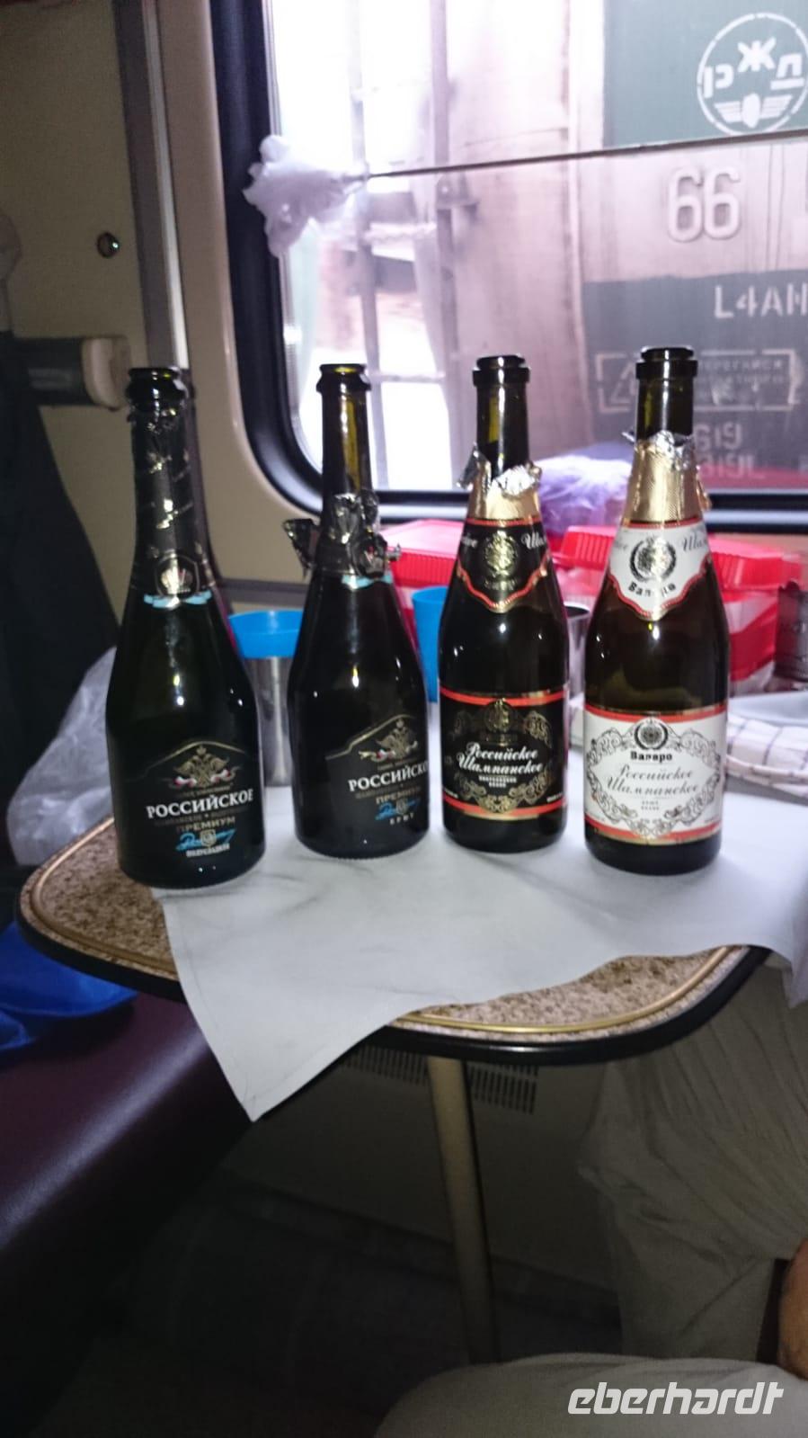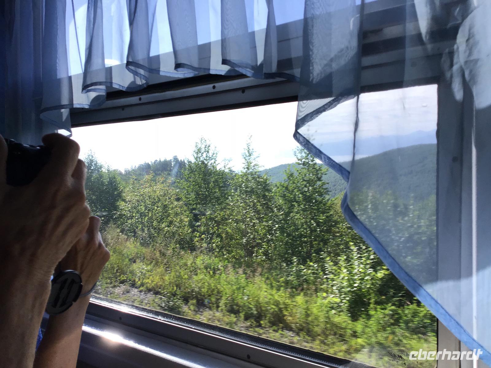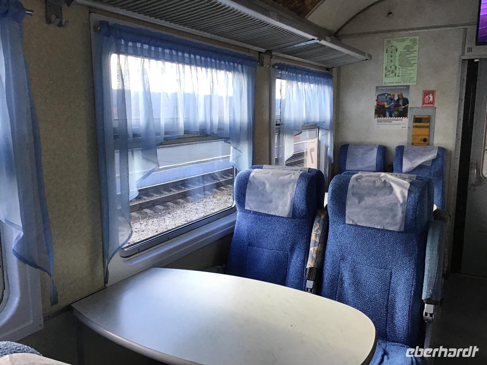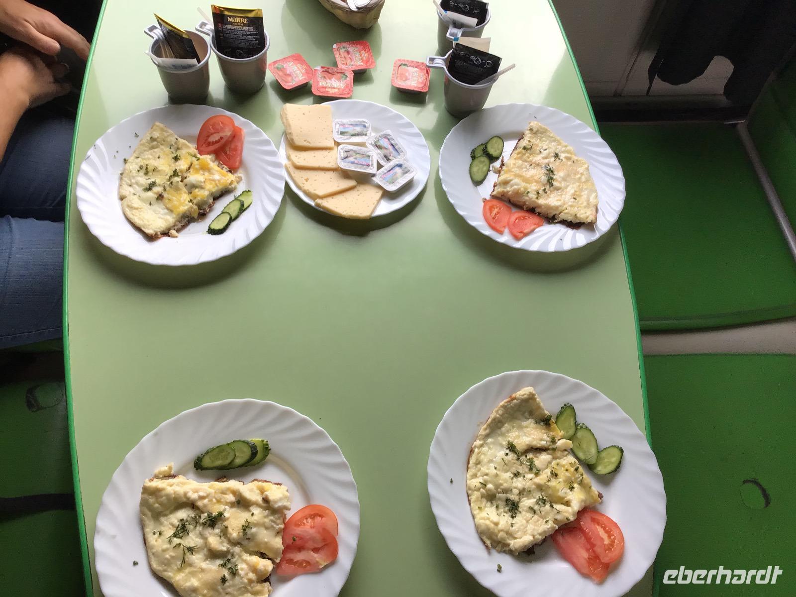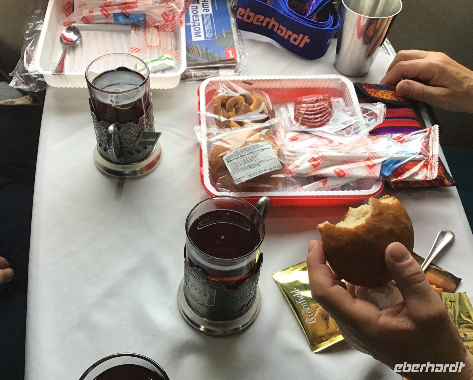 Nicht lange können in den Schlaf versinken, denn bereits um Vier klingelt das Telefon zum Wake-Up-Call. Ein freundlicher Rezeptionist versorgt uns mit Lunchboxen und verabschiedet uns. Sergej holt uns mit dem Auto ab und bringt uns zum Bahnhof. Schnell haben wir ausgemacht, welches unser Bahnsteig ist und schon kommt der Zug. In unseren 4-Mann-Abteilen stehen bereits Frühstücksboxen bereit, denen wir uns aber erst später widmen. Nach ein paar Schwätzchen versinkt der eine oder andere in den Schlaf und so fliegen die ersten Kilometer dahin. Bei der Deshurnaja (Schaffnerin) gibt es später heißes Wasser für mitgebrachte Teebeutel oder Tee für 50 Rubel (ca. 75 Cent). Zum Mittagessen haben wir die Wahl zwischen Hühnchen (Kuritza) und Schwein. Der Nachmittag vergeht mit Aus-dem-Fenster-Kucken, Unterhalten, Kartenspielen u.s.w.. Am Abend erreichen wir Jekaterinburg. Irina, unsere örtliche Reiseleiterin steht am Bahnsteig und bringt uns ins Hotel.