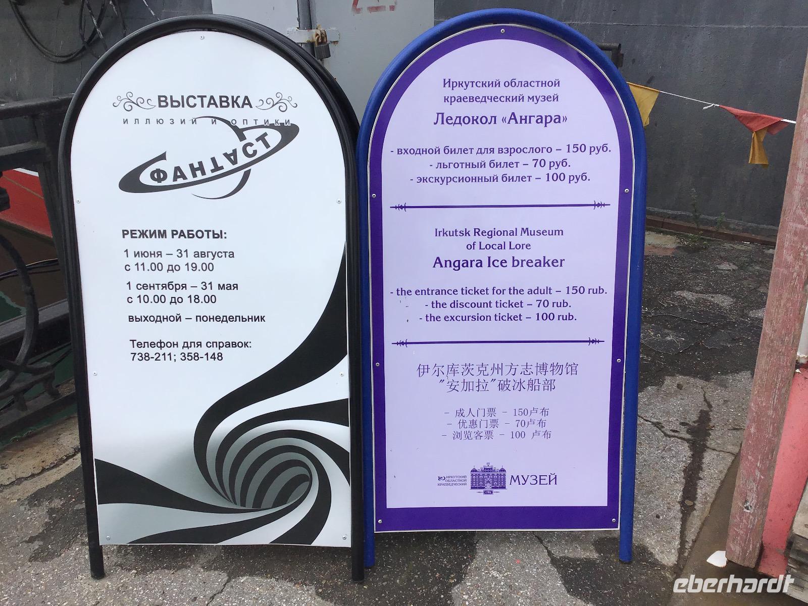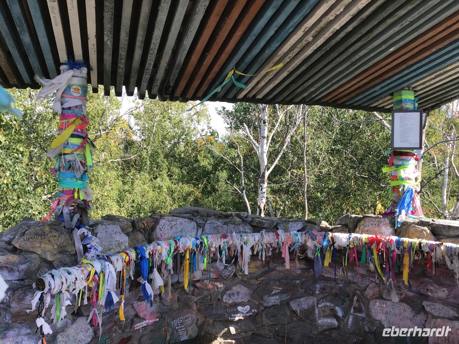 Nach einer weiteren Nacht in der Transsibirischen Eisenbahn erwartet uns heute das Frühstück im Restaurant. Es gibt Omelette, Weißbrot, Marmelade, Käse, Kaffee oder Tee. Anschließend lassen wir erneut die sibirische Landschaft an uns vorbei rauschen. Am späten Vormittag erreichen wir Irkutsk. Marina erwartet uns am Bahnhof. Wir fahren zum Eisbrecher Angara und unterwegs zeigt uns Marina, was es in Irkutsk zu sehen gibt. Am Eisbrecher erwartet uns ein enthusiastischer Guide, der uns haarklein alles über das Schicksal des Schiffes und seines Schwesternschiffes erzählt. Es sind tragische Geschichten. Nicht nur, dass viele Schiffe verunglückten, weil sie den nautischen Bedingungen des Baikalsees nicht gewachsen waren, auch viele Menschenleben waren zu beklagen, einerseits durch die Schiffsunglücke, andererseits aber auch durch die kriegerischen Auseinandersetzungen, die hier stattgefunden haben. Nun ist es Zeit für uns, aufzubrechen, wir haben heute noch viel vor. Unser Weg führt nach Ust-Orda, wo wir zunächst zu einem burjatischen Mittagessen eingeladen sind. Kulturell umrahmt wird unser Aufenthalt durch den Gastgeber und seine Mitstreiter, die uns mit burjatischen Tänzen und Gesängen erfreuen. Leider können wir die Vorstellung nicht bis zum Ende genießen, da wir weitere Programmpunkte haben. Wir fahren zum Völkerkundemuseum. Hier werden wir mit einem schamanischen Ritual begrüßt. Ein Feuer wird angezündet und die Männer müssen ihre Füße darüber schwenken, die Damen ihre Arme. Das alles wird begleitet mit freundlichen Worten des burjatischen Paares, die uns Frieden, Glück und Gesundheit wünschen. Nun werden wir in den Innenhof gebeten. Eine burjatische Folkloregruppe singt und tanzt zunächst für uns und später mit uns. Ein ausgewählter Gast muss seine Geschicklichkeit in einem Ringkampf beweisen. Als Belohnung darf er anschließend mit zwei hübschen Burjatinnen tanzen. Jetzt werden wir ins Zelt des Schamanen eingeladen. Zuerst dürfen die Männer eintreten und links Platz nehmen, dann die Frauen, die sich auf die rechte Seite zu setzen haben. Mit einigem Hokuspokus beginnt die Vorstellung. Der Schamane ist ein freundlicher runder Mann mit einem großen dicken Bauch. Wir bekommen einen Kurs im richtigen, heißt gesunden, Benehmen. Es fängt an mit „gerade Sitzen", geht weiter mit „Beine nicht überkreuzen und nicht über schlagen" sowie nicht hat herum lümmeln, weder im Sitzen noch im Stehen. Für die Geister müssen wir unsere Namen nennen und die Orte, aus denen wir stammen. Das müssen die Geister wissen, damit sie für unser Wohl sorgen können. Der Schamane zündet dann noch ein kleines Feuerchen an, murmelt unverständliche Worte und versucht, ist uns ins Gespräch zu kommen. Aber entweder sind wir tatsächlich zu müde oder zu überrascht, um uns auf eine echte Unterhaltung mit ihm einzulassen. Mit einem Wink auf ein Körbchen, in dem sich ein Tausend-Rubel-Schein befindet, werden wir freundlich entlassen.