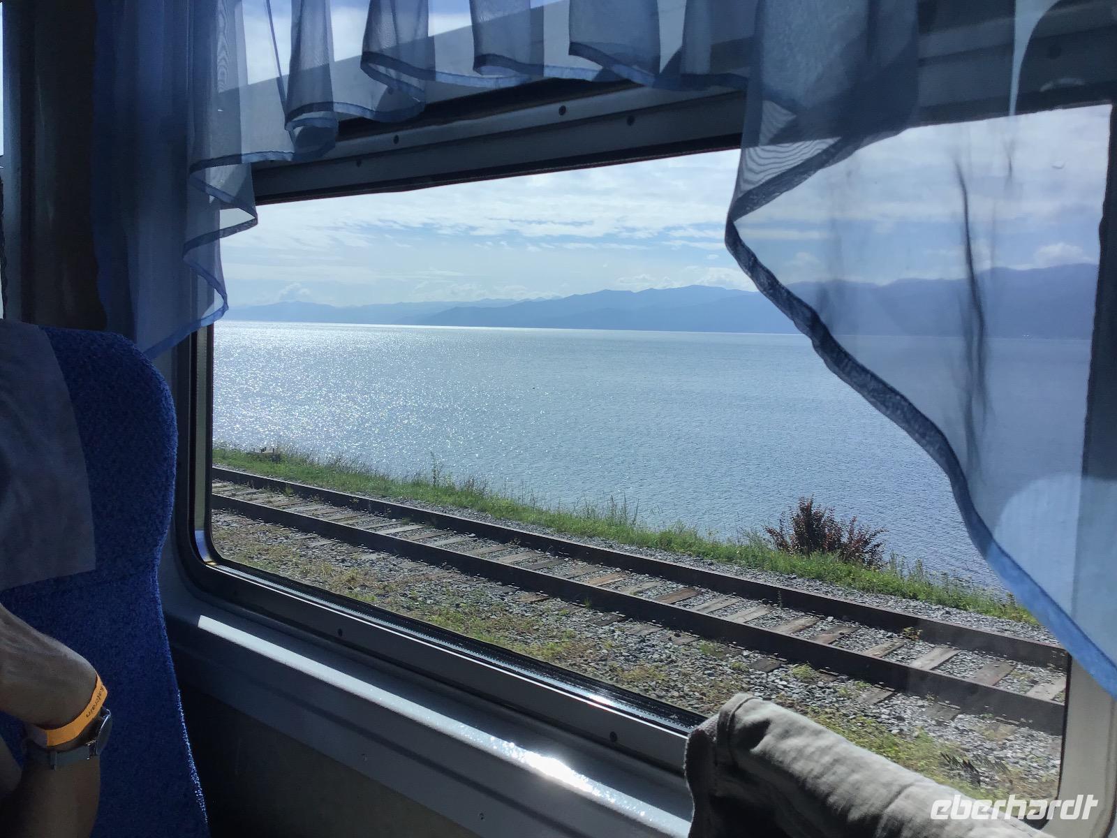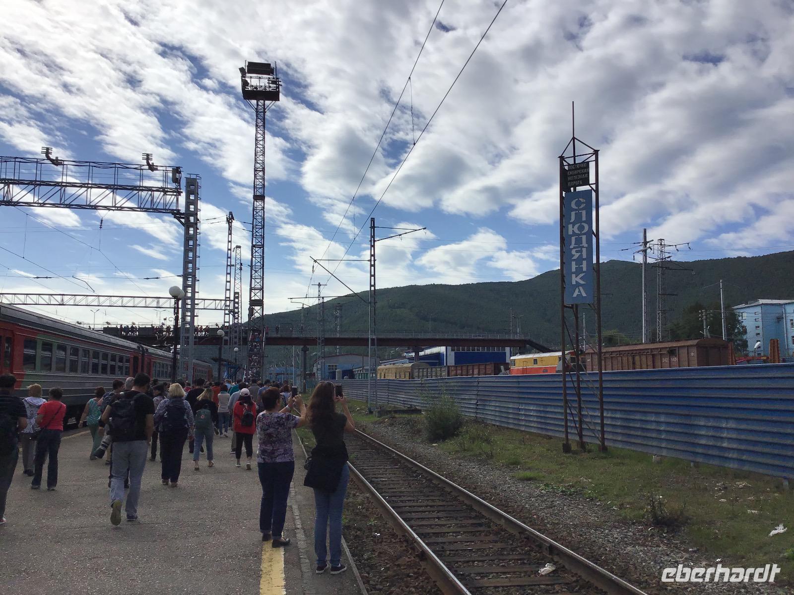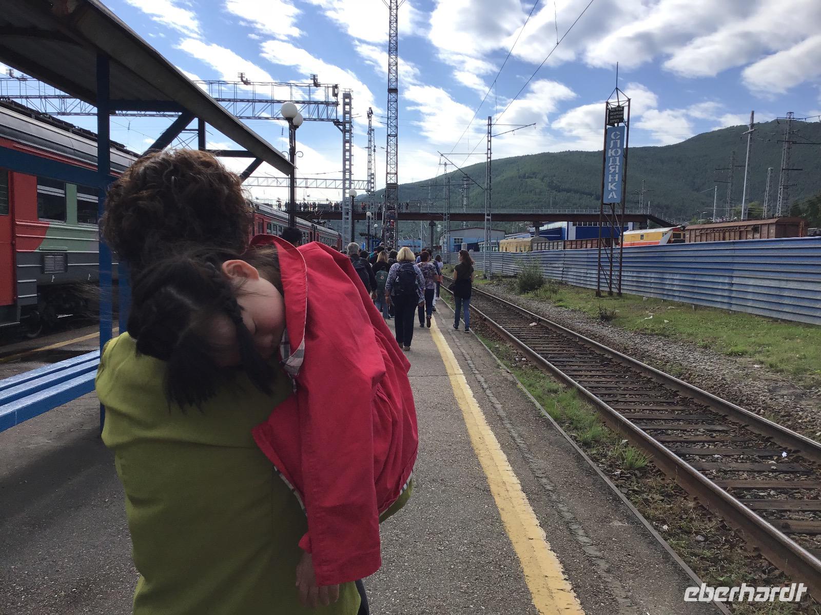 Eine letzte Eisenbahntour erwartet uns heute. Deshalb müssen wir früh unsere, ach so bequemen, Betten verlassen. Ein kleiner Bus bringt uns zum Irkutsker Bahnhof. Hier steigen wir in Wagon 7 und ehe ich es mich versehe, hängt meine kleine Freundin Tanja an meinem Hals und weint vor Freude. Tanja hat unsere Singlereise nach Sibirien vor zwei Jahren begleitet. Auch diese war von vielen unvorhersehbaren Ereignissen geprägt. So etwas schmiedet natürlich zusammen und seit dem sind wir (Facebook sei Dank) befreundet und erfahren regelmäßig, was die andere so treibt. Nur, dass wir gleichzeitig mit der Baikalbahn fahren werden, kam in dem Gedankenaustausch nie vor. Nun, die Welt ist klein, oder?