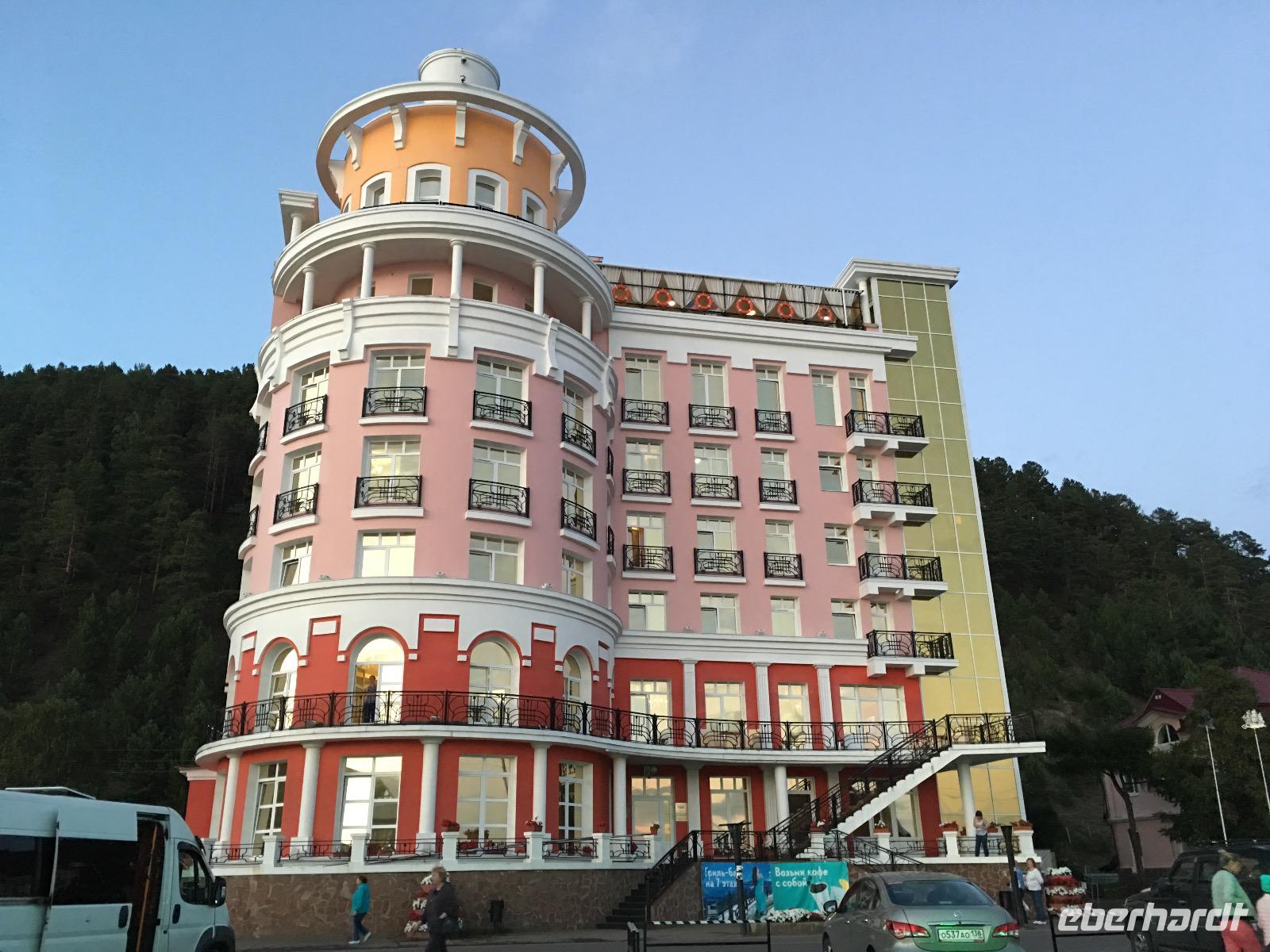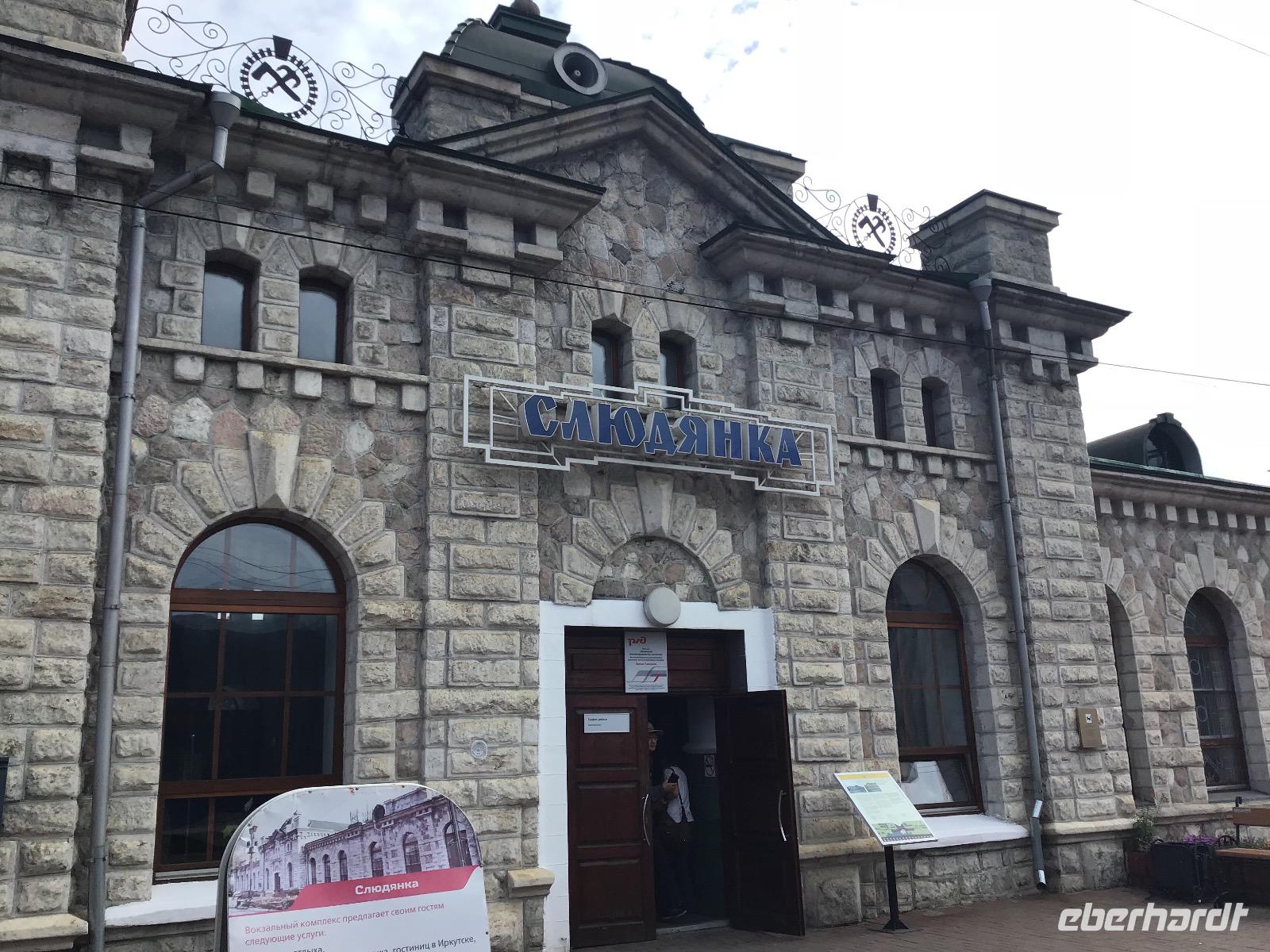 Jetzt aber wieder zurück zu den Erlebnissen unserer Gruppe. Von Irkutsk fahren wir mit der Transsib nach Listwjanka. Was wir nicht wissen, wir sitzen bereits im richtigen Zug, das heißt, wir fahren zwar auf der Strecke der Transsib, sind aber bereits im Zug der Krugobaikalski. Das heißt, es gibt bequeme Sessel und Gardinchen an den Fenstern. Ca. zwei Stunden benötigen wir bis Sludjanka. Hier haben wir eine halbe Stunde Zeit, um auszusteigen, den Bahnhof zu bewundern, Fotos zu machen und wieder einzusteigen. Mit uns unternehmen hunderte von Asiaten diesen Ausflug. Allerdings sitzen diese in Wagons der zweiten und dritten Klasse. In Sludjanka beginnt die Fahrt entlang des Baikalsees. Wir haben Glück und sitzen auf der richtigen Seite. Aus dem Fenster können wir direkt auf den Baikalsee schauen. Den ganzen Tag über fahren wir ist der Bahn, unterbrochen wird die Tour von regelmäßigen Stopps, an denen (fast) alle aussteigen, um die entsprechenden Sehenswürdigkeiten zu begutachten oder sich die Beine zu vertreten. An der Station Polowinowa ist es sogar möglich, im Baikalsee zu baden. Am frühen Abend erreichen wir Port Baikal. Wir haben alle eine orangenes Armband bekommen, darüber wird bestimmt, mit welchem Schiff bzw. um welche Zeit wir nach Listwjanka weiterfahren. Die Zeit dazwischen wird von einer fröhlichen russischen Sängergruppe überbrückt. Wieder dürfen wir mittanzen und auch musizieren. Mit einem Schnellboot geht es dann Ruck zuck nach Listwjanka, wo wir unser Hotel Mayak beziehen. Hier werden wir uns für die nächsten drei Tage aufhalten.