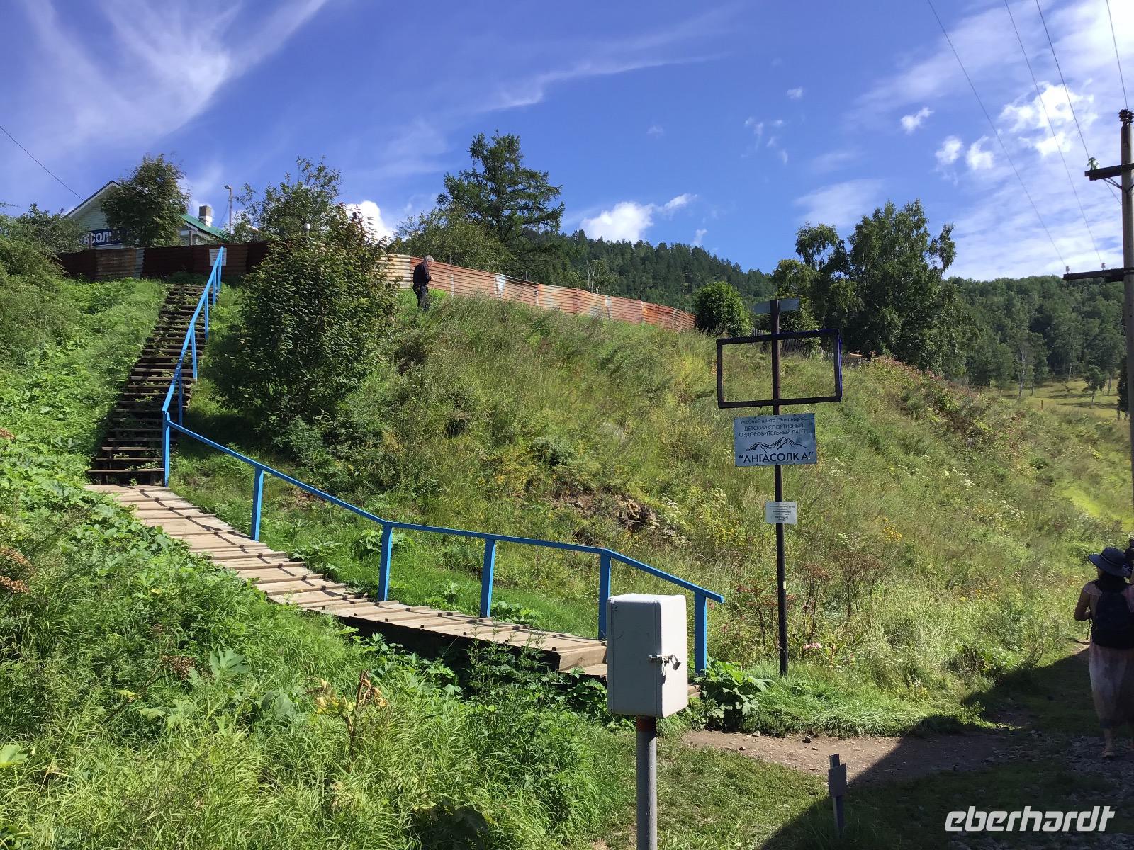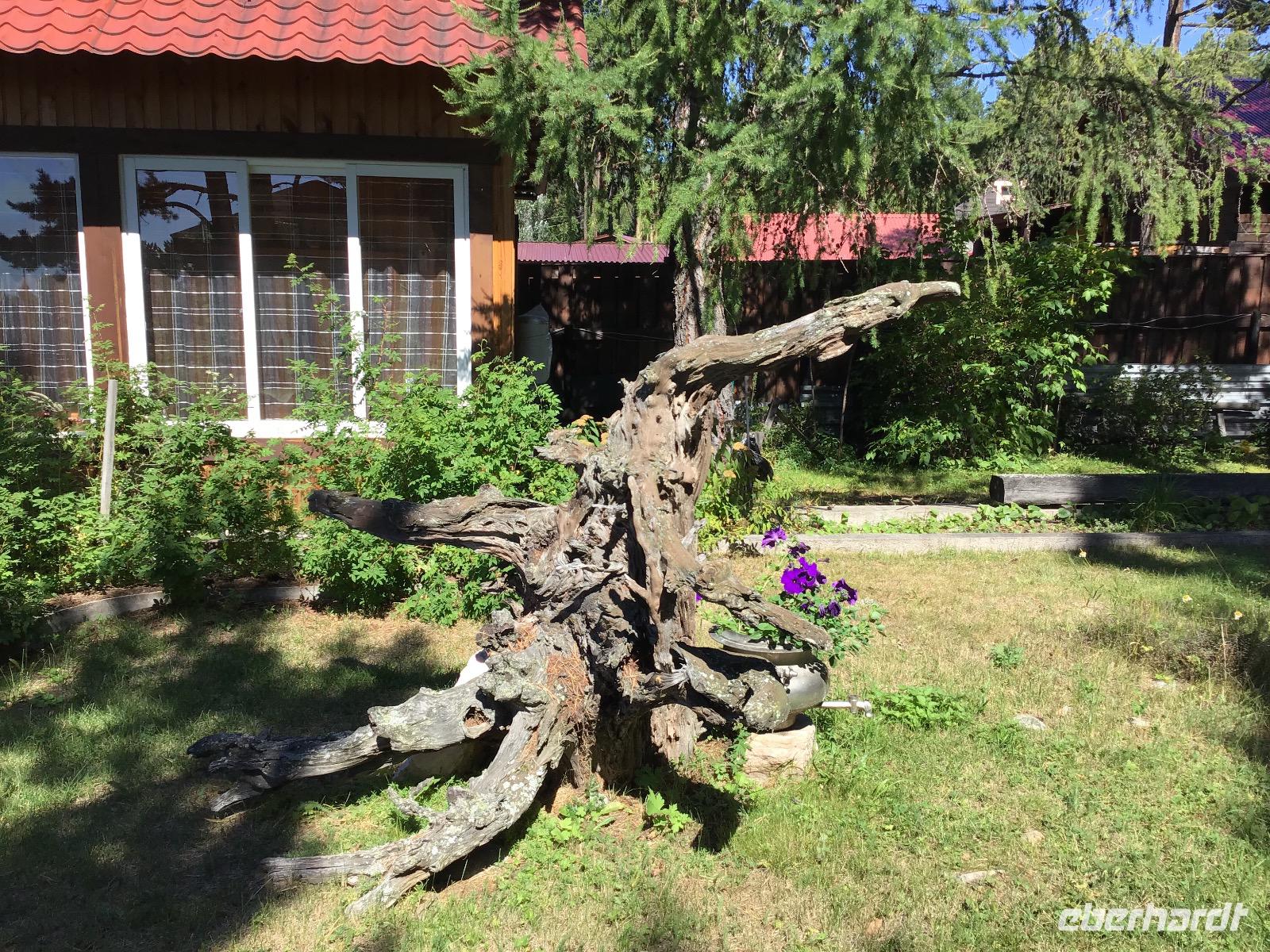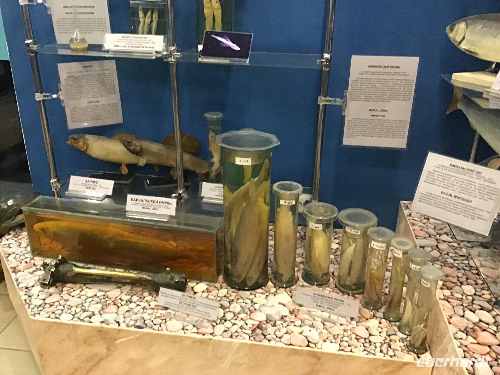 Zu Fuß geht es zur Anlegestelle unseres Bootes, die sich direkt vor unserem Hotel befindet. Bei schönstem Sonnenschein schippern wir über den Baikal und erfreuen uns am Glitzern des reinen Wassers. Von den tausenden Braunbären, die in der Region leben, lässt sich leider kein Einziger blicken. An den Ufern ragen Berge steil in die Höhe. Ab und zu sind Wanderer oder Zelte zu sehen. Nach einer Stunde erreichen wir Bolschije Koty. Ein kleiner Spaziergang führt uns zum Haus von Tatjana, bei der wir heute zum Mittagessen eingeladen sind. Noch aber ist es Zeit und deshalb unternehmen wir noch einen kleinen Ausflug in die Umgebung. Einige von uns wollen auf einen Aussichtspunkt klettern, die anderen bleiben am Boden und spazieren durch den Birkenwald. Zum Mittagessen treffen wir uns alle wieder bei Tatjana. Der Tisch ist reich gedeckt. Als Vorspeise gibt es einen Salat aus Farne und eingelegten Omul. Außerdem saure Gurken und Gemüse. Weiterhin steht eine Schüssel mit leckerem Bortscht auf dem Tisch. Als Hauptgericht gibt es Hühnchen und Kartoffeln. Zum Nachtisch selbstgemachten Apfel- und Früchtekuchen. Der Abschied von Tatjana ist herzlich. Noch einmal fahren wir mit dem Boot über den Baikal zurück zu unserem Hotel.Tag 15: Sonnabend, 18.08.2018 Am BaikalseeWir können ausschlafen, erst um zehn beginnt unser Programm. Mit dem Minibus fahren wir Richtung Tscherskifelsen. Mit dem Sessellift gelangen wir auf den Berg, von dem aus wir eine traumhafte Sicht auf den Baikal und die Angara haben. Marina erzählt uns die Geschichte von Väterchen Baikal, seiner schönen Tochter Angara und ihrem Geliebten Jennissej. Den Aussichtspunkt müssen wir uns mit vielen asiatischen Touristen teilen. Bevor uns der Lift wieder ins Tal bringt, gönnen wir uns ein Moroshenoje (Eis) oder ein Bierchen oder einen Kaffee. Vom Fuße des Lifts spazieren wir einen Weg hinab, der direkt am BaikaL-Museum endet. Direkt davor: einladende Souvenirstände. Für uns heißt es aber erst einmal: Museumsbesuch. Marina führt uns durch die einzelnen Abteilungen, in denen zunächst die Entstehung der Erde und dann die Entstehung des Baikalsees erläutert wird. In weiteren Abschnitten des Museums lernen wir die Tier-und Pflanzenwelt der Region kennen. Zum Schluss geht es ins Aquarium. Absoluter Höhepunkt sind hier zwei possierliche Robben, die unermüdlich ihre Kreise ziehen. Nachdem wir uns an denen satt gesehen und draußen noch ein paar Souvenire erworben haben, kehren wir zurück zum Hotel. Der Nachmittag steht zur freien Verfügung. Das Wetter ist traumhaft und so bietet es sich an, am Ufer des Baikalsees zum nahe gelegenen Markt zu laufen. Hier steppt heute der russische Bär. Alle und jeder scheinen auf den Beinen zu sein und sich hier zu treffen. Es gibt Dutzende Marktstände, die warmen oder kalt geräucherten Omul anbieten, obwohl es für zwei Jahre verboten ist, Omul zu fangen. Außerdem riecht es nach Schaschlik und frisch gebackenem Brot. Da wir unsere Mahlzeiten an verschiedenen Ständen erwerben, ist es uns nicht möglich, beim Essen zusammen zu sitzen, denn die Pfründe sind hier streng verteilt. Gegessen wird dort wo gekauft wird, basta. Am Abend treffen wir uns ein letztes Ma(h)l, zum gemeinsamen Abendessen im Hotel. Nun heißt es tatsächlich, Abschied nehmen. Mit einem Cocktail in der Hotelbar, von der aus wir einen traumhaften Blick auf den Baikalsee haben, lassen wir den Abend ausklingen.
