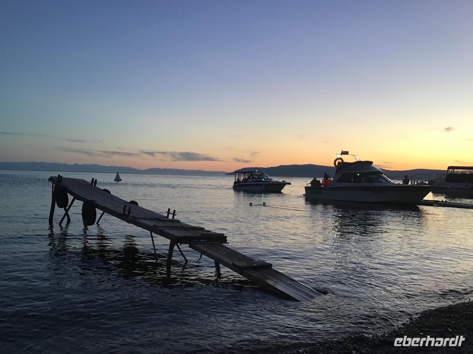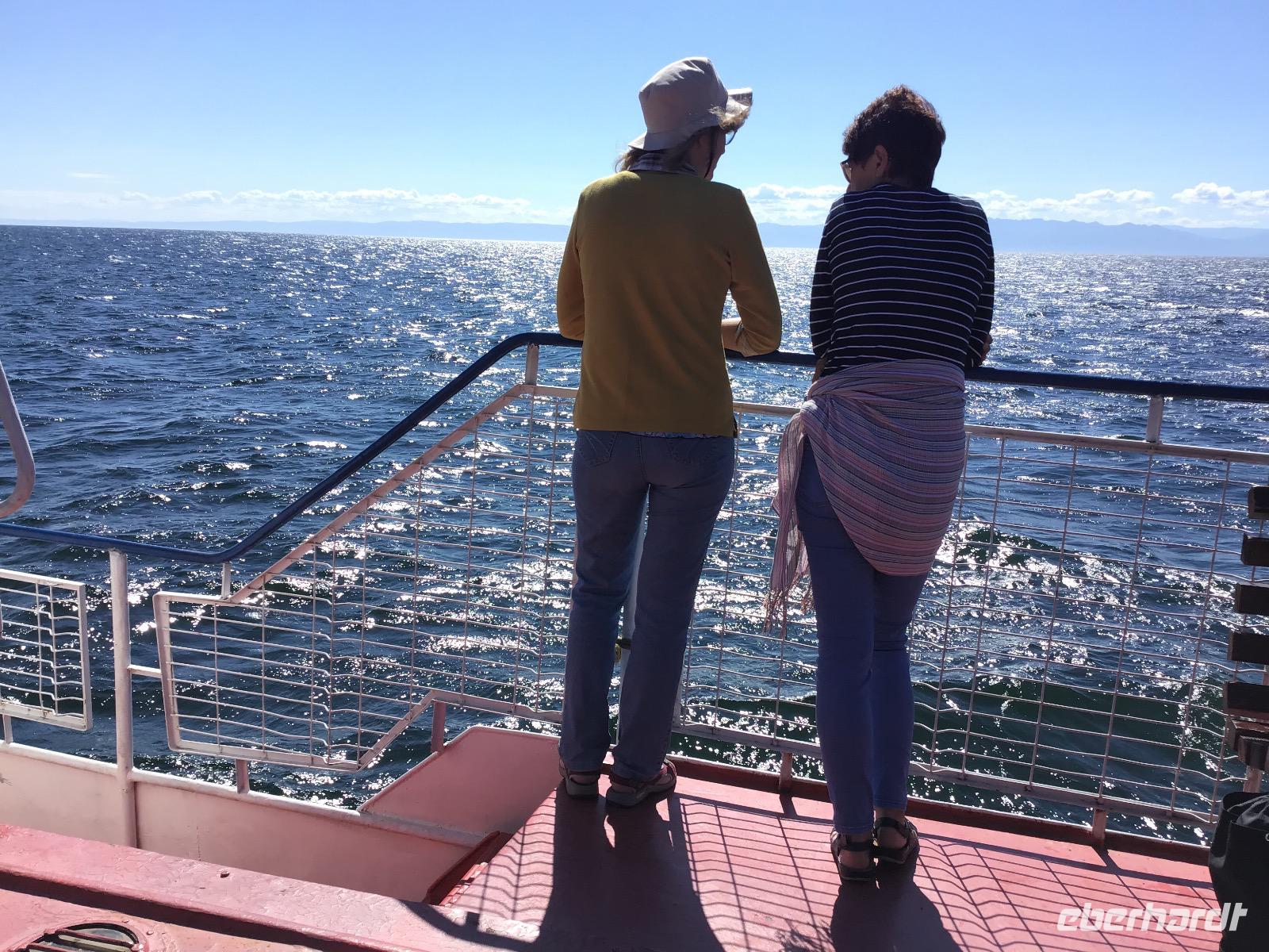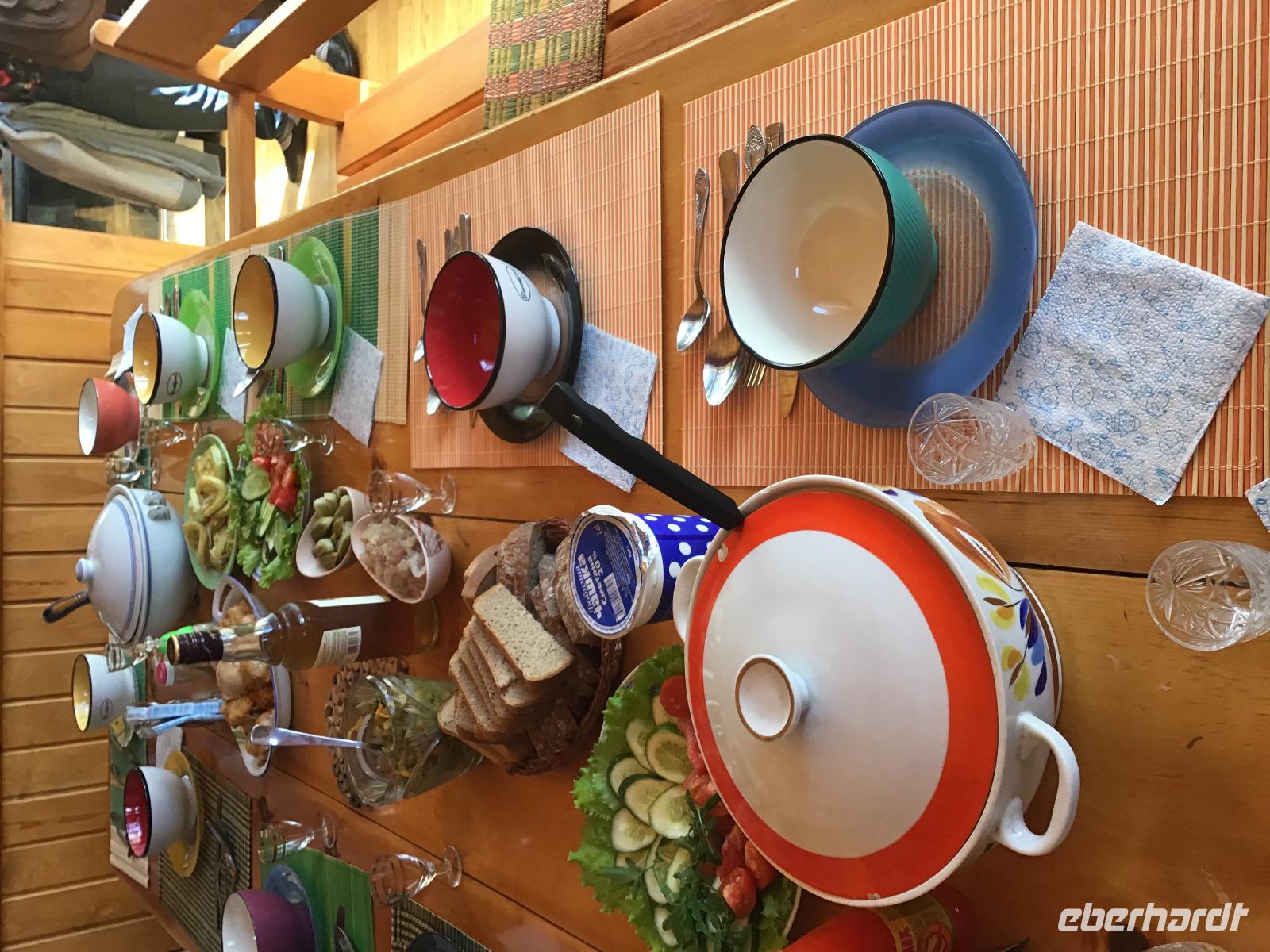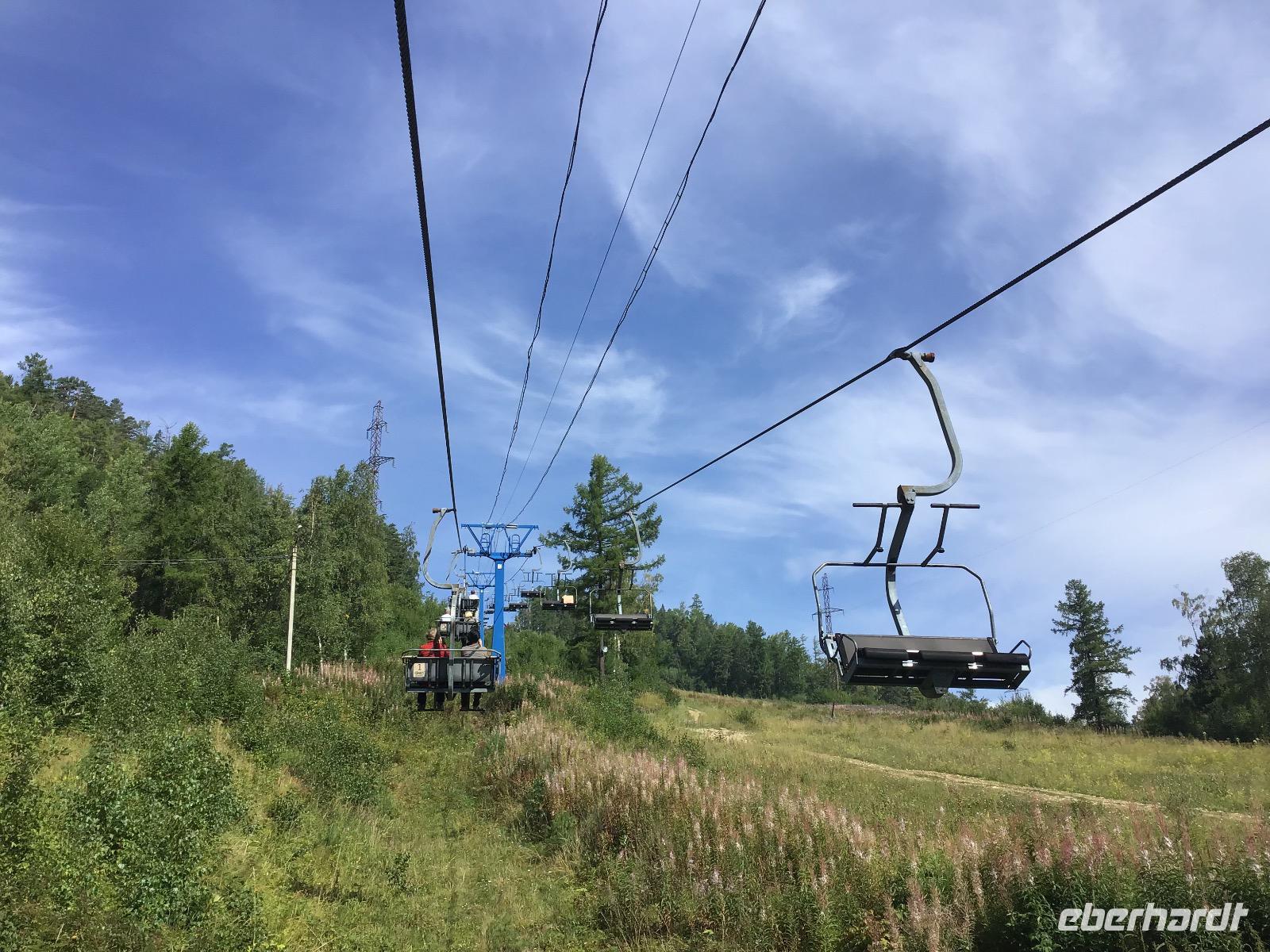 Zu Fuß geht es zur Anlegestelle unseres Bootes, die sich direkt vor unserem Hotel befindet. Bei schönstem Sonnenschein schippern wir über den Baikal und erfreuen uns am Glitzern des reinen Wassers. Von den tausenden Braunbären, die in der Region leben, lässt sich leider kein Einziger blicken. An den Ufern ragen Berge steil in die Höhe. Ab und zu sind Wanderer oder Zelte zu sehen. Nach einer Stunde erreichen wir Bolschije Koty. Ein kleiner Spaziergang führt uns zum Haus von Tatjana, bei der wir heute zum Mittagessen eingeladen sind. Noch aber ist es Zeit und deshalb unternehmen wir noch einen kleinen Ausflug in die Umgebung. Einige von uns wollen auf einen Aussichtspunkt klettern, die anderen bleiben am Boden und spazieren durch den Birkenwald. Zum Mittagessen treffen wir uns alle wieder bei Tatjana. Der Tisch ist reich gedeckt. Als Vorspeise gibt es einen Salat aus Farne und eingelegten Omul. Außerdem saure Gurken und Gemüse. Weiterhin steht eine Schüssel mit leckerem Bortscht auf dem Tisch. Als Hauptgericht gibt es Hühnchen und Kartoffeln. Zum Nachtisch selbstgemachten Apfel- und Früchtekuchen. Der Abschied von Tatjana ist herzlich. Noch einmal fahren wir mit dem Boot über den Baikal zurück zu unserem Hotel.Tag 15: Sonnabend, 18.08.2018 Am BaikalseeWir können ausschlafen, erst um zehn beginnt unser Programm. Mit dem Minibus fahren wir Richtung Tscherskifelsen. Mit dem Sessellift gelangen wir auf den Berg, von dem aus wir eine traumhafte Sicht auf den Baikal und die Angara haben. Marina erzählt uns die Geschichte von Väterchen Baikal, seiner schönen Tochter Angara und ihrem Geliebten Jennissej. Den Aussichtspunkt müssen wir uns mit vielen asiatischen Touristen teilen. Bevor uns der Lift wieder ins Tal bringt, gönnen wir uns ein Moroshenoje (Eis) oder ein Bierchen oder einen Kaffee. Vom Fuße des Lifts spazieren wir einen Weg hinab, der direkt am BaikaL-Museum endet. Direkt davor: einladende Souvenirstände. Für uns heißt es aber erst einmal: Museumsbesuch. Marina führt uns durch die einzelnen Abteilungen, in denen zunächst die Entstehung der Erde und dann die Entstehung des Baikalsees erläutert wird. In weiteren Abschnitten des Museums lernen wir die Tier-und Pflanzenwelt der Region kennen. Zum Schluss geht es ins Aquarium. Absoluter Höhepunkt sind hier zwei possierliche Robben, die unermüdlich ihre Kreise ziehen. Nachdem wir uns an denen satt gesehen und draußen noch ein paar Souvenire erworben haben, kehren wir zurück zum Hotel. Der Nachmittag steht zur freien Verfügung. Das Wetter ist traumhaft und so bietet es sich an, am Ufer des Baikalsees zum nahe gelegenen Markt zu laufen. Hier steppt heute der russische Bär. Alle und jeder scheinen auf den Beinen zu sein und sich hier zu treffen. Es gibt Dutzende Marktstände, die warmen oder kalt geräucherten Omul anbieten, obwohl es für zwei Jahre verboten ist, Omul zu fangen. Außerdem riecht es nach Schaschlik und frisch gebackenem Brot. Da wir unsere Mahlzeiten an verschiedenen Ständen erwerben, ist es uns nicht möglich, beim Essen zusammen zu sitzen, denn die Pfründe sind hier streng verteilt. Gegessen wird dort wo gekauft wird, basta. Am Abend treffen wir uns ein letztes Ma(h)l, zum gemeinsamen Abendessen im Hotel. Nun heißt es tatsächlich, Abschied nehmen. Mit einem Cocktail in der Hotelbar, von der aus wir einen traumhaften Blick auf den Baikalsee haben, lassen wir den Abend ausklingen.