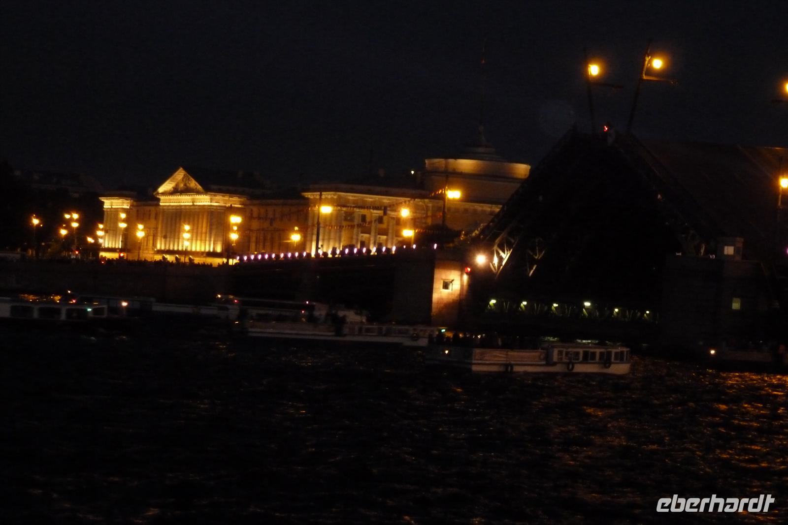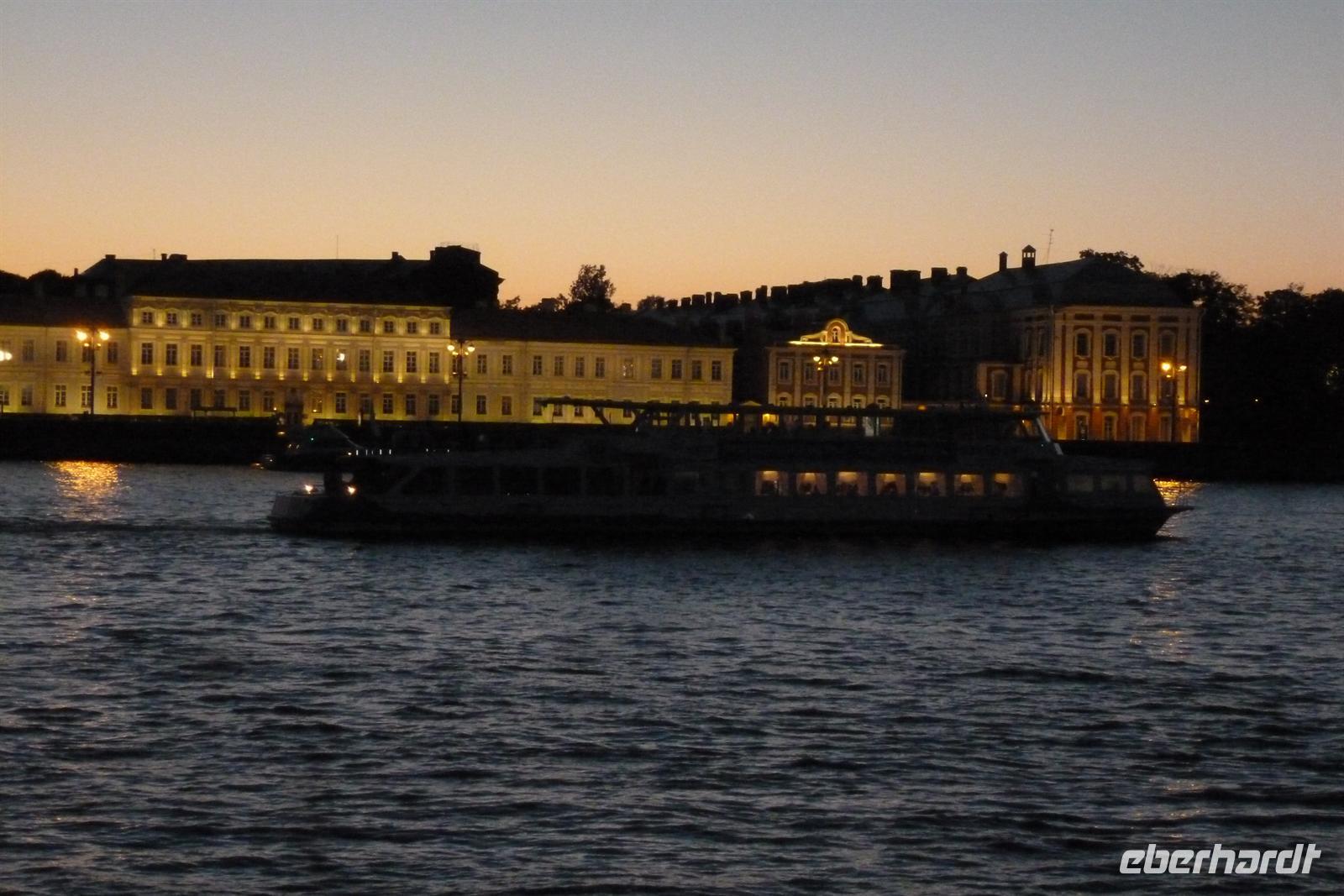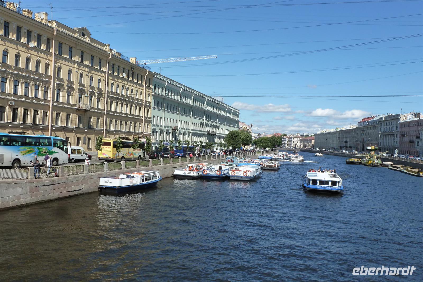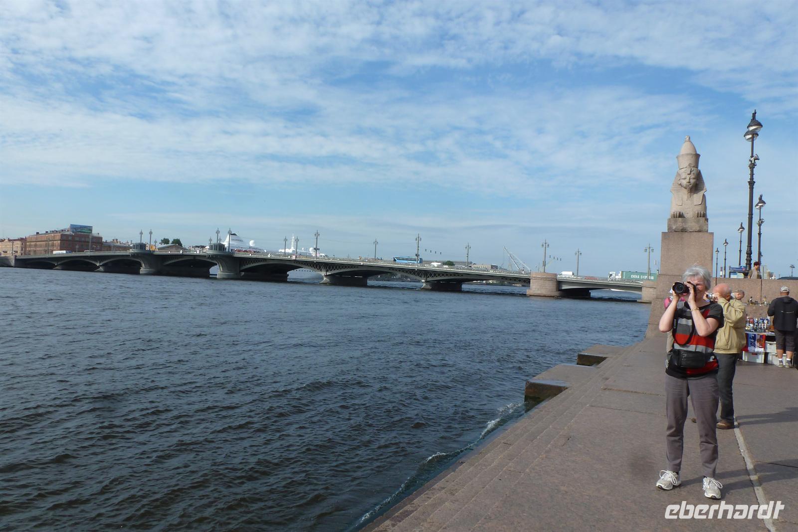 Kunstgegenstände und Mobiliar im scheinbaren Überfluß.Für diejenigen, die noch immer voller Tatendrang sind, bietet Natalia nach einer kurzen Mittagspause einen Rundgang durch die Kollektion französischer Meisterwerke an. Zur Sammlung gehören Gemälde von Monet, Renoir, Gauguin und vieler anderer Meister. Mit 37 Bildern besitzt die Eremitage zudem die größte Matisse-Sammlung außerhalb Frankreichs. Einfach beeindruckend. Treffpunkt Alexandersäule: Katharina und der russische Zar in hübschen historischen Kostümen wirbeln über den Platz, ständig Ausschau haltend nach zahlenden Motivjägern. Wir hingegen bewegen uns Richtung Schiffsablegestelle und durchqueren auf dem Wasserweg ineinander verschlungene Kanäle. Nicht umsonst trägt St. Petersburg auch den Namen "Venedig des Nordens". Das Wetter macht uns gottseidank keinen Strich durch die Rechnung. Wir lassen die Seele baumeln und genießen, wie Brücken und Paläste an uns vorüberziehen.