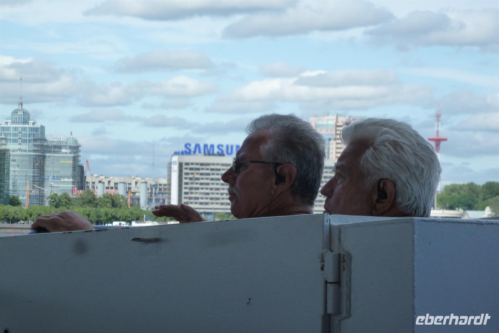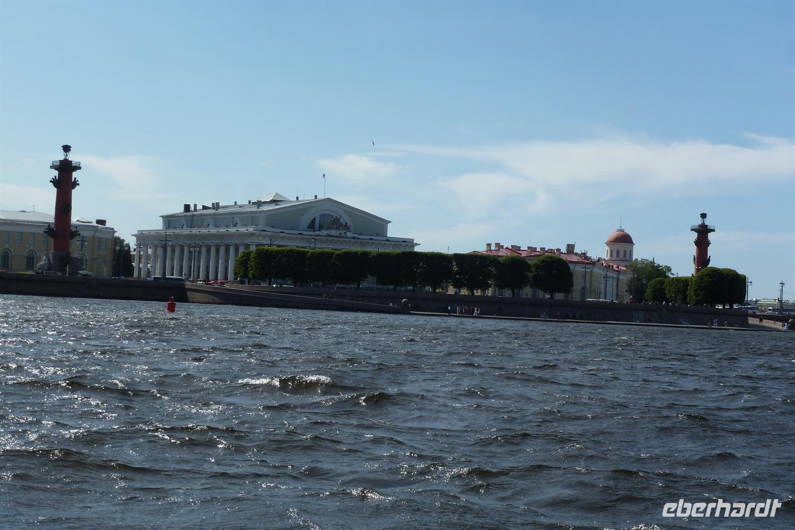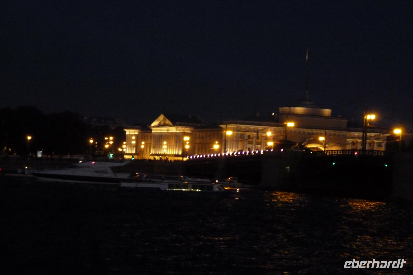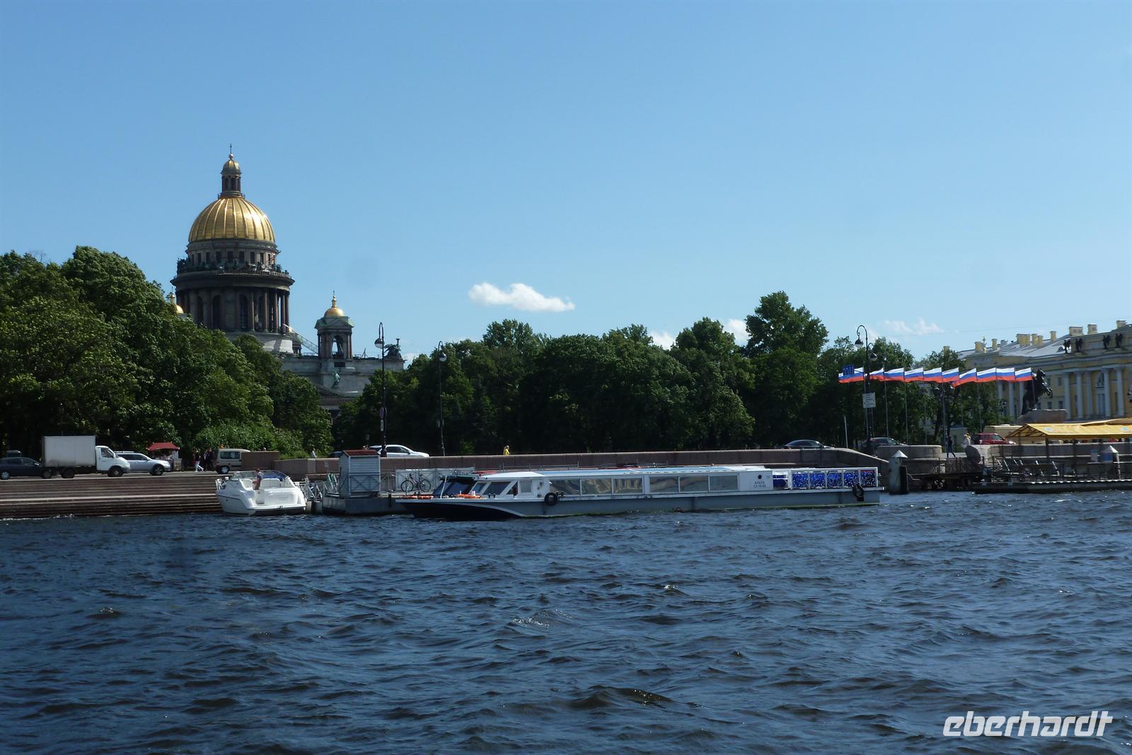 Kunstgegenstände und Mobiliar im scheinbaren Überfluß.Für diejenigen, die noch immer voller Tatendrang sind, bietet Natalia nach einer kurzen Mittagspause einen Rundgang durch die Kollektion französischer Meisterwerke an. Zur Sammlung gehören Gemälde von Monet, Renoir, Gauguin und vieler anderer Meister. Mit 37 Bildern besitzt die Eremitage zudem die größte Matisse-Sammlung außerhalb Frankreichs. Einfach beeindruckend. Treffpunkt Alexandersäule: Katharina und der russische Zar in hübschen historischen Kostümen wirbeln über den Platz, ständig Ausschau haltend nach zahlenden Motivjägern. Wir hingegen bewegen uns Richtung Schiffsablegestelle und durchqueren auf dem Wasserweg ineinander verschlungene Kanäle. Nicht umsonst trägt St. Petersburg auch den Namen "Venedig des Nordens". Das Wetter macht uns gottseidank keinen Strich durch die Rechnung. Wir lassen die Seele baumeln und genießen, wie Brücken und Paläste an uns vorüberziehen.