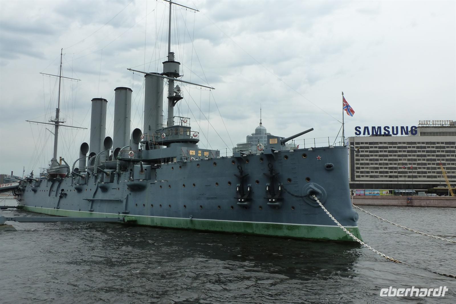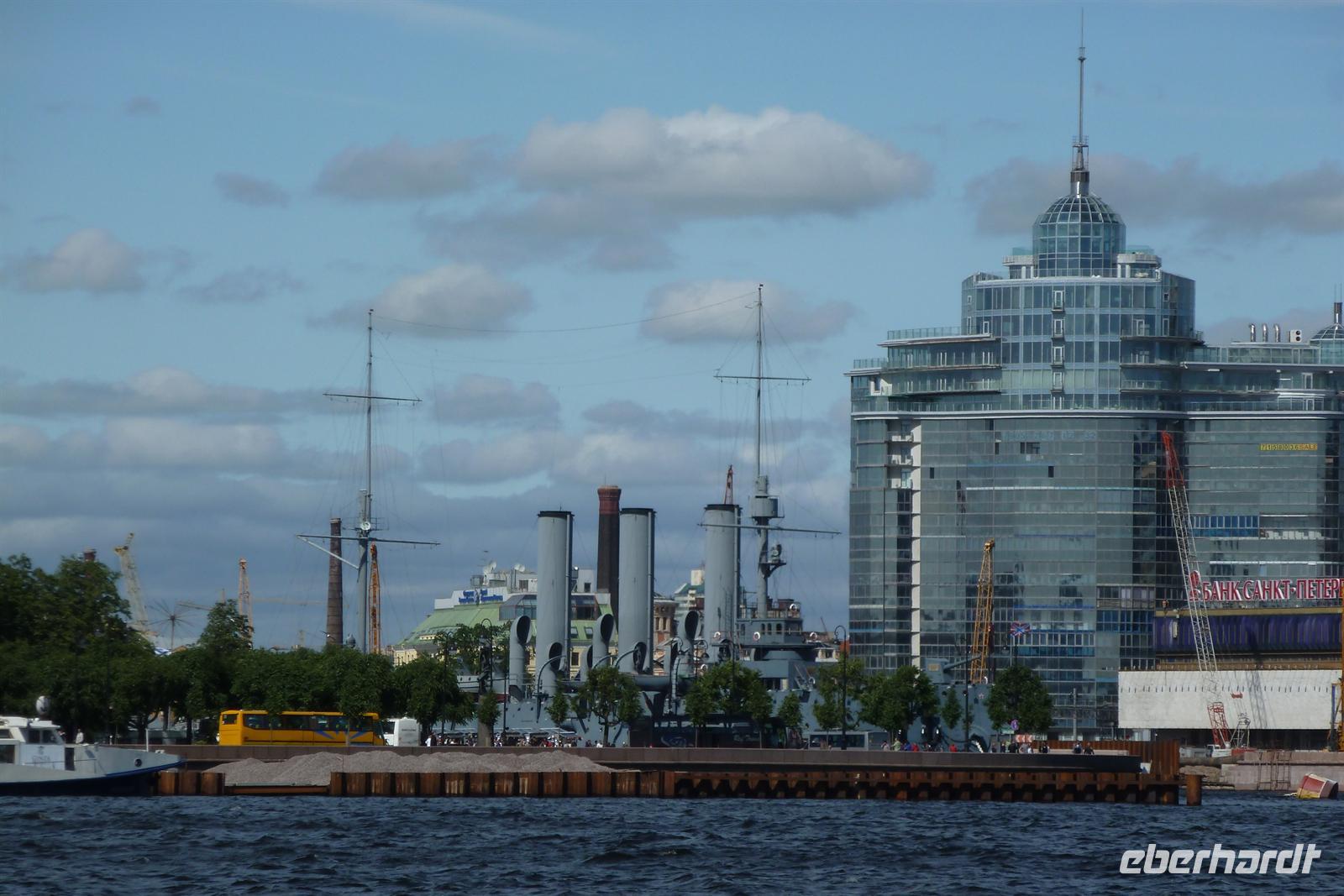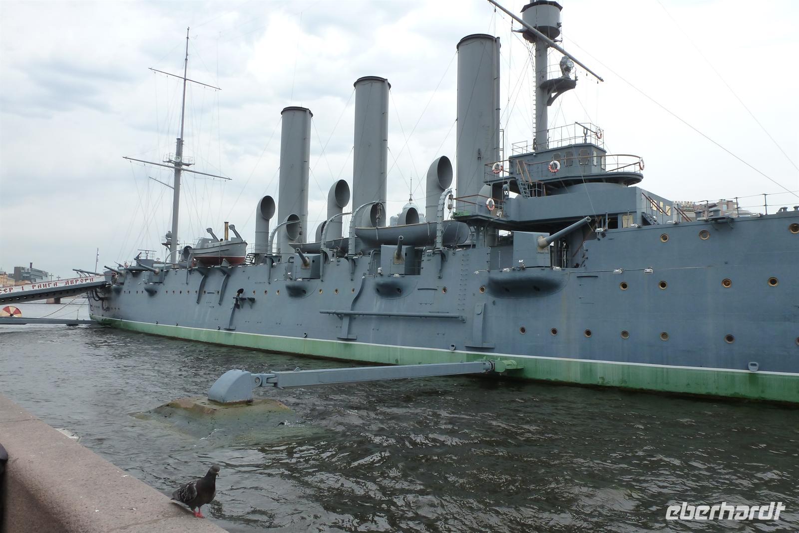 Nach einem köstlichen Frühstück erwartete uns Natalia 10 Uhr im Foyer. Zusammen mit unserem Fahrer Alex starteten wir pünktlich mit unserer erkundenden Stadtrundfahrt durch die prunkvolle Zarenstadt. Unser Weg führte uns zunächst entlang des Messegeländes und Bolschoi-Prospekts in Richtung der Akademie der Künste, der ältesten Kunstakademie Russlands. Erste schöne Aufnahmen schossen wir am östlichen Zipfel der Wassiljewski-Insel. Von dort genossen wir einen herrlichen Blick auf den Winterpalast und die Peter-und Paul-Festung. Anschließend passierten wir das Marinemuseum und das ehemalige Waffenarsenal der Stadt, ehe wir den berühmten Gegenstand eines jeden Geschichtsunterrichts aus DDR-Zeiten erreichten: den Kreuzer Aurora. Über die Freiheitsbrücke hinweg, entlang der Konzerthalle und des als „Kreuz“ bezeichneten Gefängnisses erreichten wir den Leninplatz mit dem finnischen Bahnhof. Von dieser Station ausgehend starten zahlreiche Zugverbindungen in Richtung Helsinki. Über den berühmten Newski Prospekt mit seinen zahllosen Boutiquen, Kneipen, Restaurants und dem größten Kaufhaus der Stadt erreichten wir am frühen Nachmittag die Peter- und Paul-Festung.