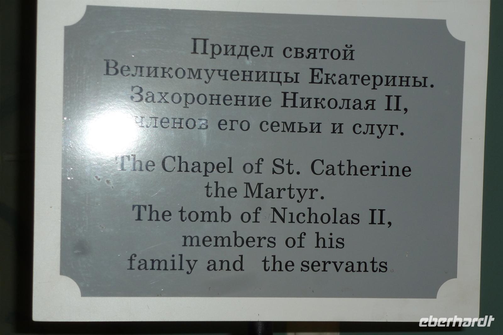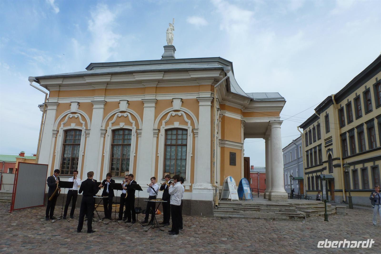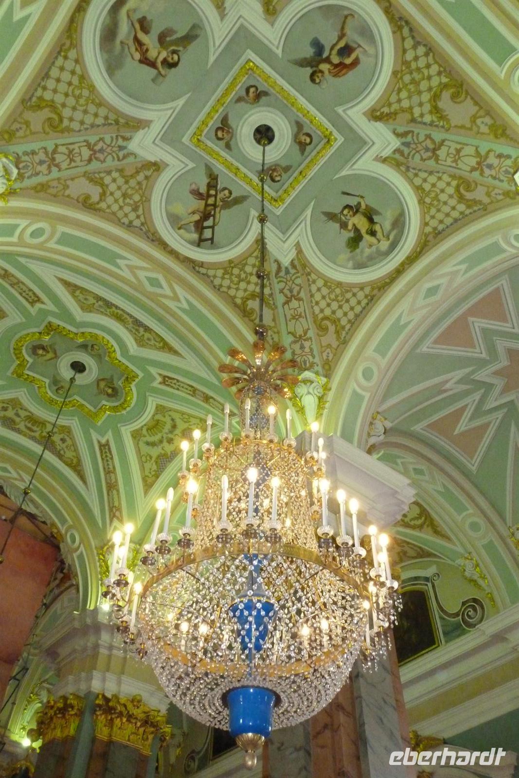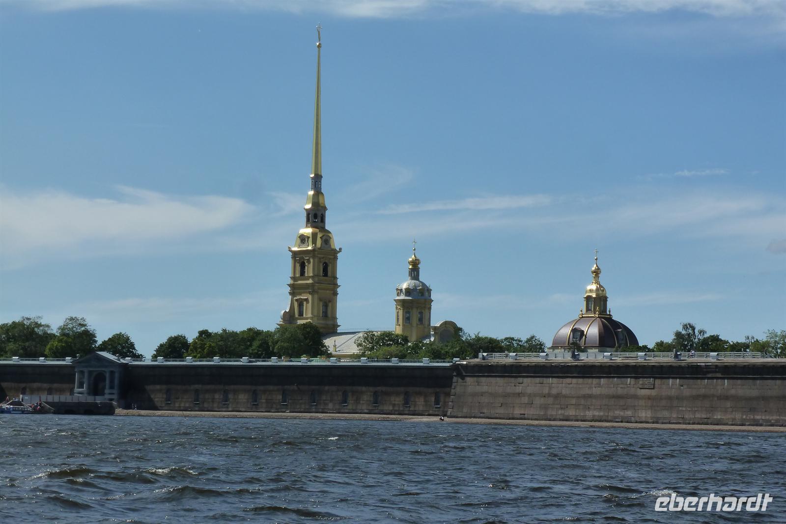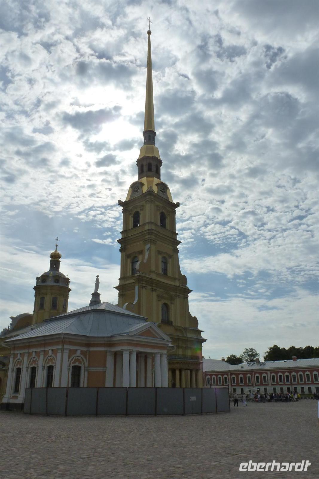 Mächtig erhebt sich die Peter-und-Paul-Kathedrale vor uns, deren goldene schlanke Turmnadel zum Wahrzeichen der Stadt wurde. Die Kathedrale selbst ist die Grablege der Zarenfamilie Romanow und in der Katharinenkapelle ganz in der Nähe des Haupteingangs wurde 1998 in einer feierlichen Zeremonie die Familie des Zaren Nikolaus II.beigesetzt.