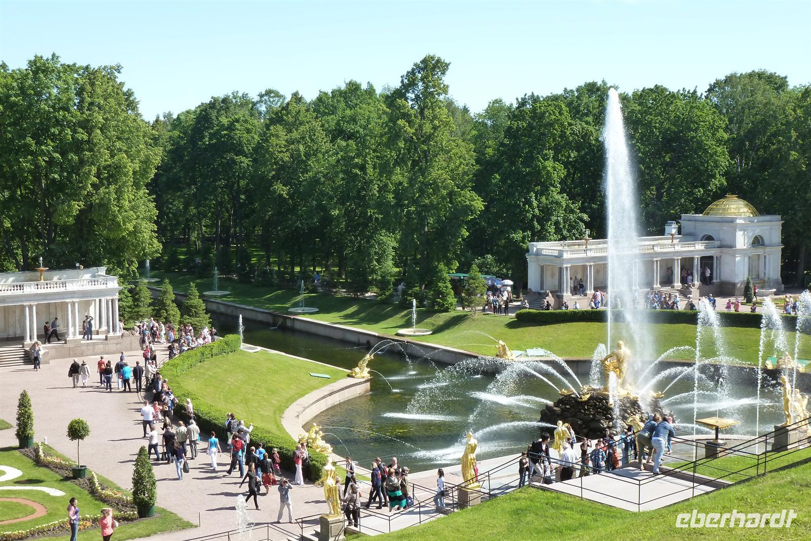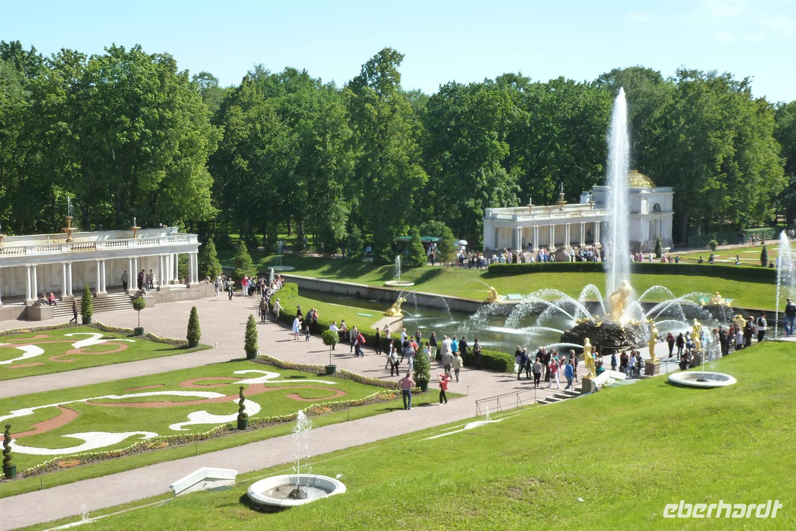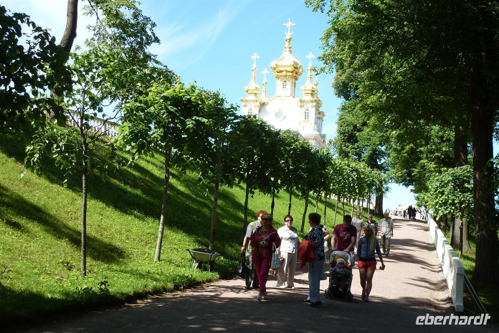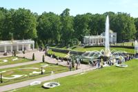 Nach einer erneuten hellen Nacht fuhren wir 9:30 Uhr bei herrlichem Sonnenschein vom Hotel in Richtung Peterhof. Unsere Fahrt führte entlang des Bolschoi Prospekt, des Handelshafens und Umleitungskanals, der früheren künstlich angelegten Stadtgrenze an den Rand der Stadt. Auf diesem Weg sahen wir außerdem das erste Kulturpalais der Stadt, das im Jahr 1927 erbaut und nach dem russischen Schriftsteller Maxim Gorki benannt wurde. Nachdem man die Innenstadt hinter sich gelassen hat, folgen großräumige Außenbezirke mit zahlreichen Wohnblocks. Angesichts eines durchschnittlichen Monatsgehalts in Höhe von 25.000 Rubel wohnen tausende Menschen in den günstigeren Wohnungen der Vorstädte. Ein Teil dieses Außenbezirks wird von Chinesen gepachtet und trägt den Namen „Baltische Perle“ oder umgangssprachlich auch „Chinatown“. Man kann angesiedelte Bauunternehmen erkennen, die sich direkt am grünen Gürtel von St. Petersburg niedergelassen haben. Entlang der „Roten Straße“ erreichten wir bald das Konstantinpalais, in welchem Russlands Regierung Galatreffen und Gremien abhält. Auch der Peterhof dient dem Präsidenten Medwedjew, sowie Putin und Co. als Lokalität offizieller Empfänge und Zusammentreffen. Das gesamte Städtchen Peterhof steht heute unter dem Schutz der UNESCO und wir kamen wenig später in den Genuss, uns von dem wertvollen kulturellen Reichtum zu überzeugen.