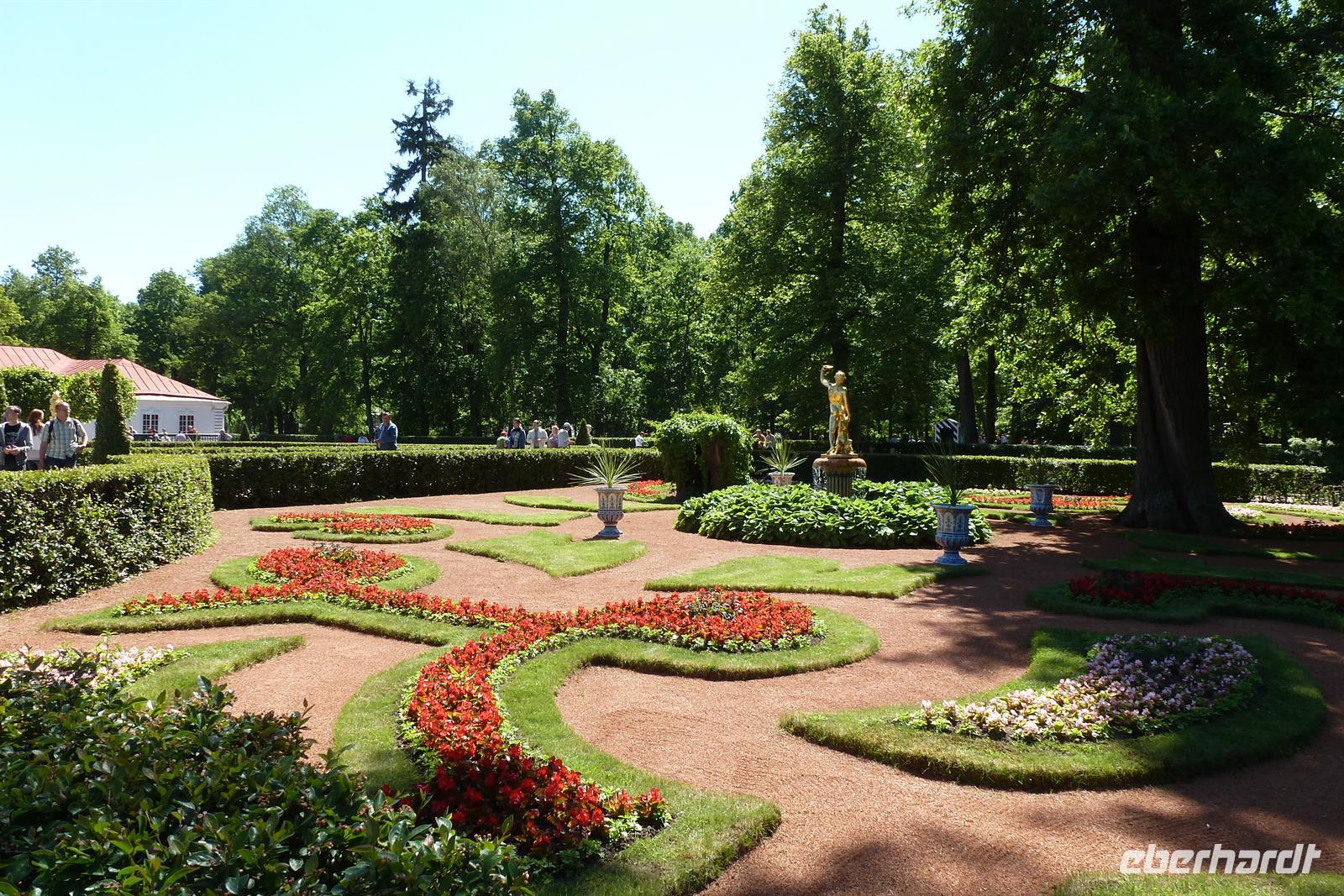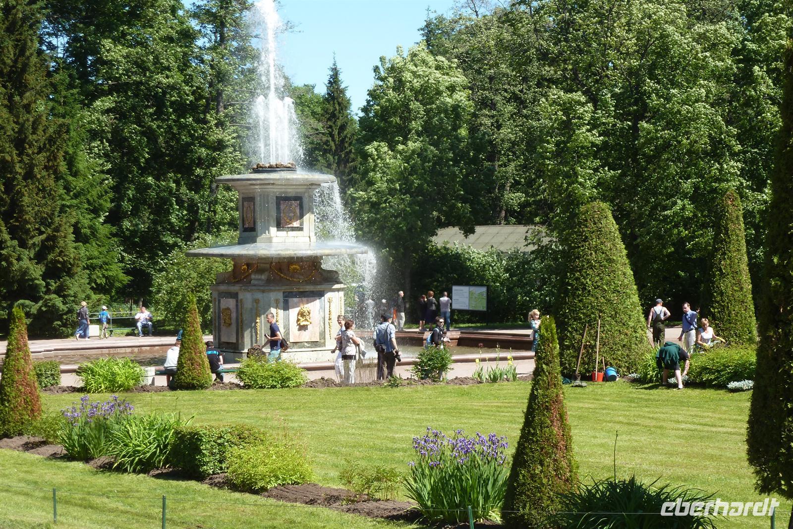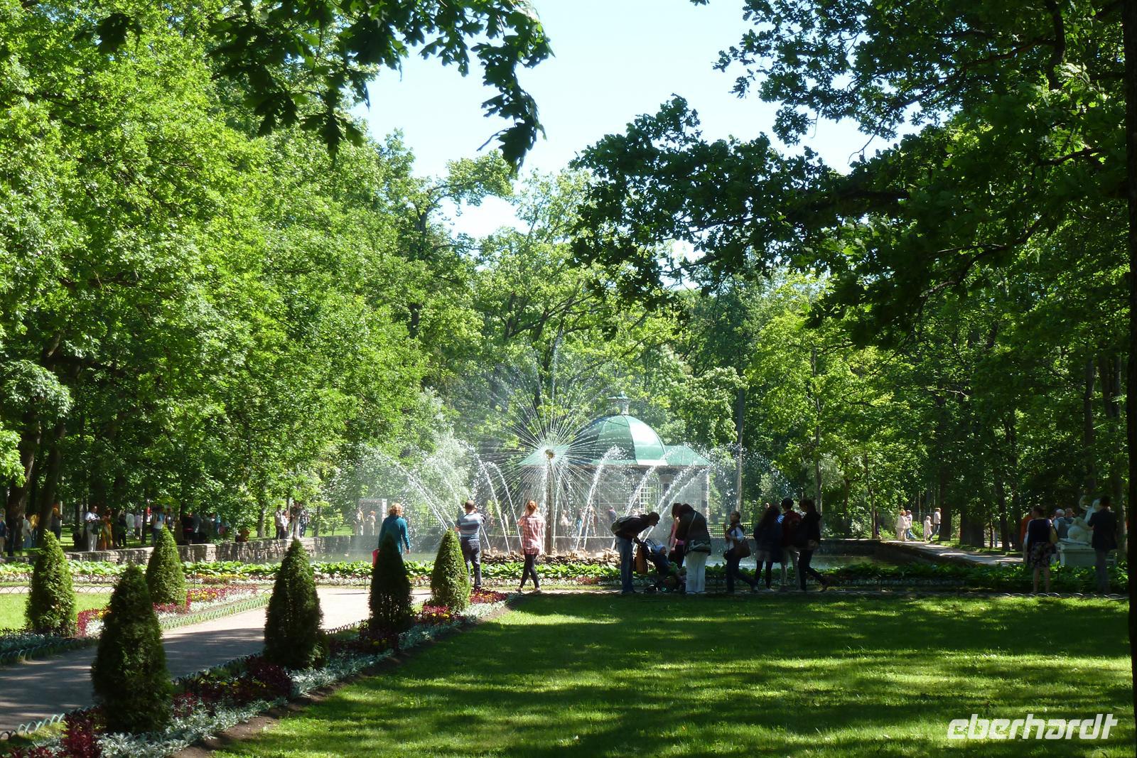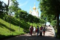 Nach einer erneuten hellen Nacht fuhren wir 9:30 Uhr bei herrlichem Sonnenschein vom Hotel in Richtung Peterhof. Unsere Fahrt führte entlang des Bolschoi Prospekt, des Handelshafens und Umleitungskanals, der früheren künstlich angelegten Stadtgrenze an den Rand der Stadt. Auf diesem Weg sahen wir außerdem das erste Kulturpalais der Stadt, das im Jahr 1927 erbaut und nach dem russischen Schriftsteller Maxim Gorki benannt wurde. Nachdem man die Innenstadt hinter sich gelassen hat, folgen großräumige Außenbezirke mit zahlreichen Wohnblocks. Angesichts eines durchschnittlichen Monatsgehalts in Höhe von 25.000 Rubel wohnen tausende Menschen in den günstigeren Wohnungen der Vorstädte. Ein Teil dieses Außenbezirks wird von Chinesen gepachtet und trägt den Namen „Baltische Perle“ oder umgangssprachlich auch „Chinatown“. Man kann angesiedelte Bauunternehmen erkennen, die sich direkt am grünen Gürtel von St. Petersburg niedergelassen haben. Entlang der „Roten Straße“ erreichten wir bald das Konstantinpalais, in welchem Russlands Regierung Galatreffen und Gremien abhält. Auch der Peterhof dient dem Präsidenten Medwedjew, sowie Putin und Co. als Lokalität offizieller Empfänge und Zusammentreffen. Das gesamte Städtchen Peterhof steht heute unter dem Schutz der UNESCO und wir kamen wenig später in den Genuss, uns von dem wertvollen kulturellen Reichtum zu überzeugen.