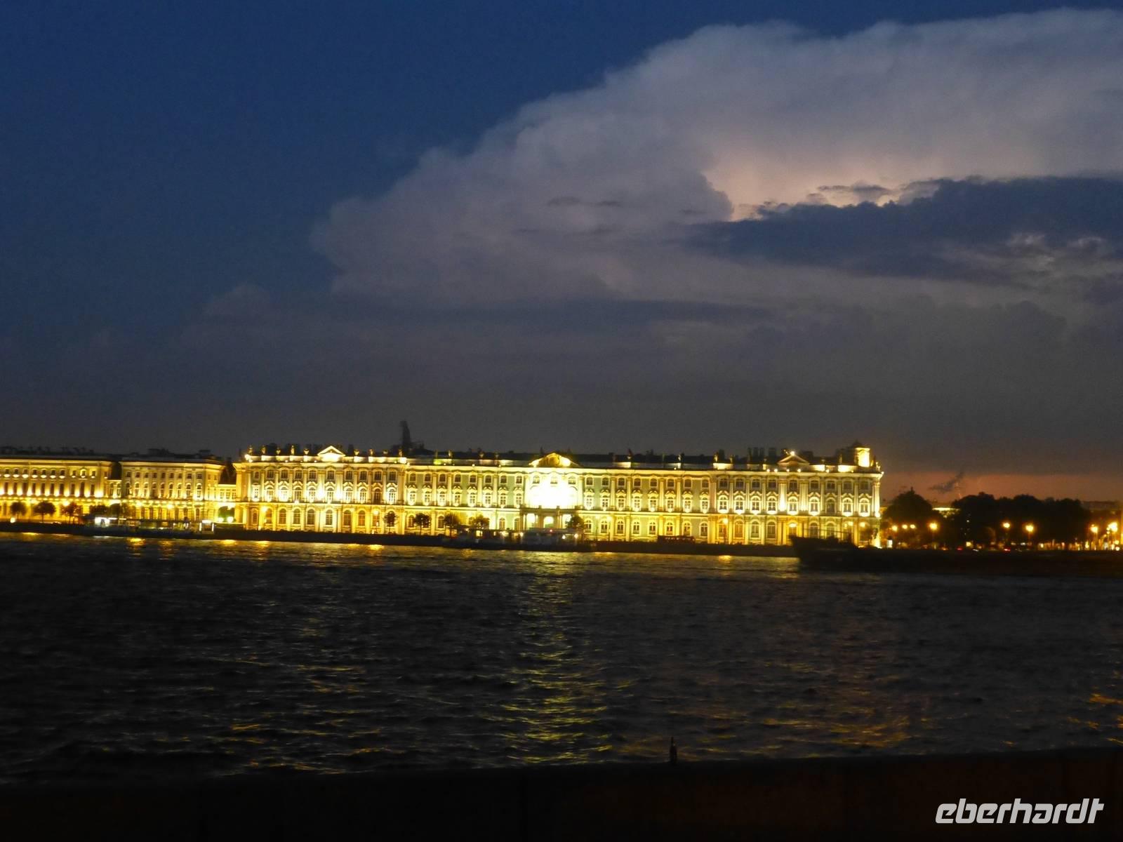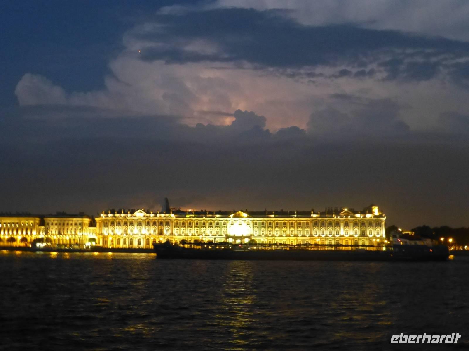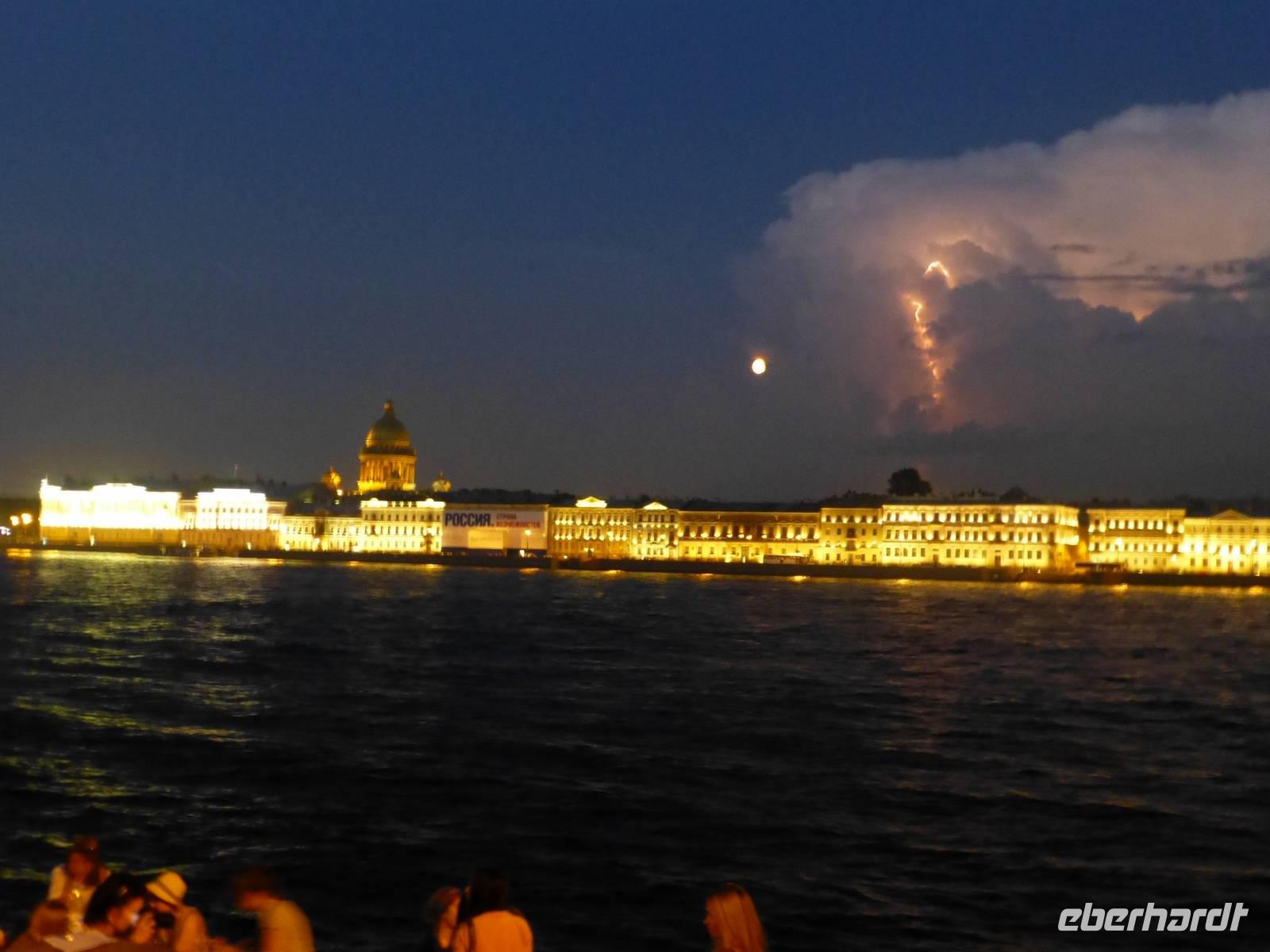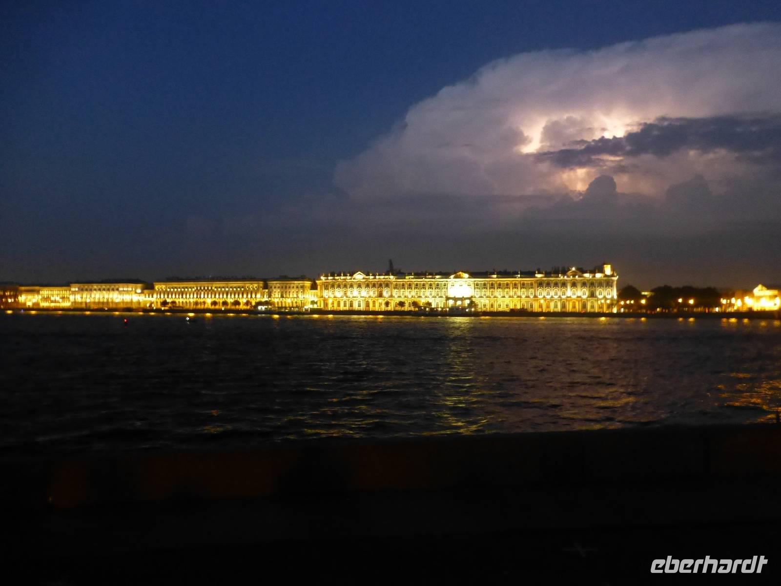Als die Brücke vollständig geöffnet war, fuhren wir noch zur Landspitze der Wassiljewski-Insel um von dort die Öffnung der übrigen Brücken beobachten zu können. Und wie immer in dieser Woche spielte das Wetter mit. Während wir die Schiffe beim Fahren beobachteten, zog der Himmel über der Eremitage zu und ein beeindruckendes Wetterleuchten setzte ein. Natürlich versuchten wir alle sofort, den ein oder anderen Blitz auf Foto festzuhalten (Wer eine Videokamera besaß, hatte natürlich kein Problem).