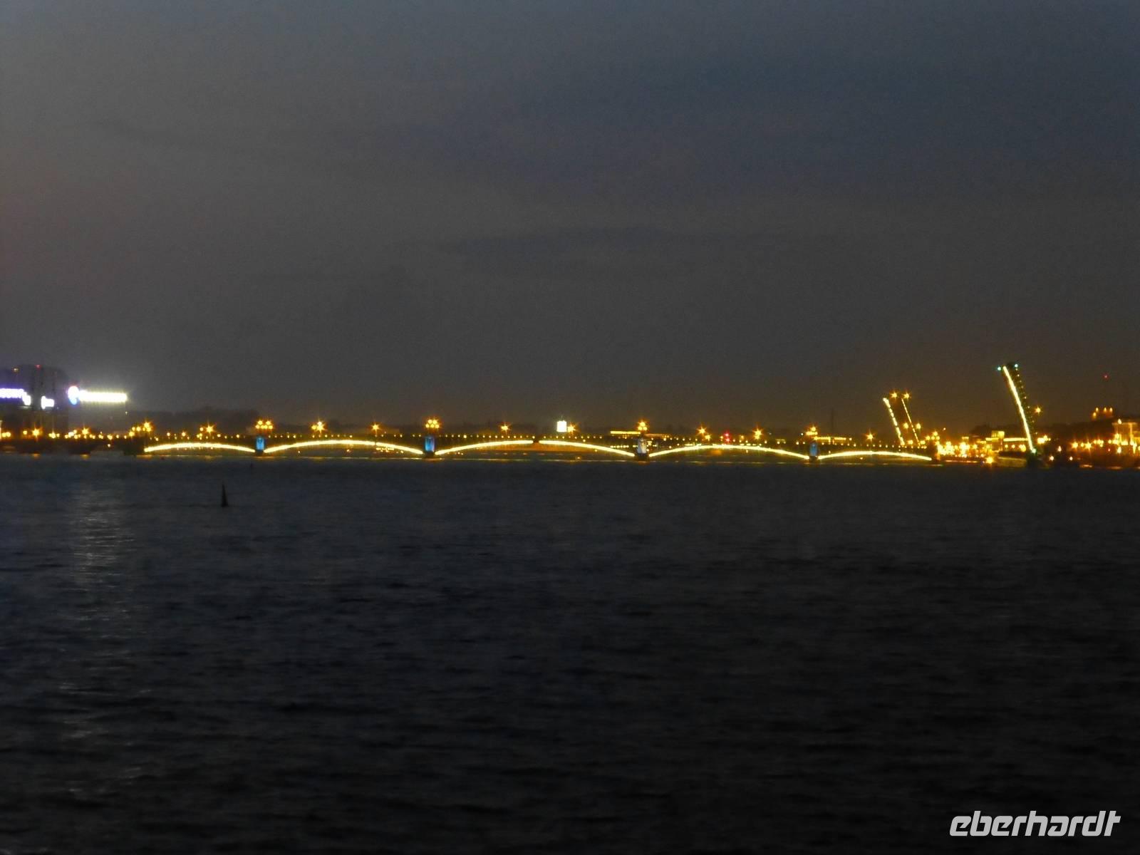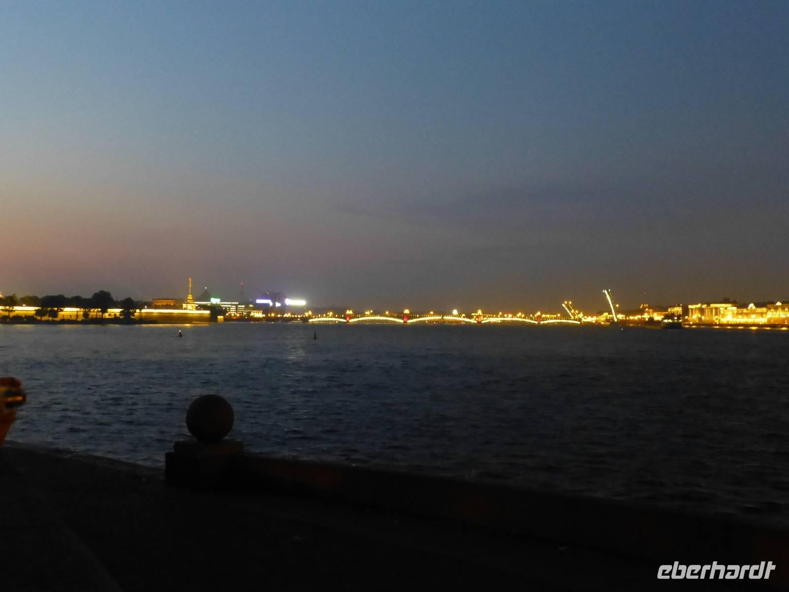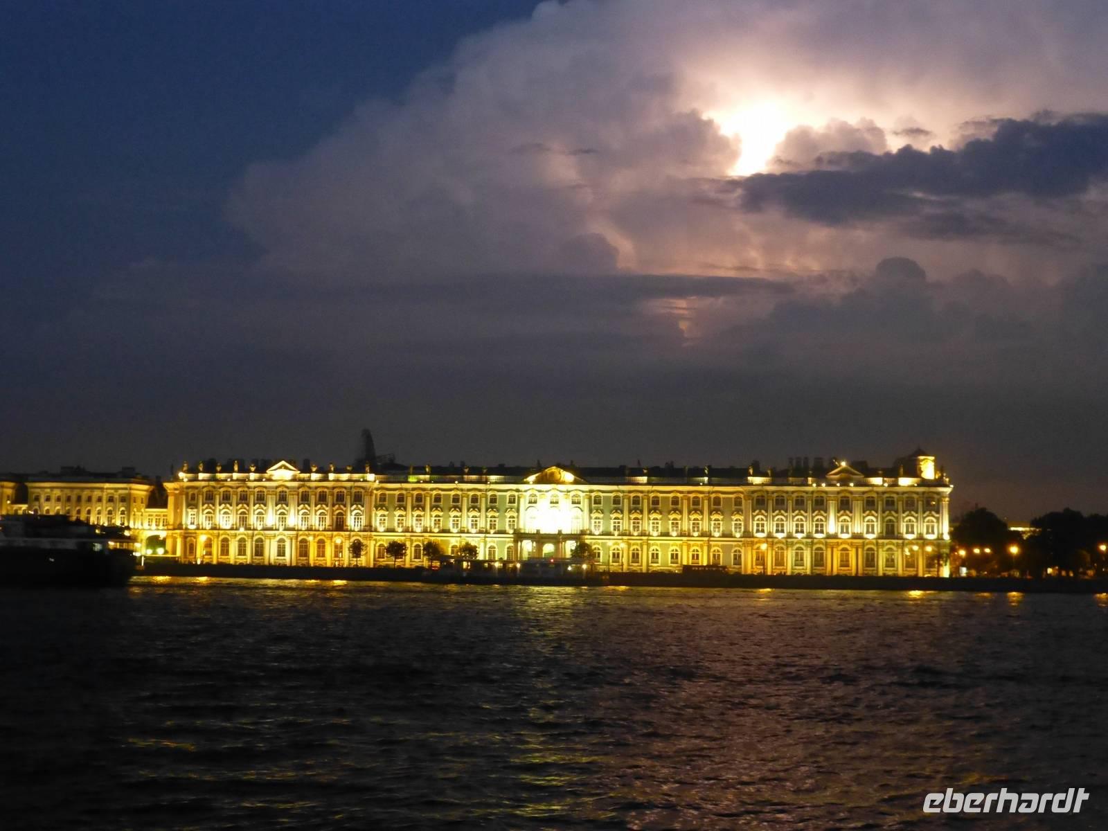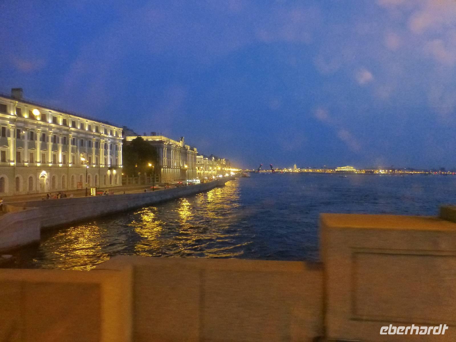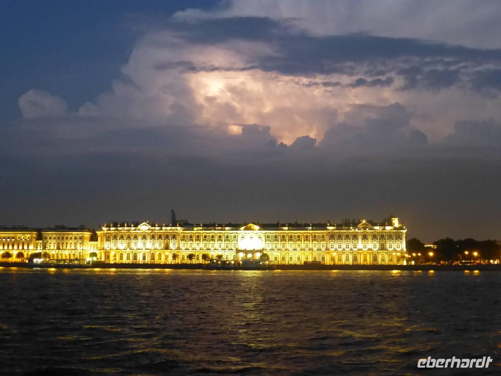 Als die Brücke vollständig geöffnet war, fuhren wir noch zur Landspitze der Wassiljewski-Insel um von dort die Öffnung der übrigen Brücken beobachten zu können. Und wie immer in dieser Woche spielte das Wetter mit. Während wir die Schiffe beim Fahren beobachteten, zog der Himmel über der Eremitage zu und ein beeindruckendes Wetterleuchten setzte ein. Natürlich versuchten wir alle sofort, den ein oder anderen Blitz auf Foto festzuhalten (Wer eine Videokamera besaß, hatte natürlich kein Problem).