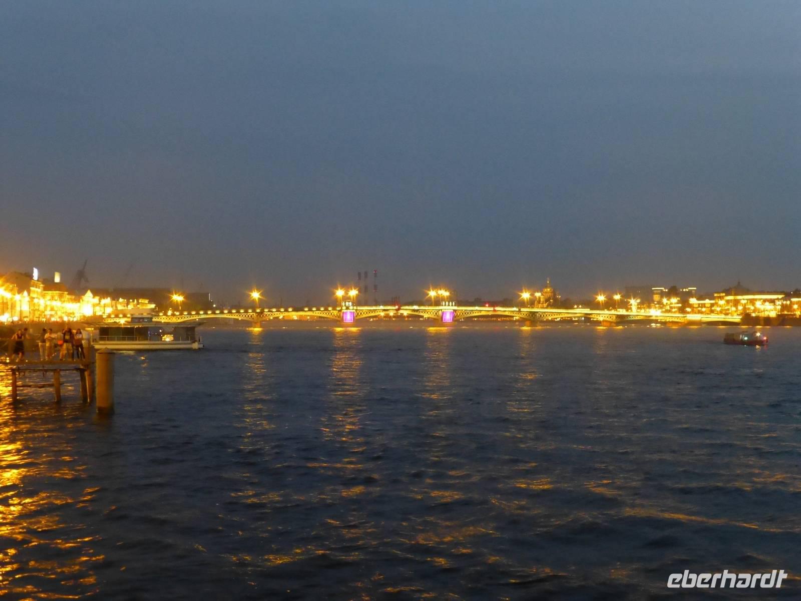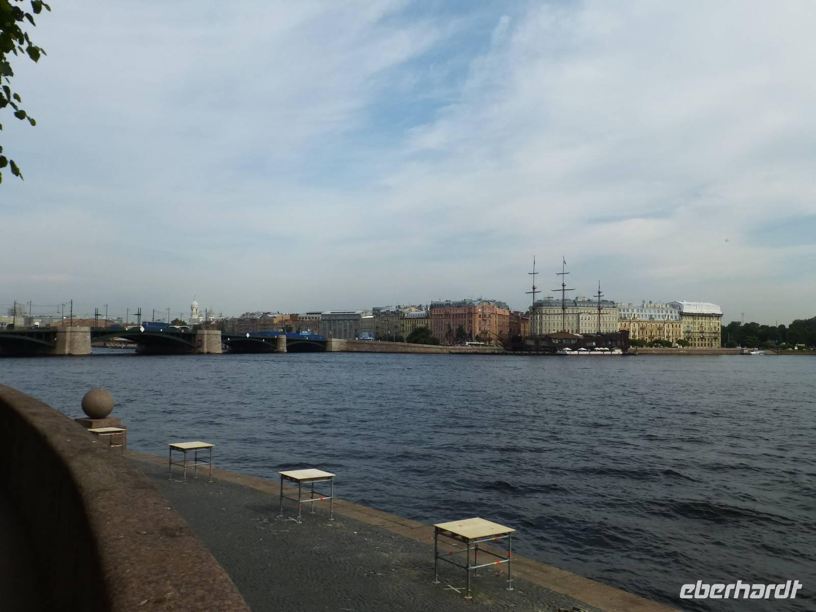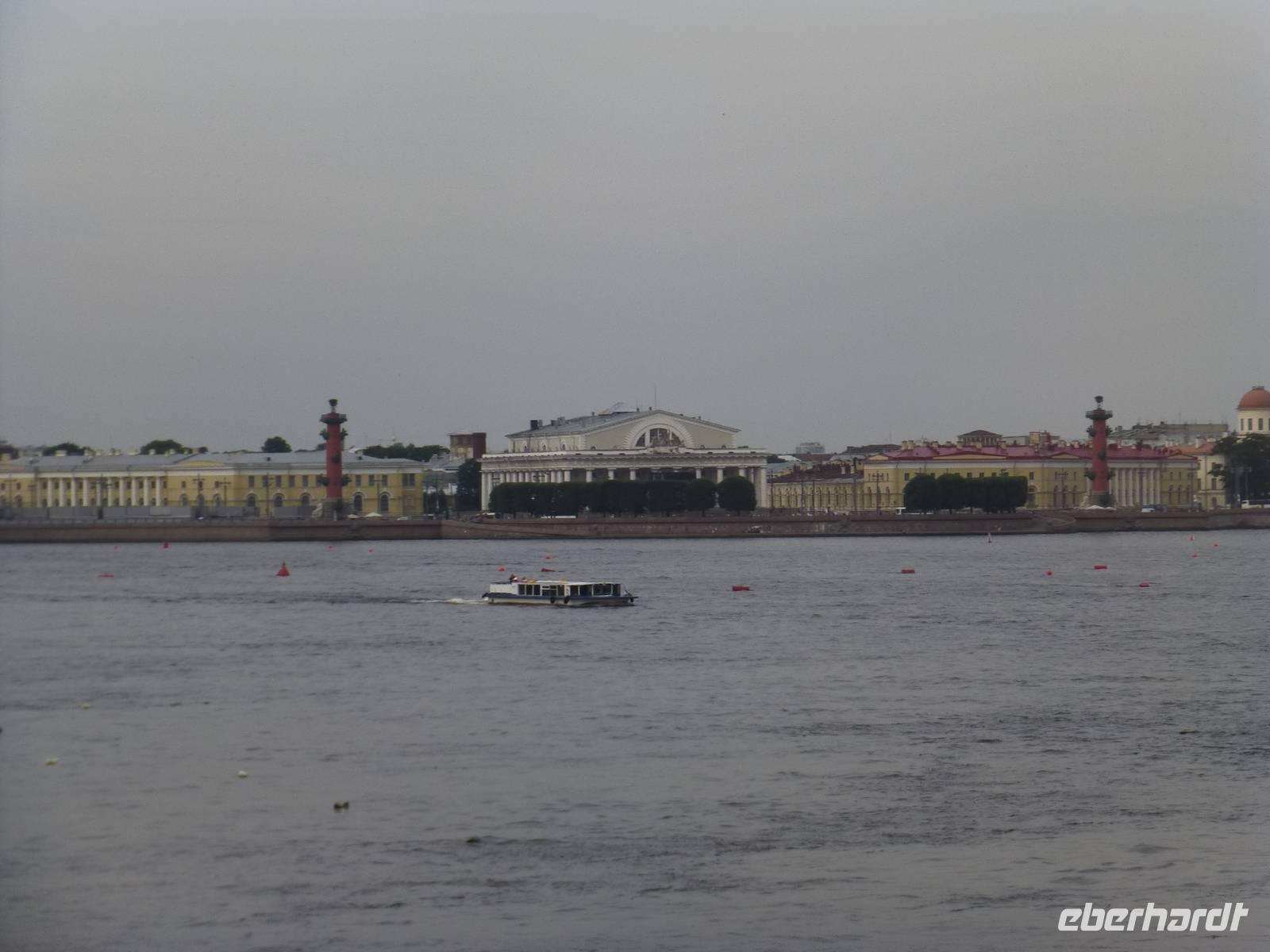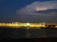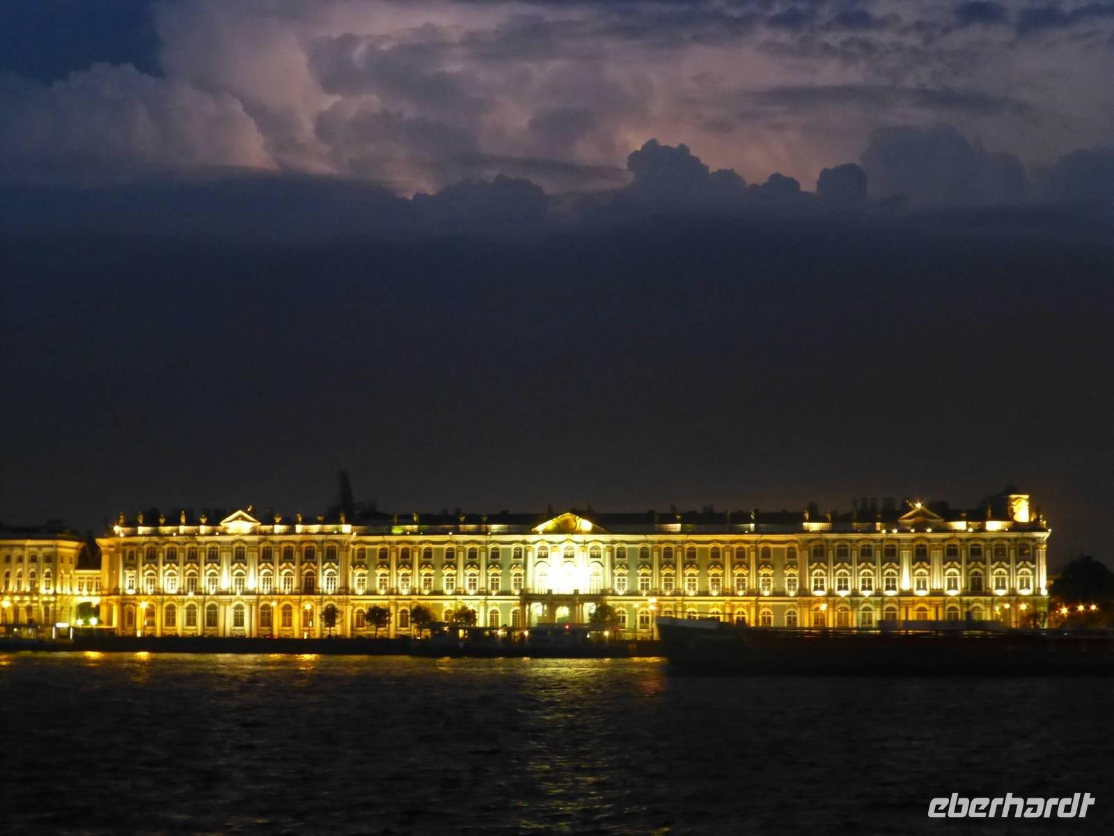 Als die Brücke vollständig geöffnet war, fuhren wir noch zur Landspitze der Wassiljewski-Insel um von dort die Öffnung der übrigen Brücken beobachten zu können. Und wie immer in dieser Woche spielte das Wetter mit. Während wir die Schiffe beim Fahren beobachteten, zog der Himmel über der Eremitage zu und ein beeindruckendes Wetterleuchten setzte ein. Natürlich versuchten wir alle sofort, den ein oder anderen Blitz auf Foto festzuhalten (Wer eine Videokamera besaß, hatte natürlich kein Problem).