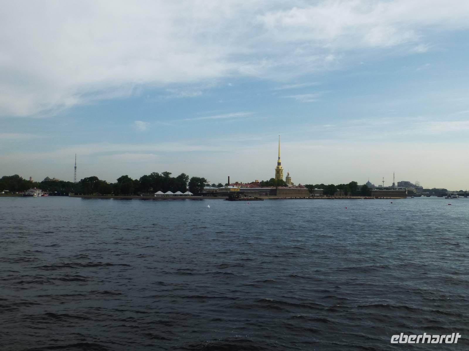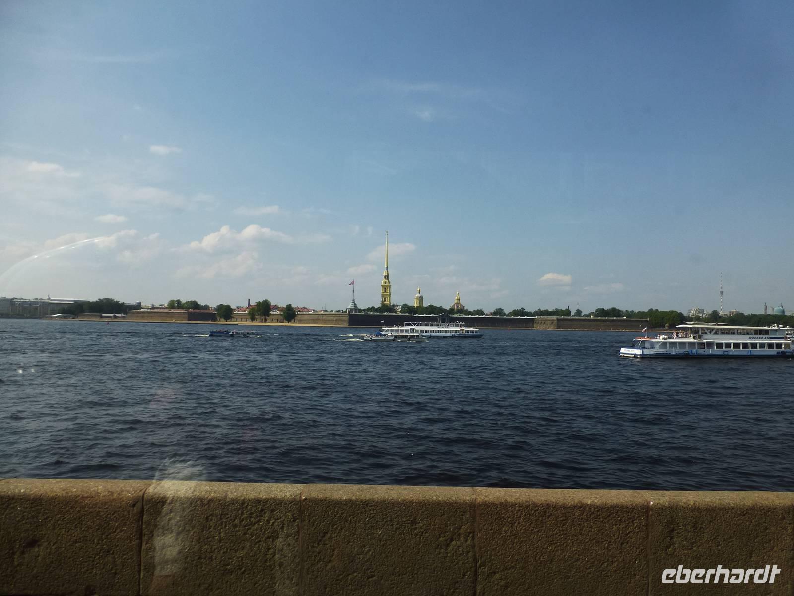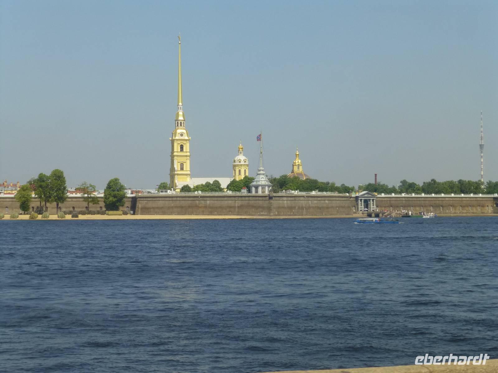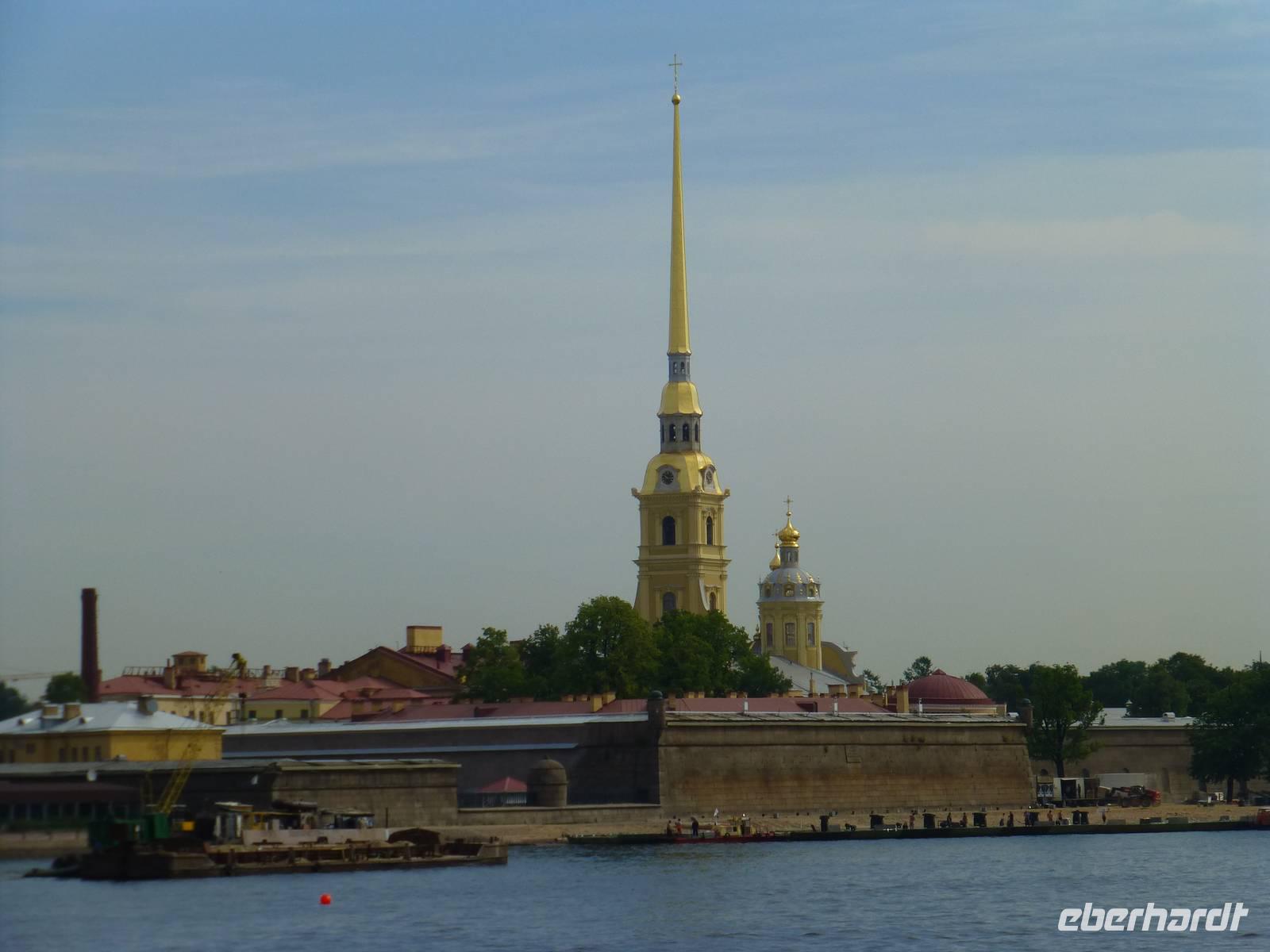 Über zwei weitere Brücken, davon eine alte Holzbrücke fuhren wir weiter zur Peter-und-Pauls-Festung. Diese Festung sollte damals die Wassiljewski-Insel zu einem Bollwerk gegen Feinde machen. Heute befinden sich dort die Münzerei und natürlich immer noch die Peter-und-Pauls-Kathedrale mit ihrer überragenden goldenen Spitze. Natalia erklärte uns, wie schwierig es damals war, diese Spitze aufzubauen und dass besondere Belohnungen auf die Kletterer warteten - sofern sie wieder unten ankamen.