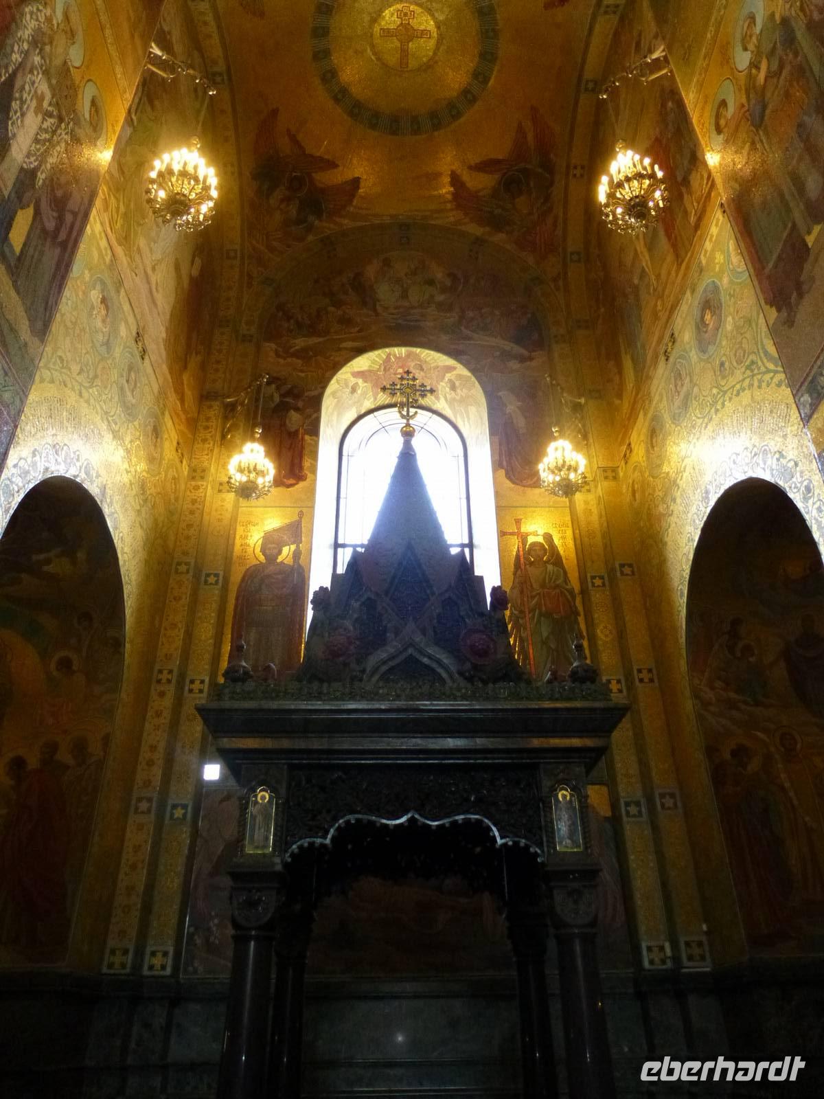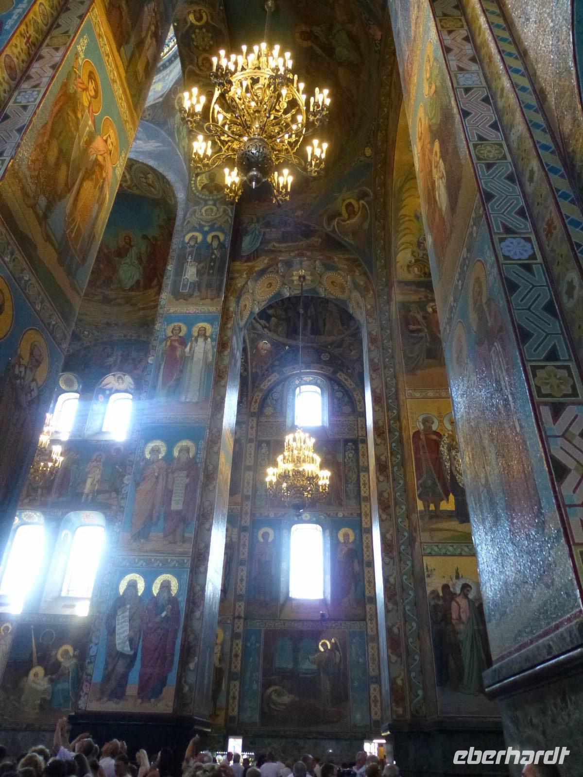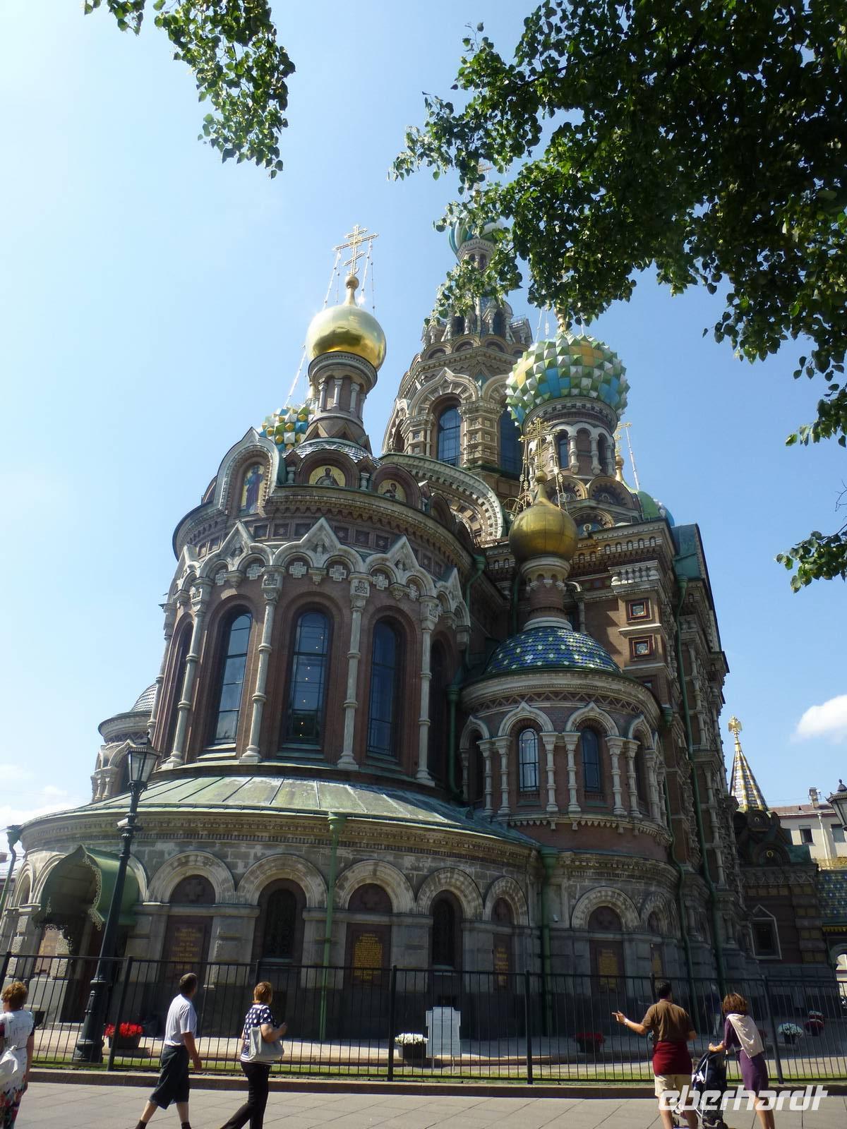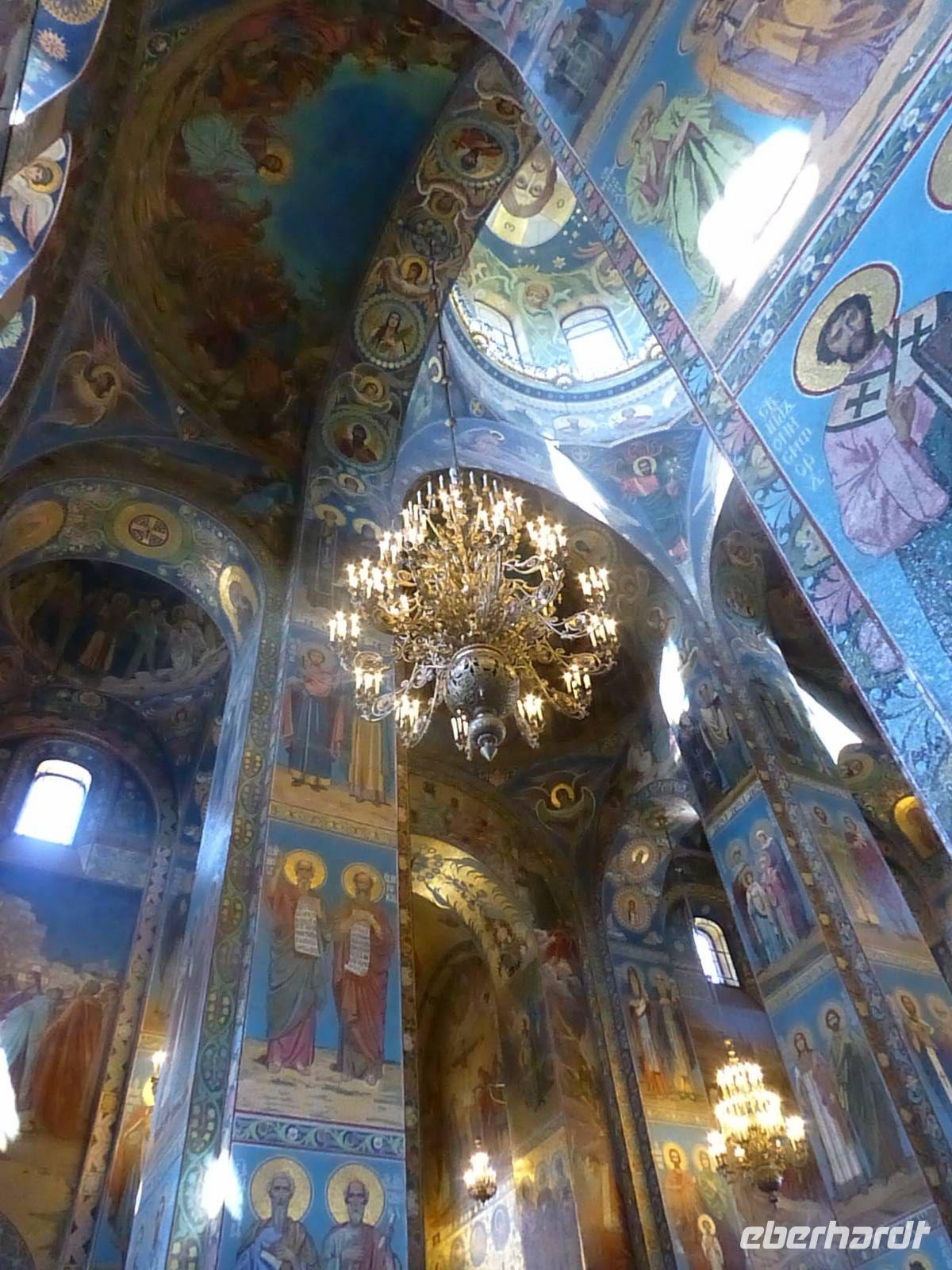 Zugegeben, die Überschrift ist nicht ganz korrekt, denn für religiöse Zwecke sollte die Blutskirche von Anfang an nicht genutzt werden. Wir jedenfalls bestaunten schon von außen die nach dem Vorbild der Moskauer Basilius-Kathedrale gestaltete Kirche. Aber erst drinnen blieb uns wirklich die Spucke weg. Das gesamte Innere der Kirche war gesäumt mit bunten Mosaiken aller Art, es müssen Millionen der kleinen bunten Steinchen gewesen sein. Wieder einmal lässt sich das Gesehen nicht mit Worten beschreiben, man kann sich die Mosaike nicht vorstellen. Aber wir mussten das ja auch nicht, wir hatten sie selbst vor Augen.