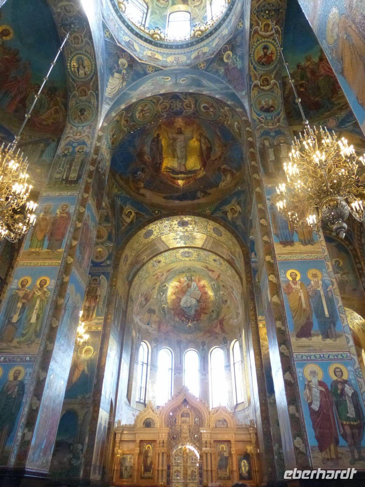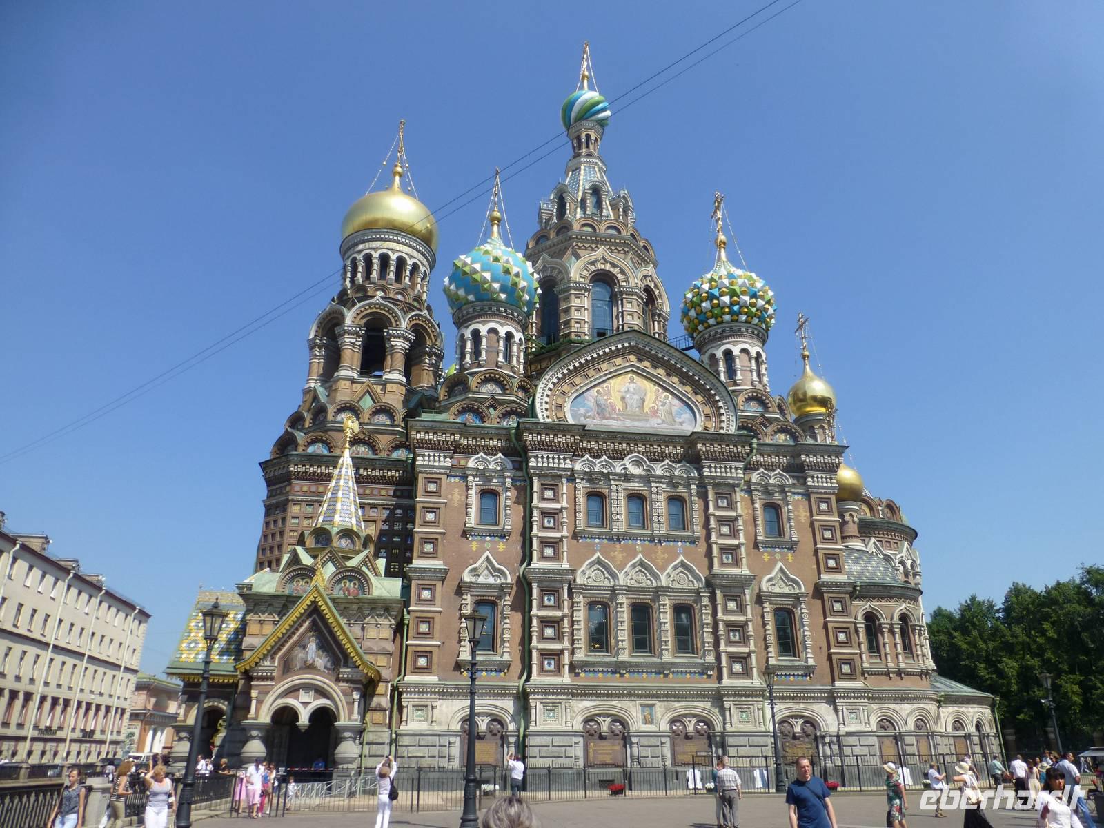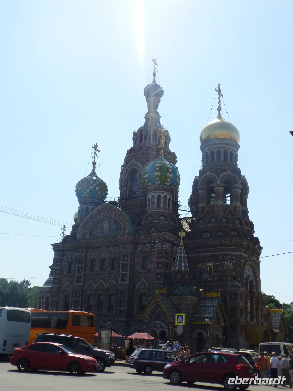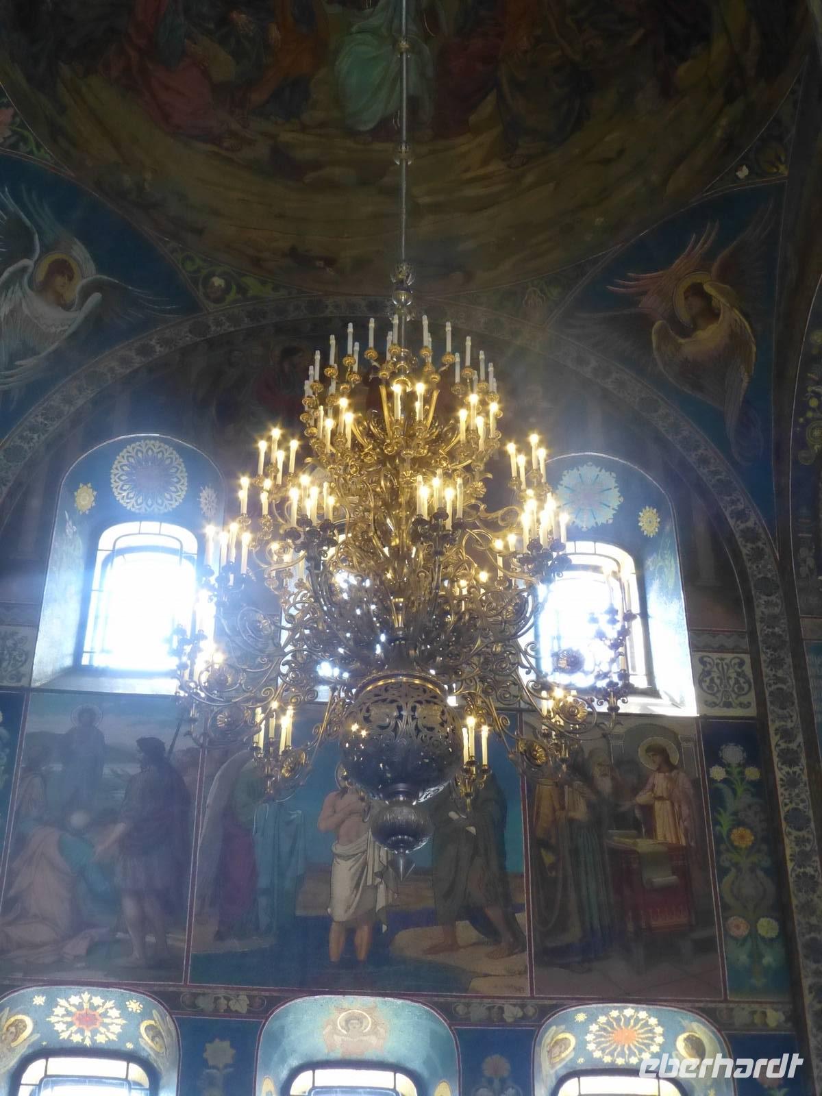 Zugegeben, die Überschrift ist nicht ganz korrekt, denn für religiöse Zwecke sollte die Blutskirche von Anfang an nicht genutzt werden. Wir jedenfalls bestaunten schon von außen die nach dem Vorbild der Moskauer Basilius-Kathedrale gestaltete Kirche. Aber erst drinnen blieb uns wirklich die Spucke weg. Das gesamte Innere der Kirche war gesäumt mit bunten Mosaiken aller Art, es müssen Millionen der kleinen bunten Steinchen gewesen sein. Wieder einmal lässt sich das Gesehen nicht mit Worten beschreiben, man kann sich die Mosaike nicht vorstellen. Aber wir mussten das ja auch nicht, wir hatten sie selbst vor Augen.