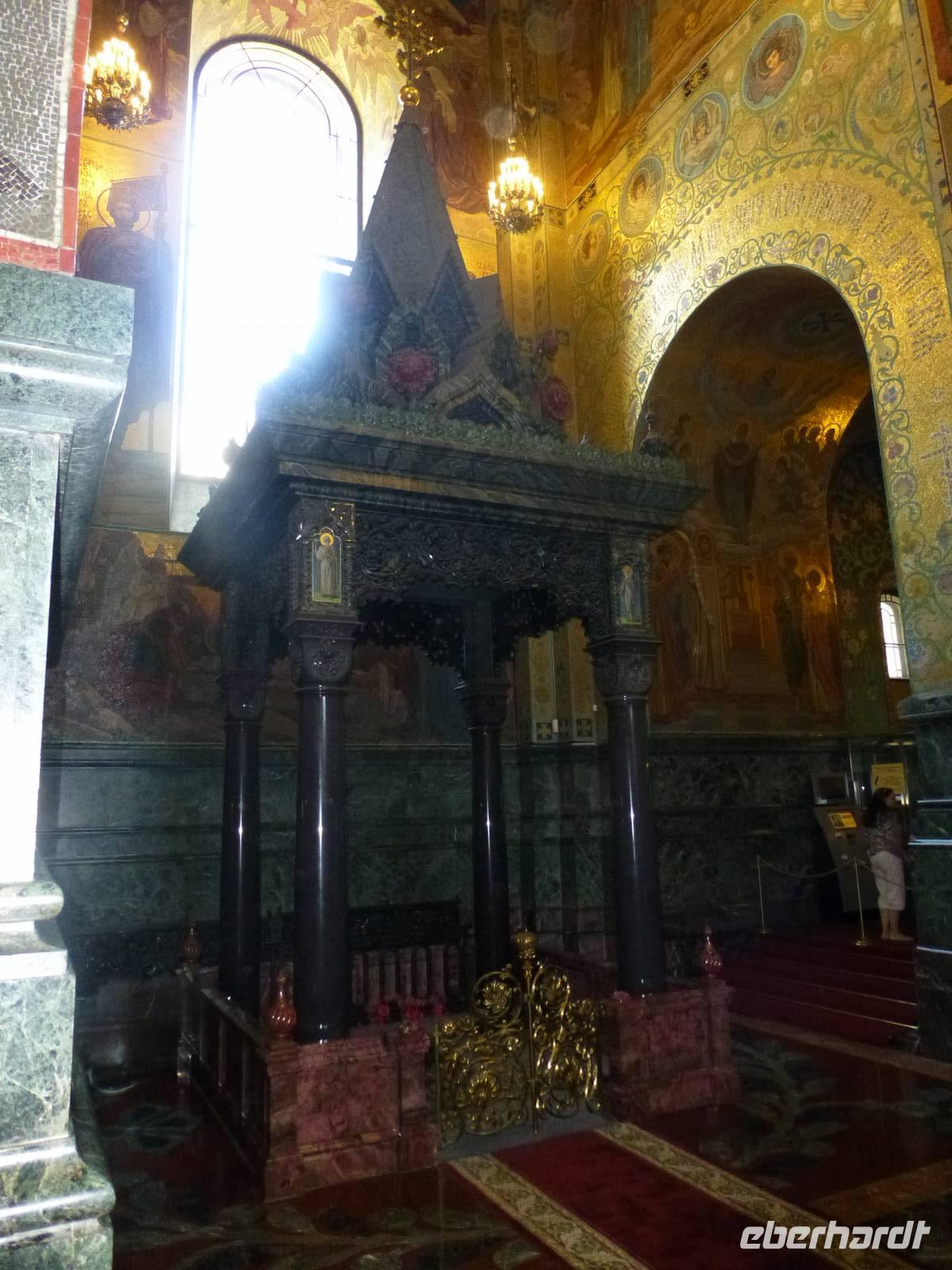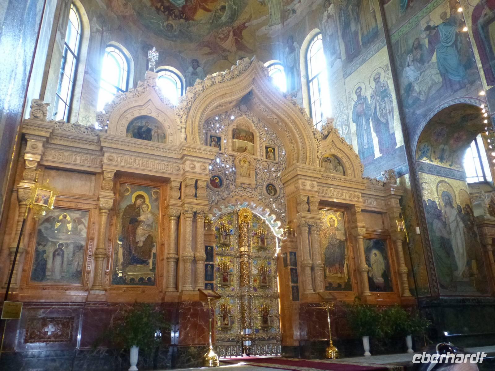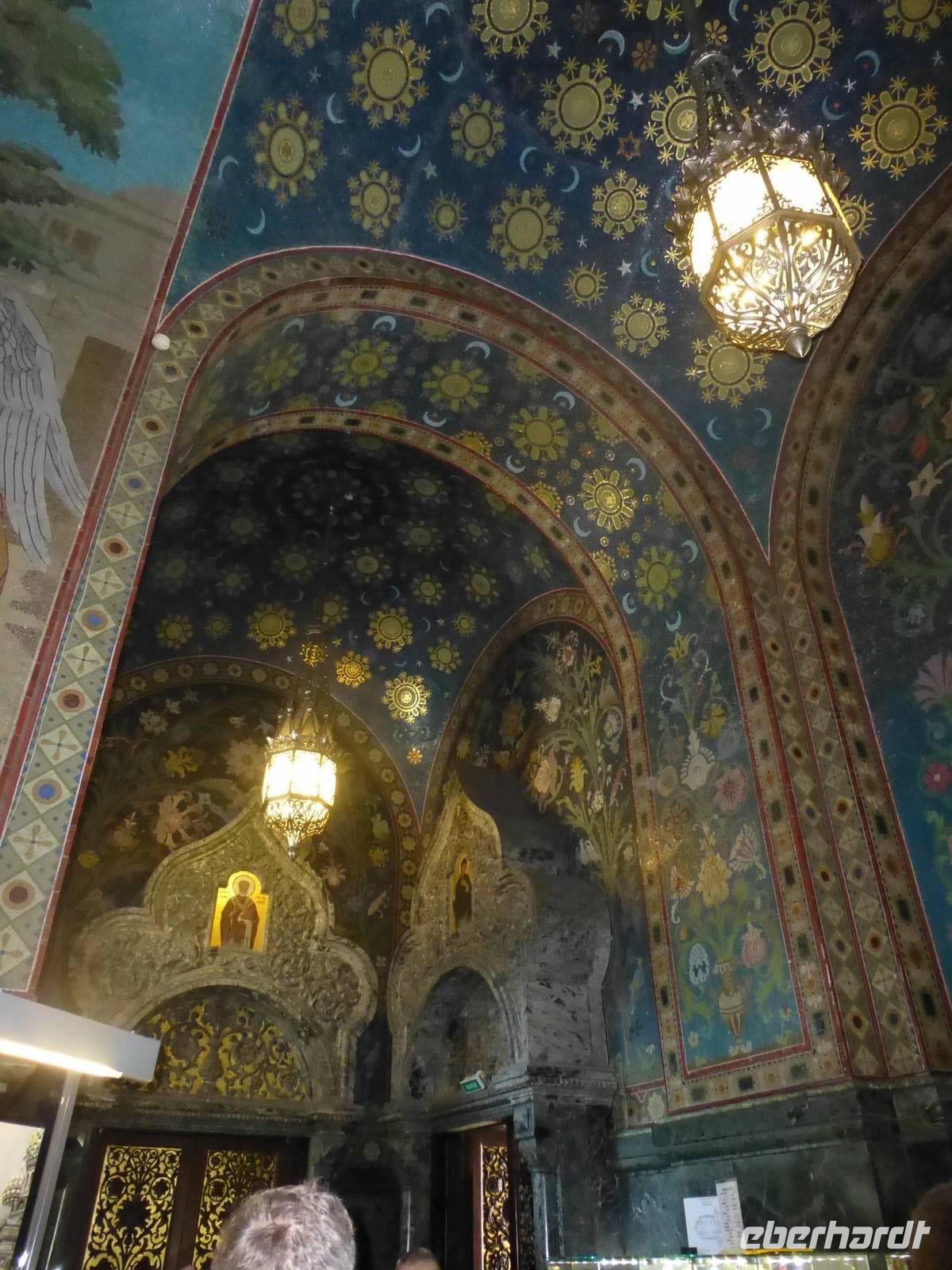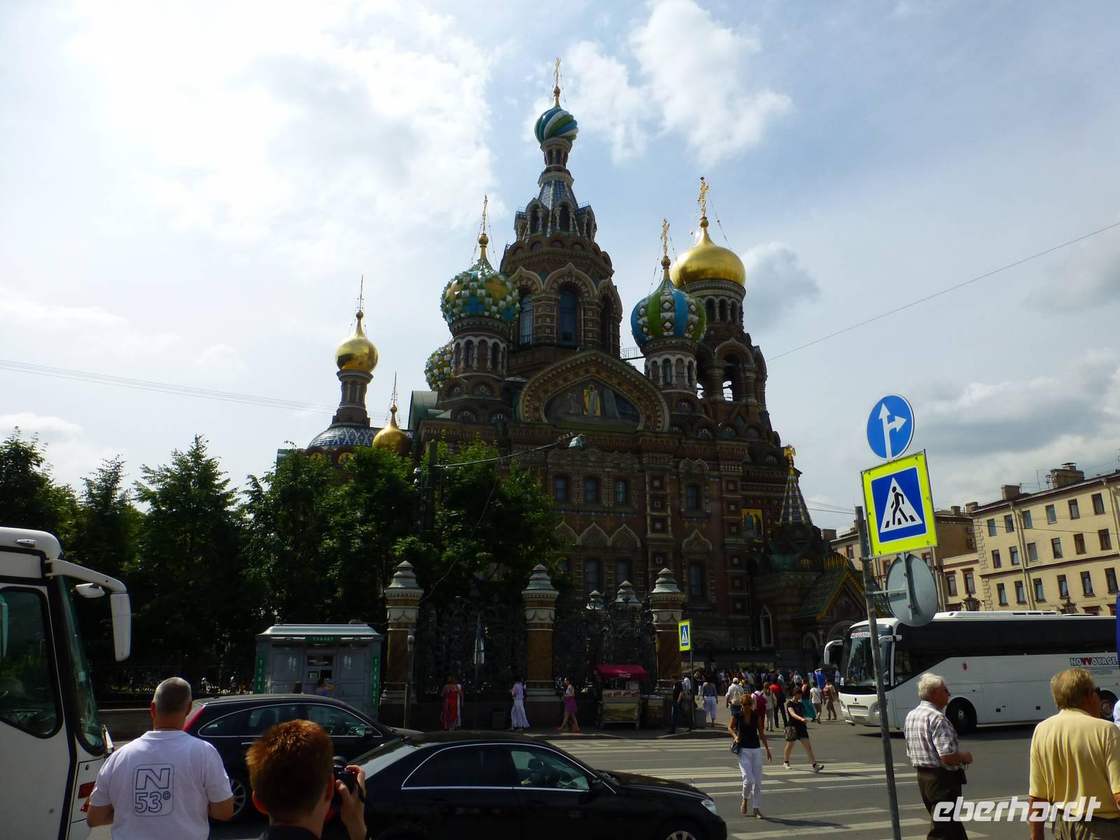 Zugegeben, die Überschrift ist nicht ganz korrekt, denn für religiöse Zwecke sollte die Blutskirche von Anfang an nicht genutzt werden. Wir jedenfalls bestaunten schon von außen die nach dem Vorbild der Moskauer Basilius-Kathedrale gestaltete Kirche. Aber erst drinnen blieb uns wirklich die Spucke weg. Das gesamte Innere der Kirche war gesäumt mit bunten Mosaiken aller Art, es müssen Millionen der kleinen bunten Steinchen gewesen sein. Wieder einmal lässt sich das Gesehen nicht mit Worten beschreiben, man kann sich die Mosaike nicht vorstellen. Aber wir mussten das ja auch nicht, wir hatten sie selbst vor Augen.