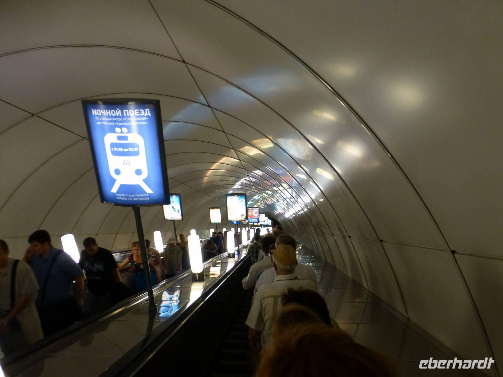 Wir standen natürlich nicht nur, sondern fuhren auch eine Station weit mit diesem außergewöhnlichen Verkehrsmittel zu einer weiteren sehr sehenswerten Station dieser Untergrundbahn. Wieder oben angekommen erwartete uns Wadim bereits mit dem Bus und brachte uns sicher durch den chaotischen russischen Verkehr zu unserem Hotel zurück. Wir waren aber nicht traurig, dass dieser sehr eindrucksvolle Tag sich dem Ende zuneigte, sondern freuten uns natürlich schon auf den nächsten Tag.