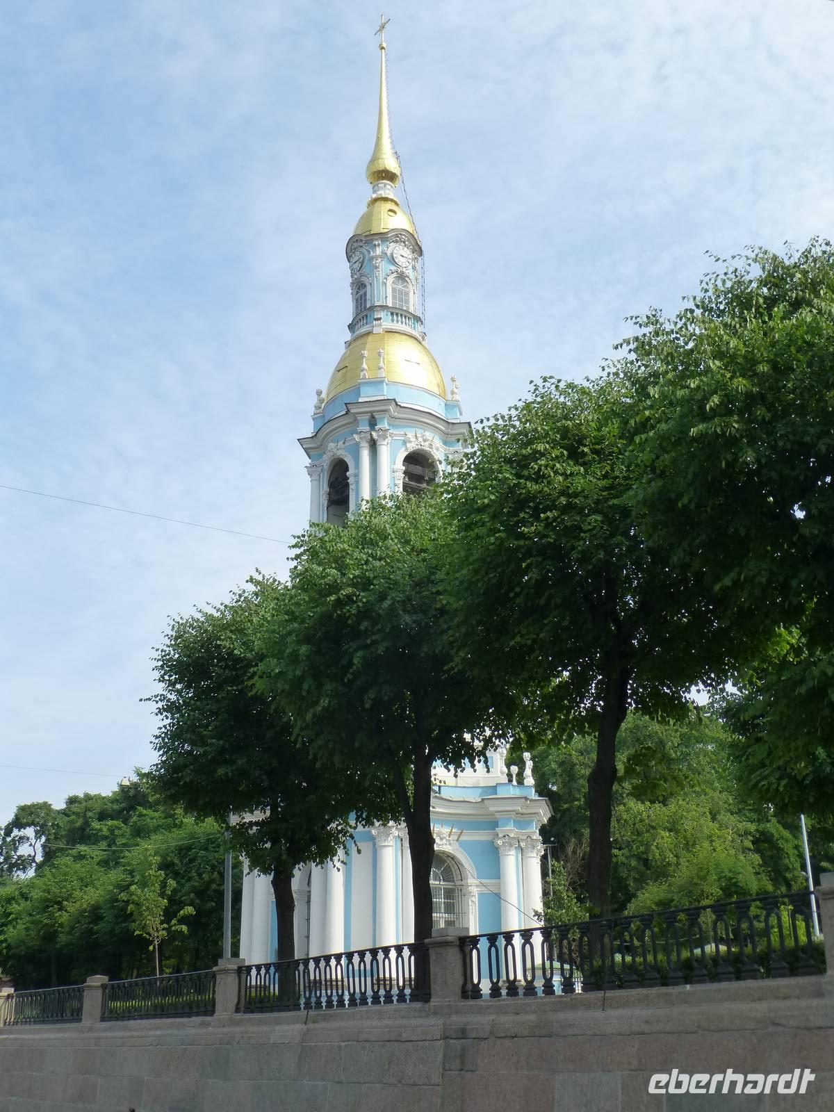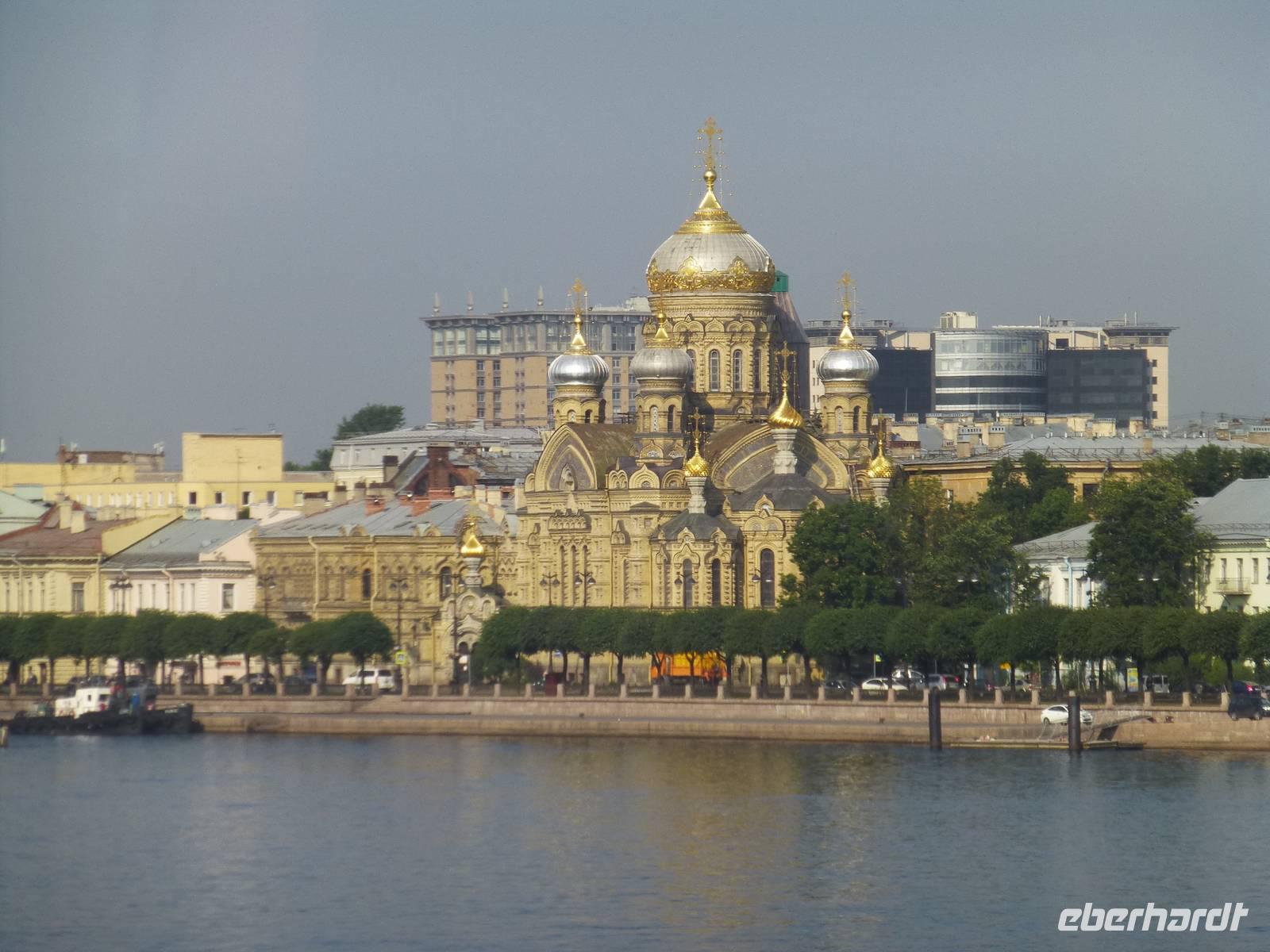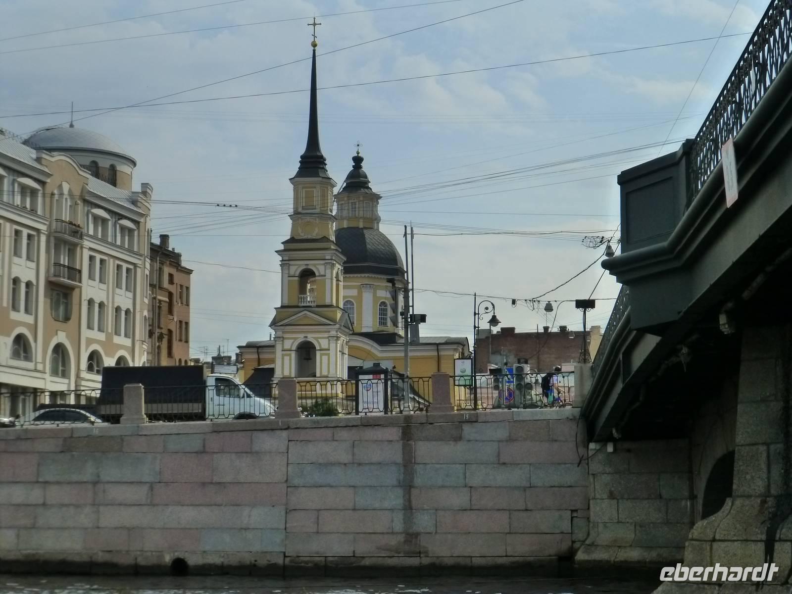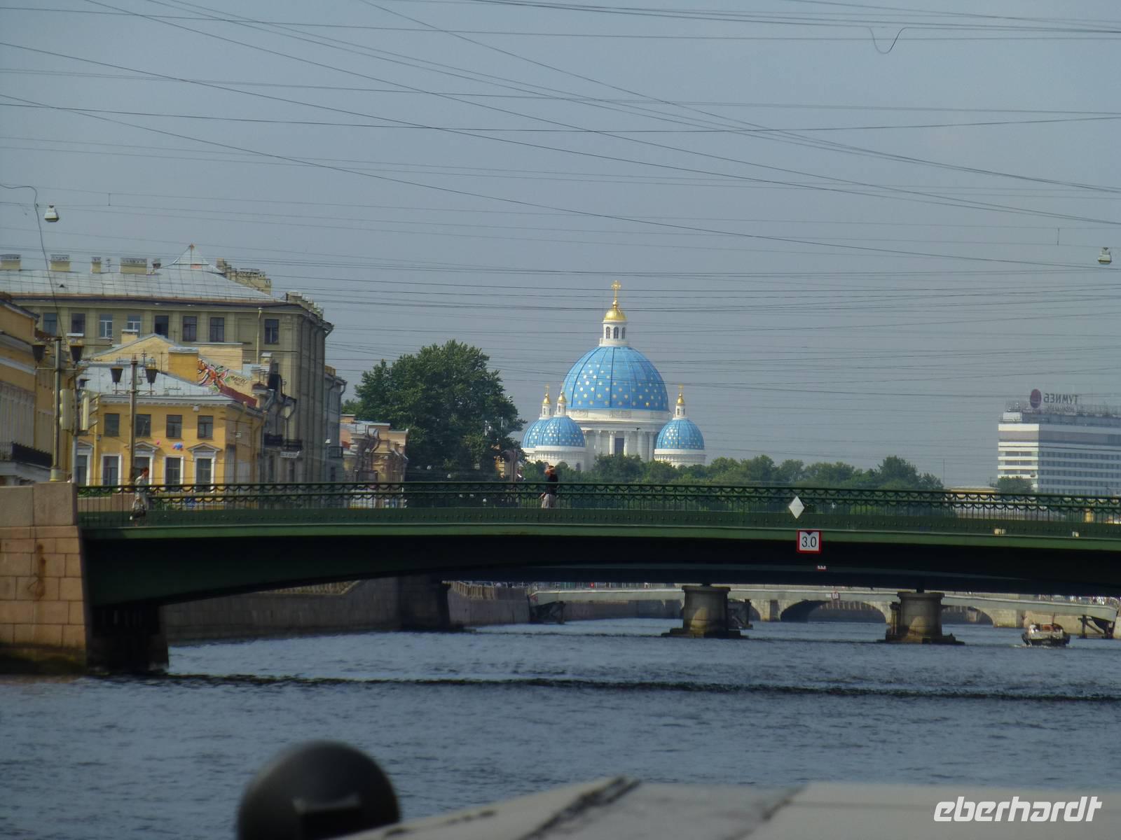 Keine Reise ins Venedig des Nordens ohne eine Bootsfahrt - das sagten natürlich auch wir uns. An unserem dritten Tag ging es um 9.45 Uhr vom Hotel los, wir fuhren direkt zur roten Brücke nahe des Jussupow-Palastes, wo bereits unser kleines Schiff auf uns wartete. Der Wetterdienst hatte nicht zuviel versprochen, sondern eher noch zu wenig und so machten wir es uns bei Temperaturen um die 32°C alle auf Deck gemütlich. Natalia bezog Stellung am Mikrofon des Schiffes, sie begleitete unsere Fahrt gewohnt sicher und mit viel, viel Wissen zu allen Gebäuden und Plätzen, die wir passierten. So sahen wir Gebäude wie das Ingenieursschloss, die St. Simeon-und-Anna-Kirche und die Dreifaltigkeitskirche mit ihrer hellen blauen Holzkuppel.