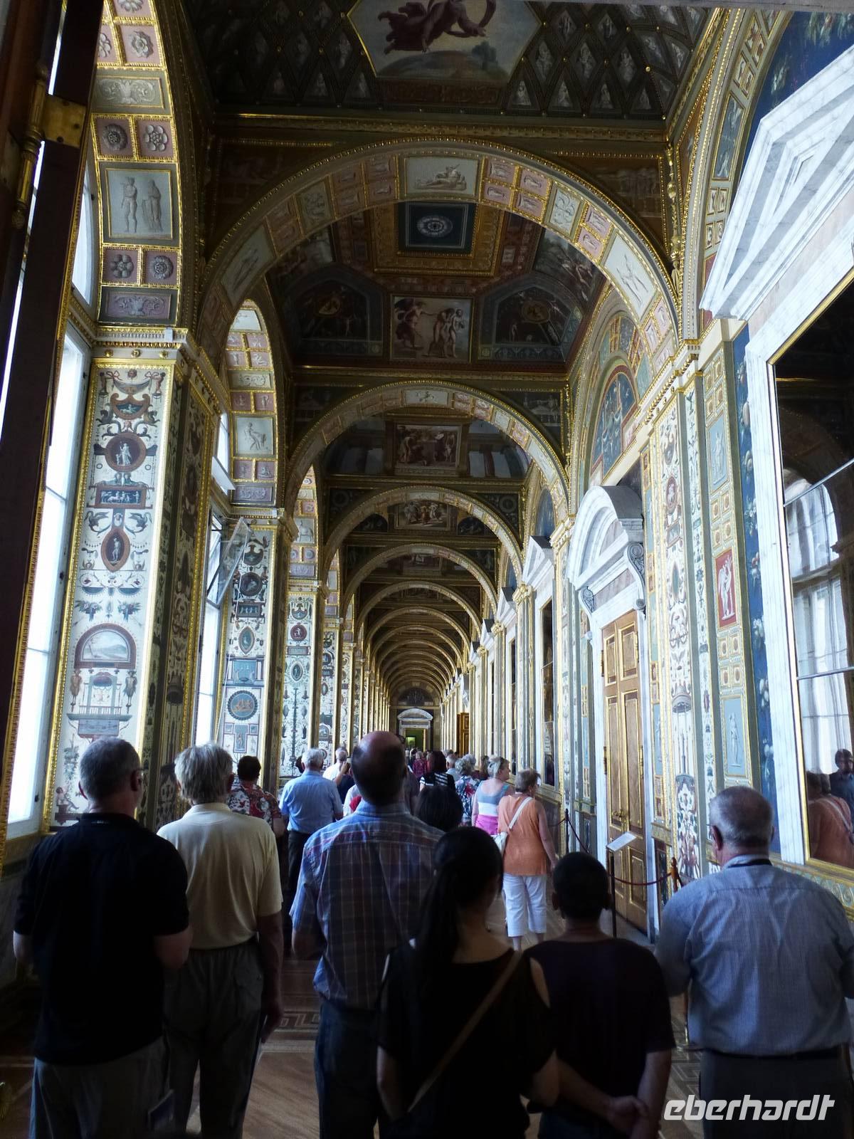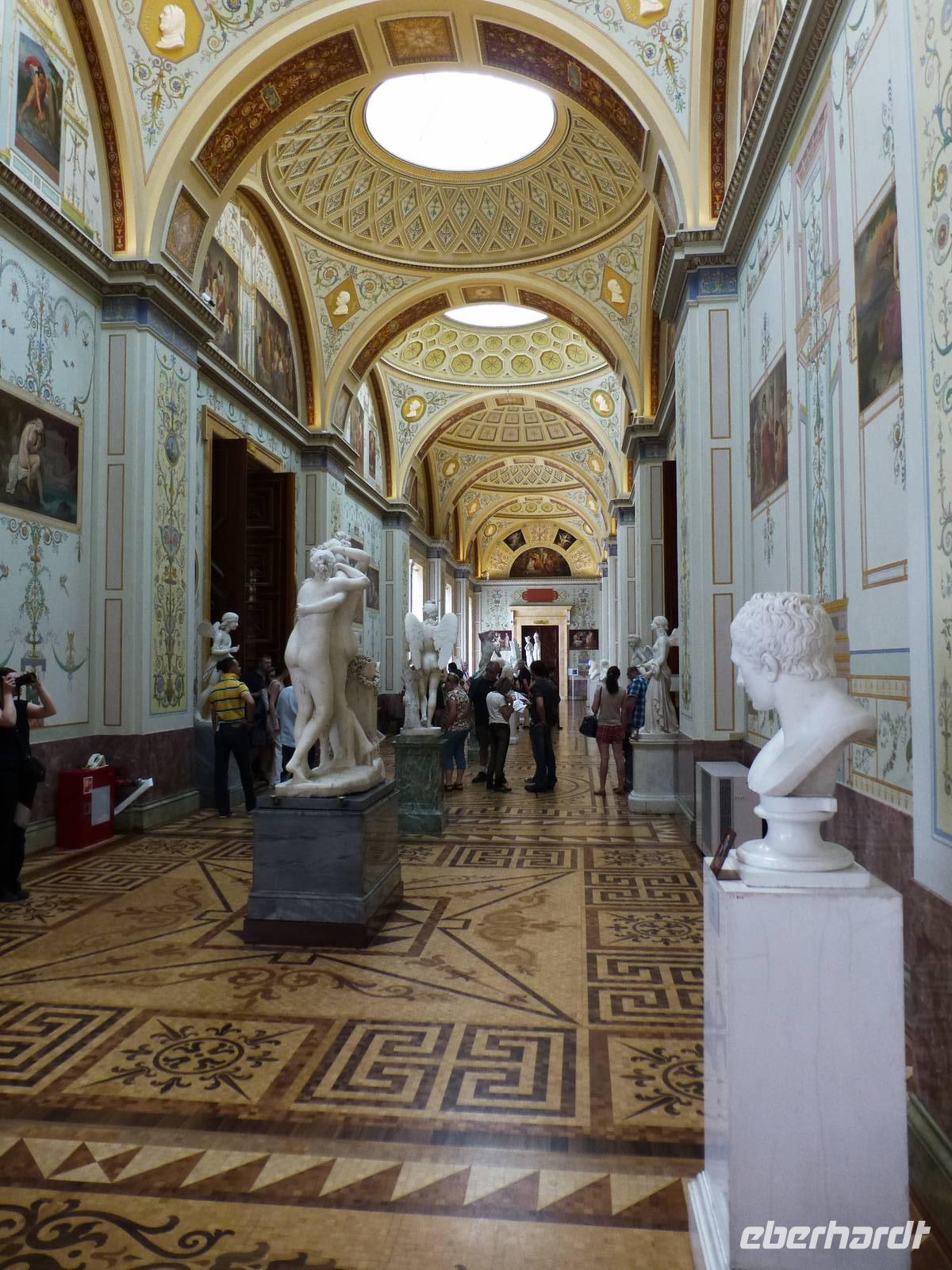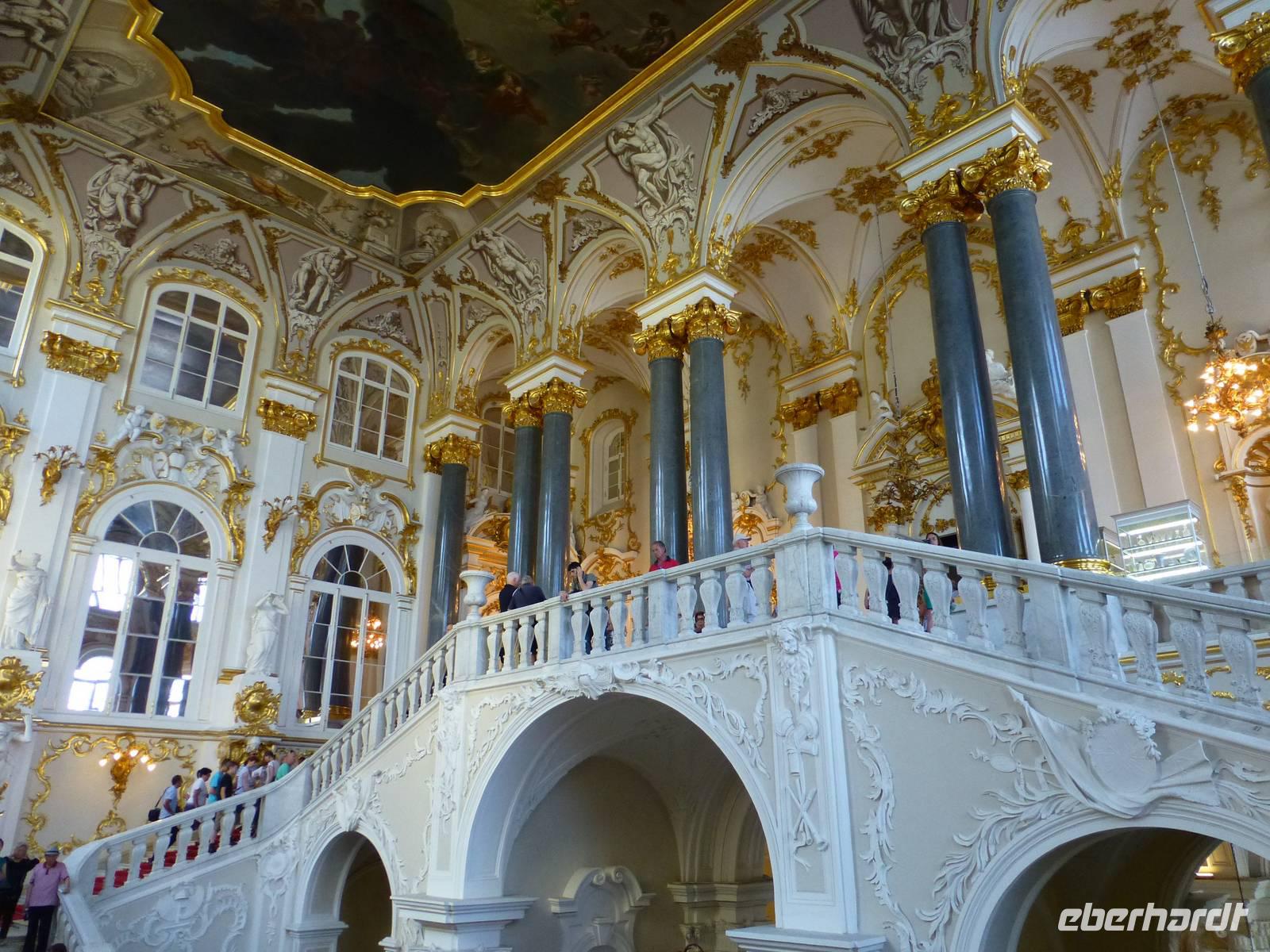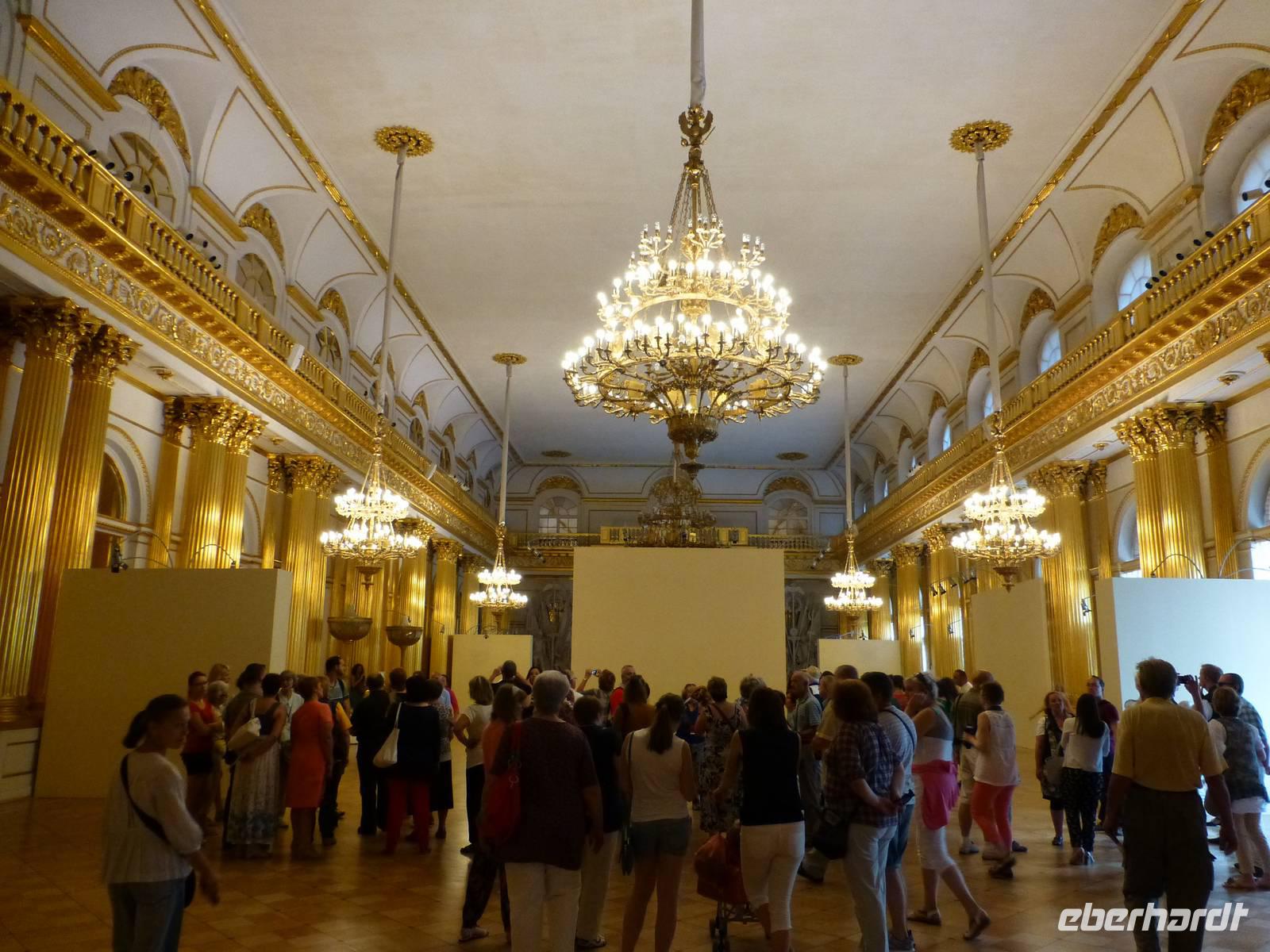 Nach einer kurzen Mittagspause reihten wir uns in die zu diesem Zeitpunkt noch kurze Warteschlange vor der Eremitage ein und standen schon einige Minuten später inmitten großer Menschenmassen in den prachtvollen Hallen der Eremitage. Ohne Natalia hätten wir wahrscheinlich erst einmal eine längere Zeit gebraucht, um uns zu orientieren. Sie allerdings führte uns sicher die imposante Jordantreppe hinauf zum Thronsaal des Winterpalasts. Überall waren Kunstgegenstände, mit Gold und Stuck verzierte Wände, prachtvolle Parkettböden - und natürlich Menschen, die diese ansehen wollten. Es war nicht immer leicht, durch diese Massen zu manövrieren, aber mit Natalias Hilfe gelang es uns allen - und es lohnte sich!